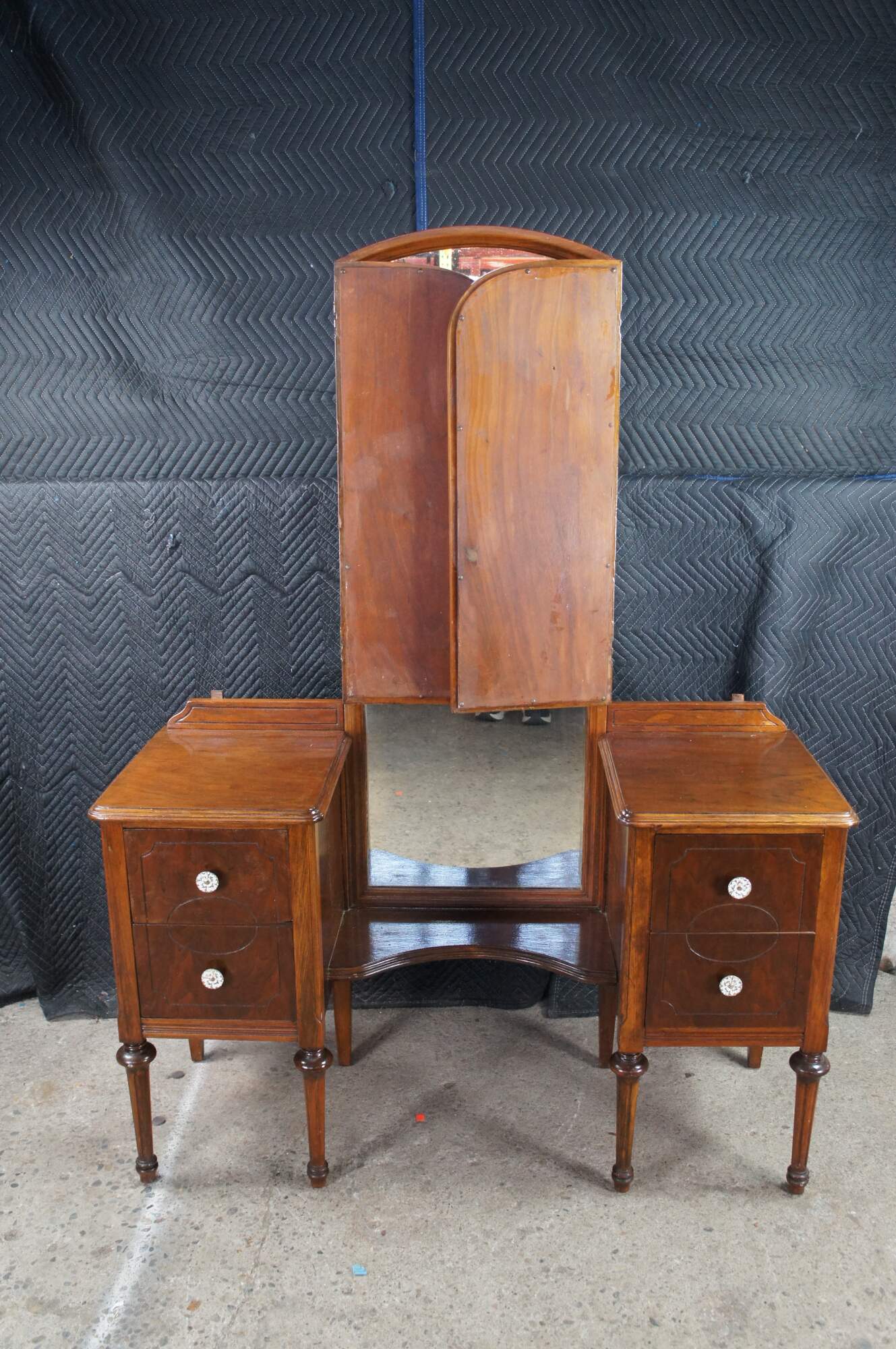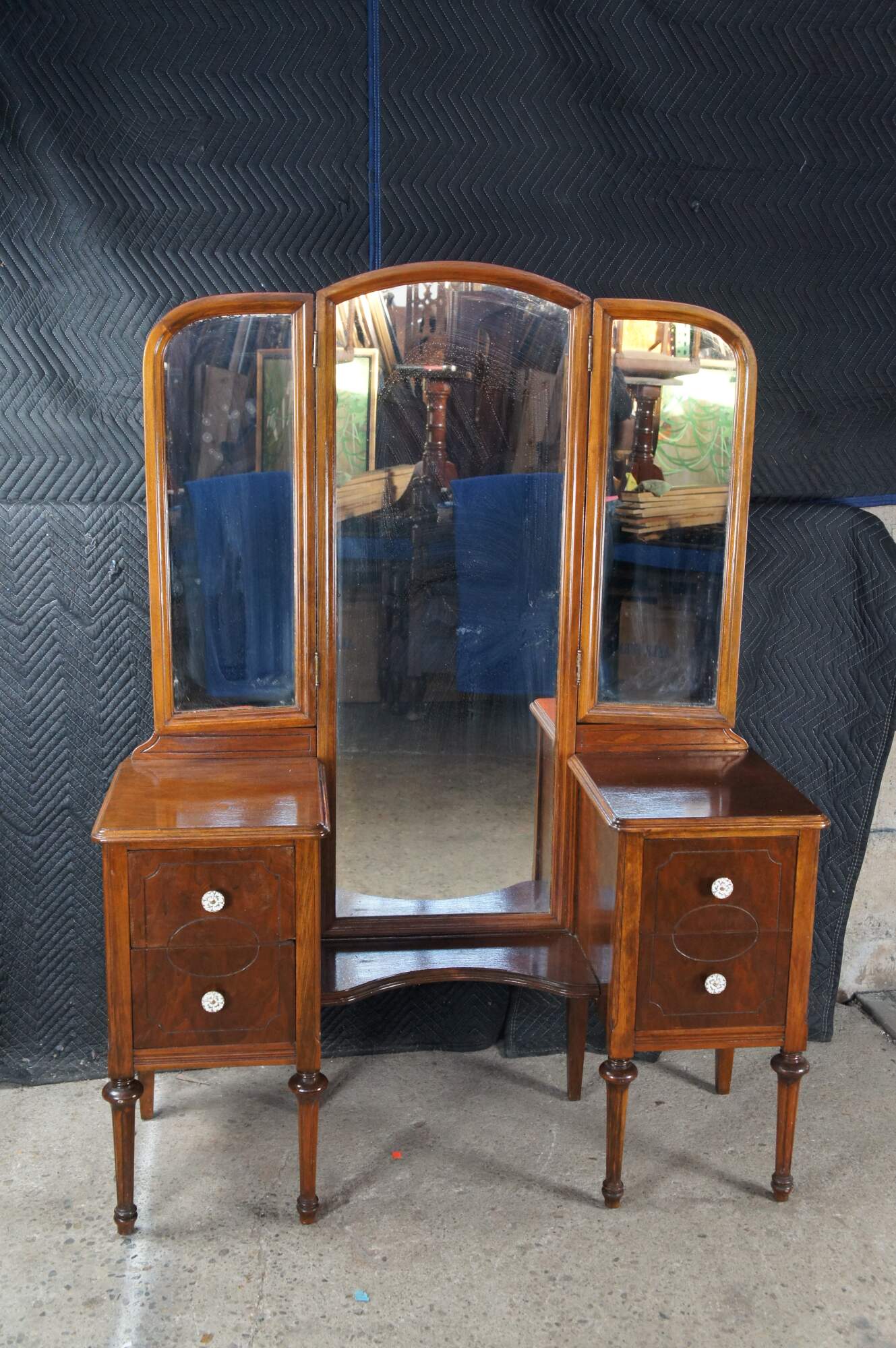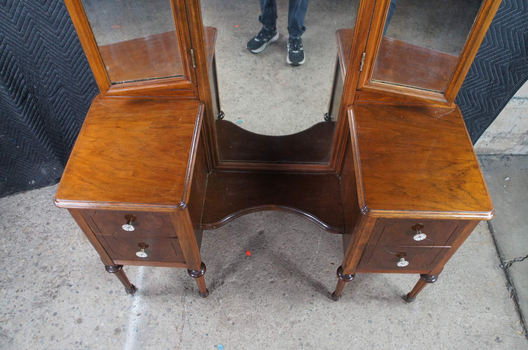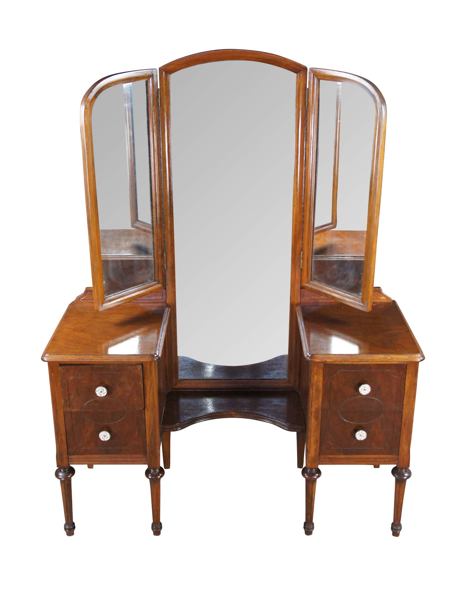 Antique late Victorian, circa 1940s dressing table / vanity. Made of walnut featuring a trifold mirror and four drawers.