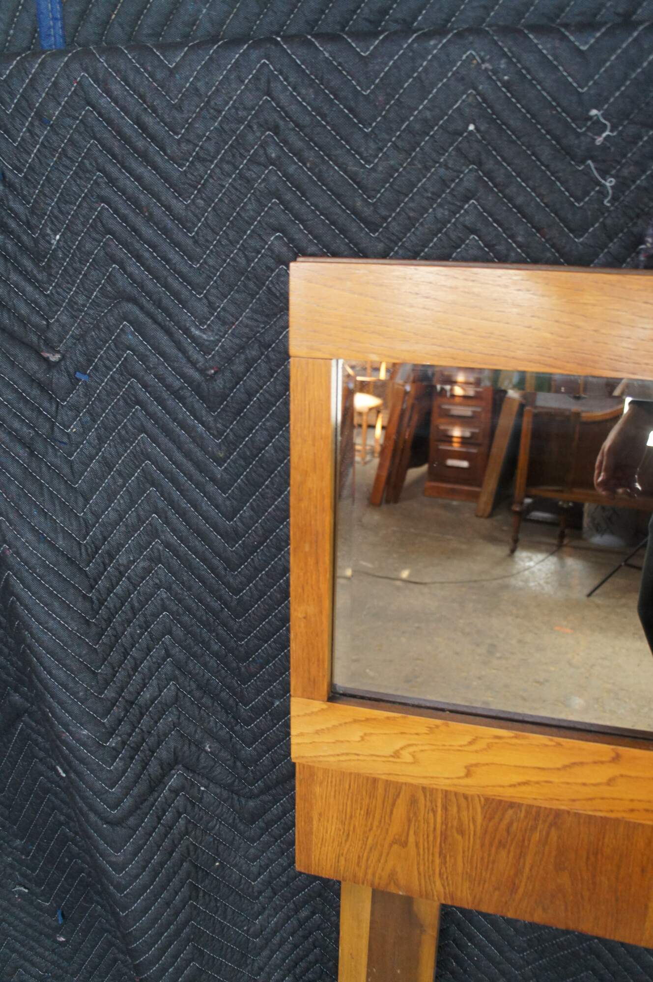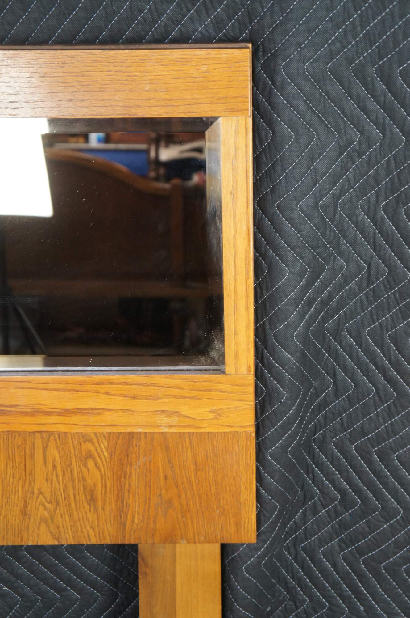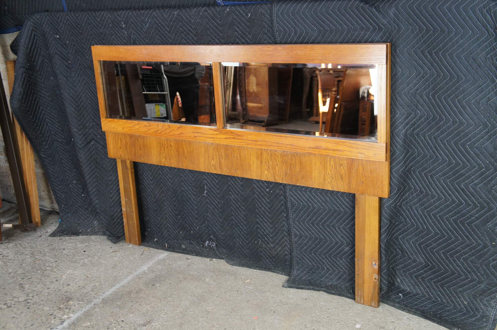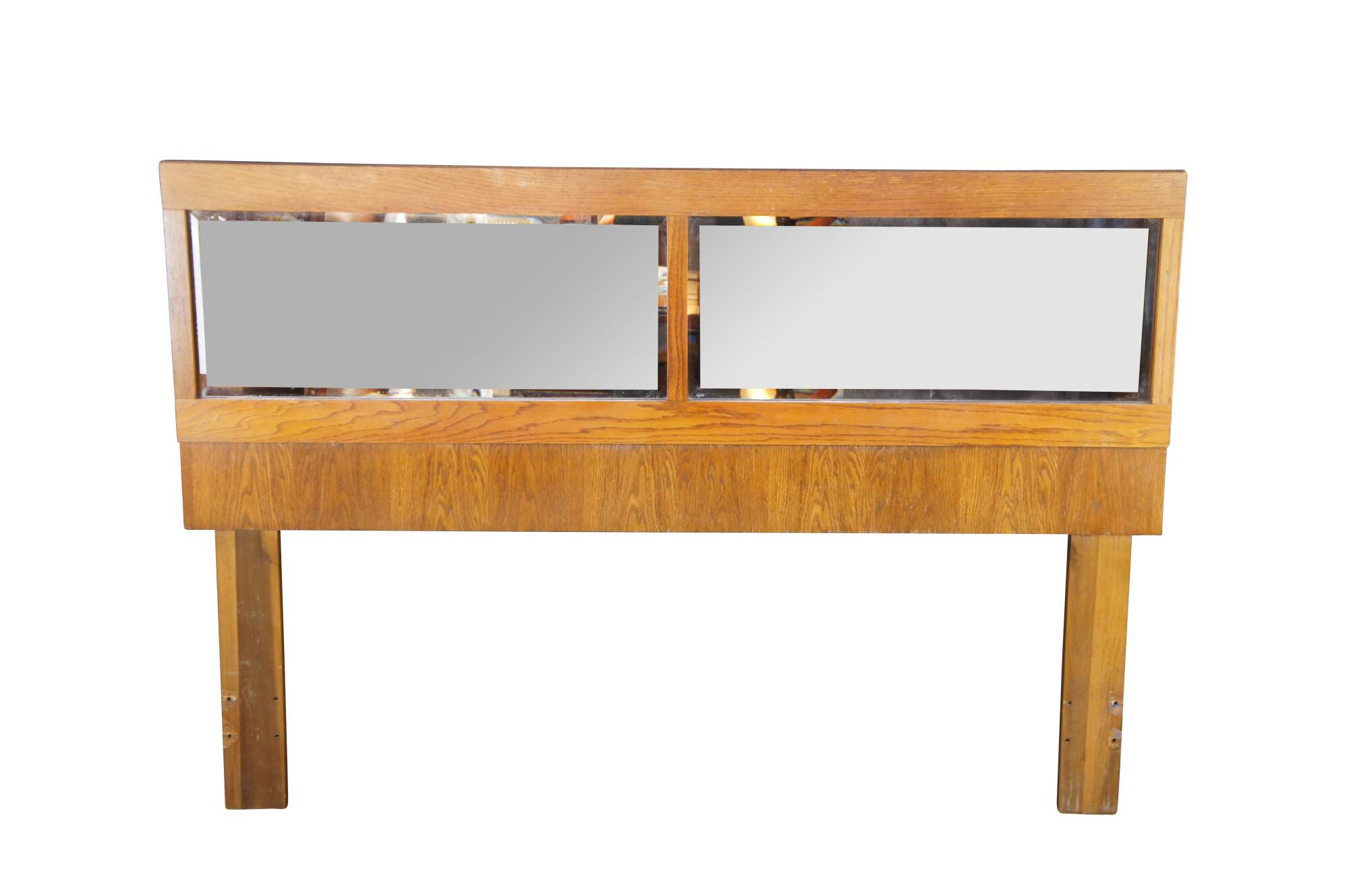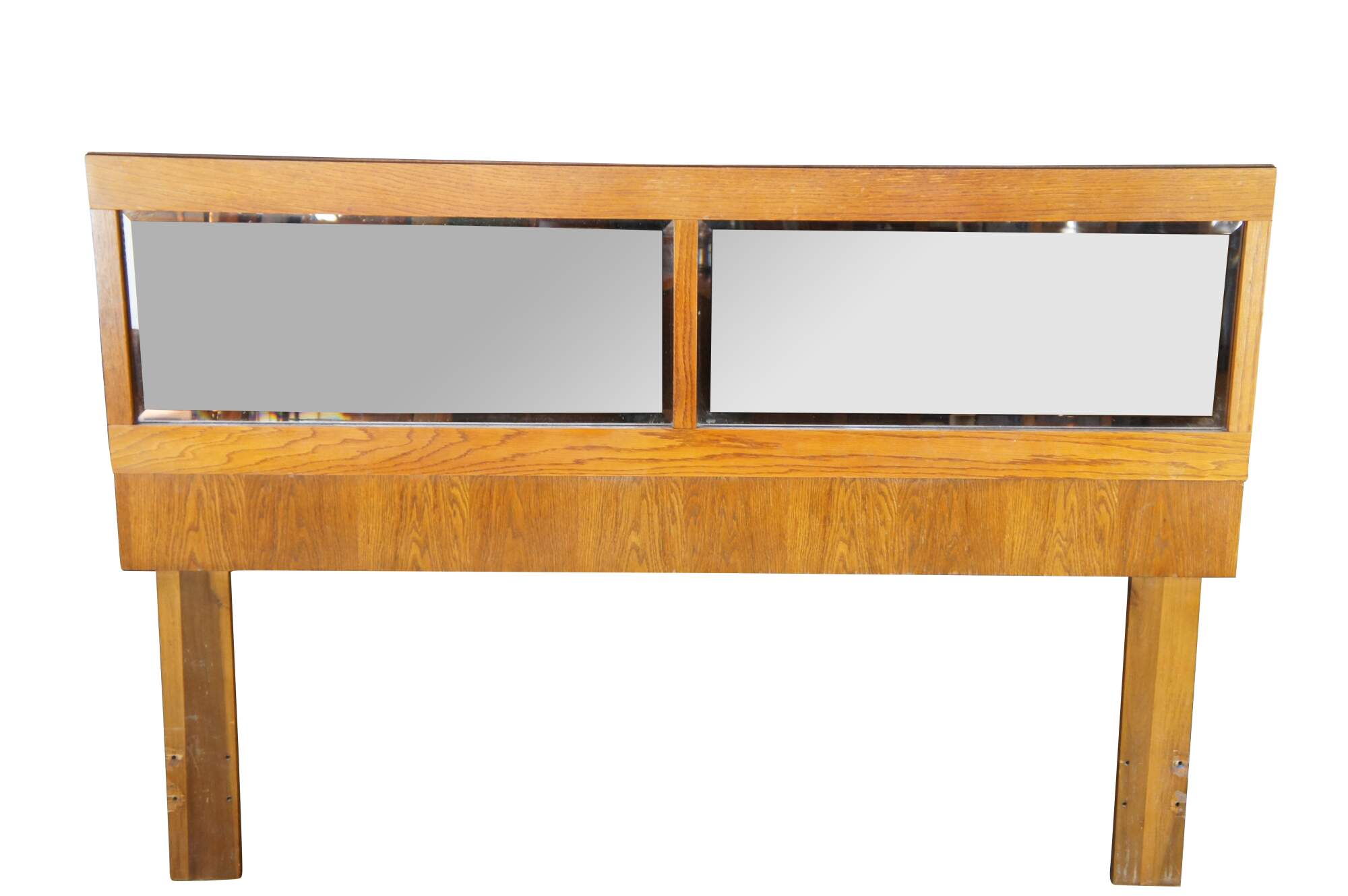 Mid century modern Lane Staccato Brutalist full or queen size headboard featuring a mirrored back and oak frame. 568-27.