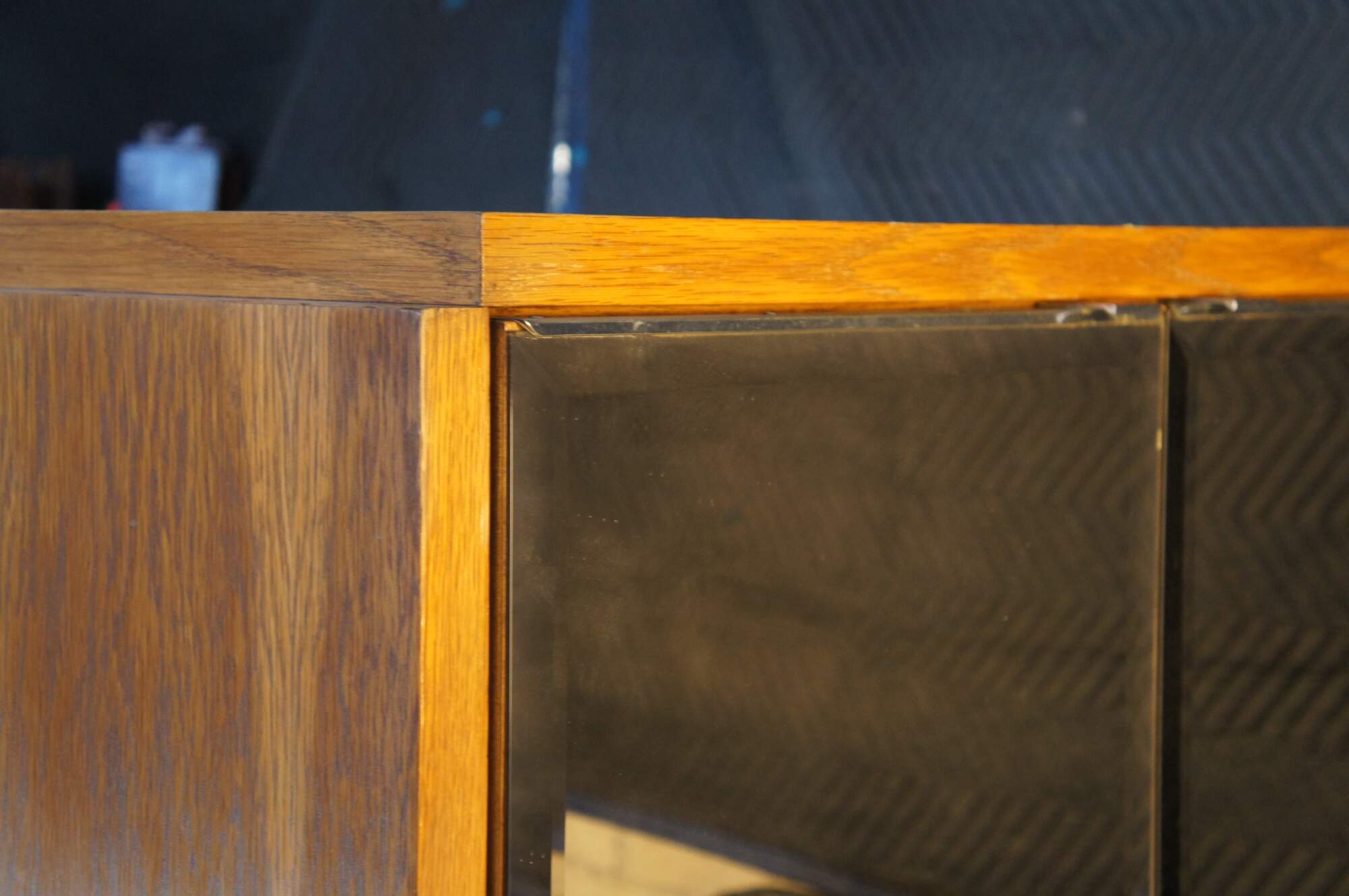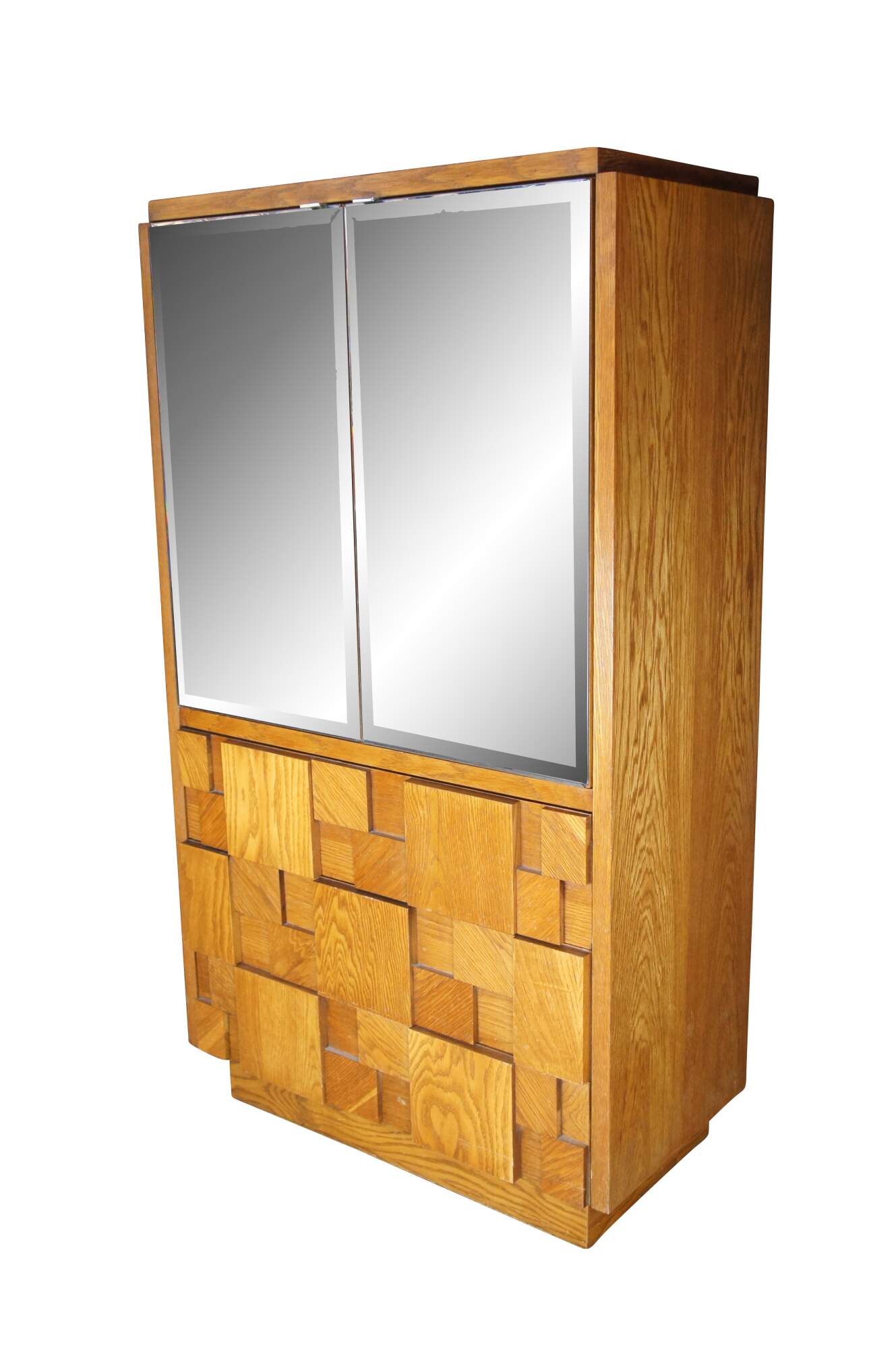 1970s Vintage Lane Furniture Staccato collection Mid Century Modern clothing armoire / linen press / cabinet. 568-14. A freestanding armoire featuring beveled and smoked mirrored glass doors that open to a divided interior with lower drawer. The cabinet base showcases Lanes iconic cubed brutalist form with three dovetailed oak drawers that open via a groove along the underside. The wardrobe is supported by a plinth base. Manufactured June, 13th 1979.