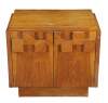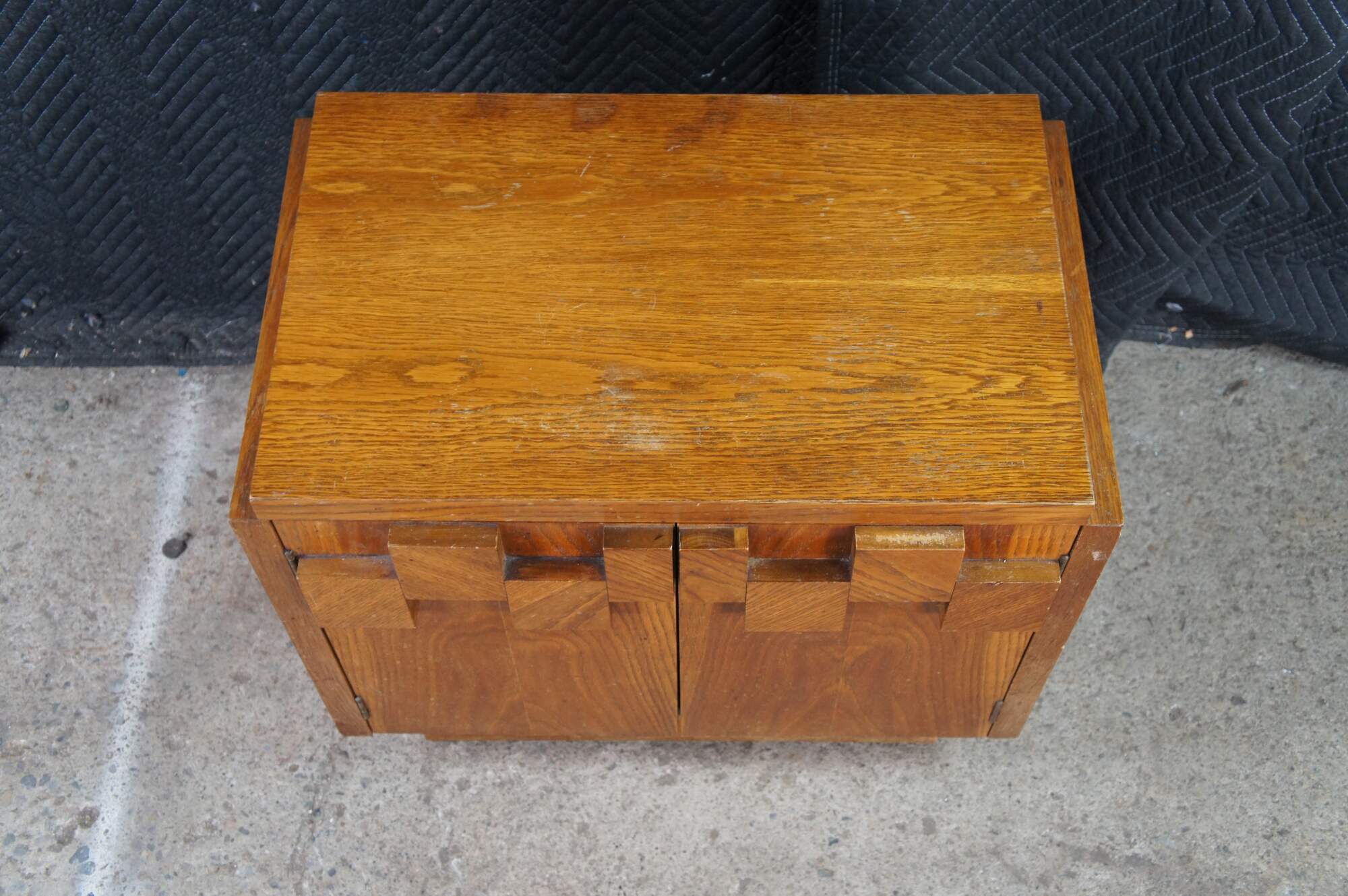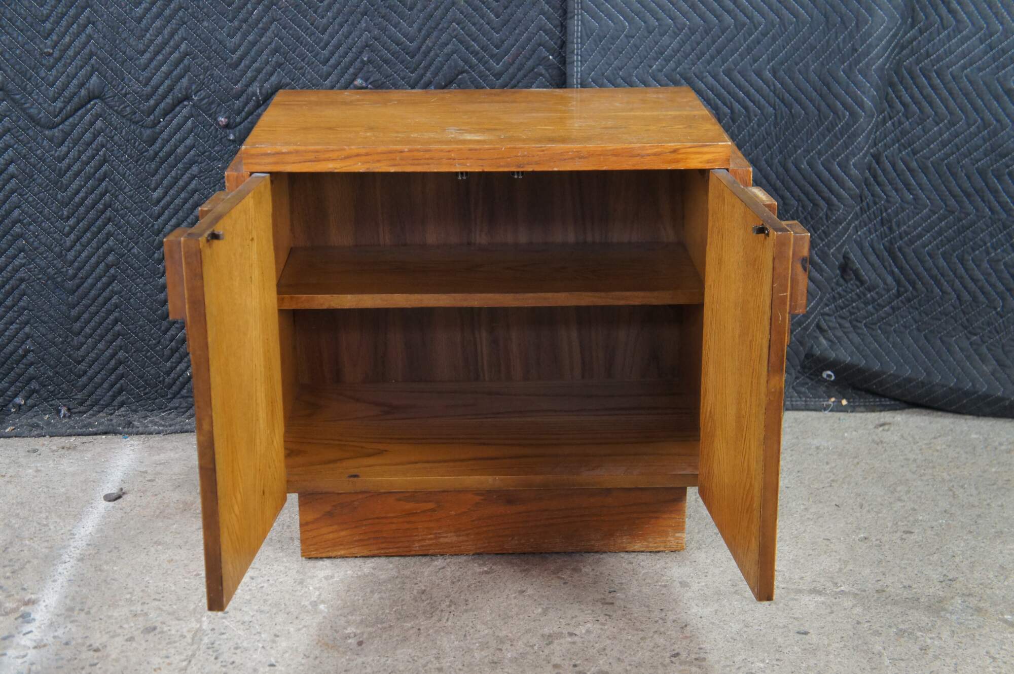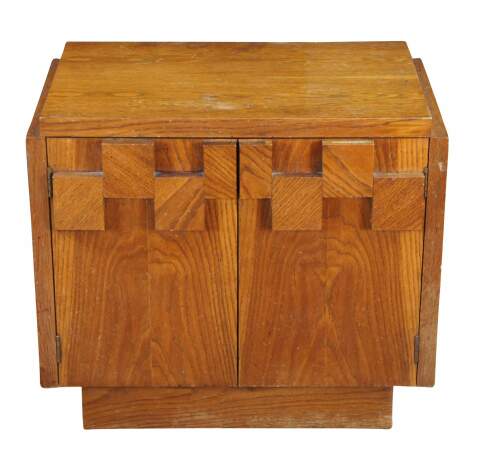 1970s Vintage Lane Furniture Staccato collection Brutalist style Oak nightstand cabinet. 568-32. The cabinet base showcases Lanes iconic cubed brutalist form with two doors that that open to an interior shelf. The table is supported by a plinth base. Manufactured May, 8th 1979.