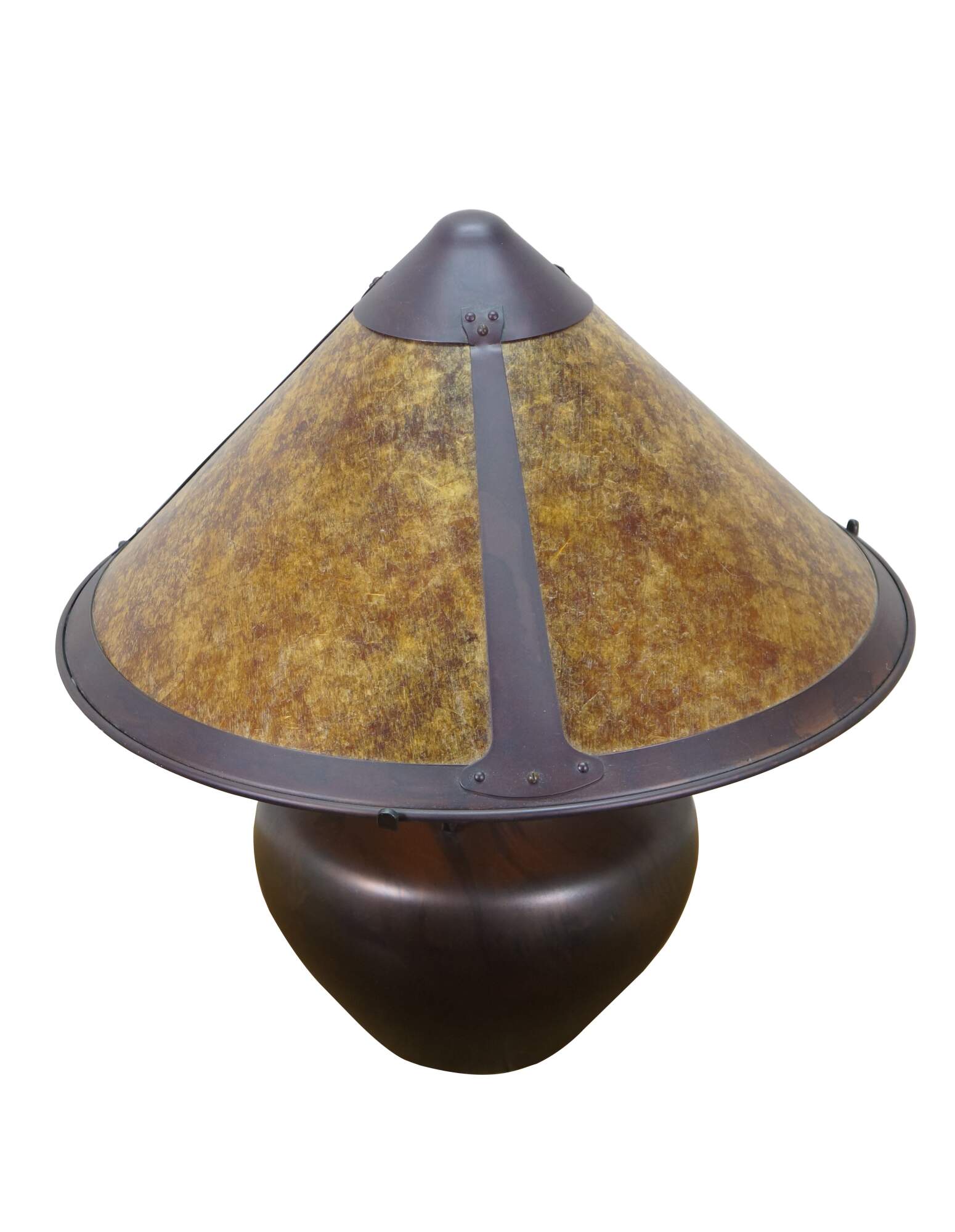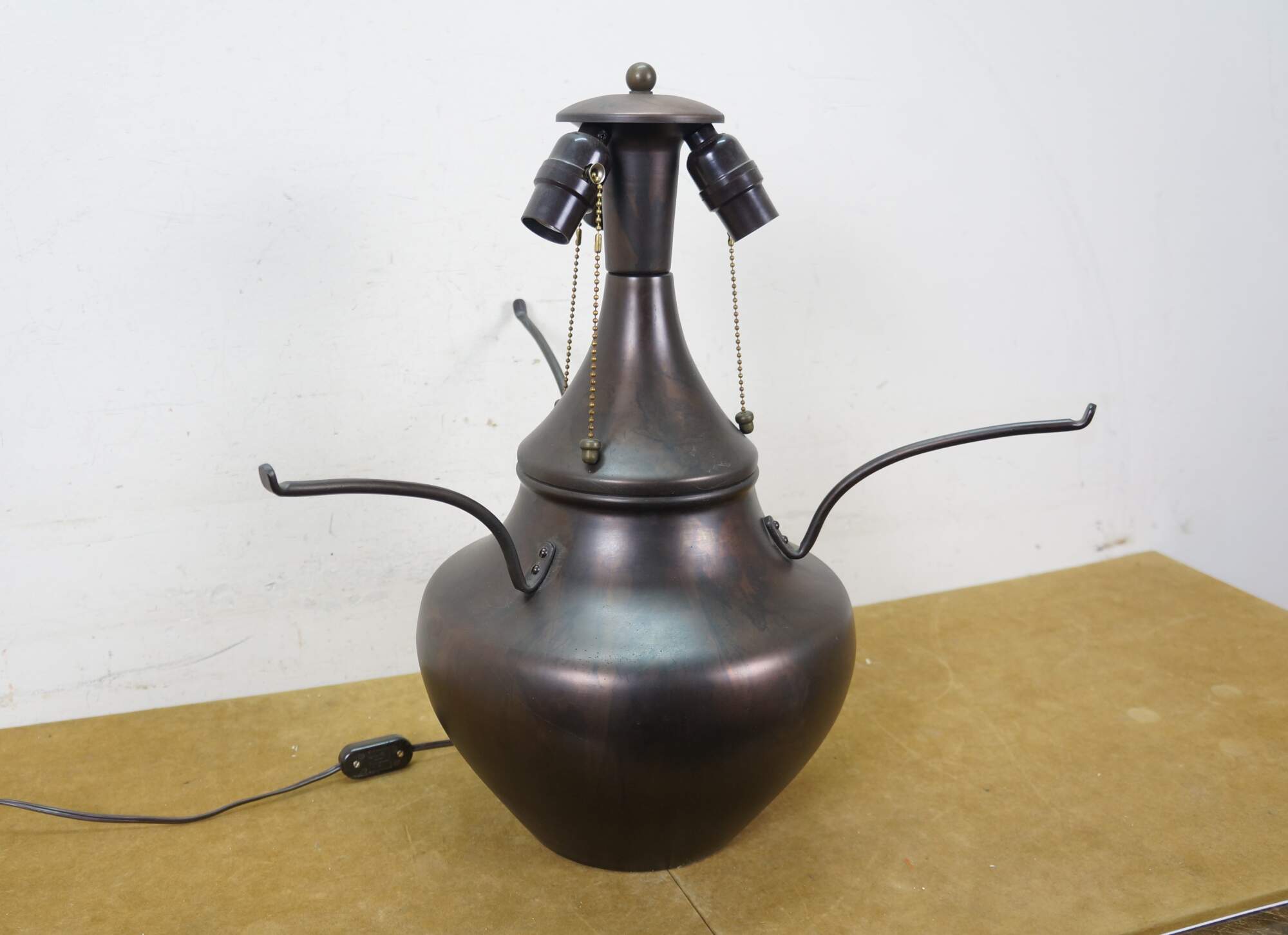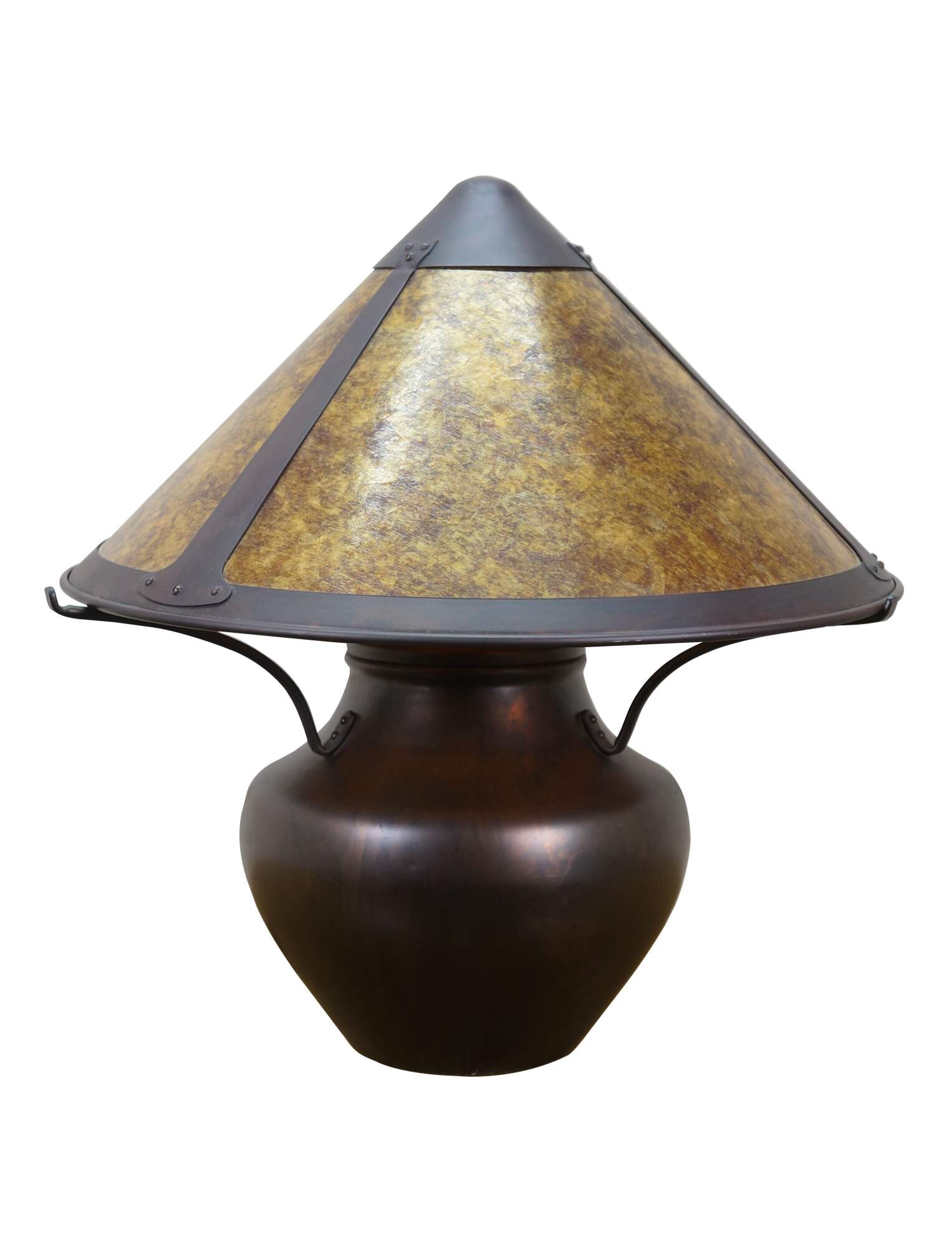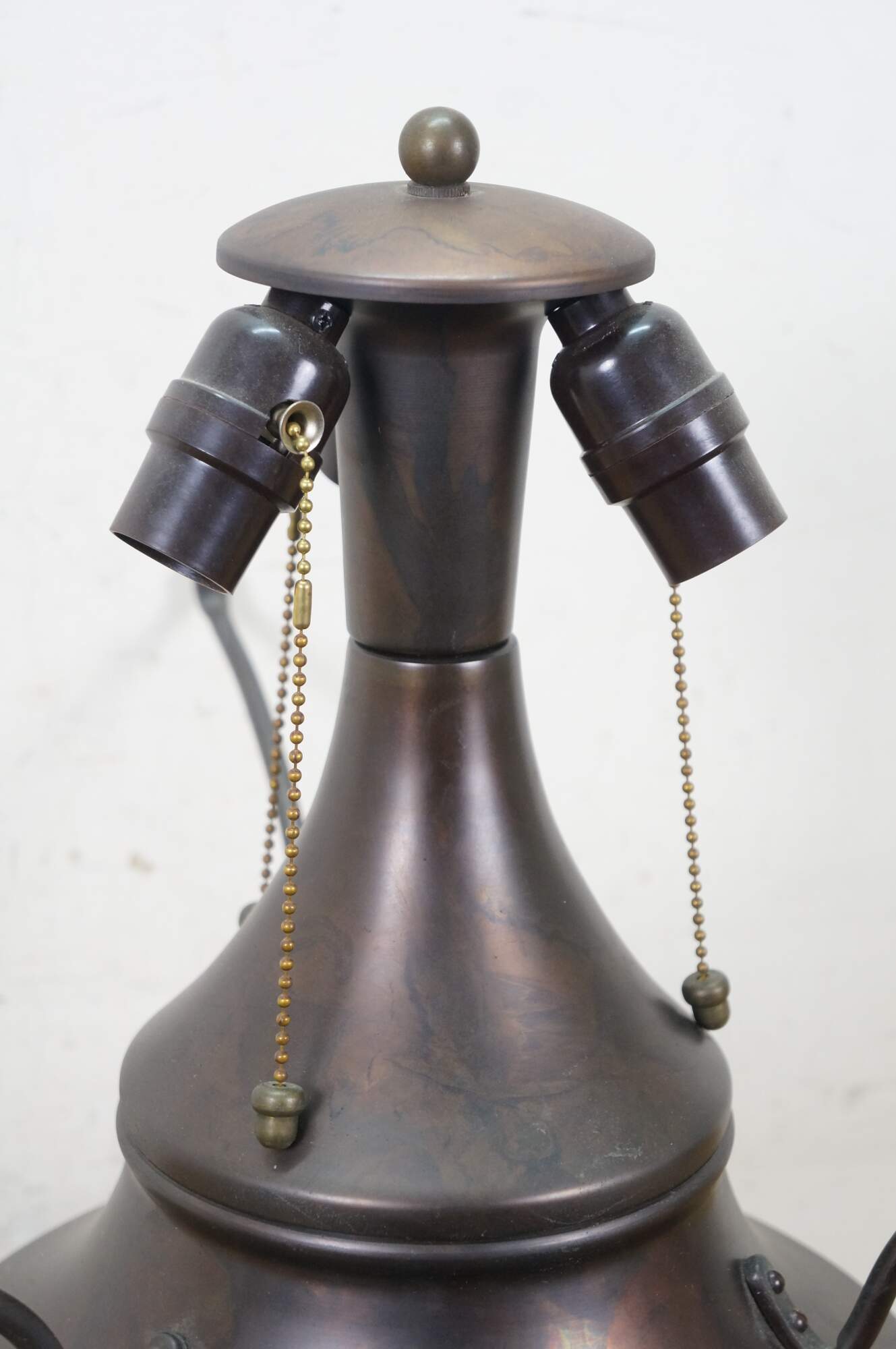 Circa 1997 vase shaped three light coppersmith Arts and Crafts / mission style table lamp by Hannes Schachtner. Made of copper with a dark patina. Dark copper trimmed translucent mica shade. Pull chains on each bulb socket plus master switch on the cord. Mica Lamp Company - Glendale, CA - Solid Copper. Numbered inside shade 081397. Inspired by works by Dirk Van Erp and August Tiesselinck during the Arts and Crafts movement of the early 20th century,