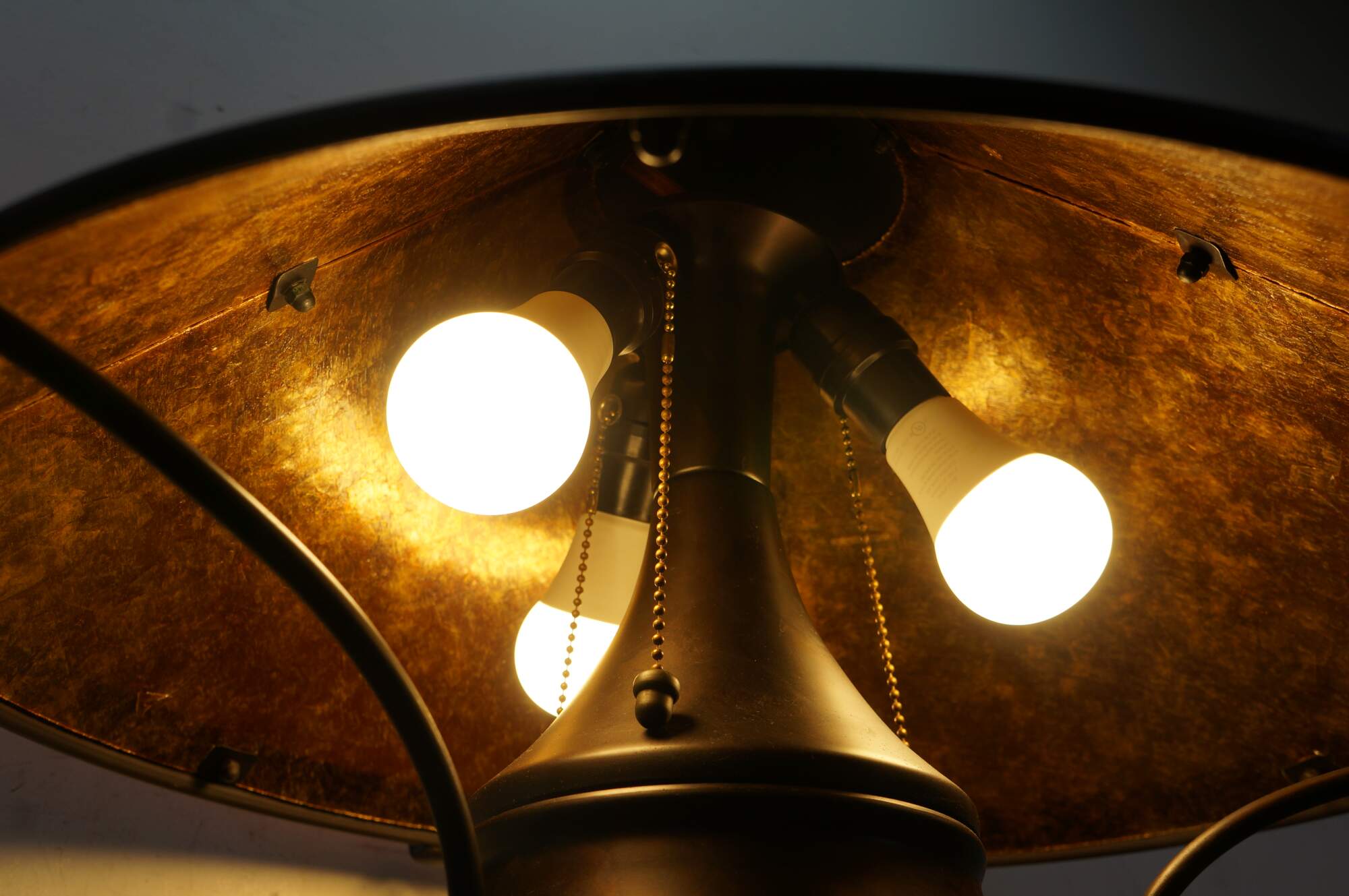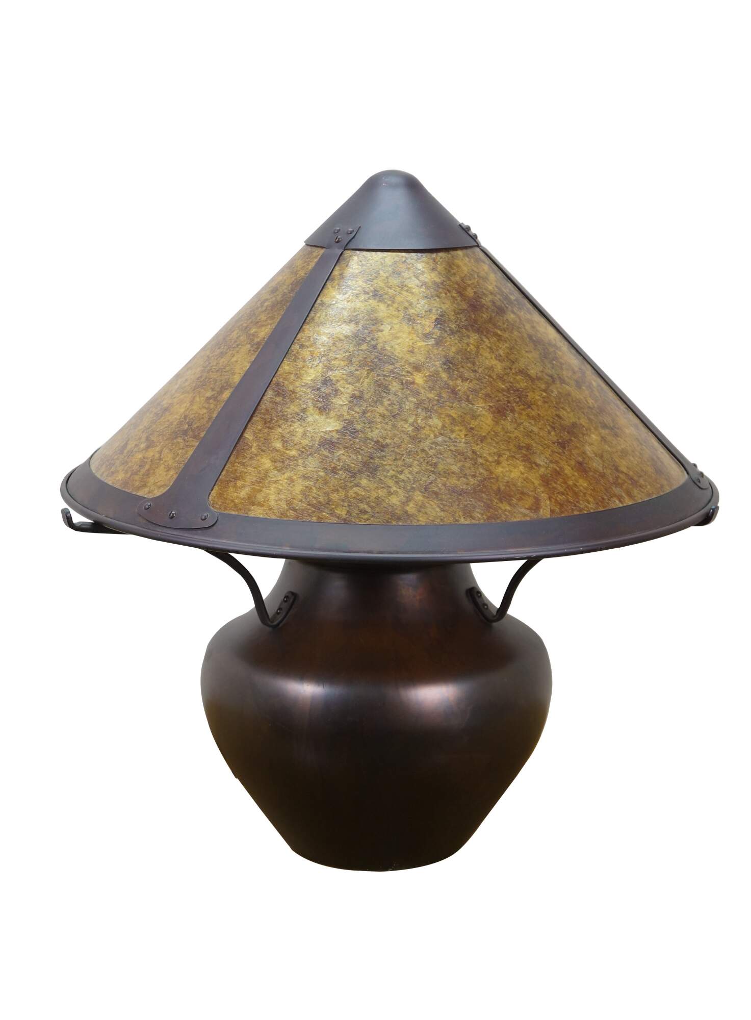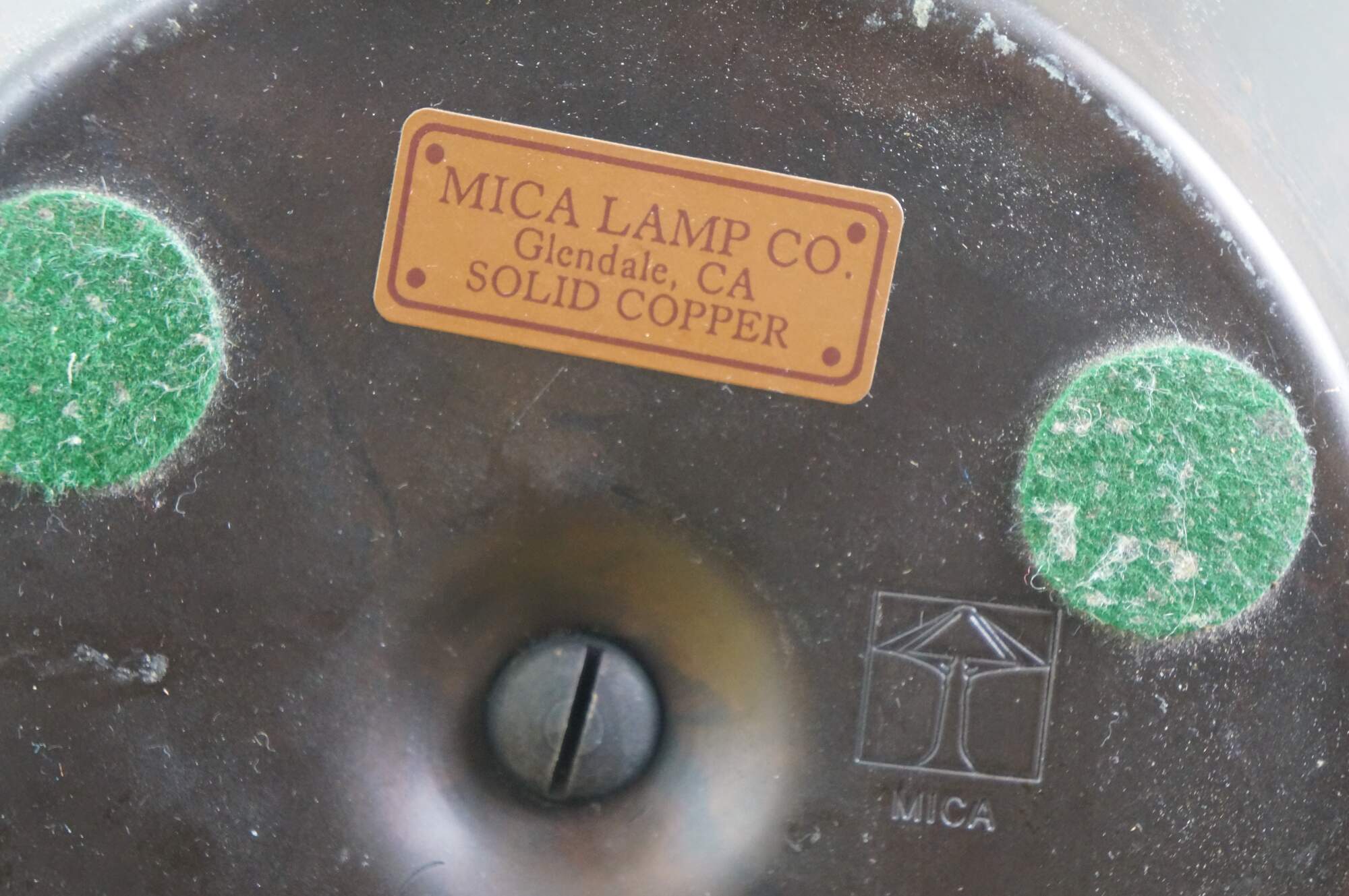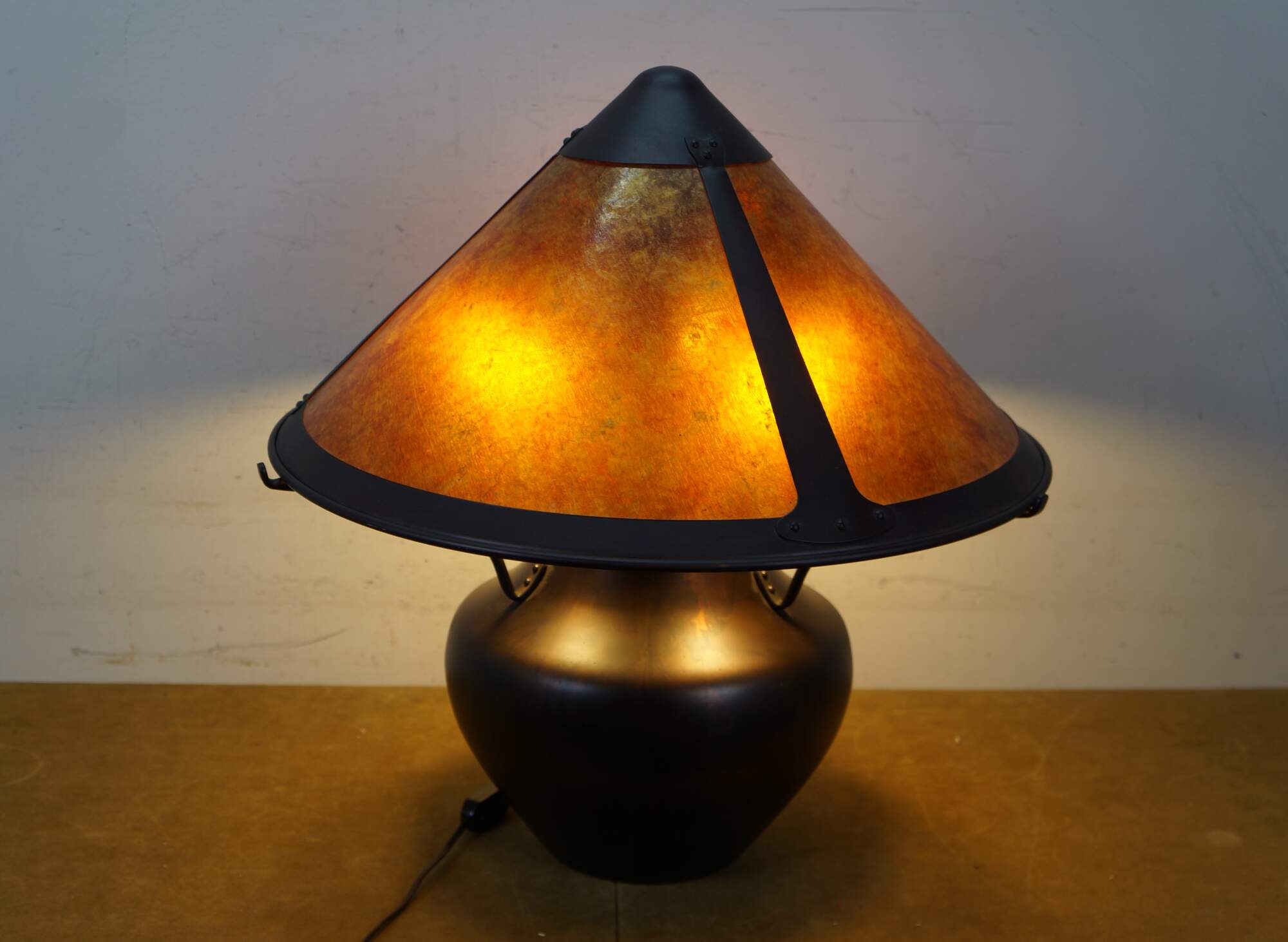 Circa 1997 vase shaped three light coppersmith Arts and Crafts / mission style table lamp by Hannes Schachtner. Made of copper with a dark patina. Dark copper trimmed translucent mica shade. Pull chains on each bulb socket plus master switch on the cord. Mica Lamp Company - Glendale, CA - Solid Copper. Numbered inside shade 081397. Inspired by works by Dirk Van Erp and August Tiesselinck during the Arts and Crafts movement of the early 20th century,