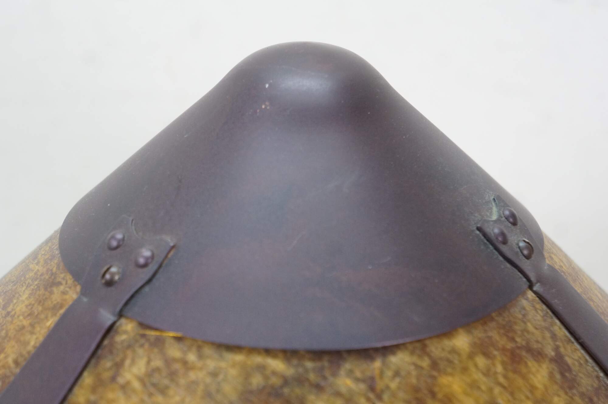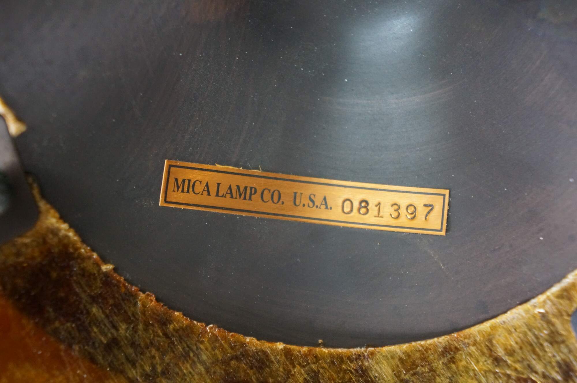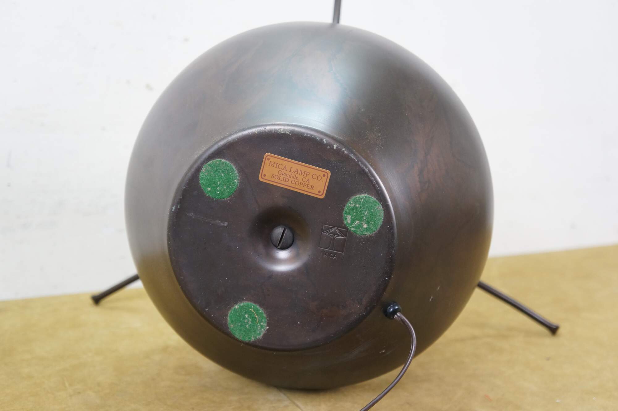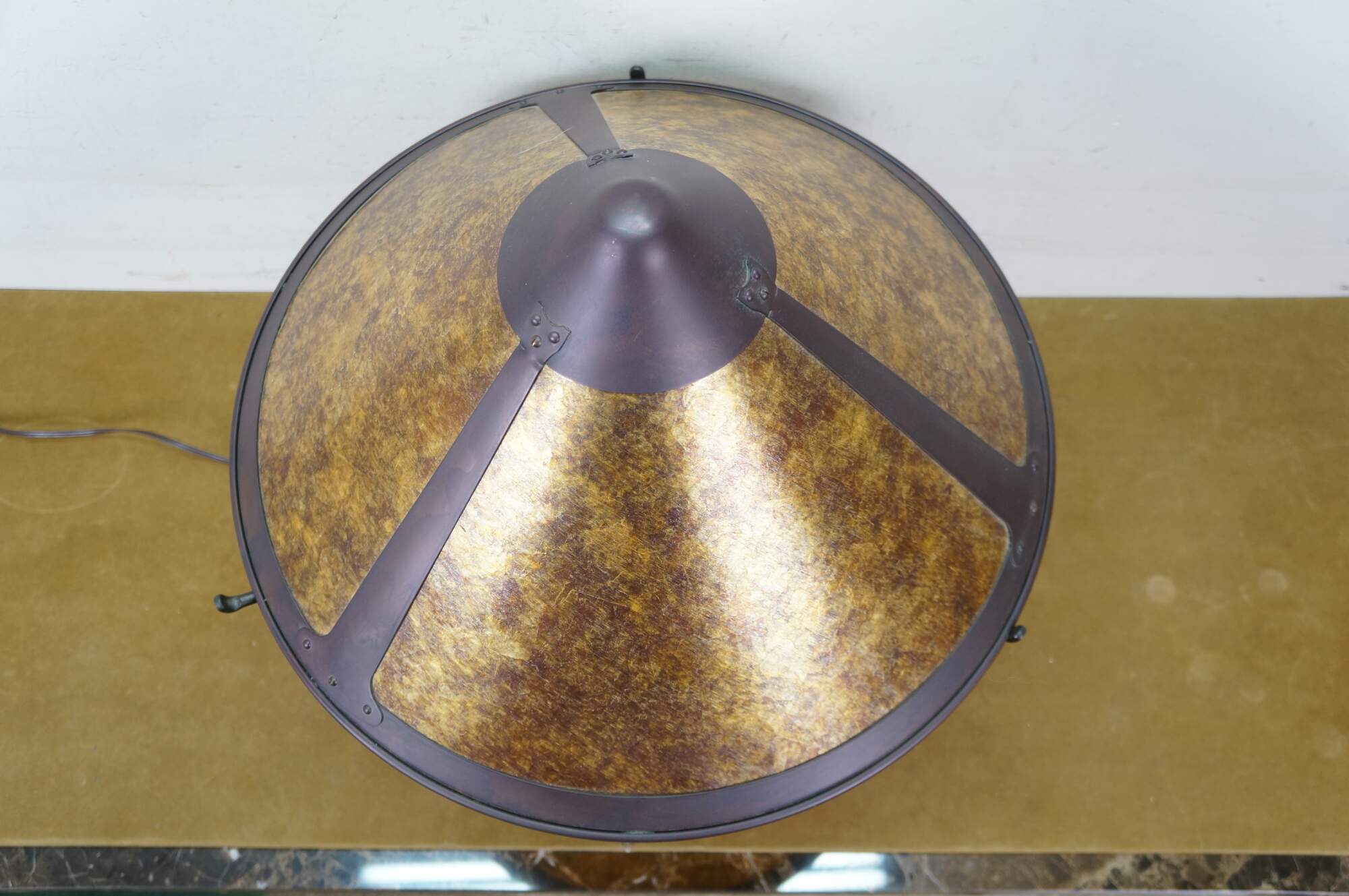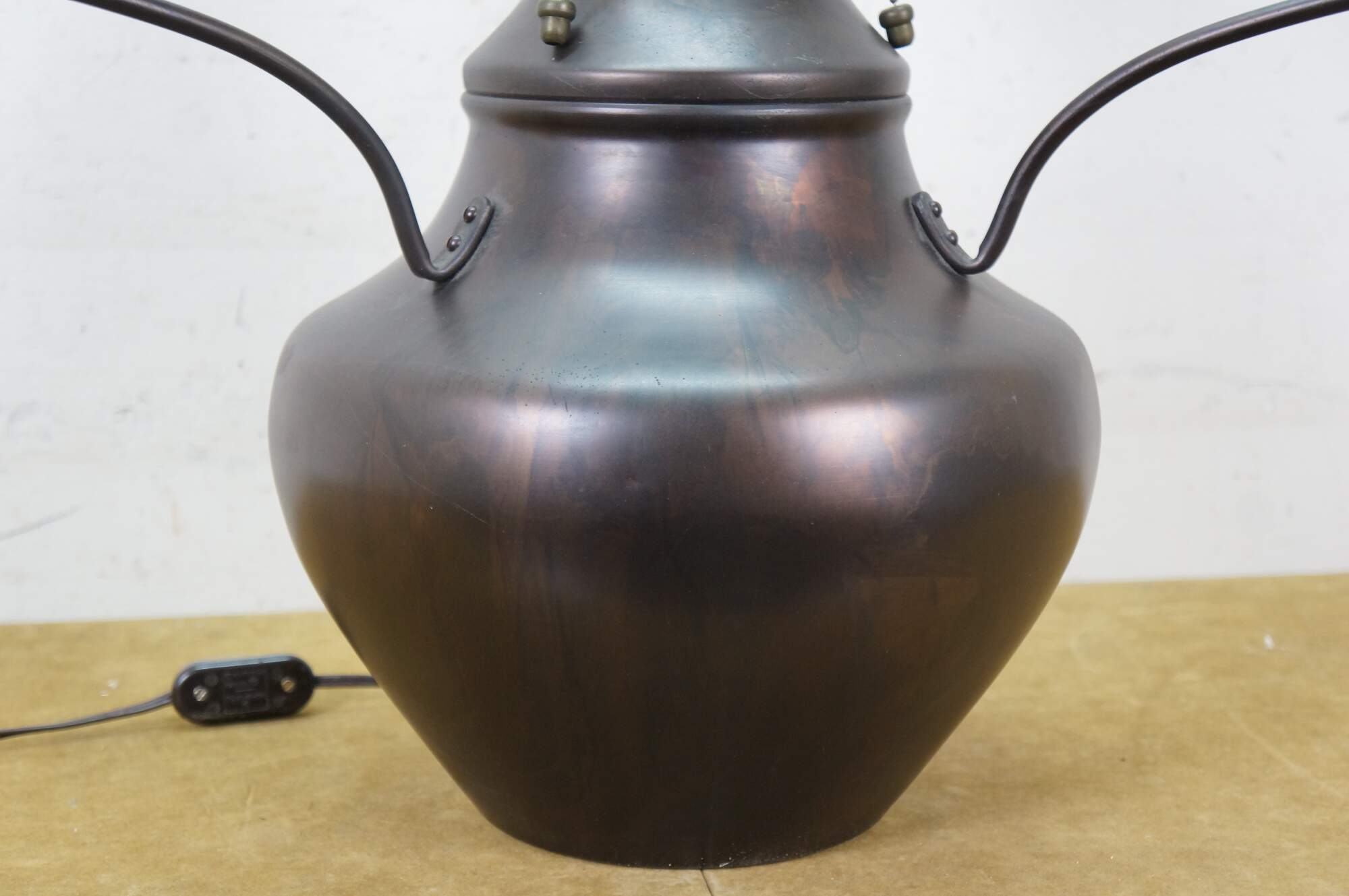 Circa 1997 vase shaped three light coppersmith Arts and Crafts / mission style table lamp by Hannes Schachtner. Made of copper with a dark patina. Dark copper trimmed translucent mica shade. Pull chains on each bulb socket plus master switch on the cord. Mica Lamp Company - Glendale, CA - Solid Copper. Numbered inside shade 081397. Inspired by works by Dirk Van Erp and August Tiesselinck during the Arts and Crafts movement of the early 20th century,