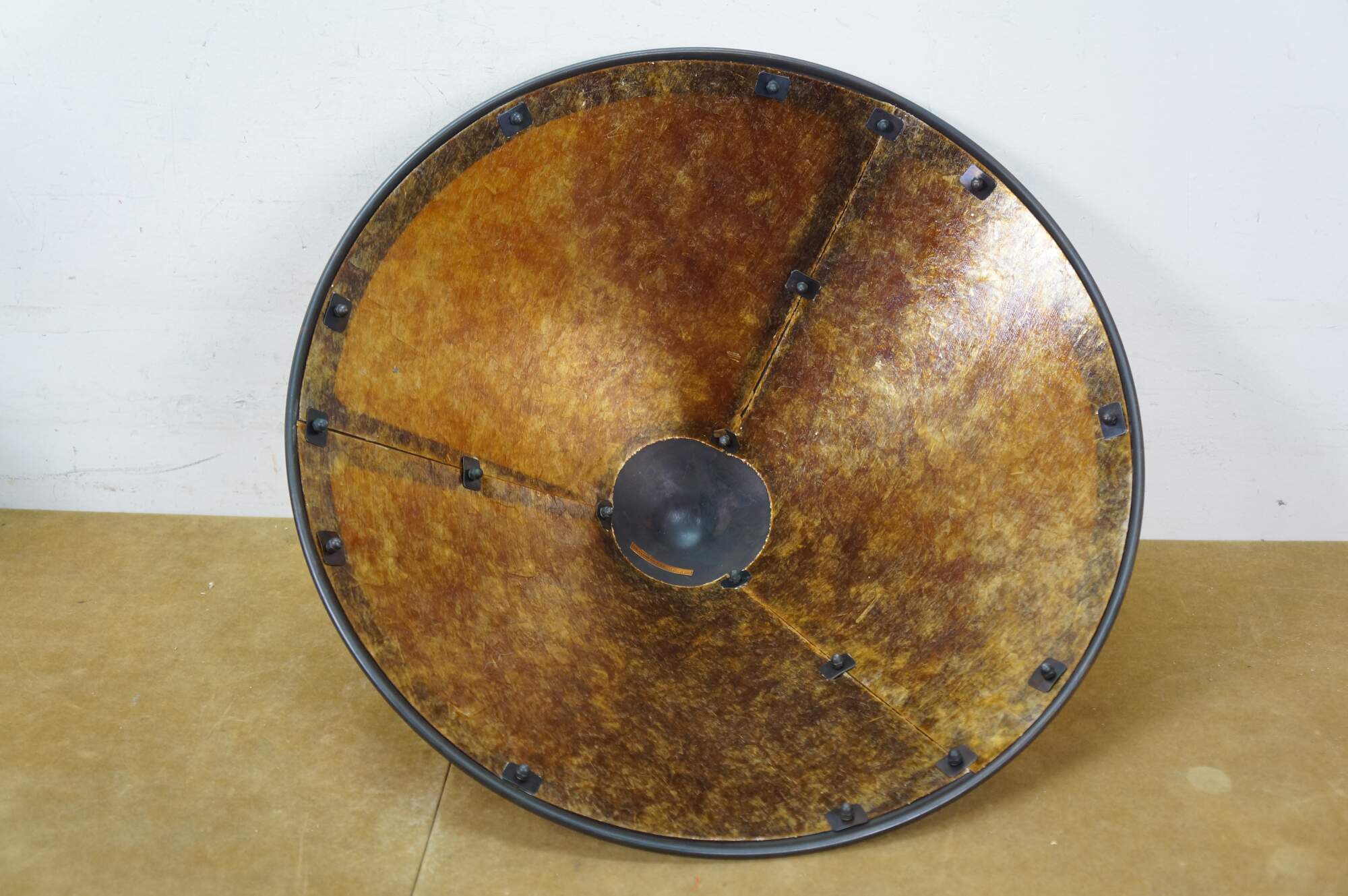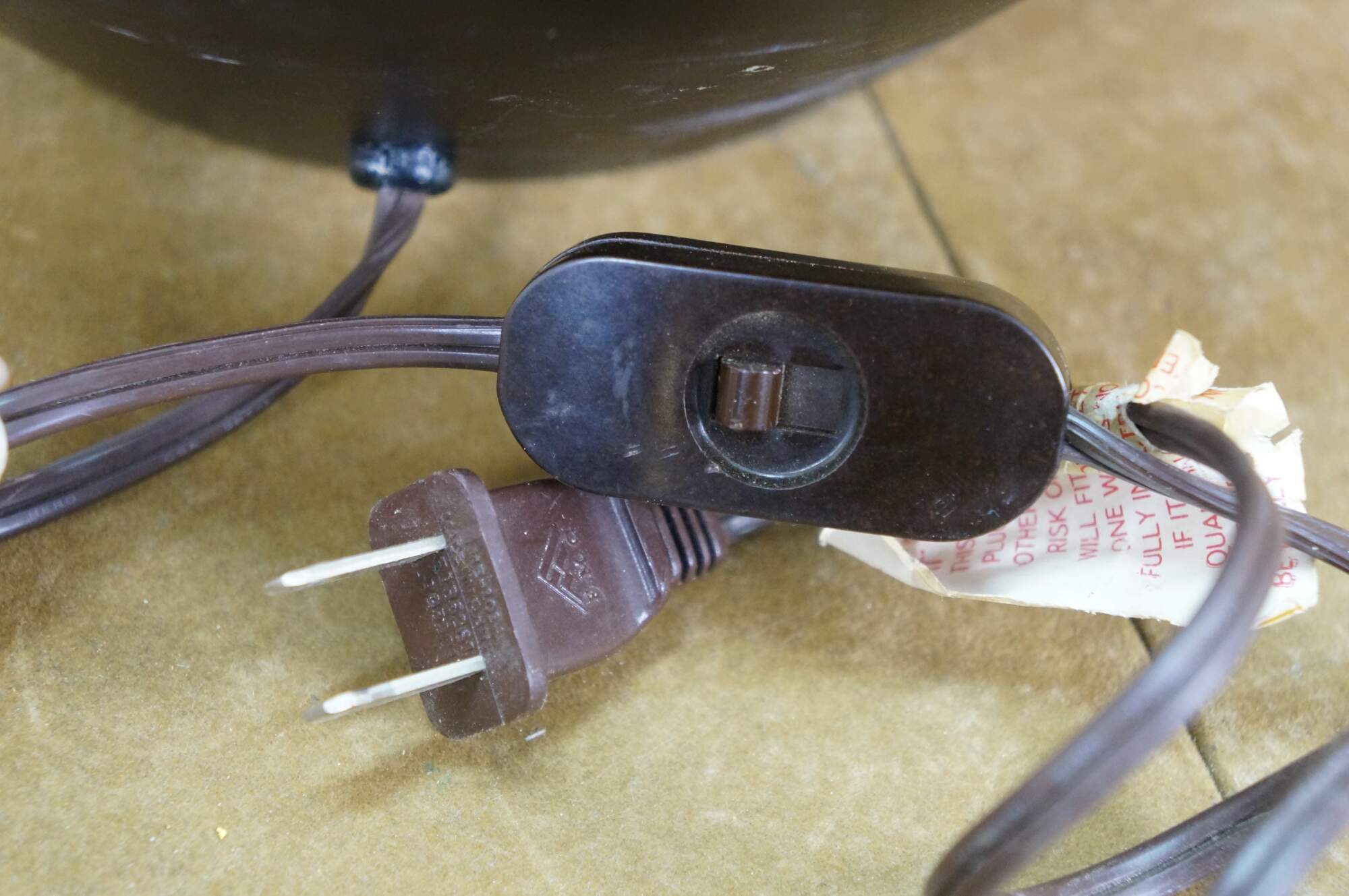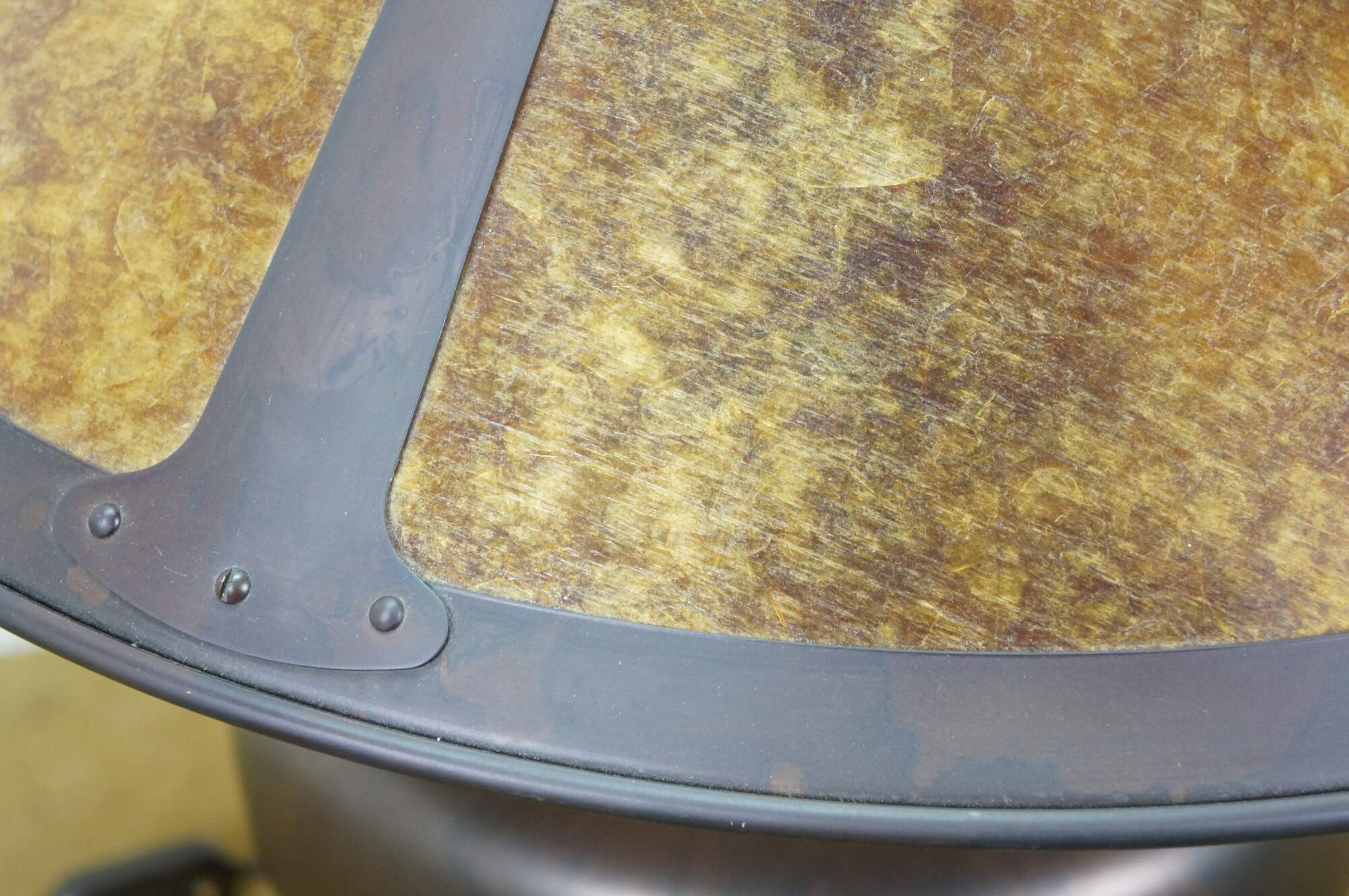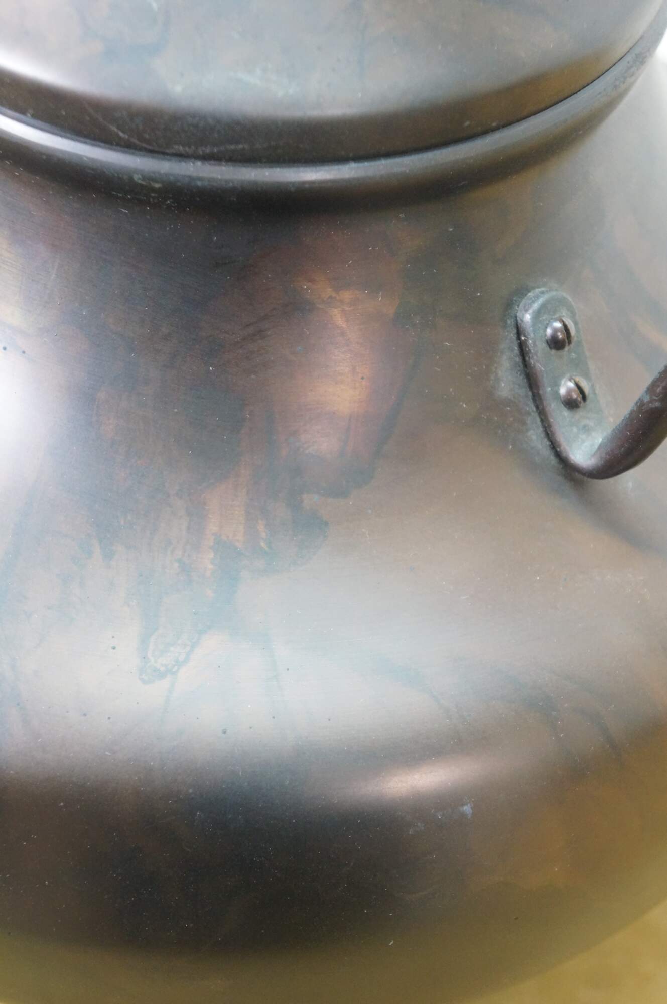 Circa 1997 vase shaped three light coppersmith Arts and Crafts / mission style table lamp by Hannes Schachtner. Made of copper with a dark patina. Dark copper trimmed translucent mica shade. Pull chains on each bulb socket plus master switch on the cord. Mica Lamp Company - Glendale, CA - Solid Copper. Numbered inside shade 081397. Inspired by works by Dirk Van Erp and August Tiesselinck during the Arts and Crafts movement of the early 20th century,