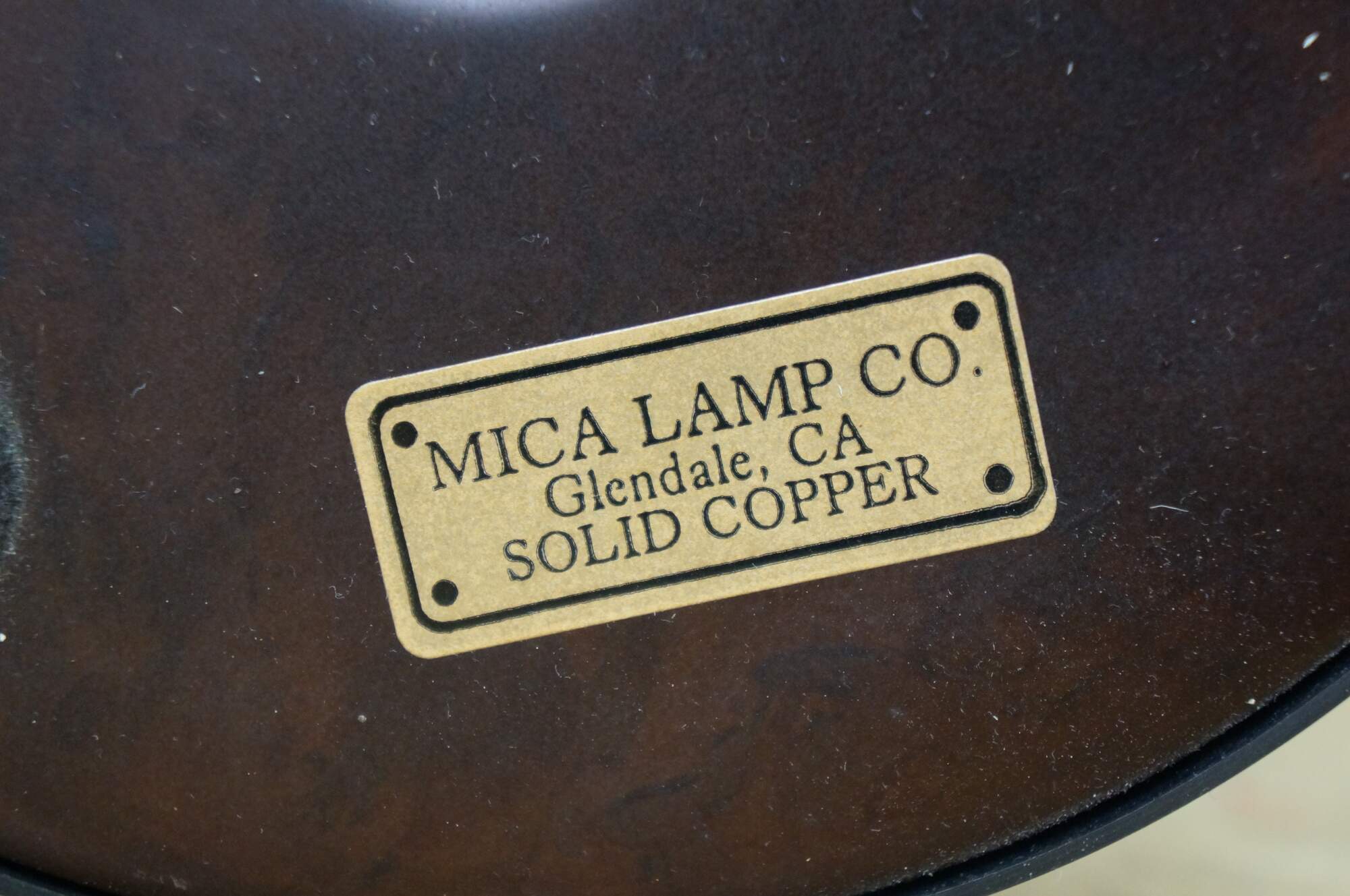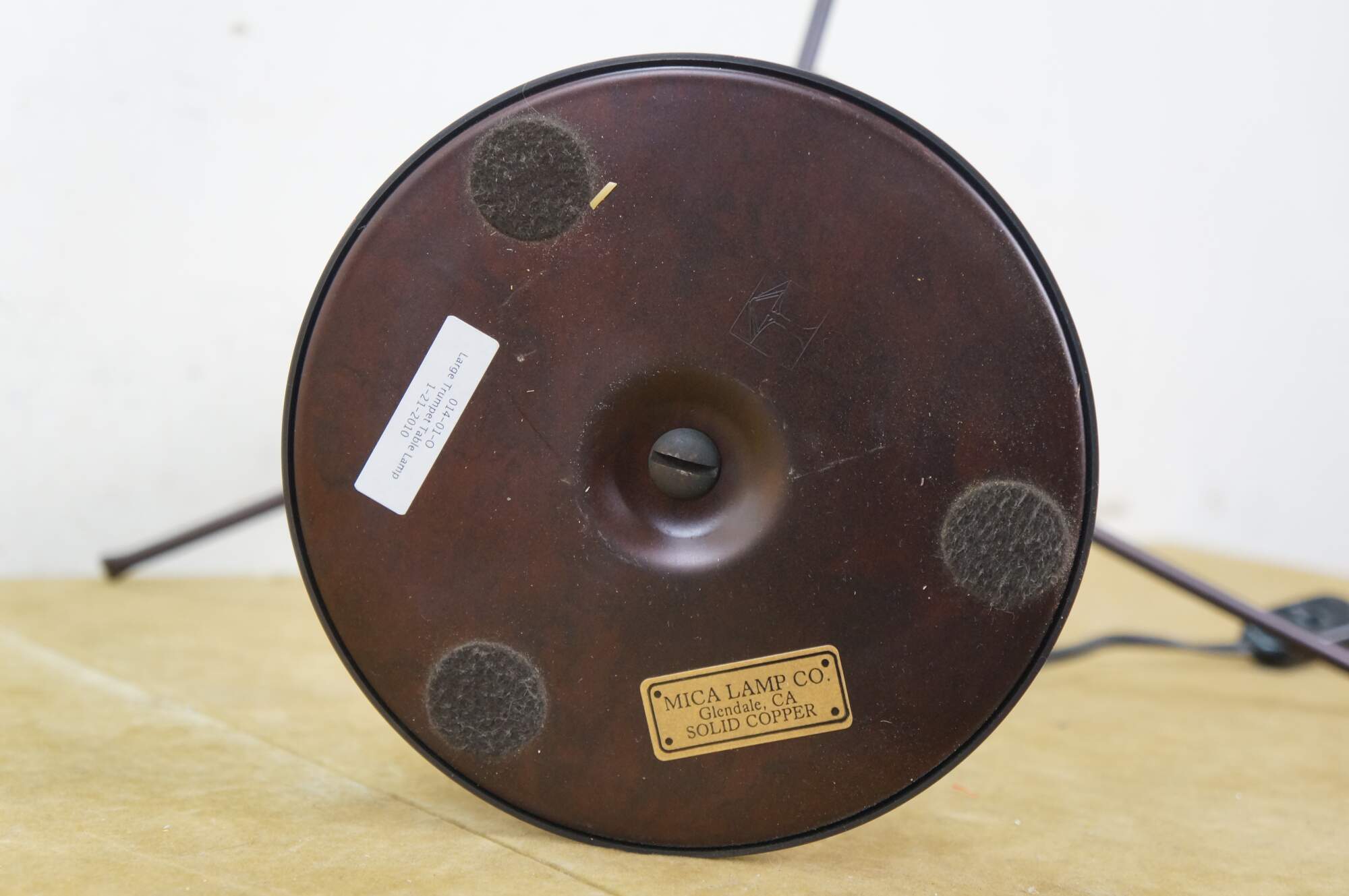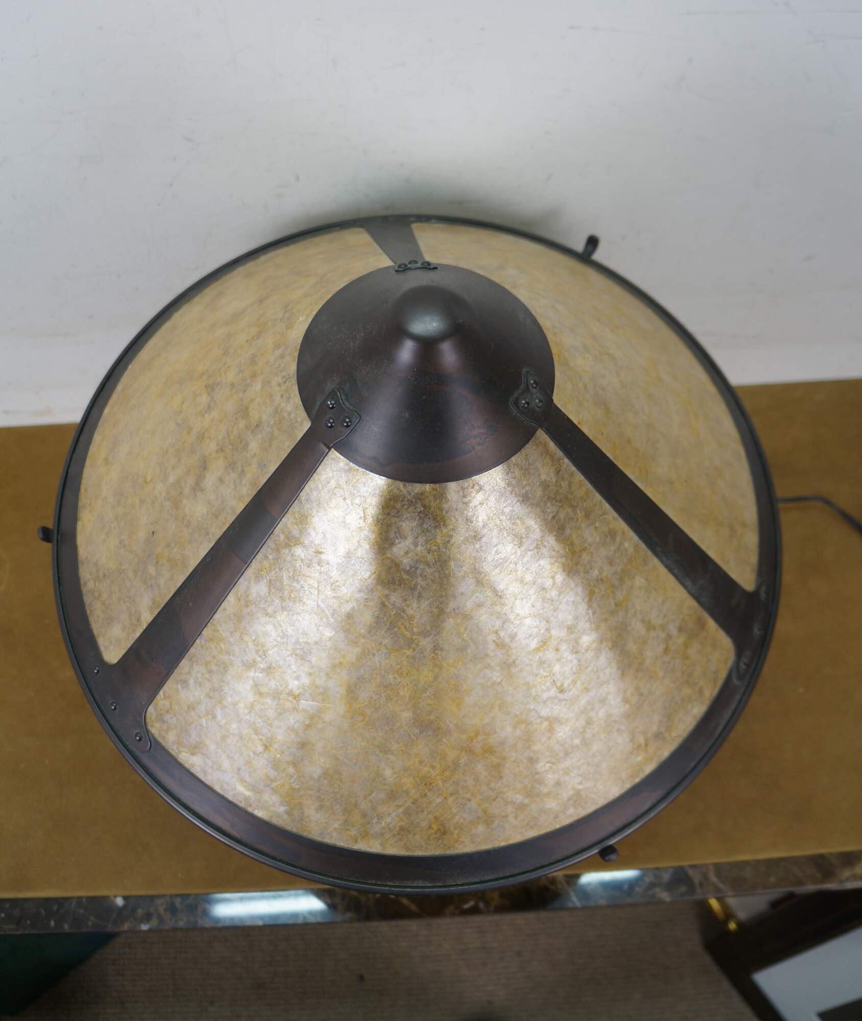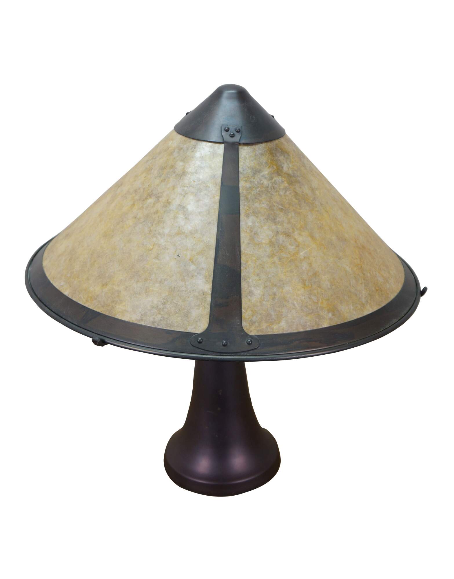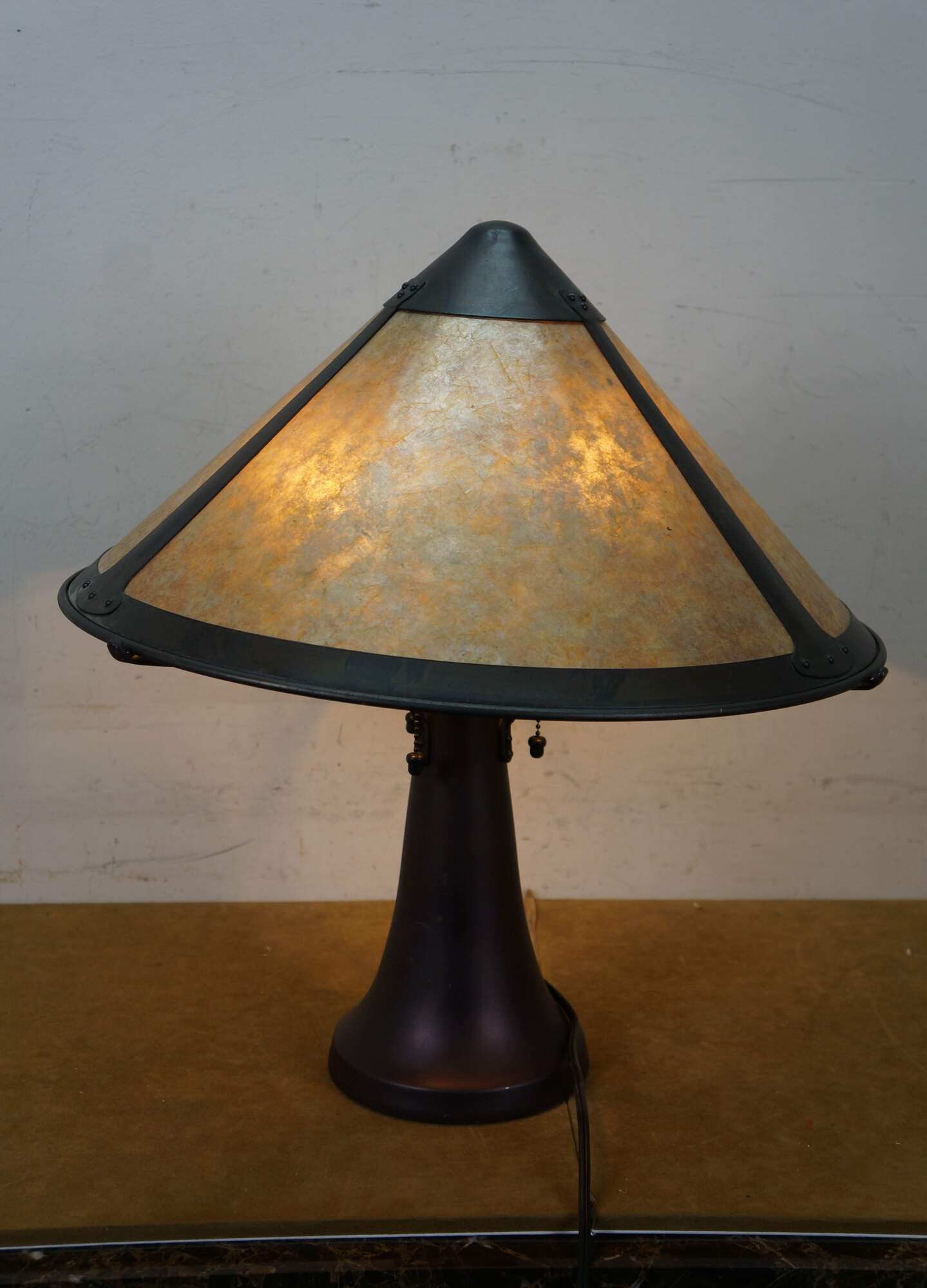 Circa 2000 large trumpet shaped three light Arts and Crafts / mission style table lamp. Made of copper with a dark patina. Dark copper trimmed translucent mica shade. Pull chains on each bulb socket plus master switch on the cord. Mica Lamp Company - Glendale, CA - Solid Copper. 014-01-O Large Trumpet Table Lamp - 1-21-2000. Numbered inside shade 971600. Inspired by Dirk van Erp Hammered Copper & Mica Trumpet Lamp c1915-1920.