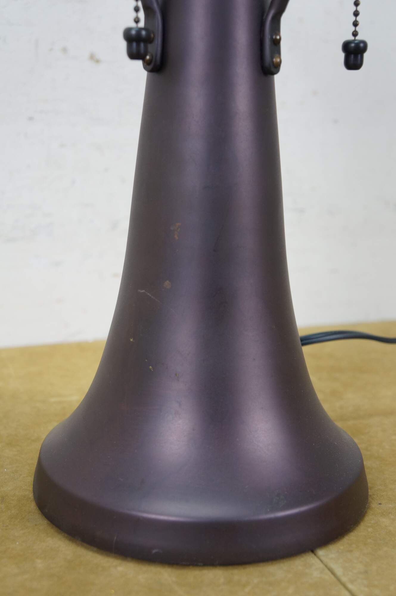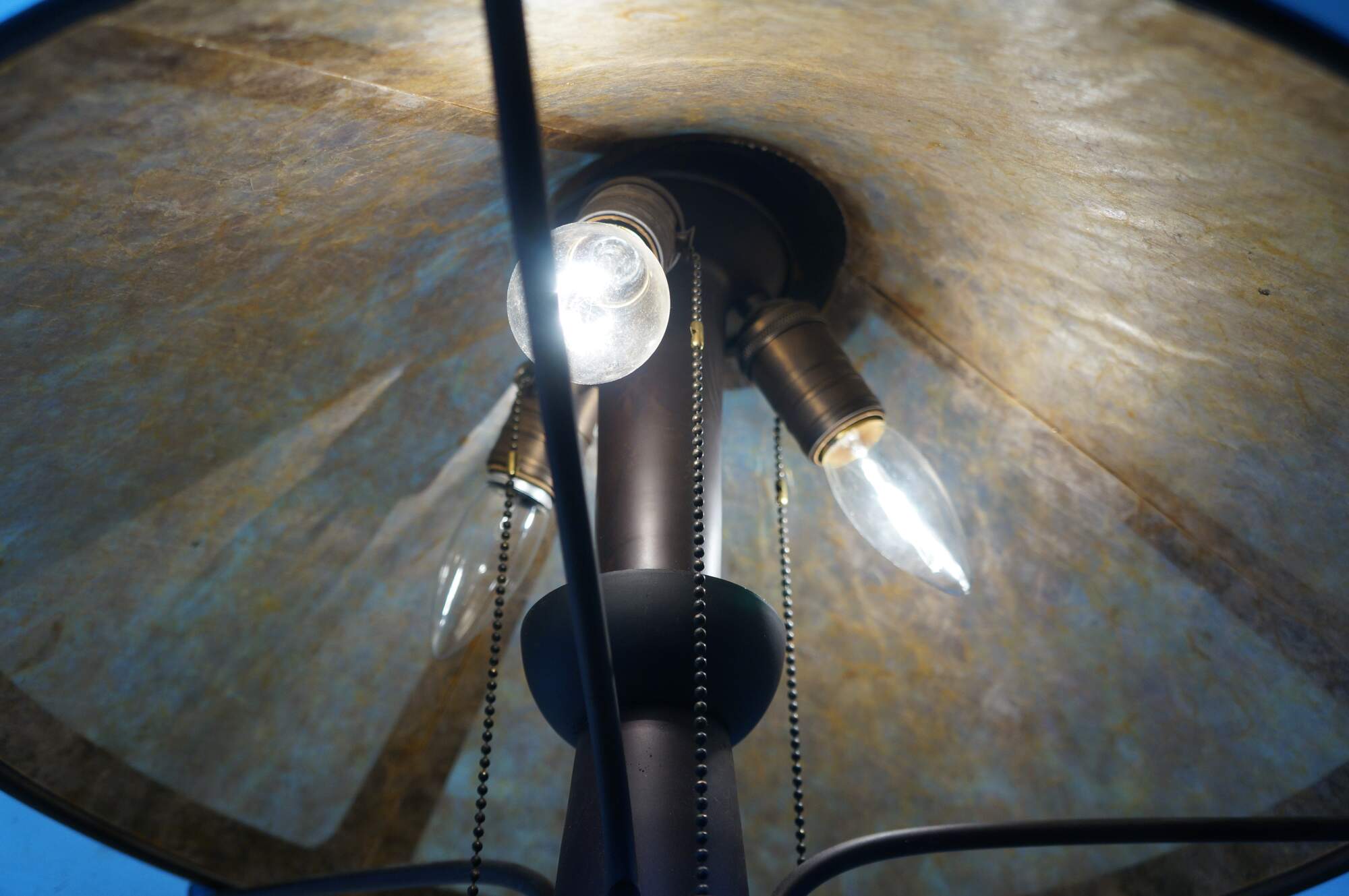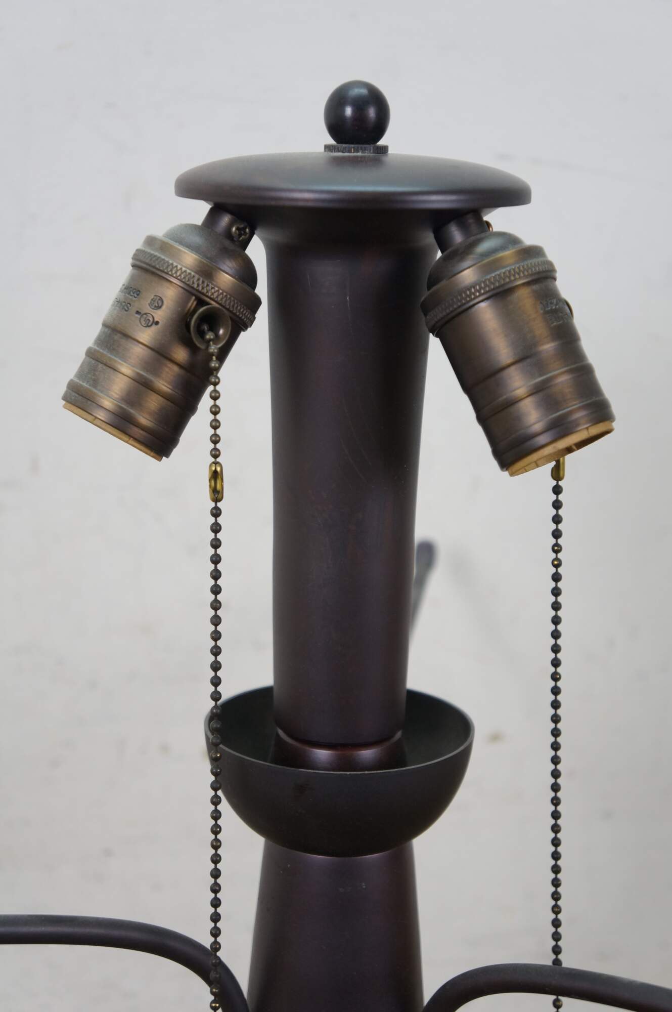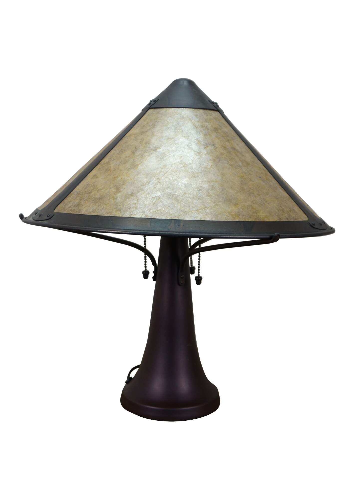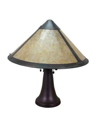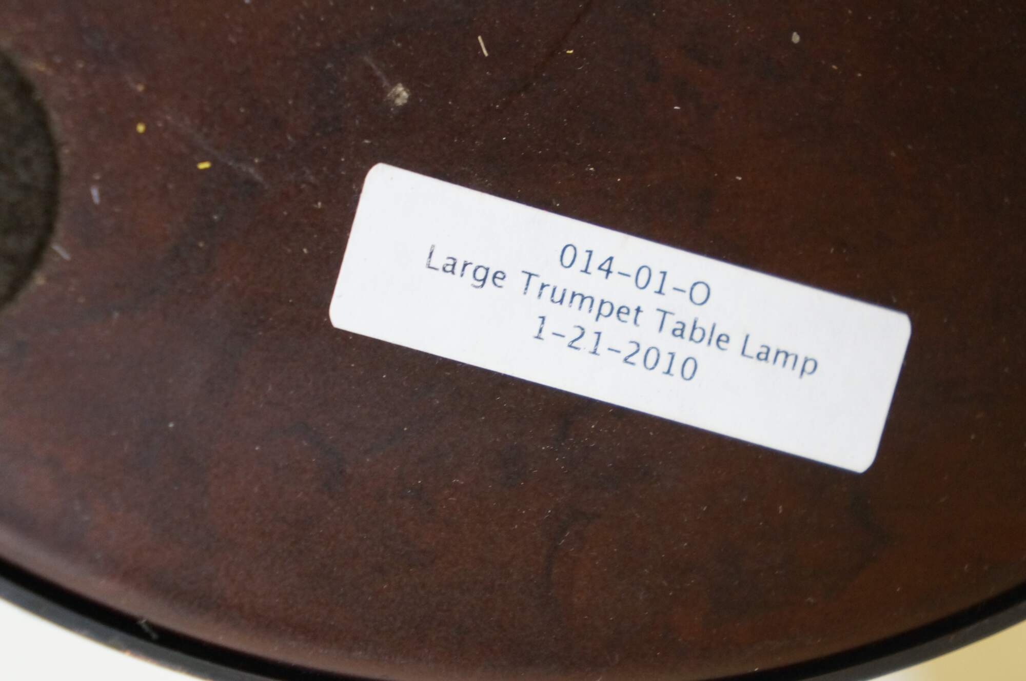Circa 2000 large trumpet shaped three light Arts and Crafts / mission style table lamp. Made of copper with a dark patina. Dark copper trimmed translucent mica shade. Pull chains on each bulb socket plus master switch on the cord. Mica Lamp Company - Glendale, CA - Solid Copper. 014-01-O Large Trumpet Table Lamp - 1-21-2000. Numbered inside shade 971600. Inspired by Dirk van Erp Hammered Copper & Mica Trumpet Lamp c1915-1920.