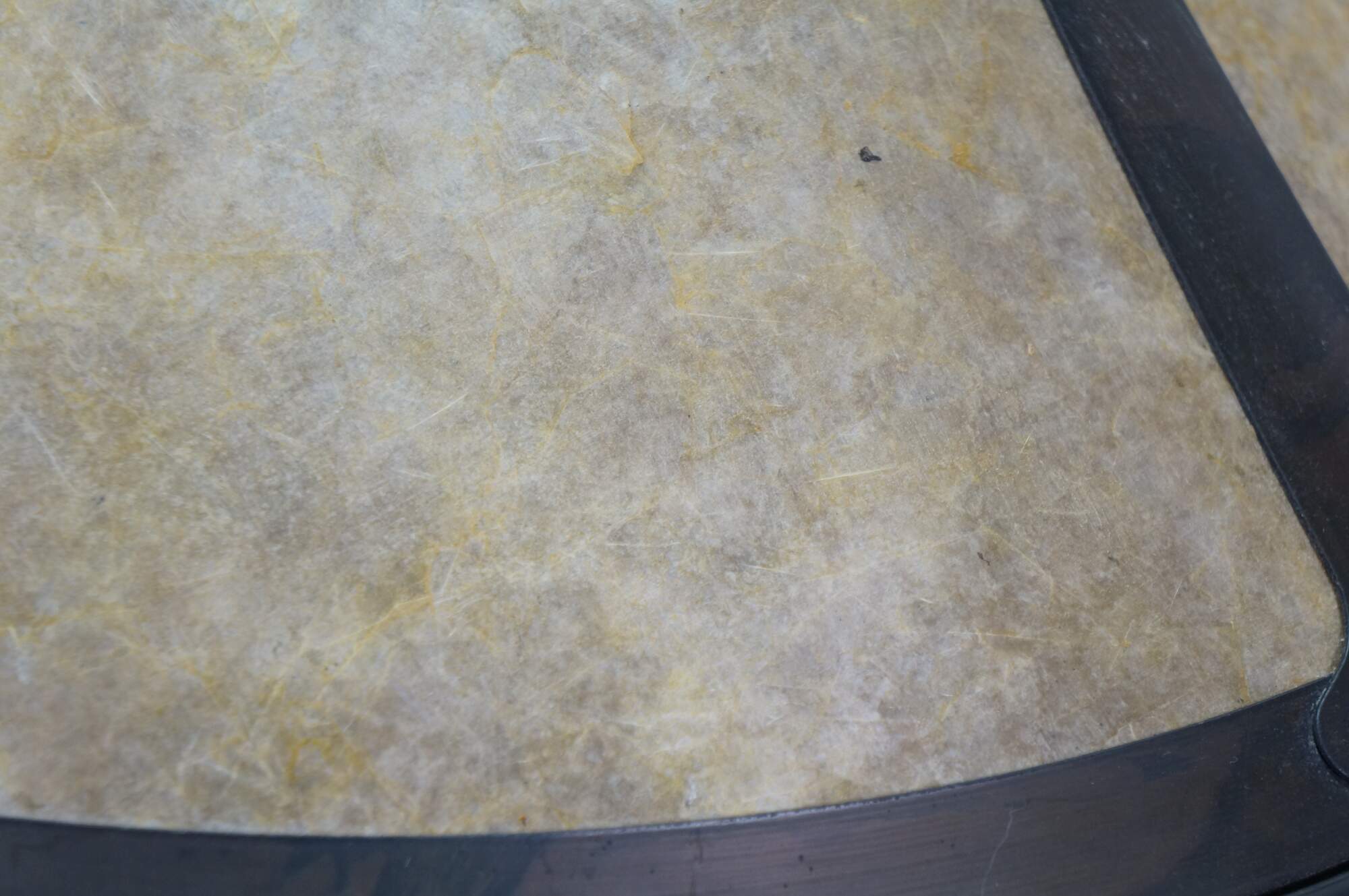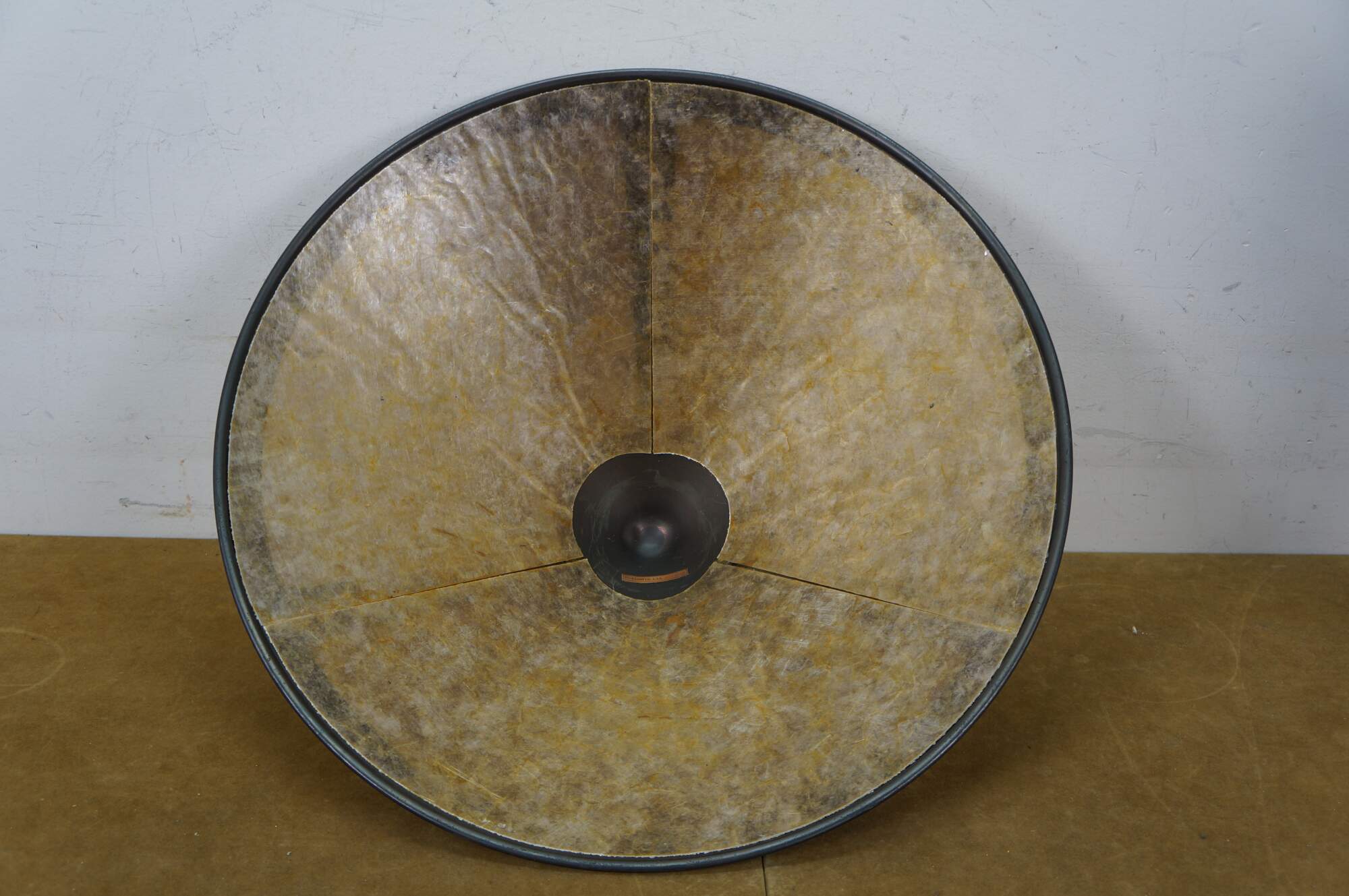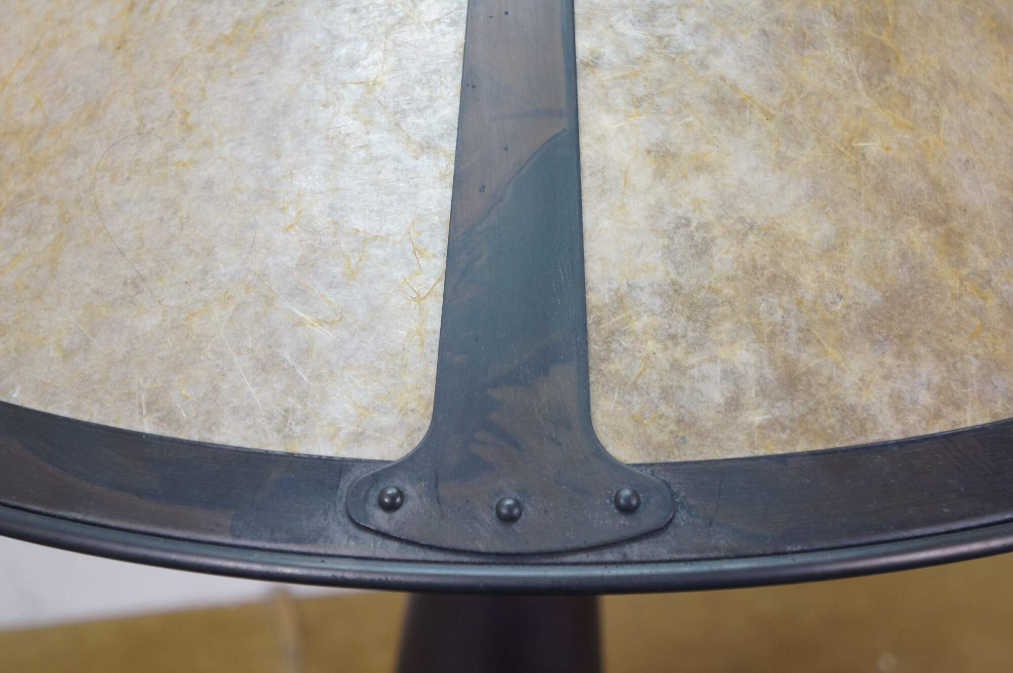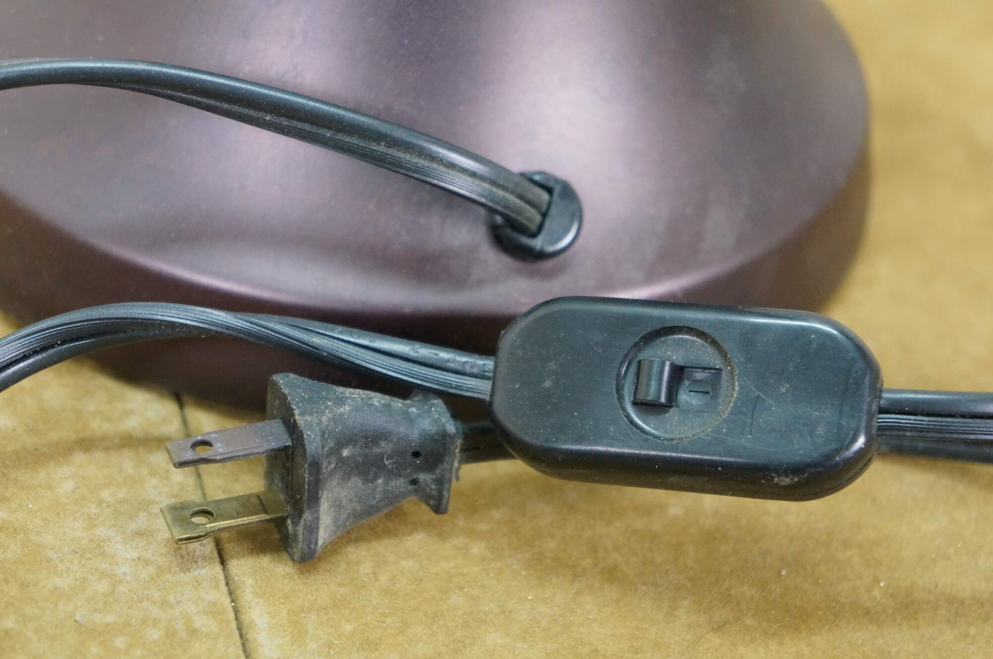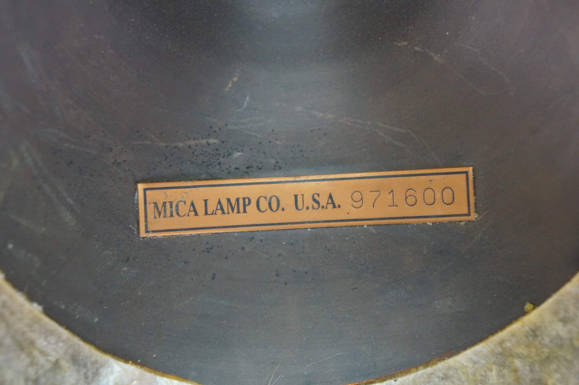 Circa 2000 large trumpet shaped three light Arts and Crafts / mission style table lamp. Made of copper with a dark patina. Dark copper trimmed translucent mica shade. Pull chains on each bulb socket plus master switch on the cord. Mica Lamp Company - Glendale, CA - Solid Copper. 014-01-O Large Trumpet Table Lamp - 1-21-2000. Numbered inside shade 971600. Inspired by Dirk van Erp Hammered Copper & Mica Trumpet Lamp c1915-1920.