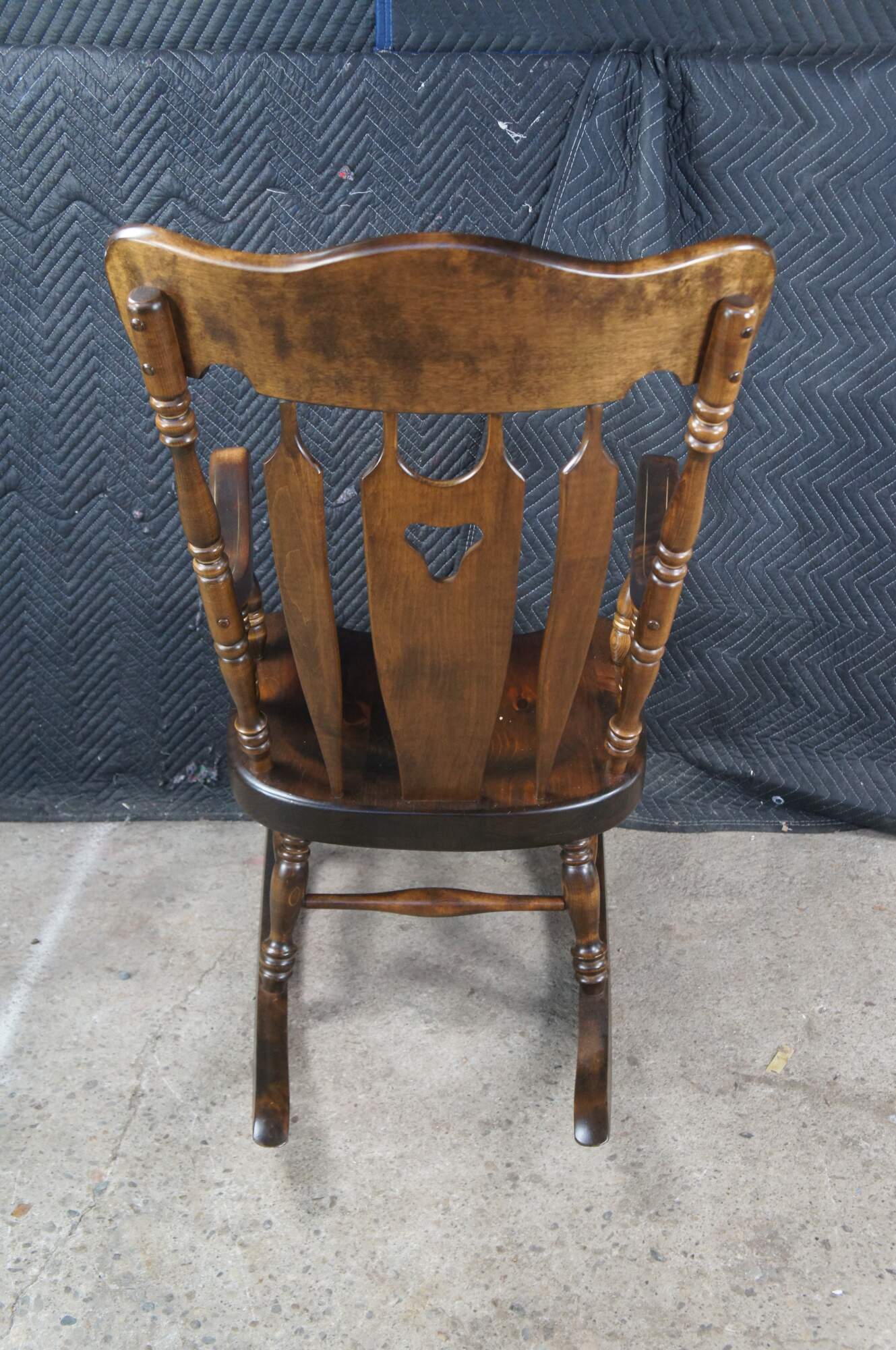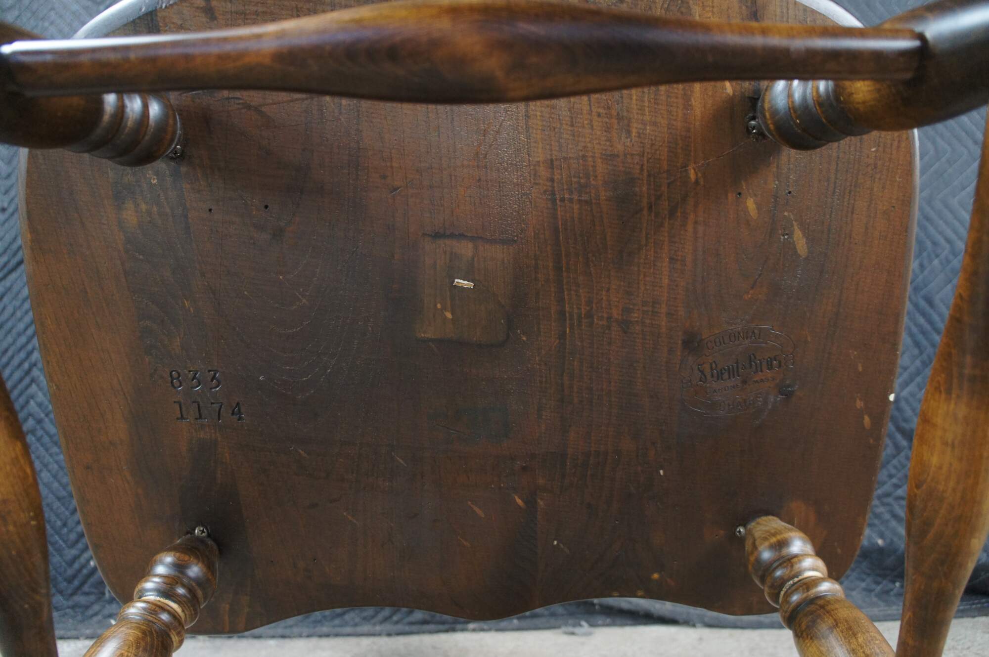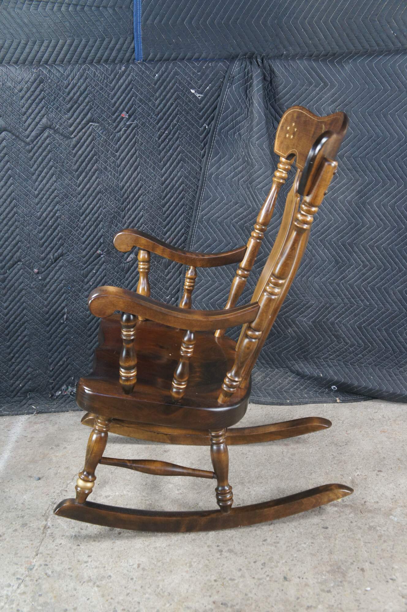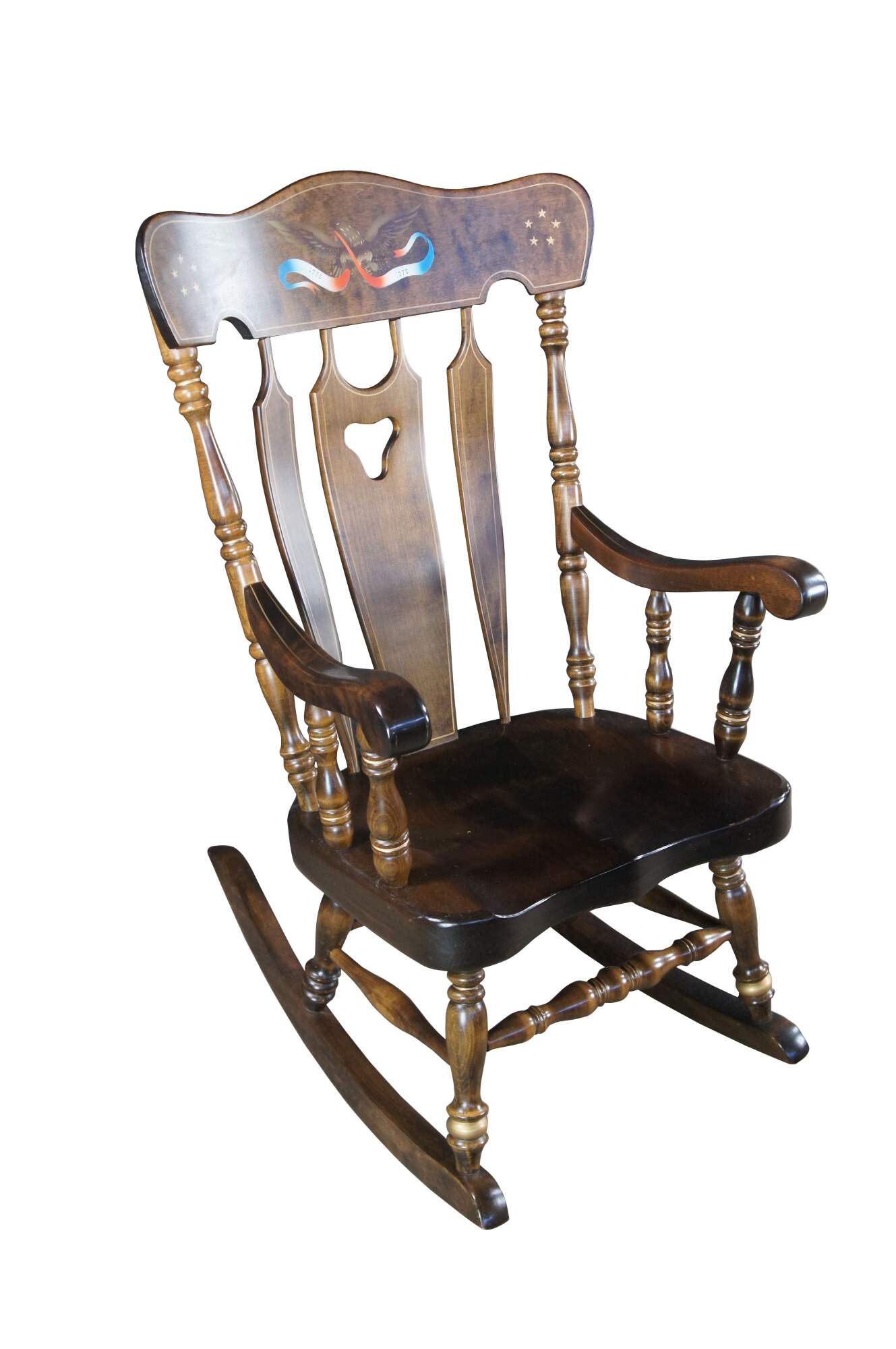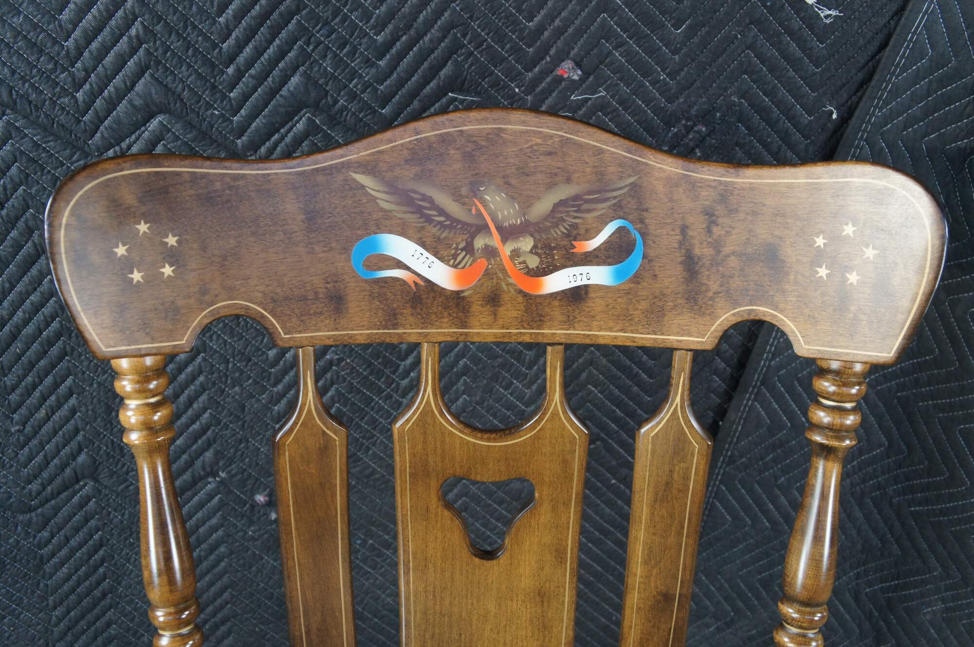 Antique rocking chair by S. Bent & Bros. Made of Maple featuring colonial styling with slatted back and turned posts with a stenciled American Eagle 1776-1976 banner and stars. 833 1174.