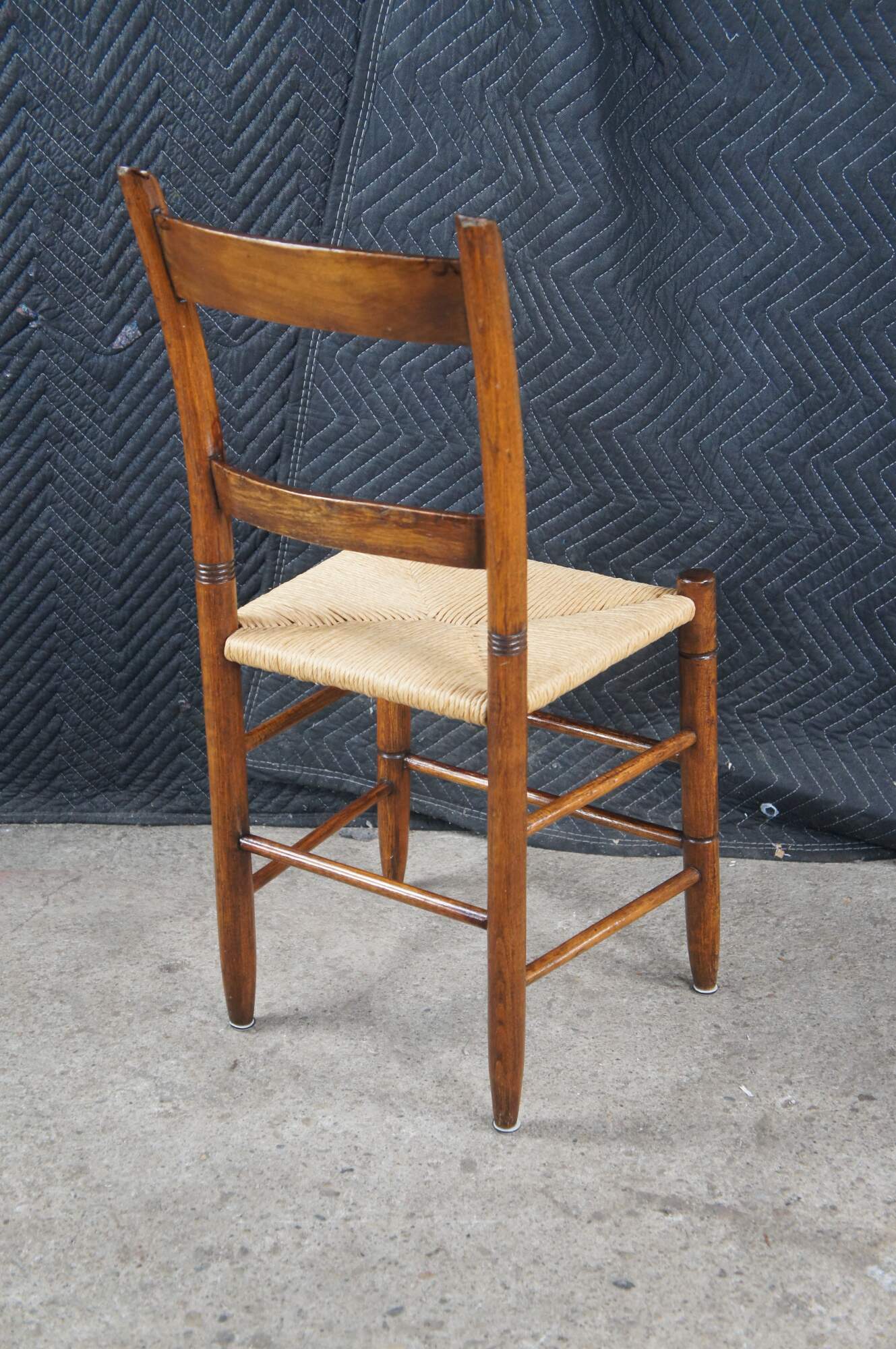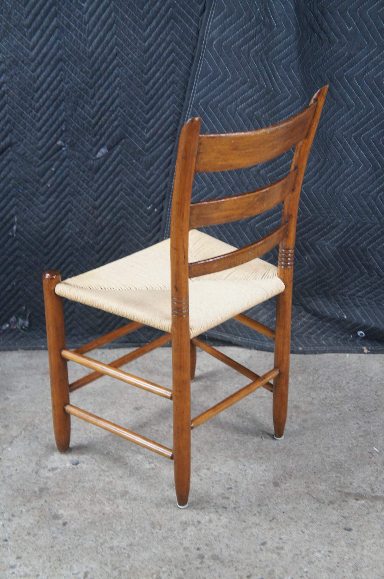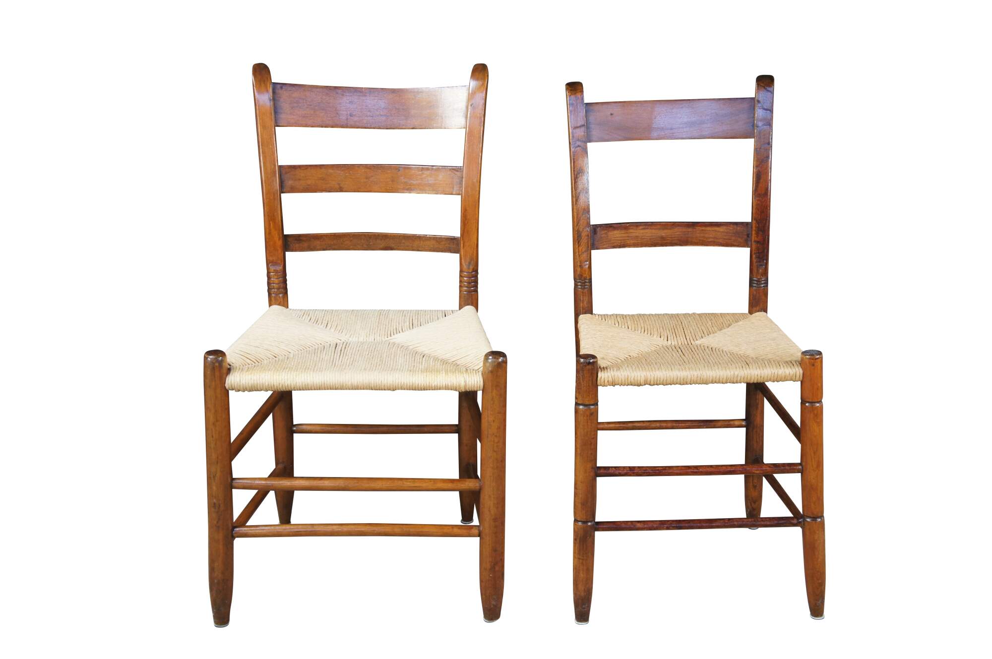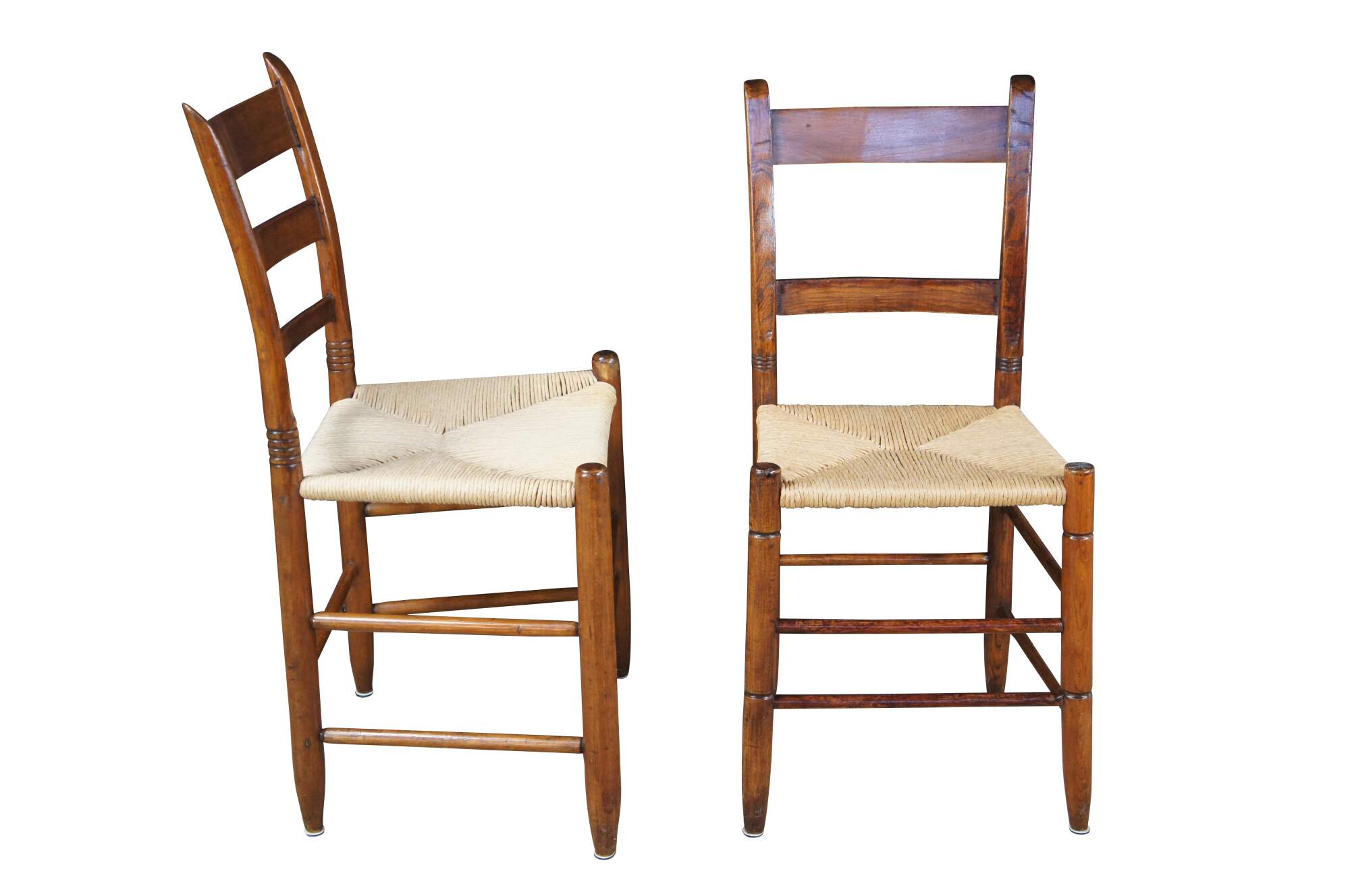 Antique Shaker style his and hers side dining chairs featuring maple frames with ladderback design and woven rush seats.
