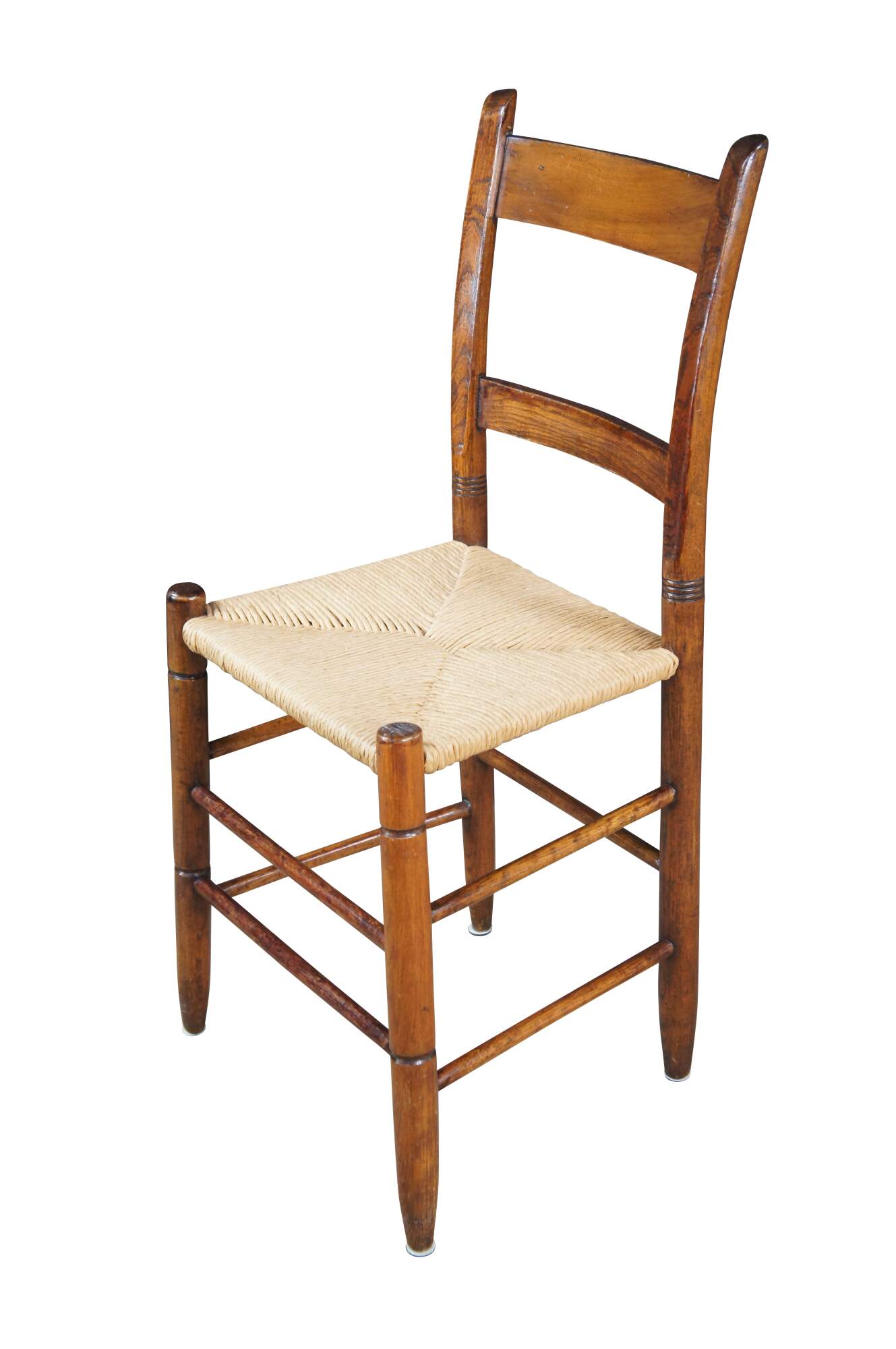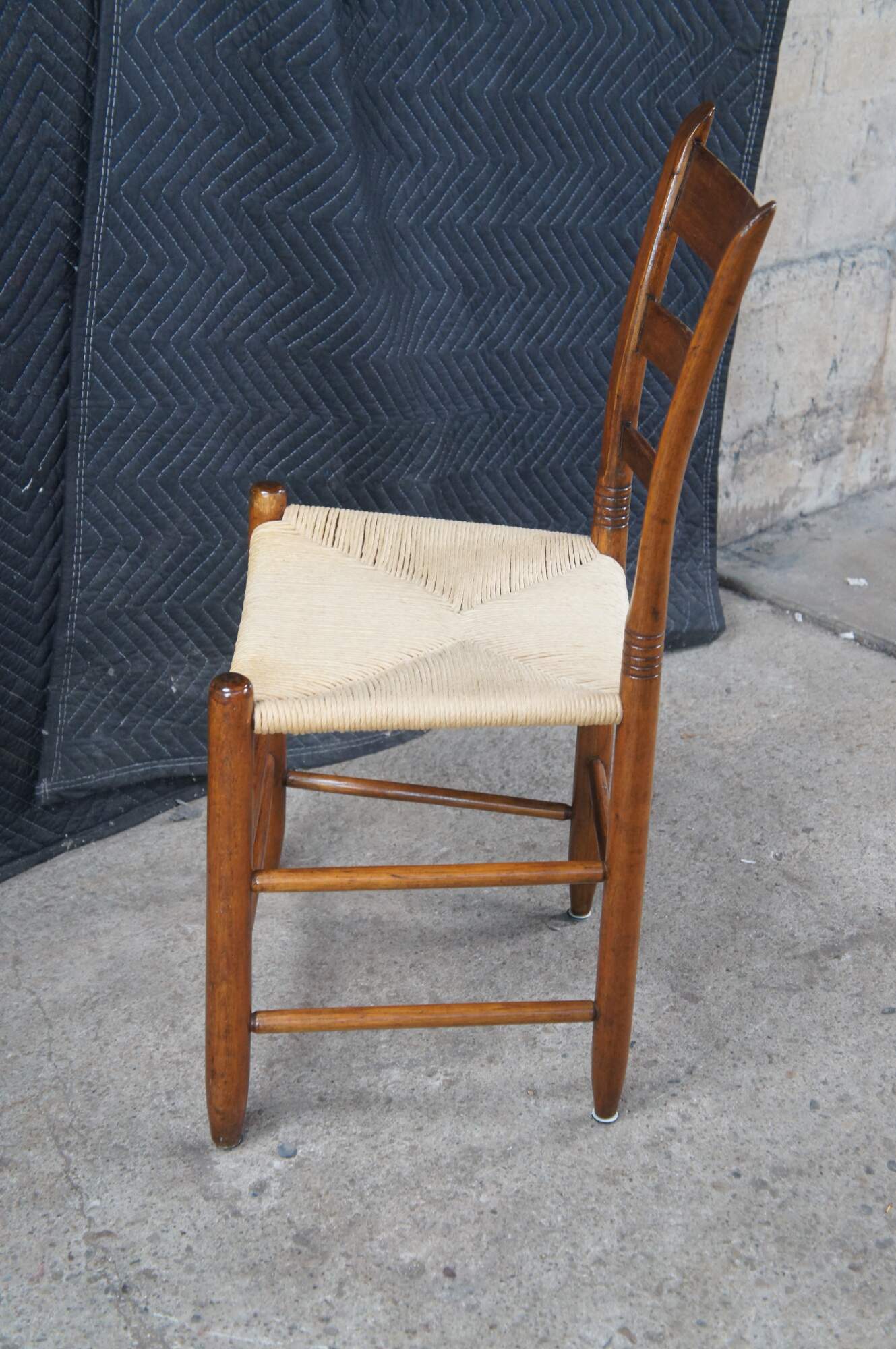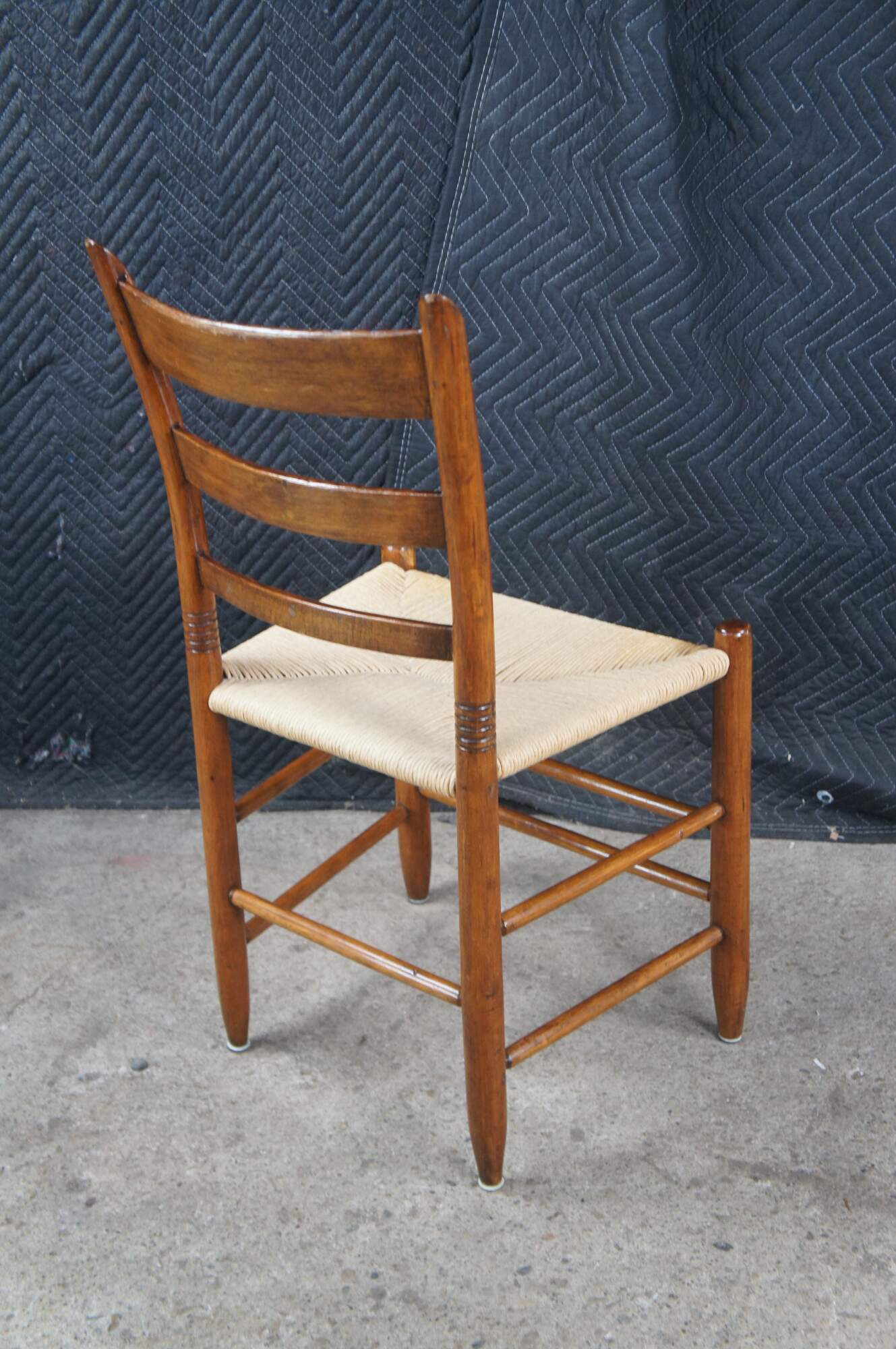 Antique Shaker style his and hers side dining chairs featuring maple frames with ladderback design and woven rush seats.