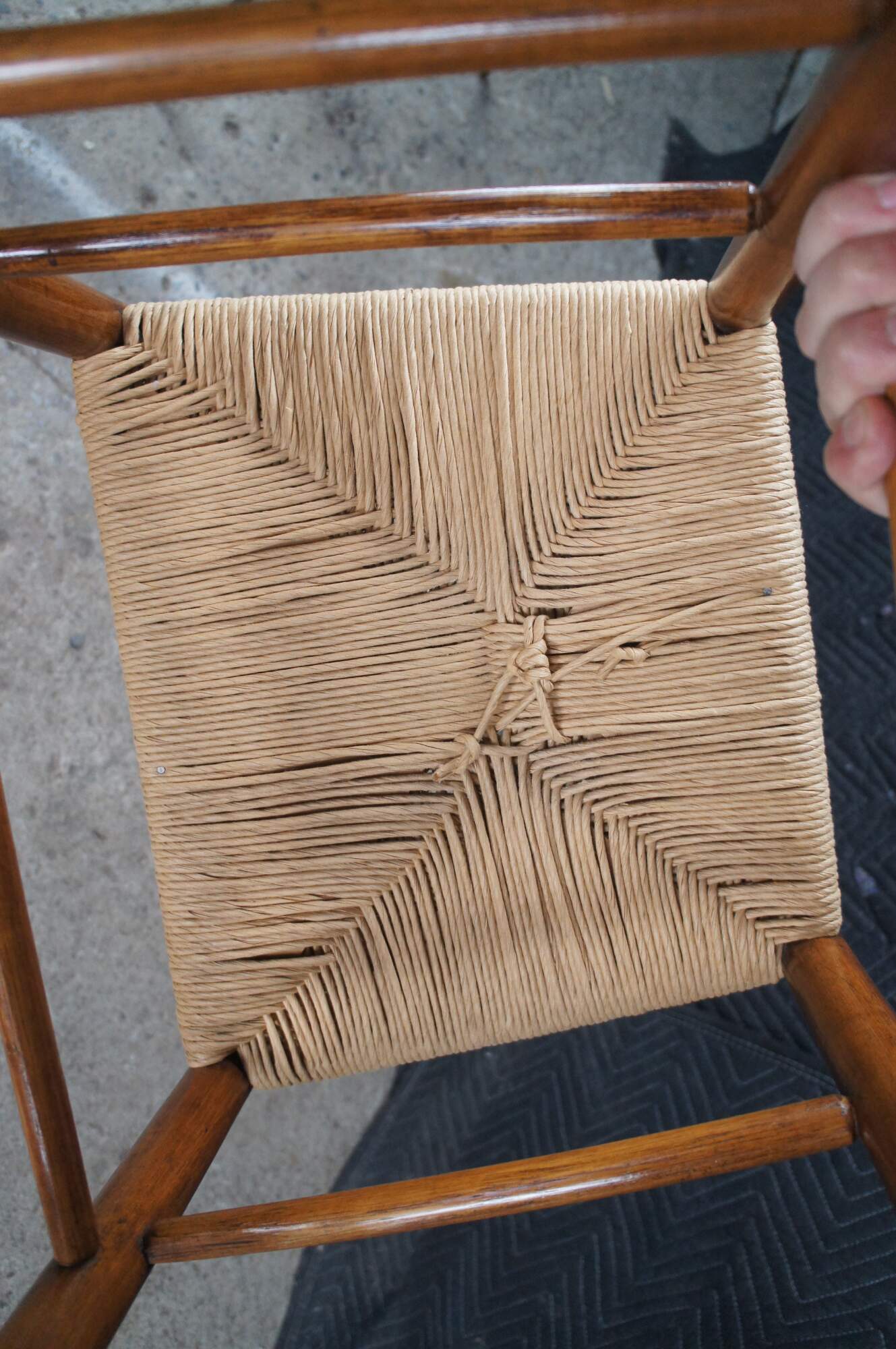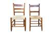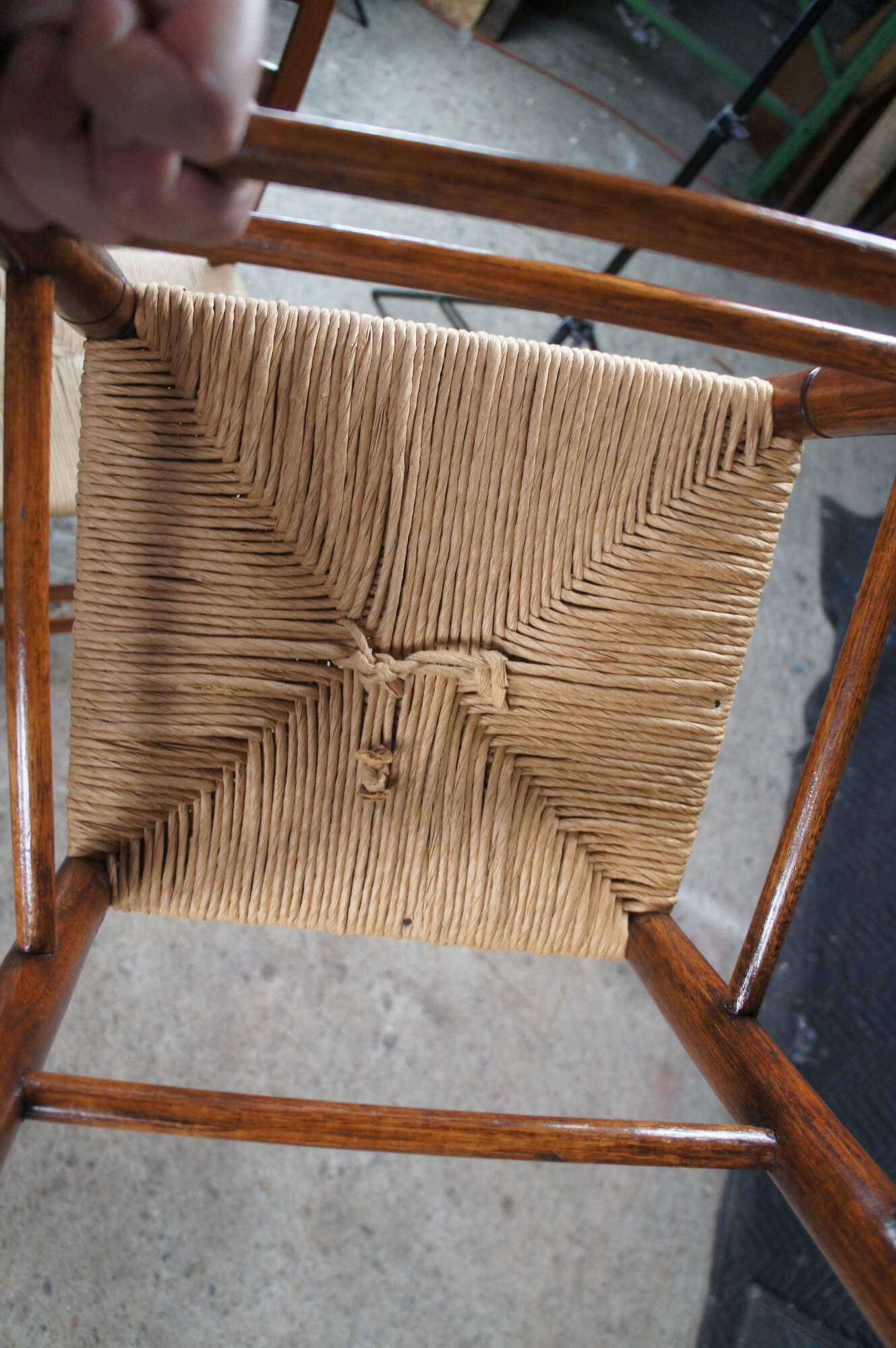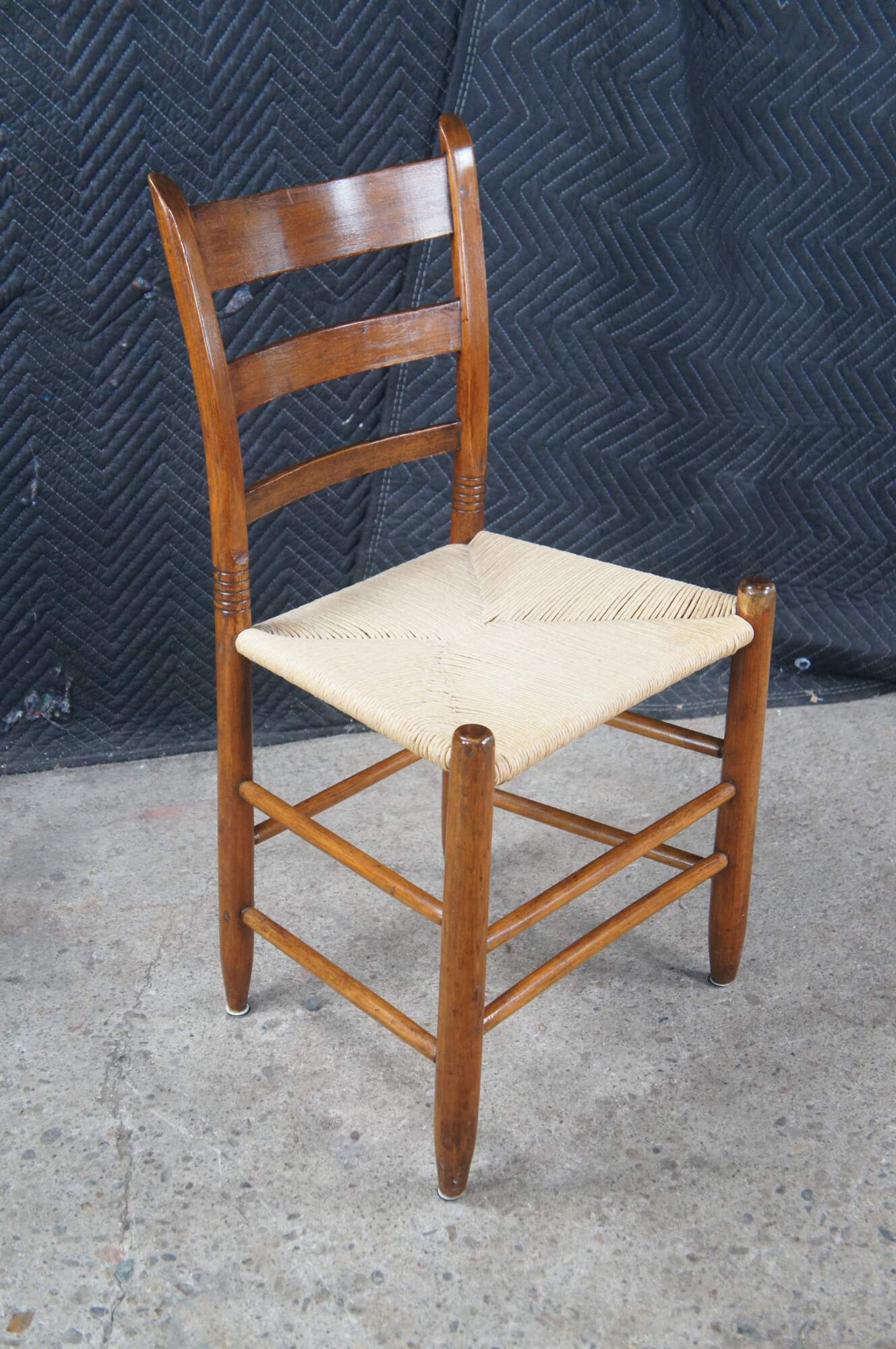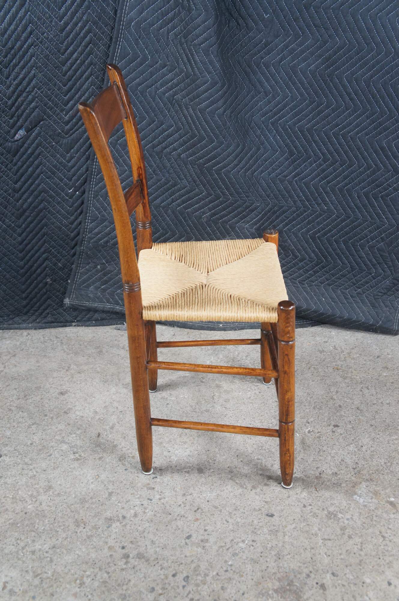 Antique Shaker style his and hers side dining chairs featuring maple frames with ladderback design and woven rush seats.