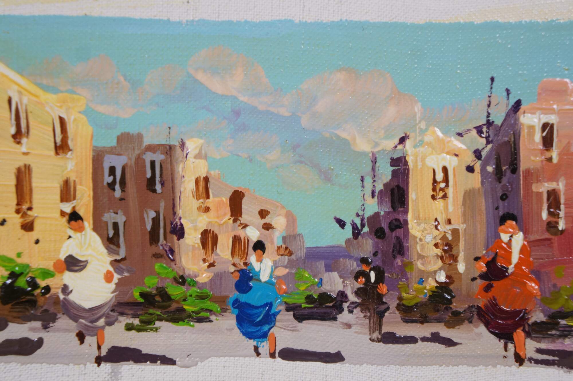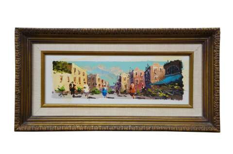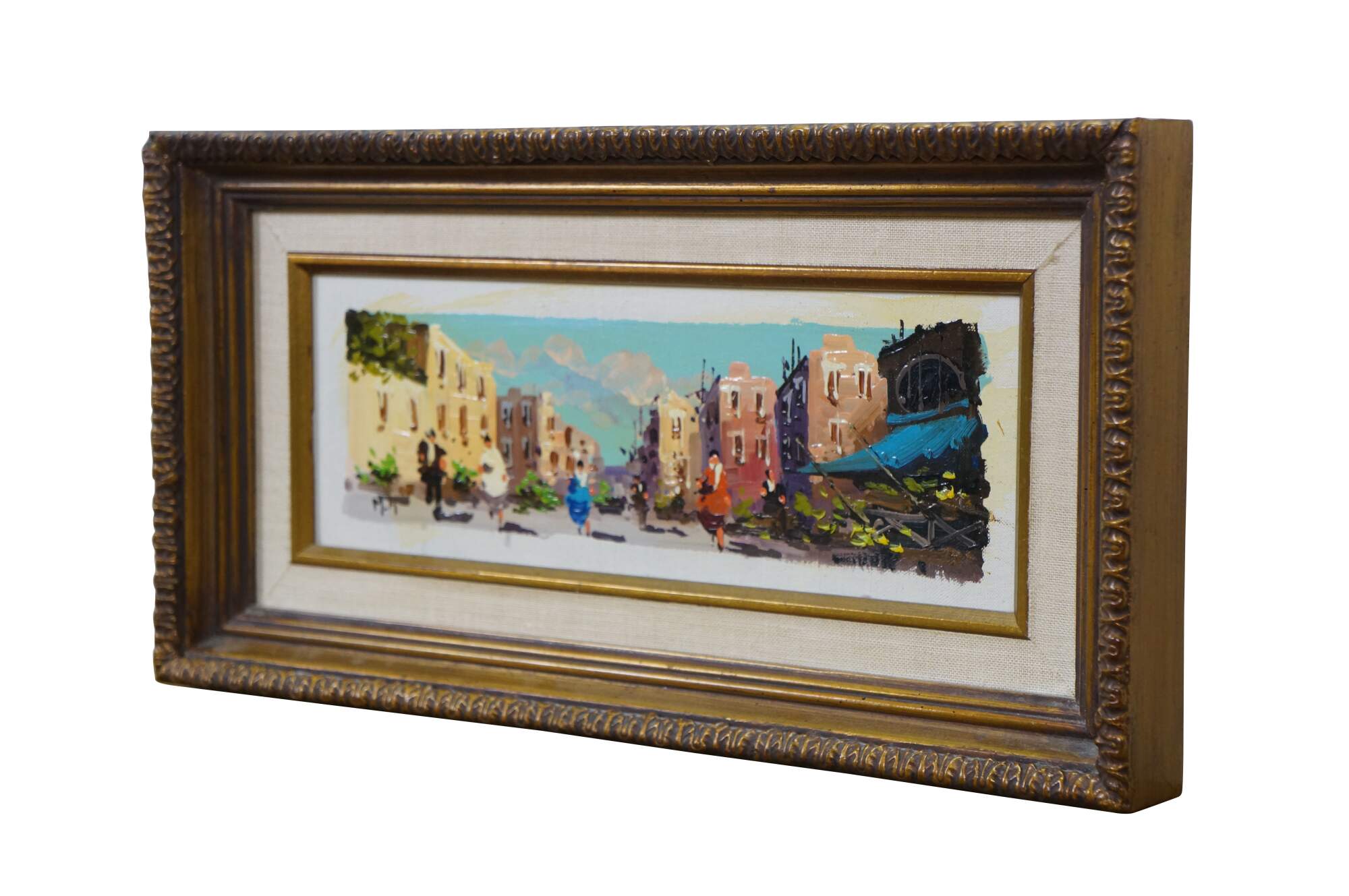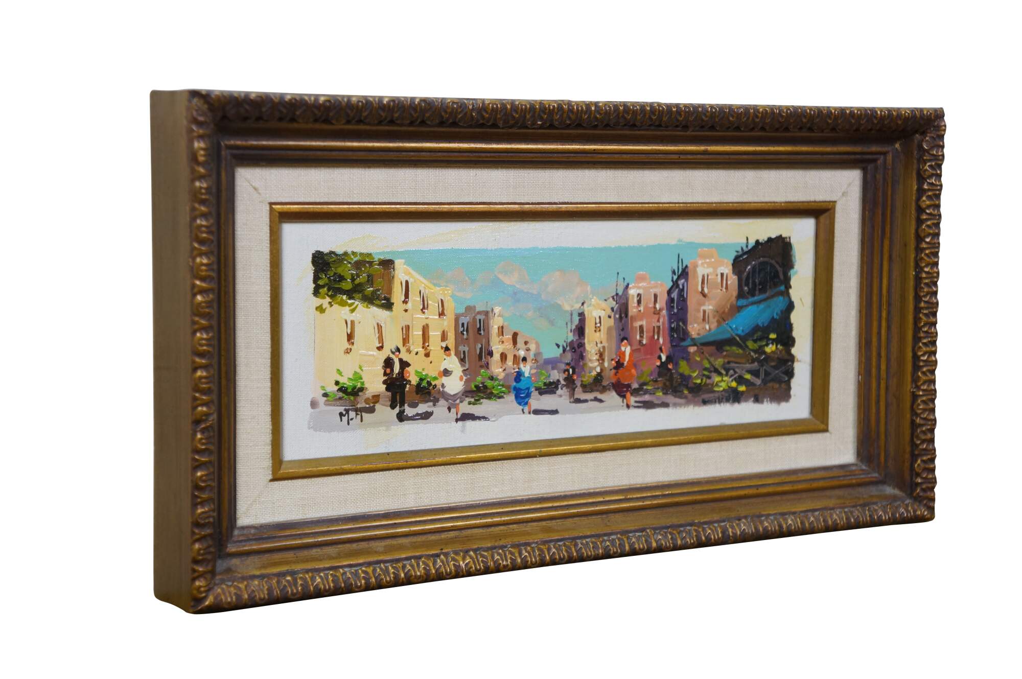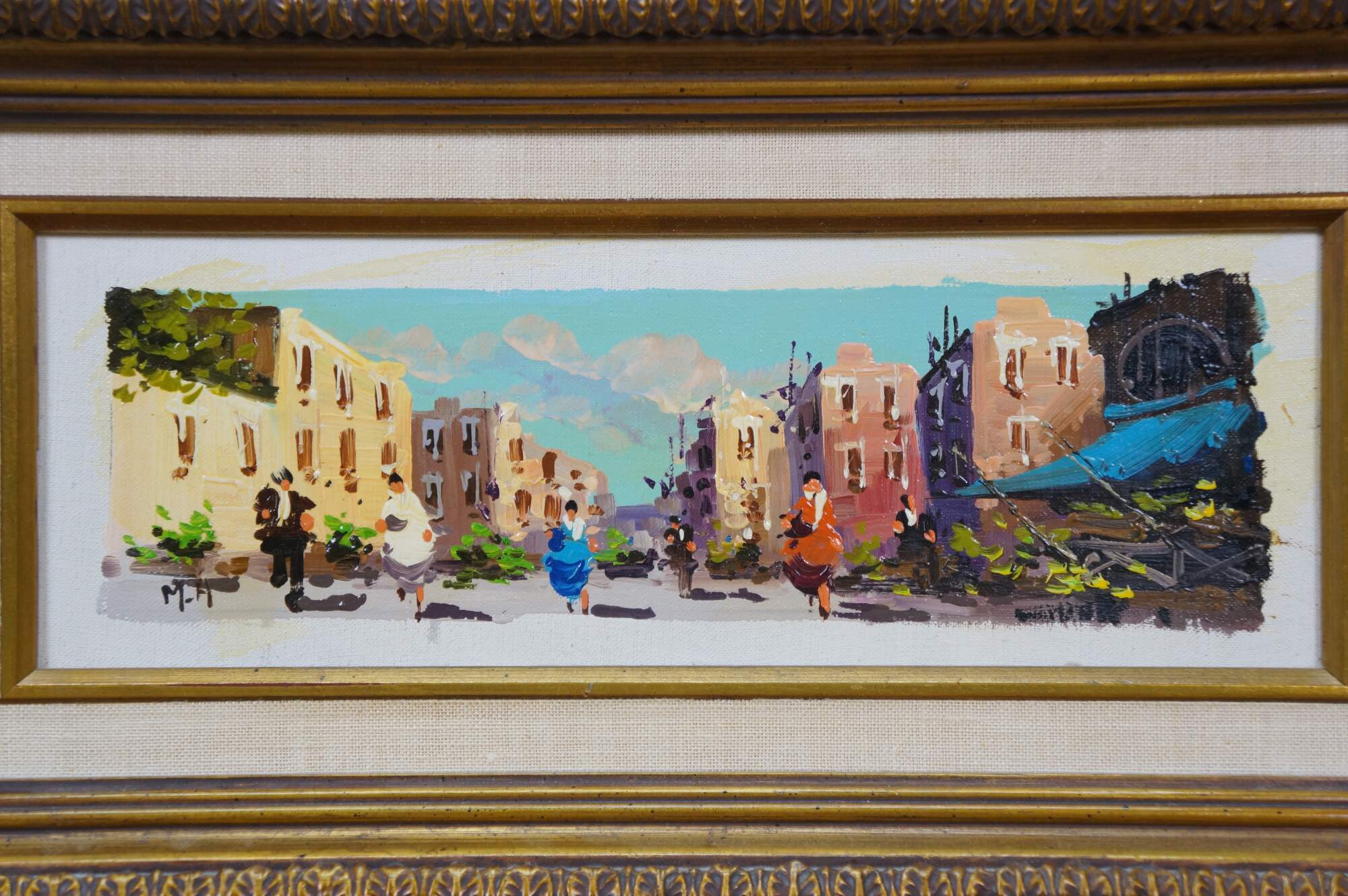 Late 20th century impressionist cityscape oil painting on board titled "Market Place." It features a vibrant French or Italian market scene with figures walking through the streets. Signed M.A. in lower left. Gilt beveled wood frame with leaf pattern edge. In the style of Cecil Rochfort D'Oyly John.