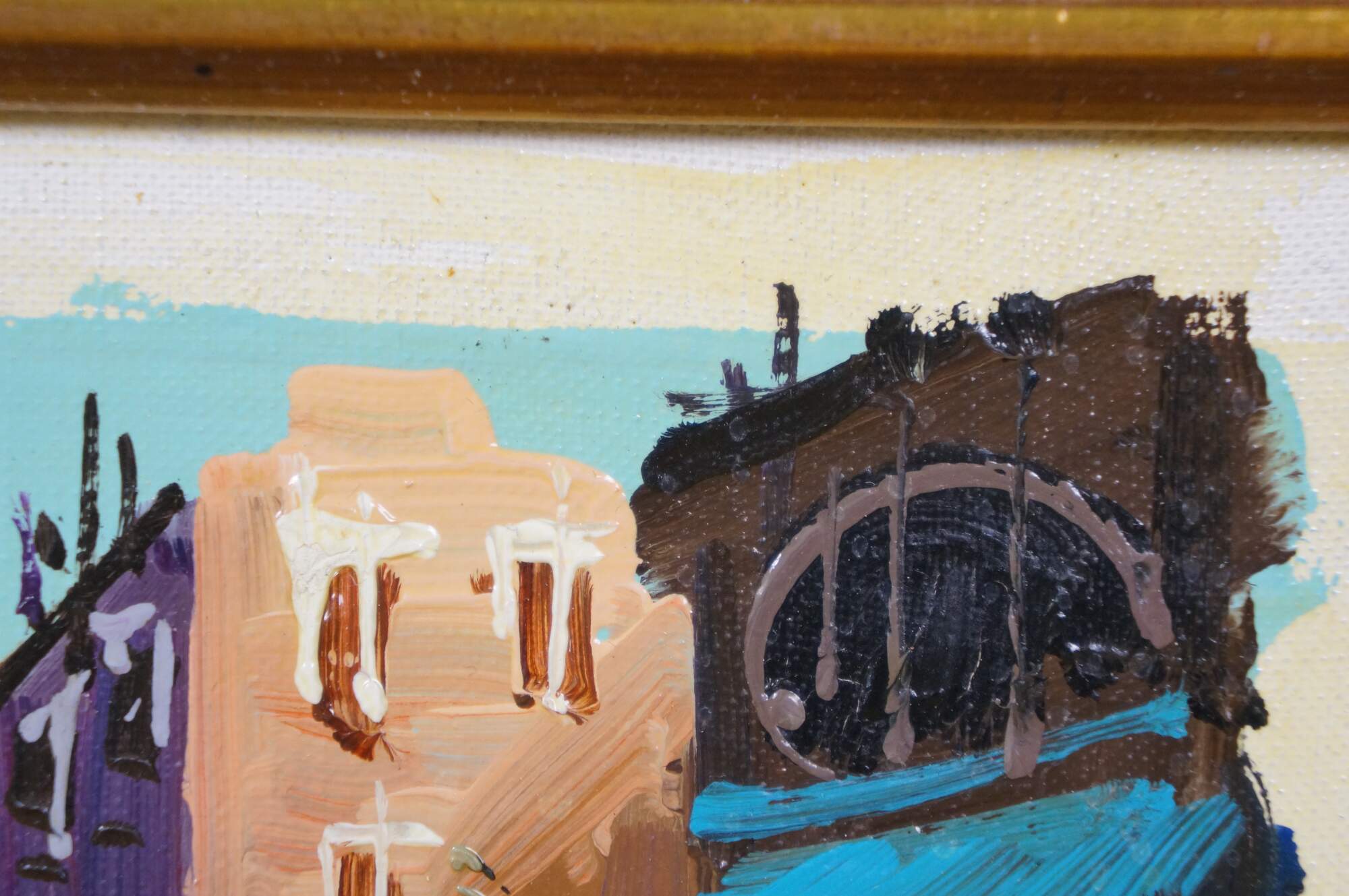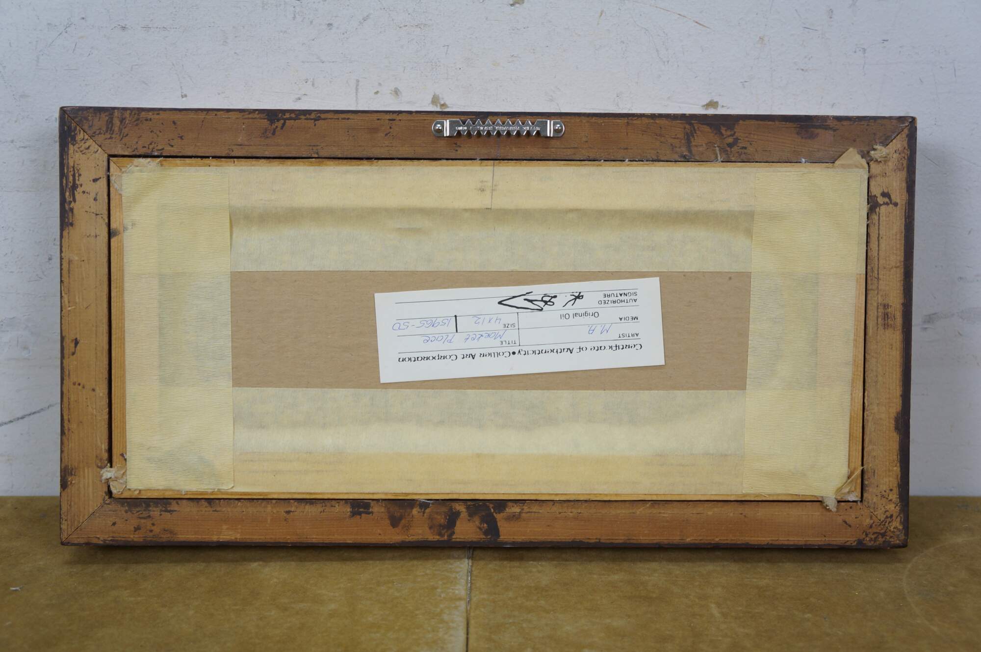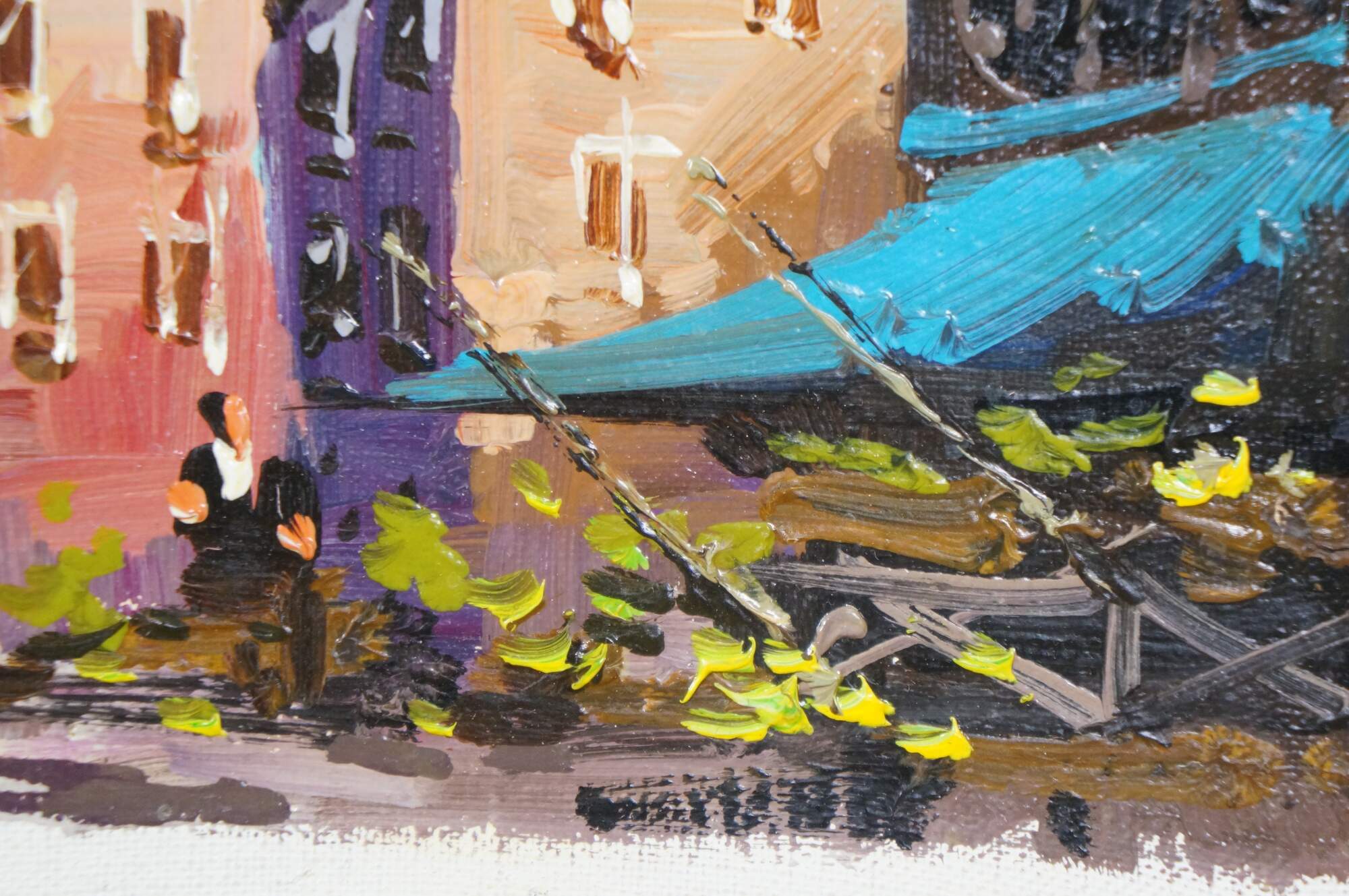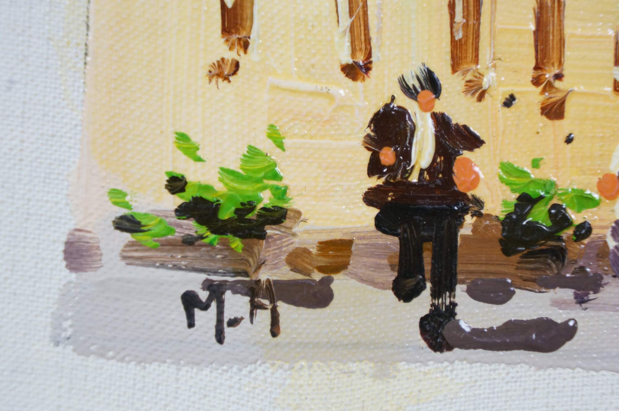 Late 20th century impressionist cityscape oil painting on board titled "Market Place." It features a vibrant French or Italian market scene with figures walking through the streets. Signed M.A. in lower left. Gilt beveled wood frame with leaf pattern edge. In the style of Cecil Rochfort D'Oyly John.