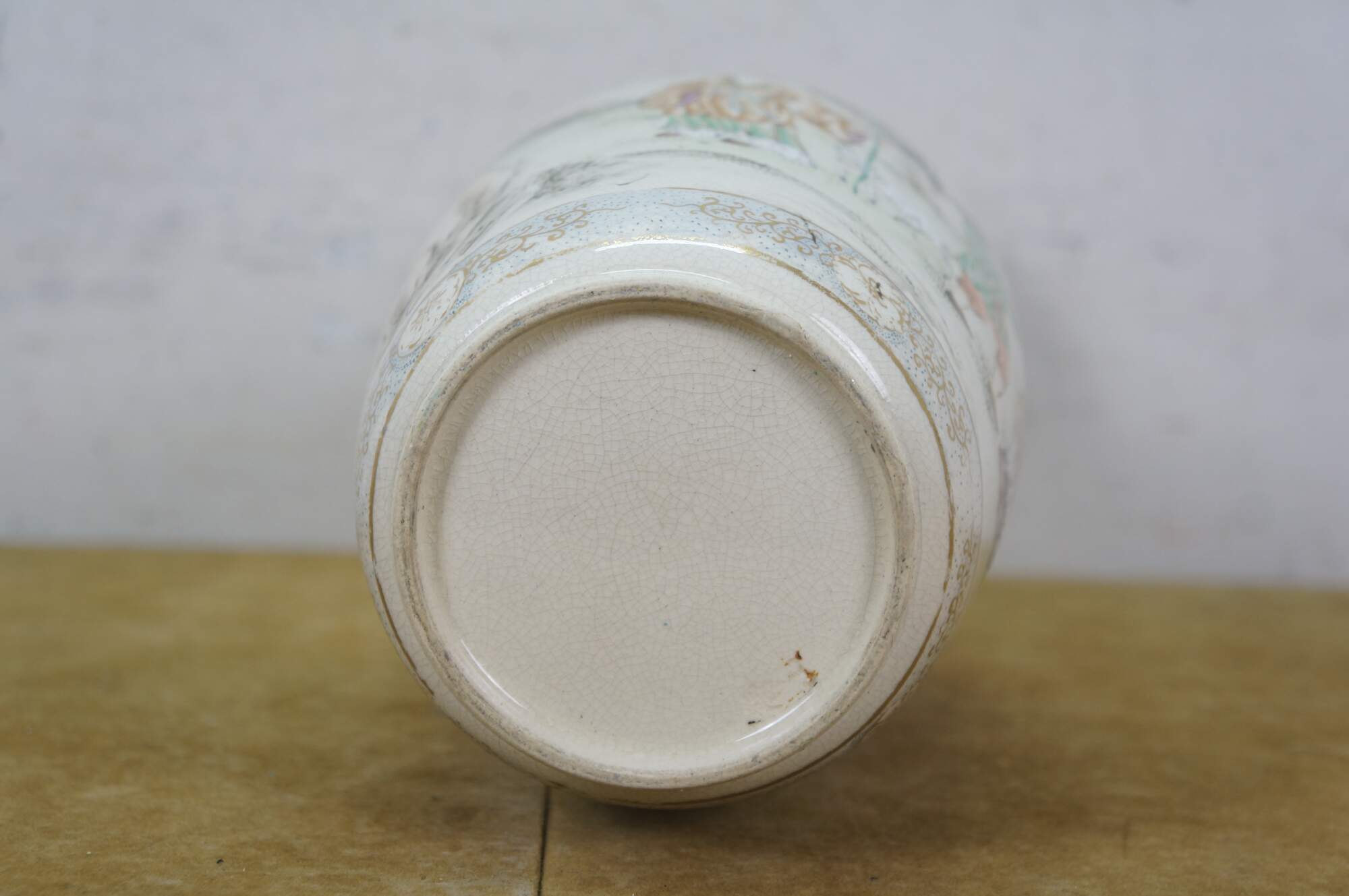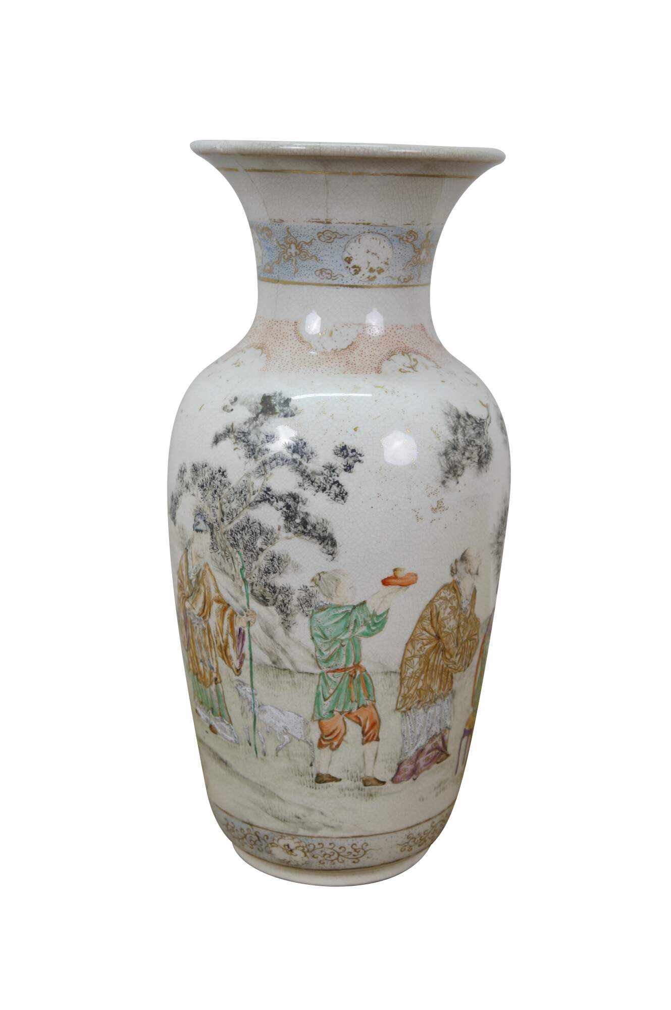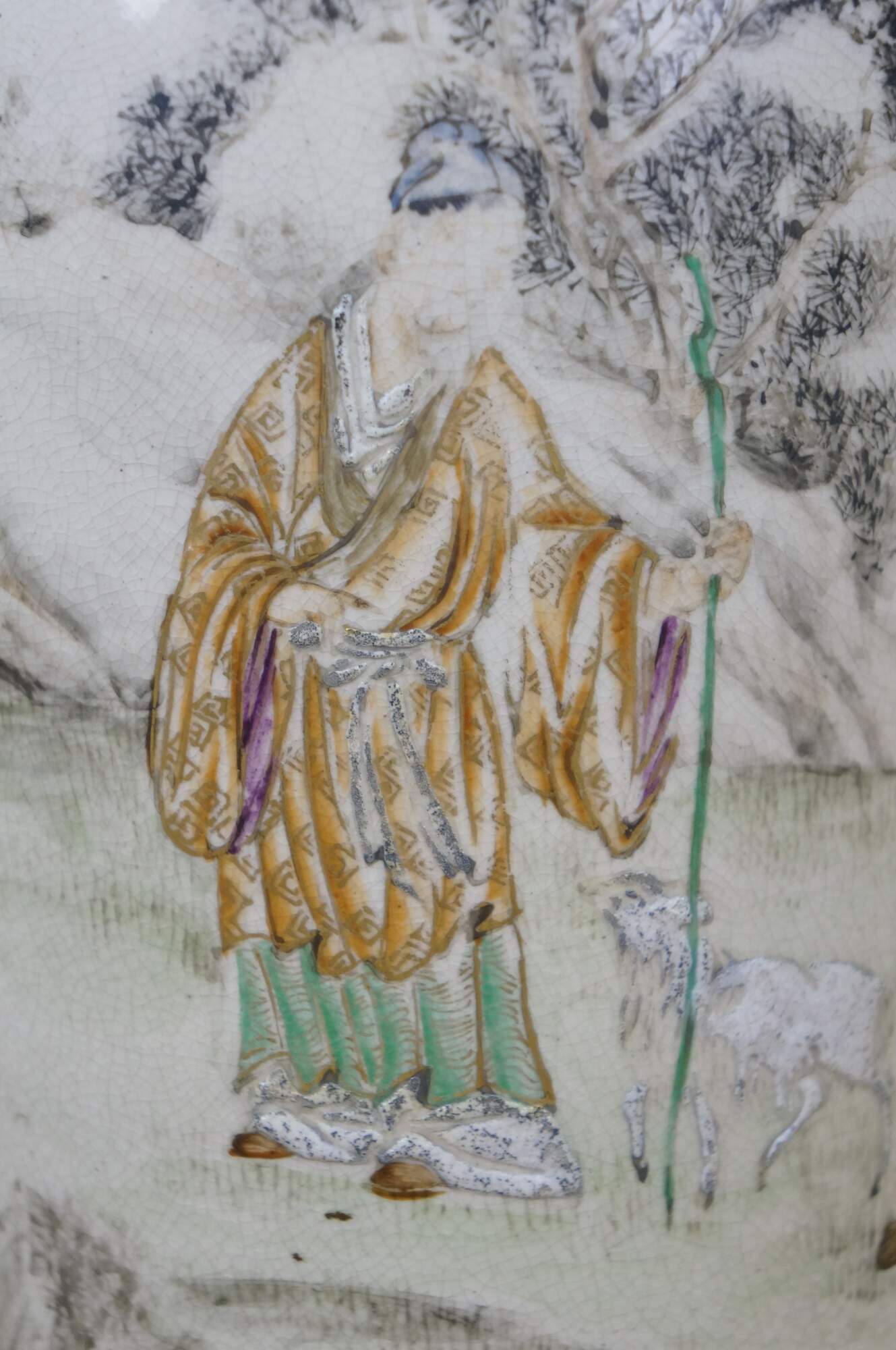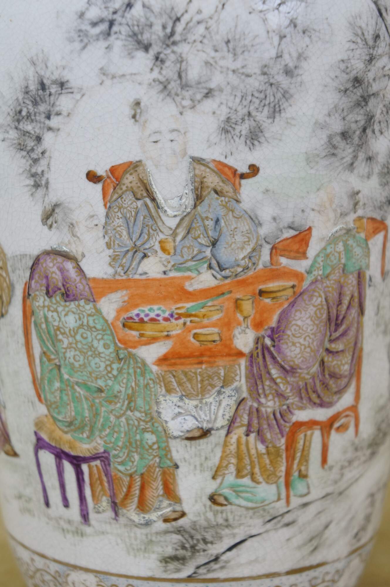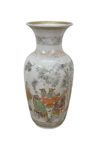 Circa late 19th century Chinese qianjiang mantel vase, delicately painted with a well-worn garden scene of wise men gathered around a table with Geishas and a goat herder.