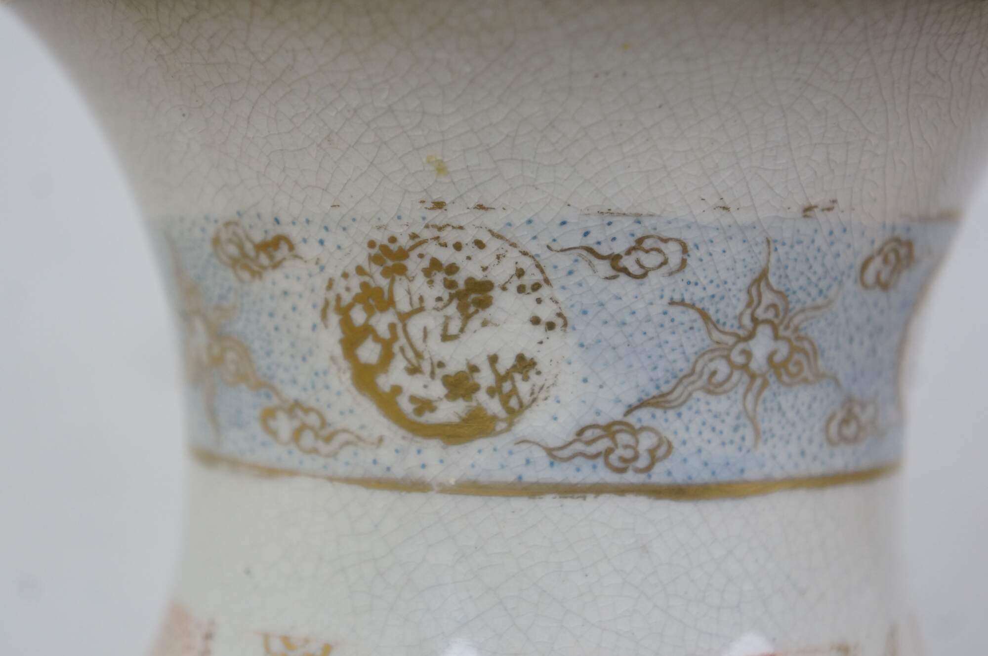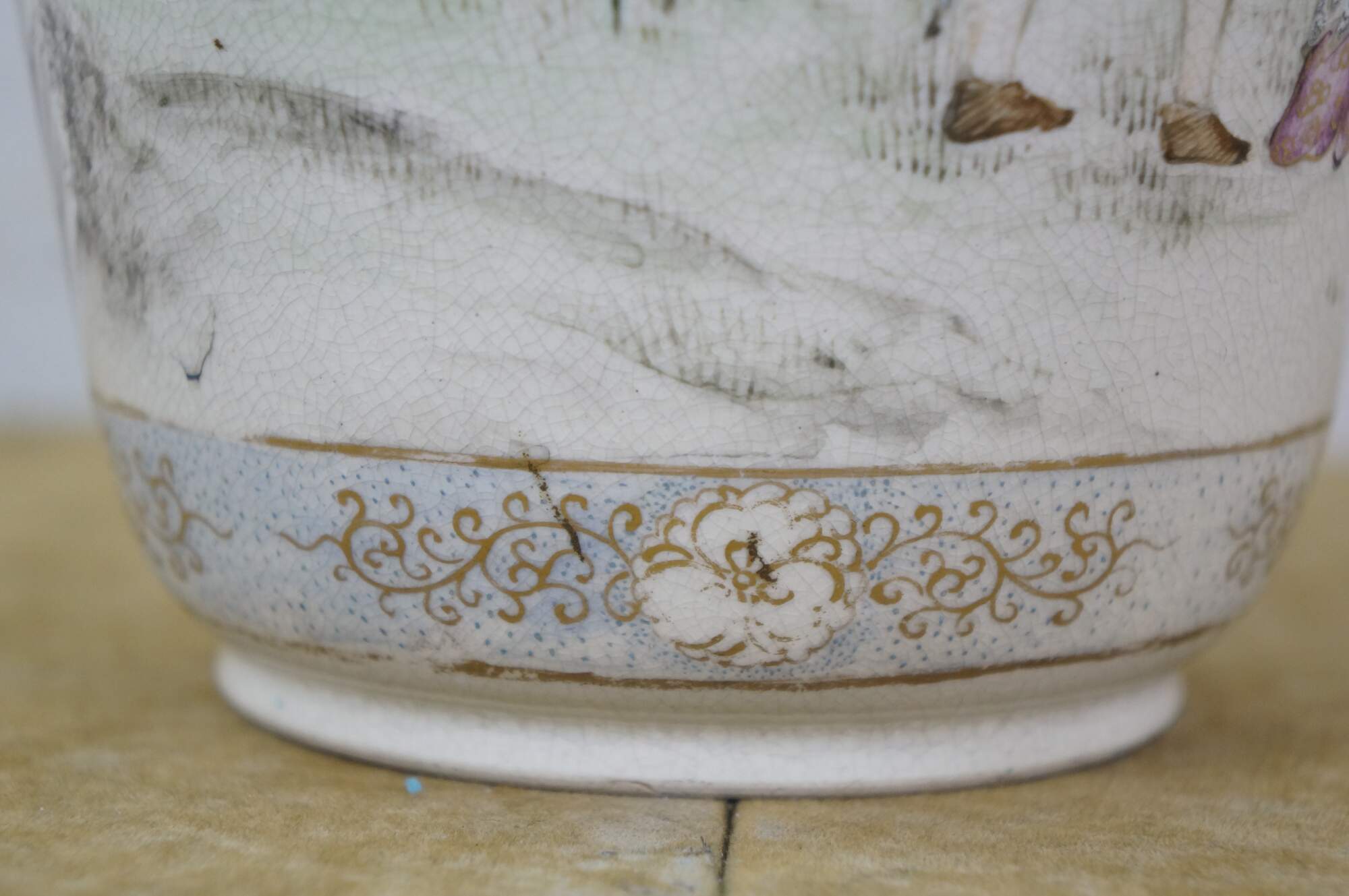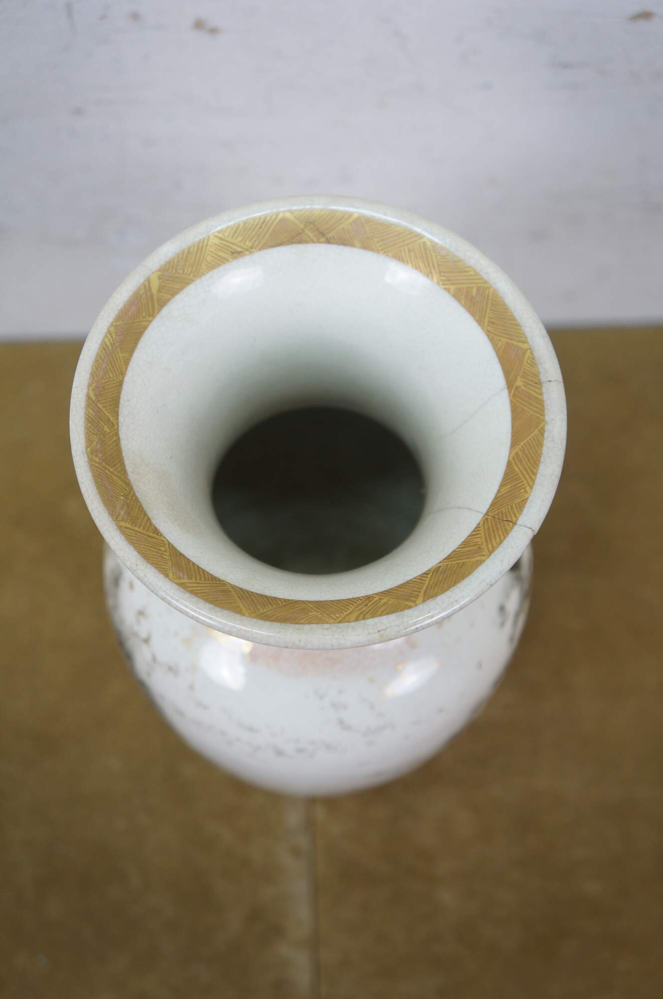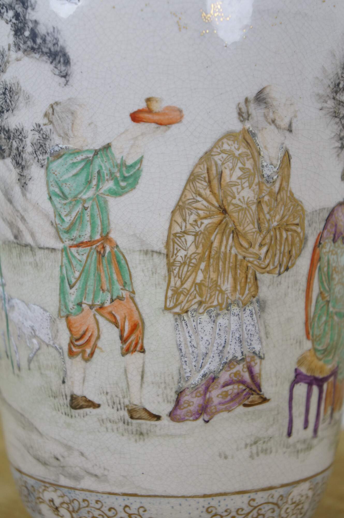 Circa late 19th century Chinese qianjiang mantel vase, delicately painted with a well-worn garden scene of wise men gathered around a table with Geishas and a goat herder.