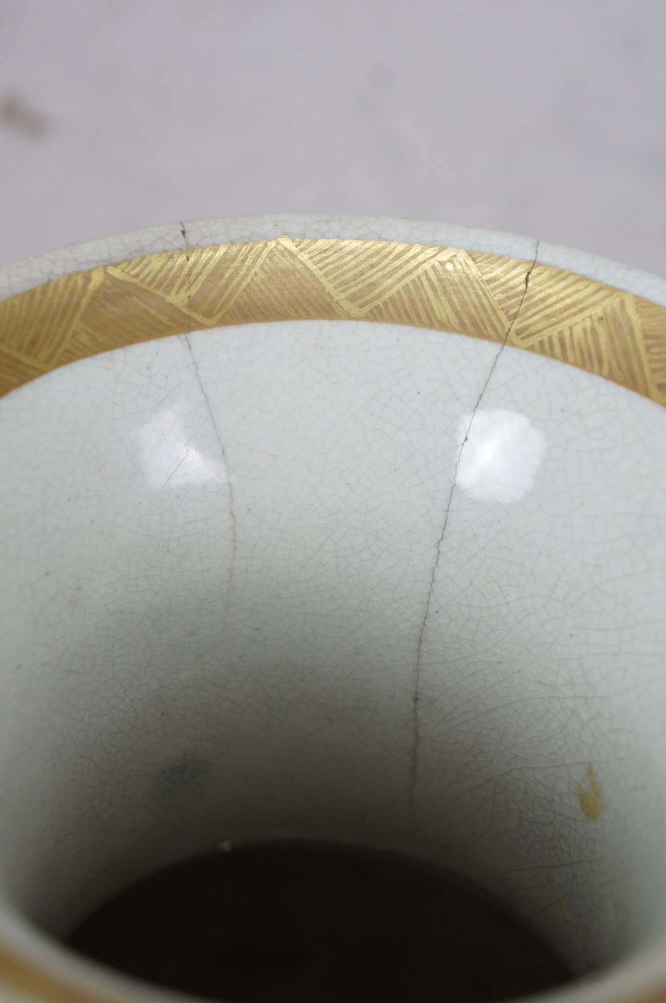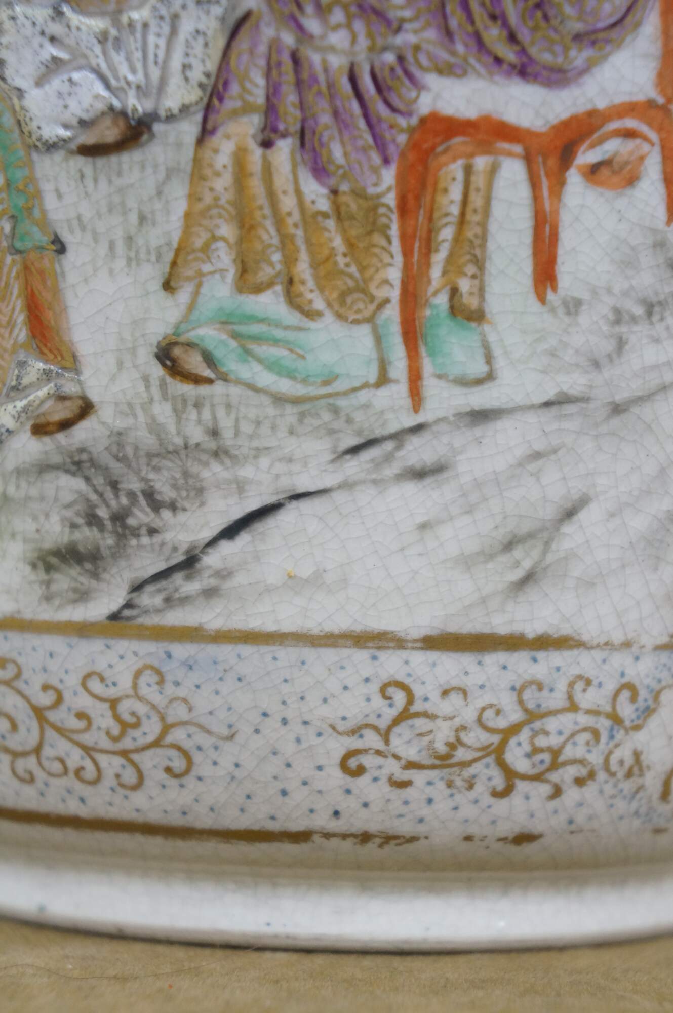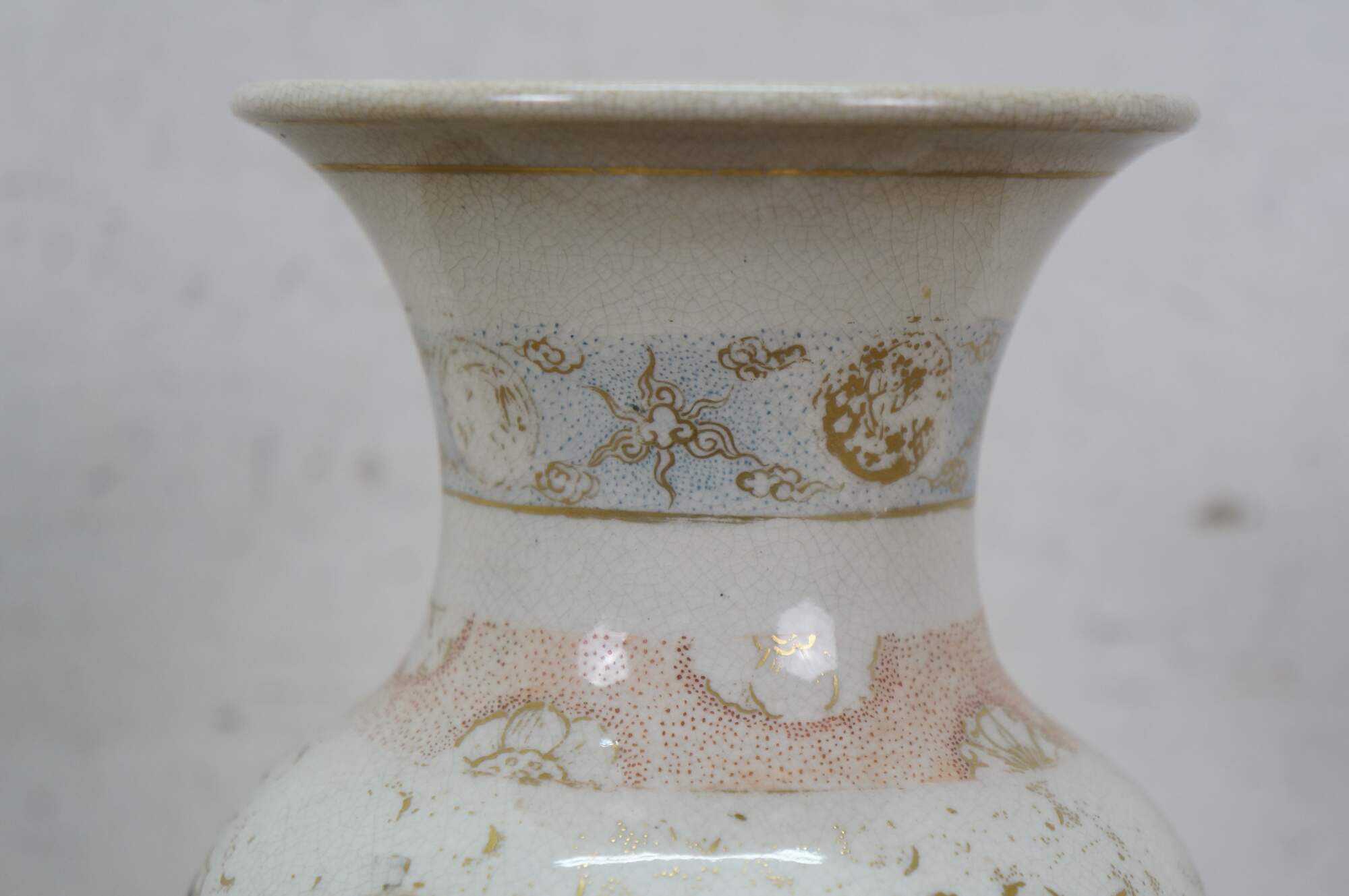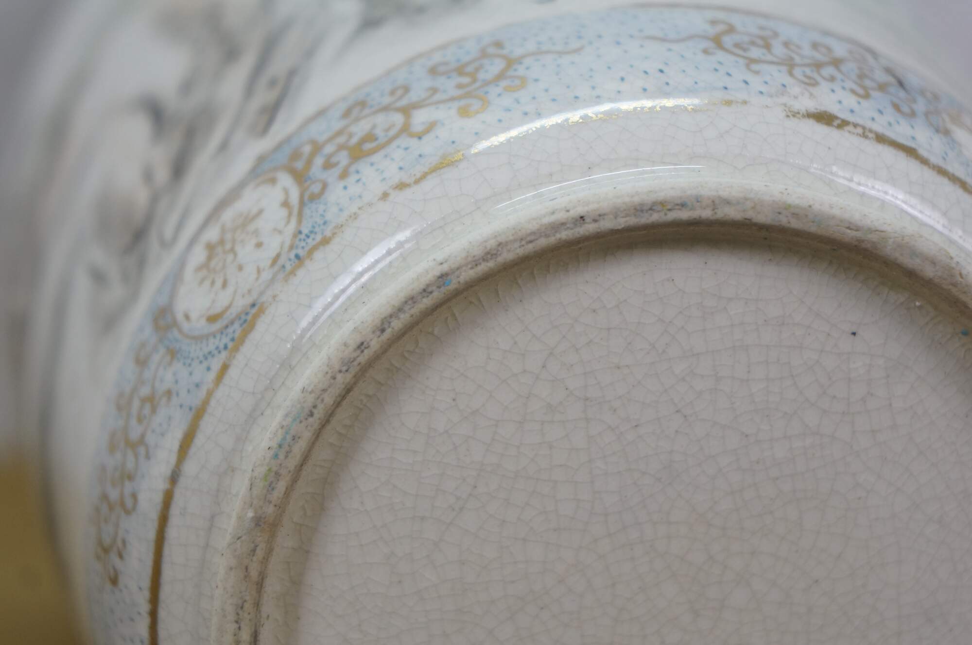 Circa late 19th century Chinese qianjiang mantel vase, delicately painted with a well-worn garden scene of wise men gathered around a table with Geishas and a goat herder.