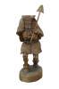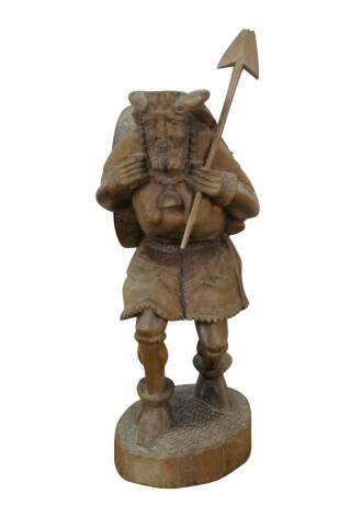 Circa mid 20th century rare Ecuadorian folk art, hand carved wood sculpture in the shape of an Incan warrior wearing a geometric pattern skirt and horned headdress, carrying a spear, shield and pan pipes / hunting horn.