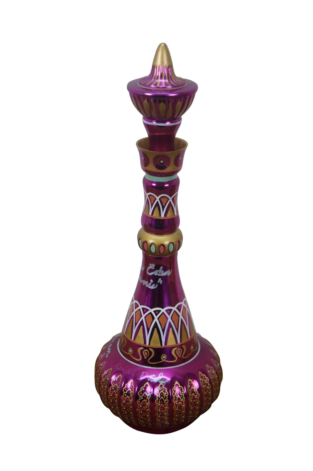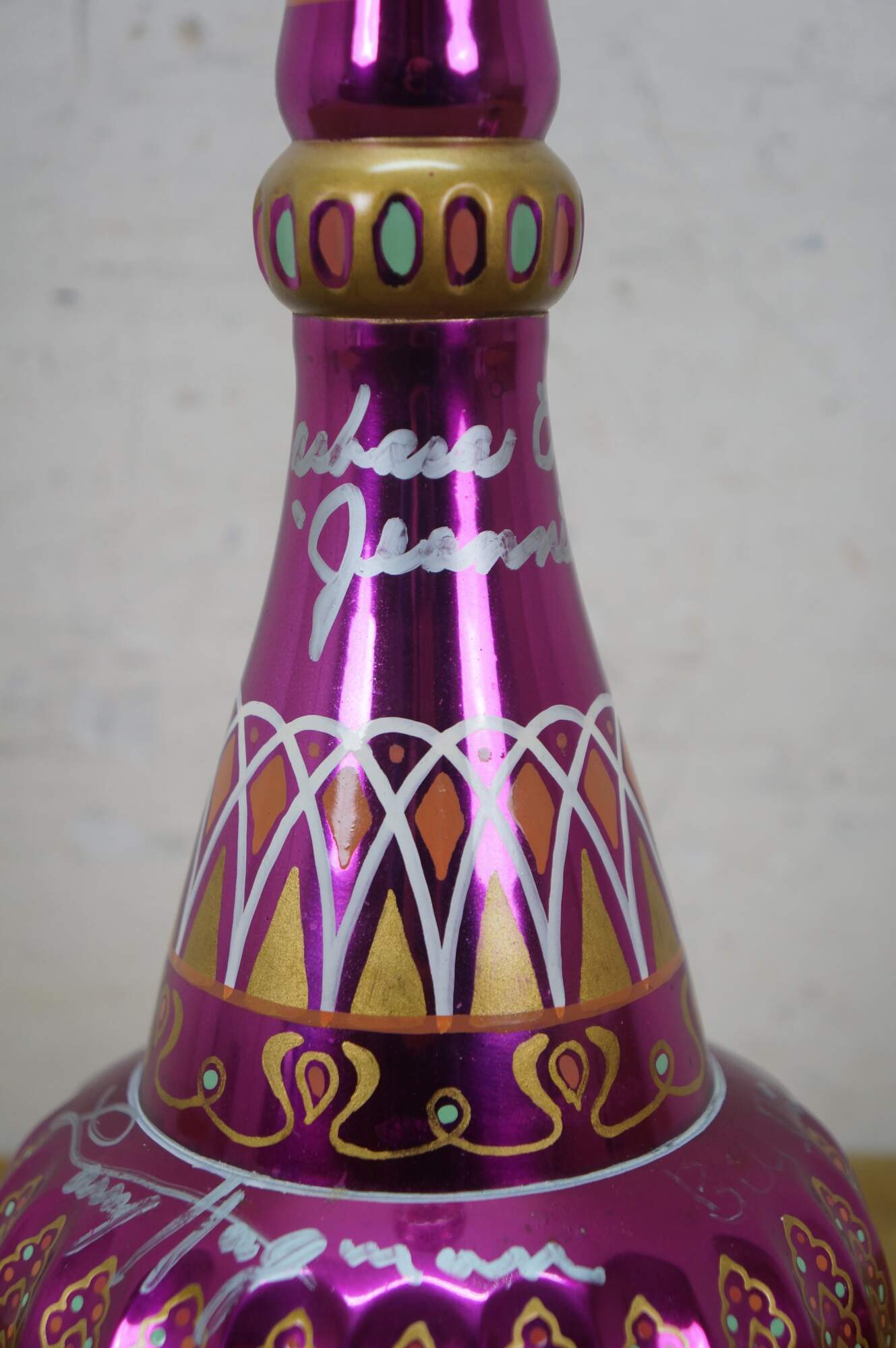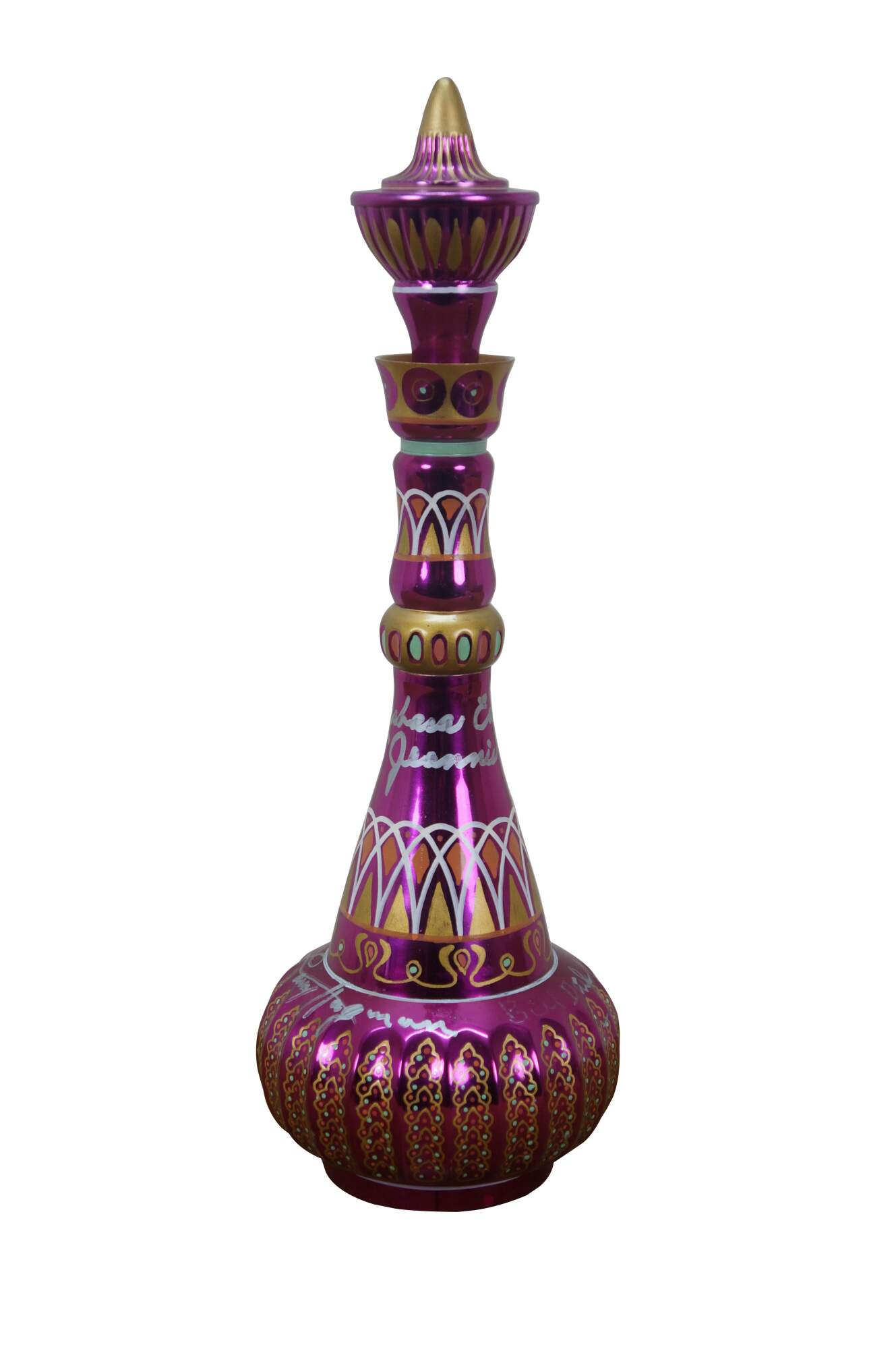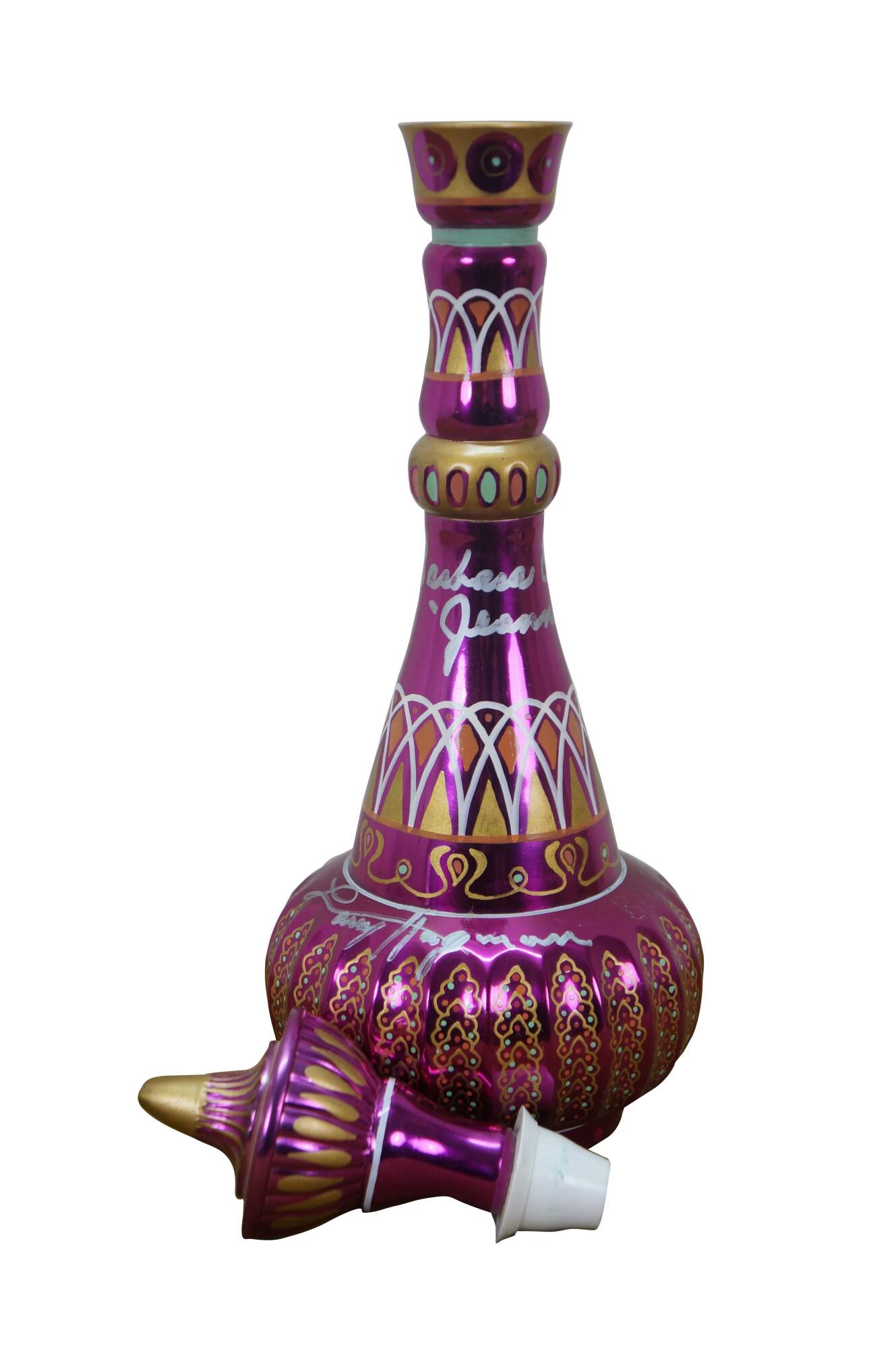 Very rare cast autographed "I Dream of Jeannie" Jeannie (genie) decanter bottle. Mirrored mulberry / purple / pink Middle Eastern inspired bottle hand painted with gold, white, coral and turquoise mimicking the prop used on the show from the Second Season onward, hand crafted and signed by Mario A.C. Della Casa of Della Casa Designs. Autographed at Dragon Con 2010 by Barbara Eden (Jeannie), Larry Hagman (Tony Nelson), and Bill Daily (Capt. Roger Healy). Includes photograph taken by original owner of the three actors at their Dragon Con panel.