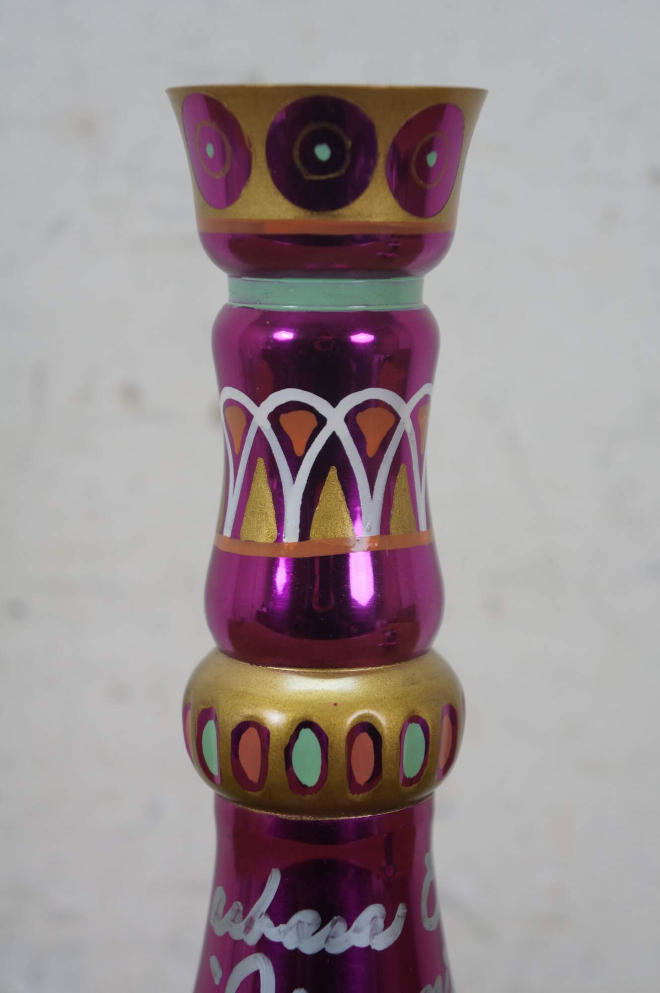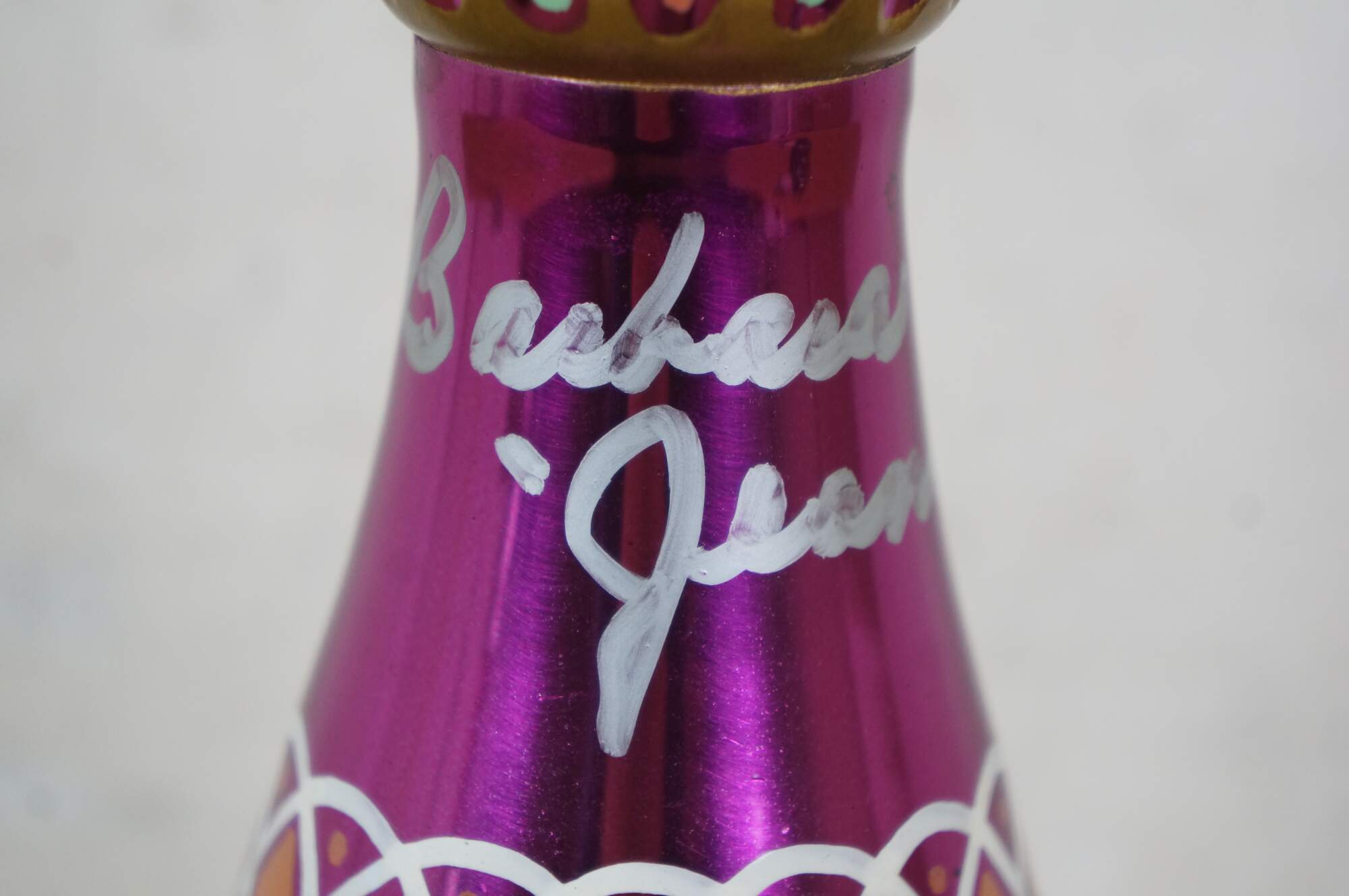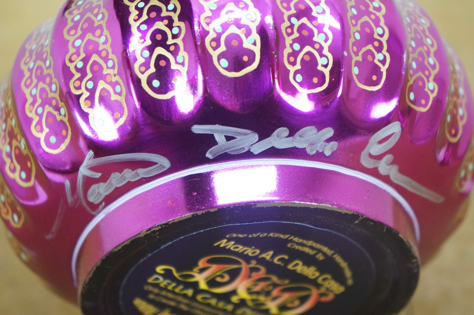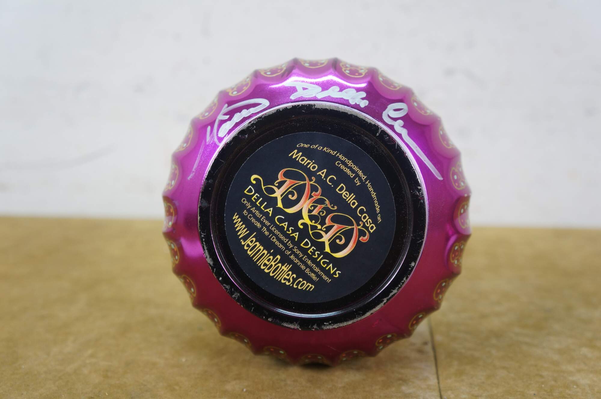 Very rare cast autographed "I Dream of Jeannie" Jeannie (genie) decanter bottle. Mirrored mulberry / purple / pink Middle Eastern inspired bottle hand painted with gold, white, coral and turquoise mimicking the prop used on the show from the Second Season onward, hand crafted and signed by Mario A.C. Della Casa of Della Casa Designs. Autographed at Dragon Con 2010 by Barbara Eden (Jeannie), Larry Hagman (Tony Nelson), and Bill Daily (Capt. Roger Healy). Includes photograph taken by original owner of the three actors at their Dragon Con panel.