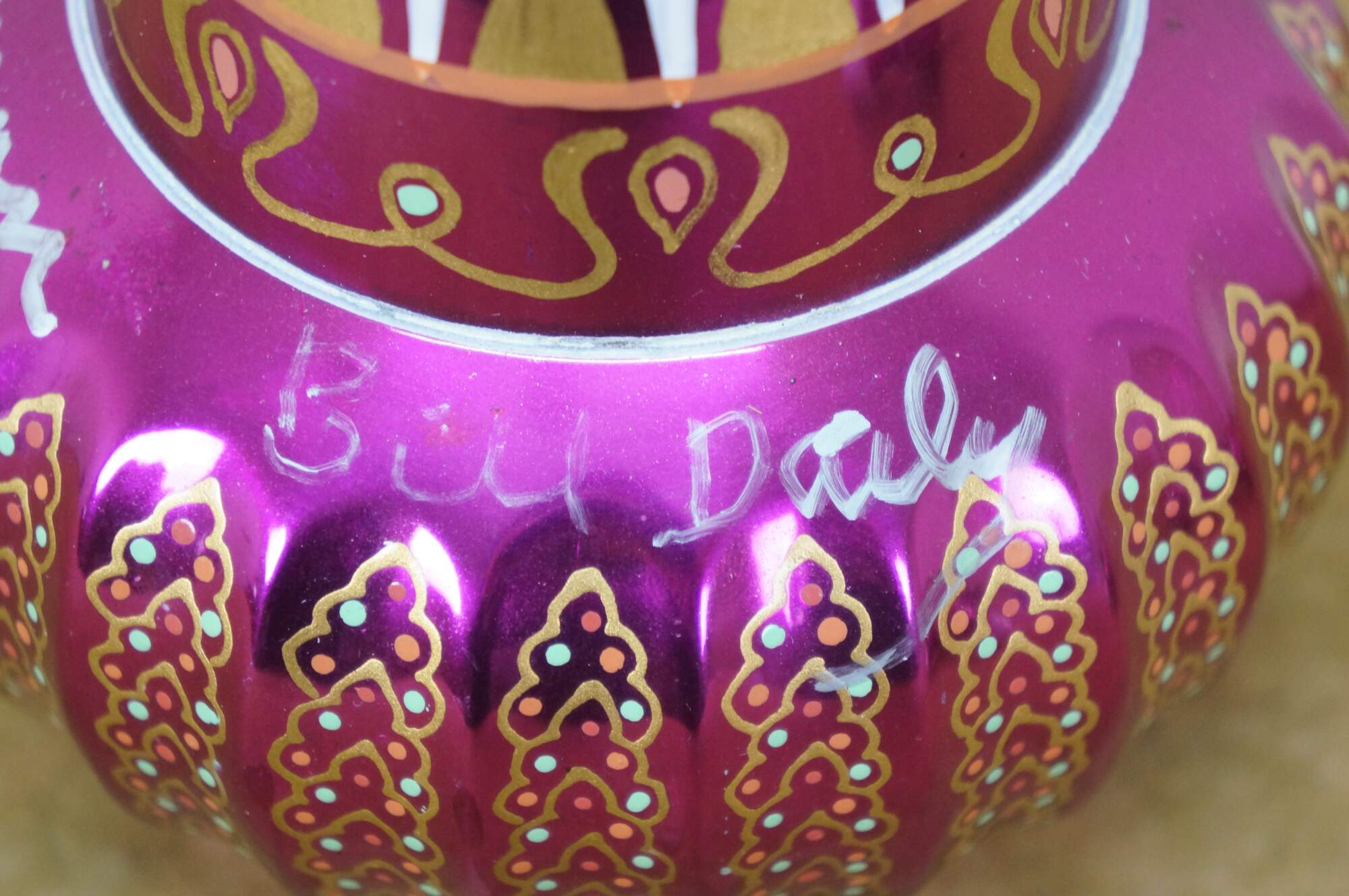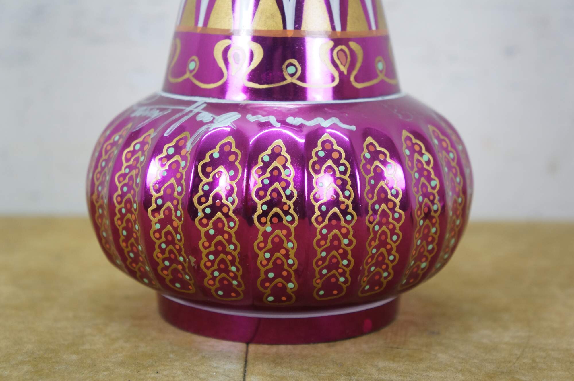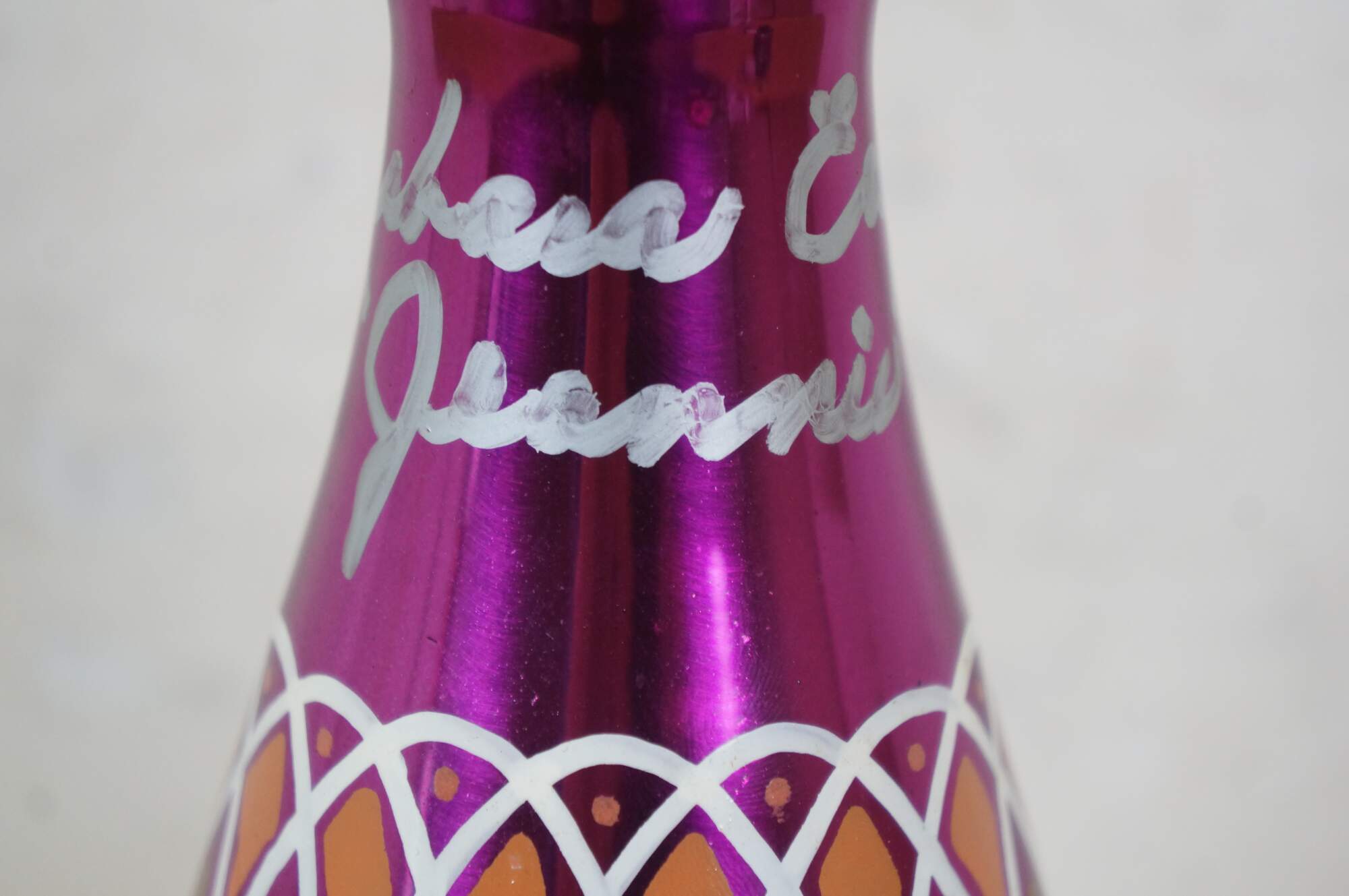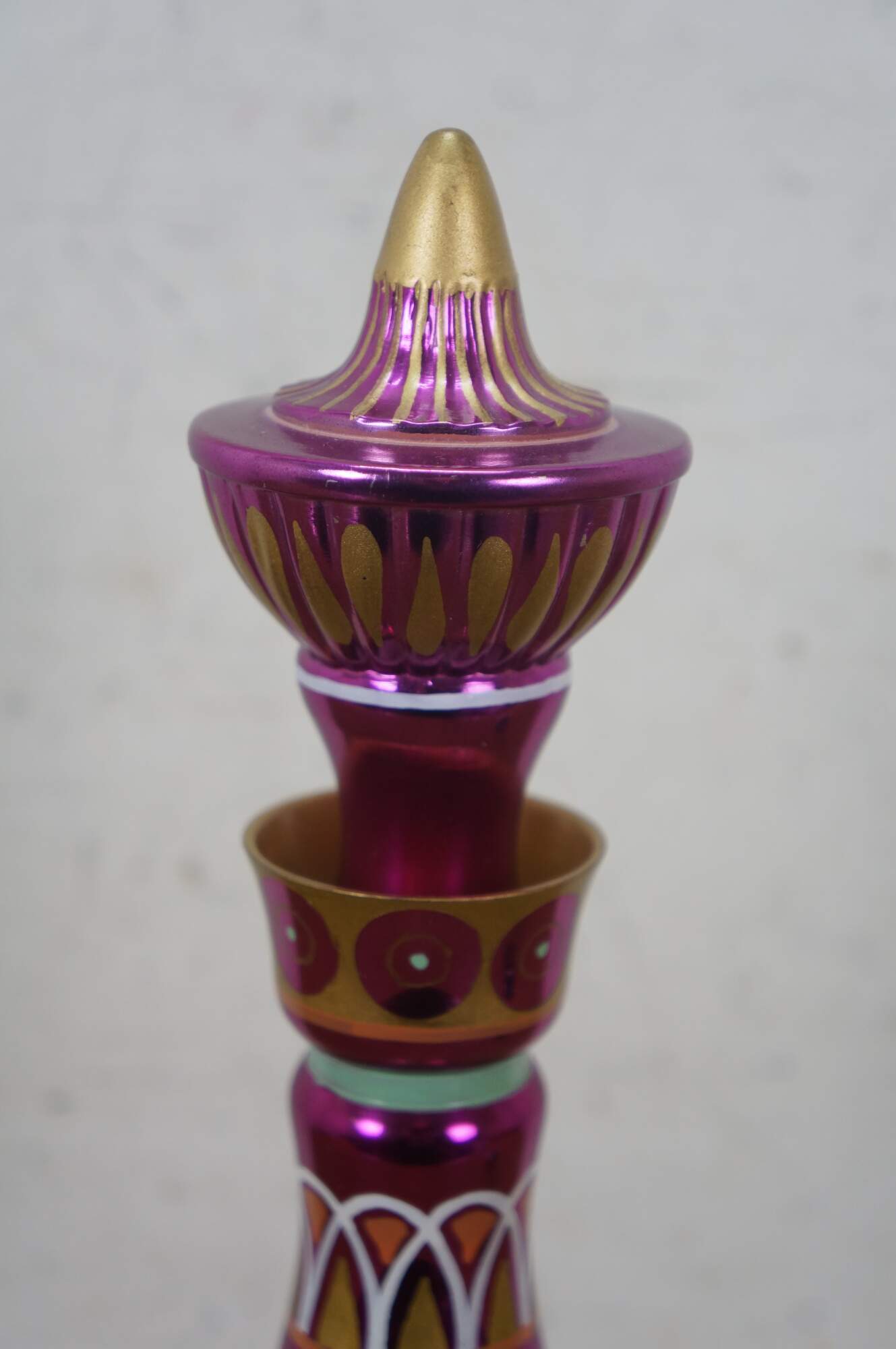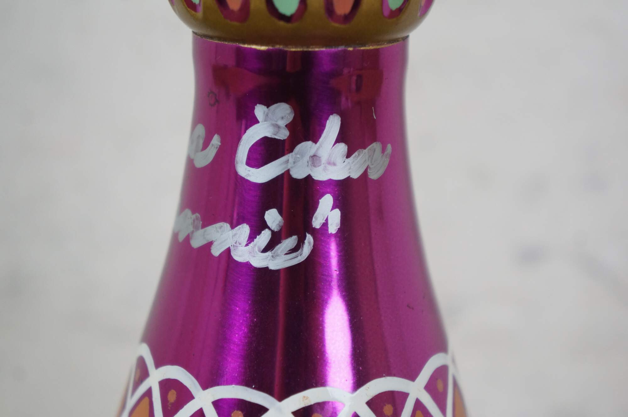 Very rare cast autographed "I Dream of Jeannie" Jeannie (genie) decanter bottle. Mirrored mulberry / purple / pink Middle Eastern inspired bottle hand painted with gold, white, coral and turquoise mimicking the prop used on the show from the Second Season onward, hand crafted and signed by Mario A.C. Della Casa of Della Casa Designs. Autographed at Dragon Con 2010 by Barbara Eden (Jeannie), Larry Hagman (Tony Nelson), and Bill Daily (Capt. Roger Healy). Includes photograph taken by original owner of the three actors at their Dragon Con panel.