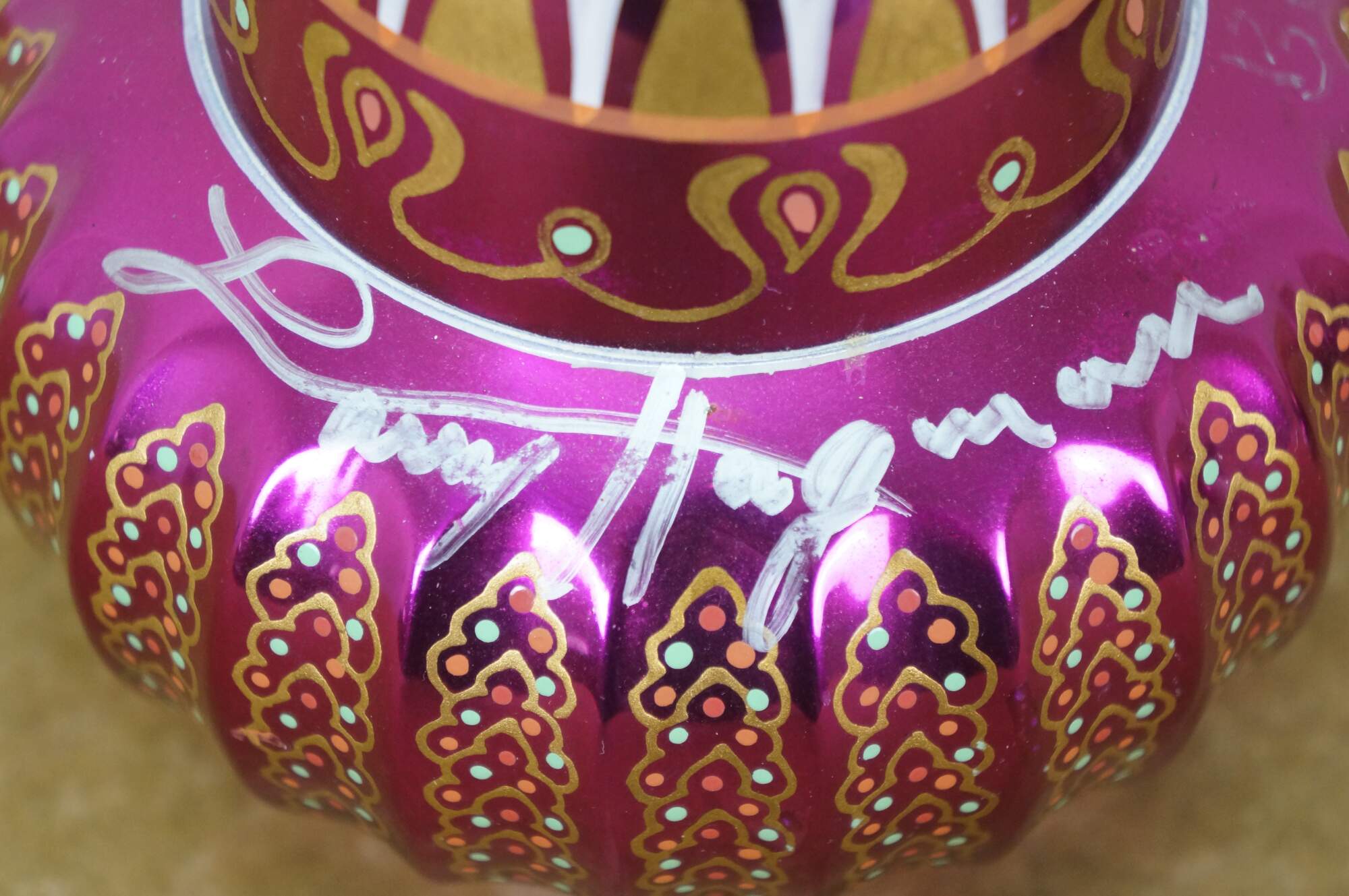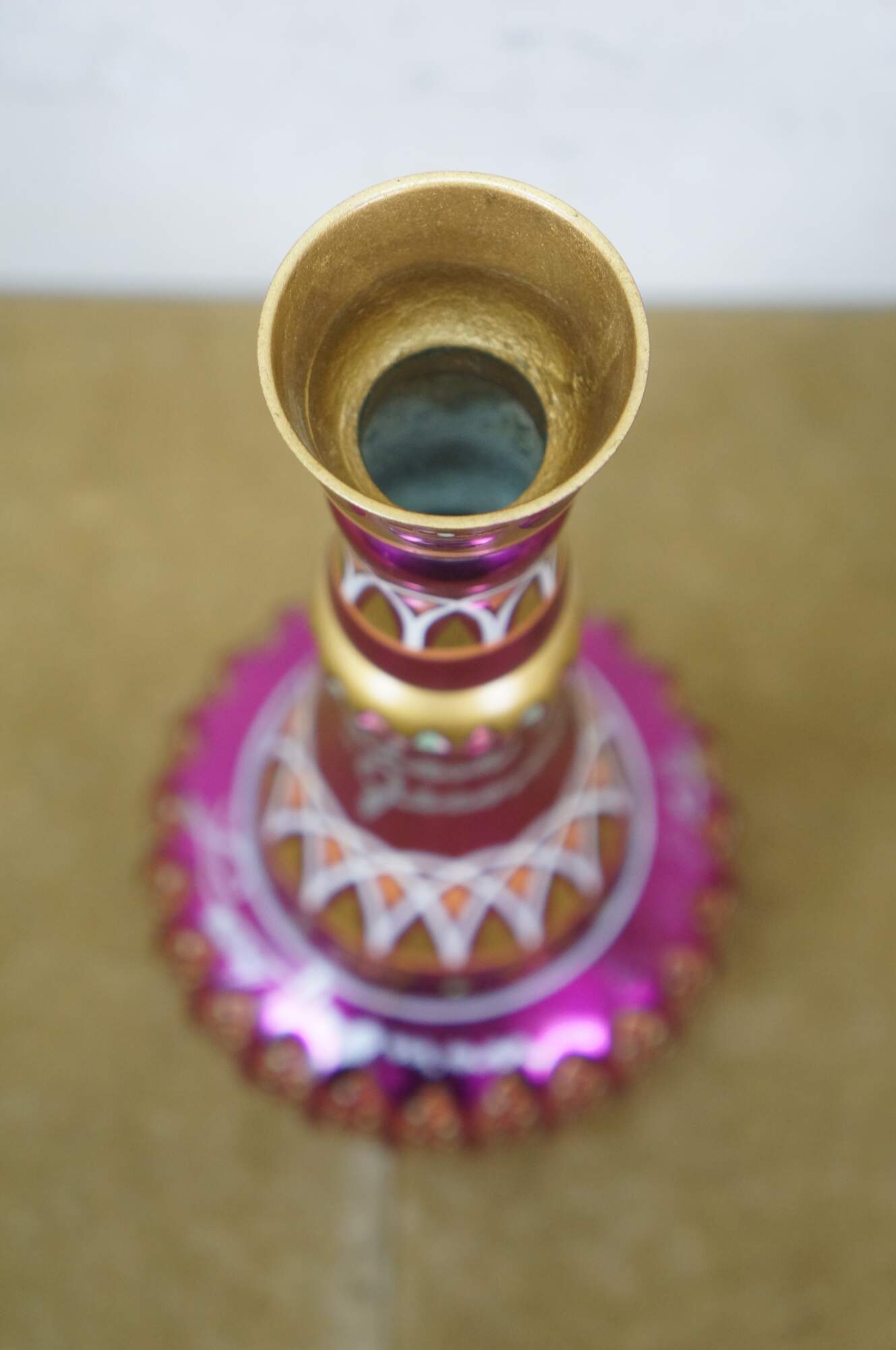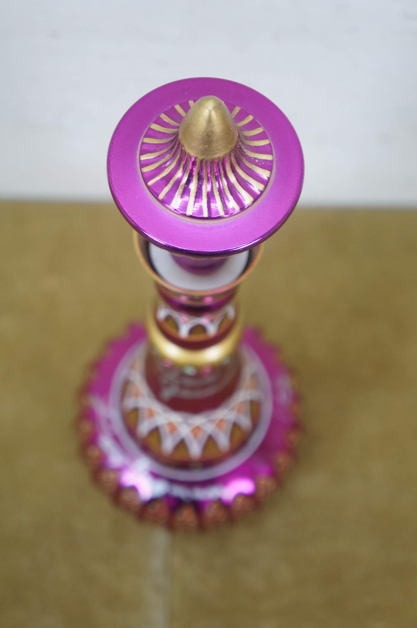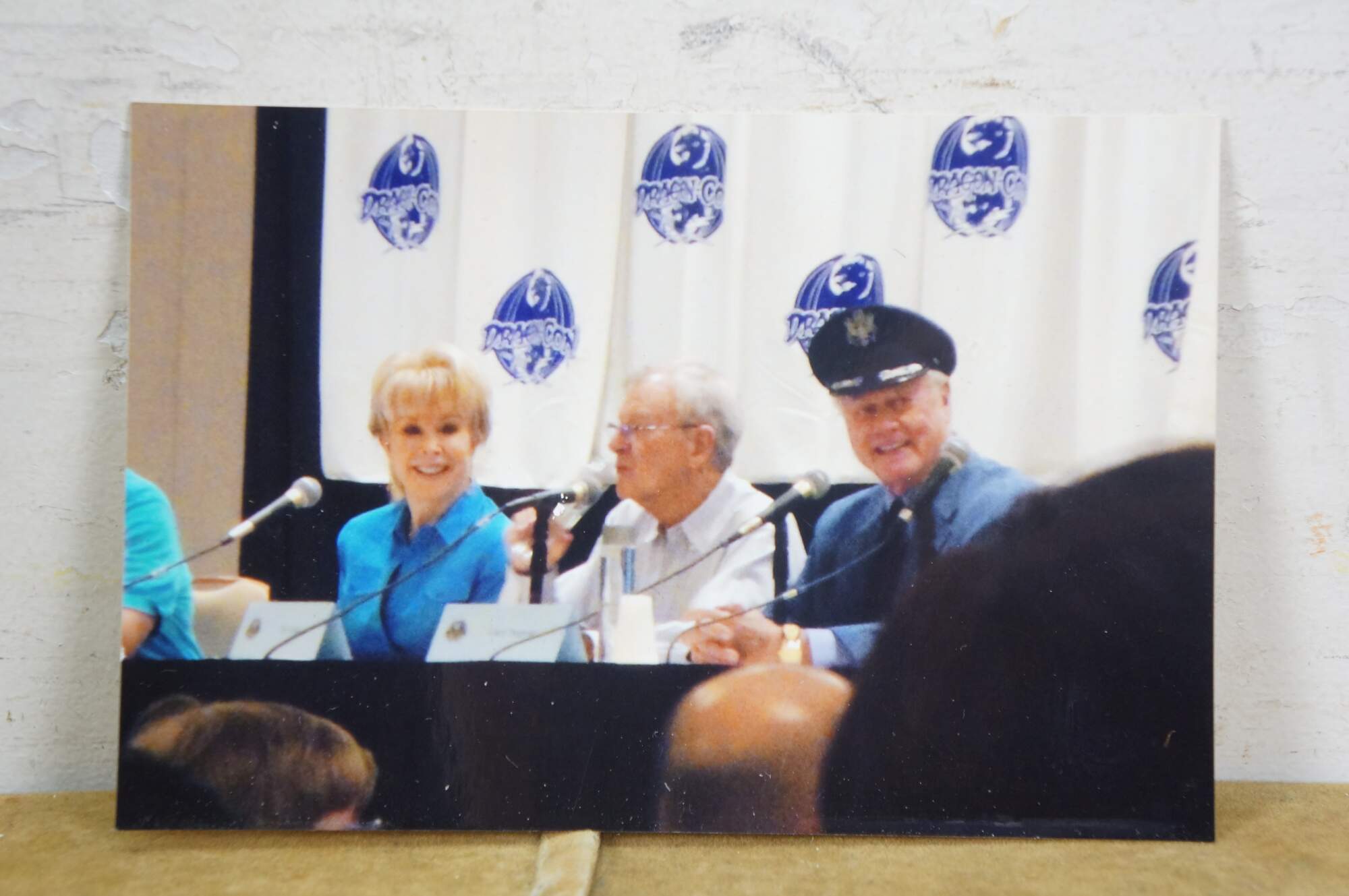 Very rare cast autographed "I Dream of Jeannie" Jeannie (genie) decanter bottle. Mirrored mulberry / purple / pink Middle Eastern inspired bottle hand painted with gold, white, coral and turquoise mimicking the prop used on the show from the Second Season onward, hand crafted and signed by Mario A.C. Della Casa of Della Casa Designs. Autographed at Dragon Con 2010 by Barbara Eden (Jeannie), Larry Hagman (Tony Nelson), and Bill Daily (Capt. Roger Healy). Includes photograph taken by original owner of the three actors at their Dragon Con panel.
