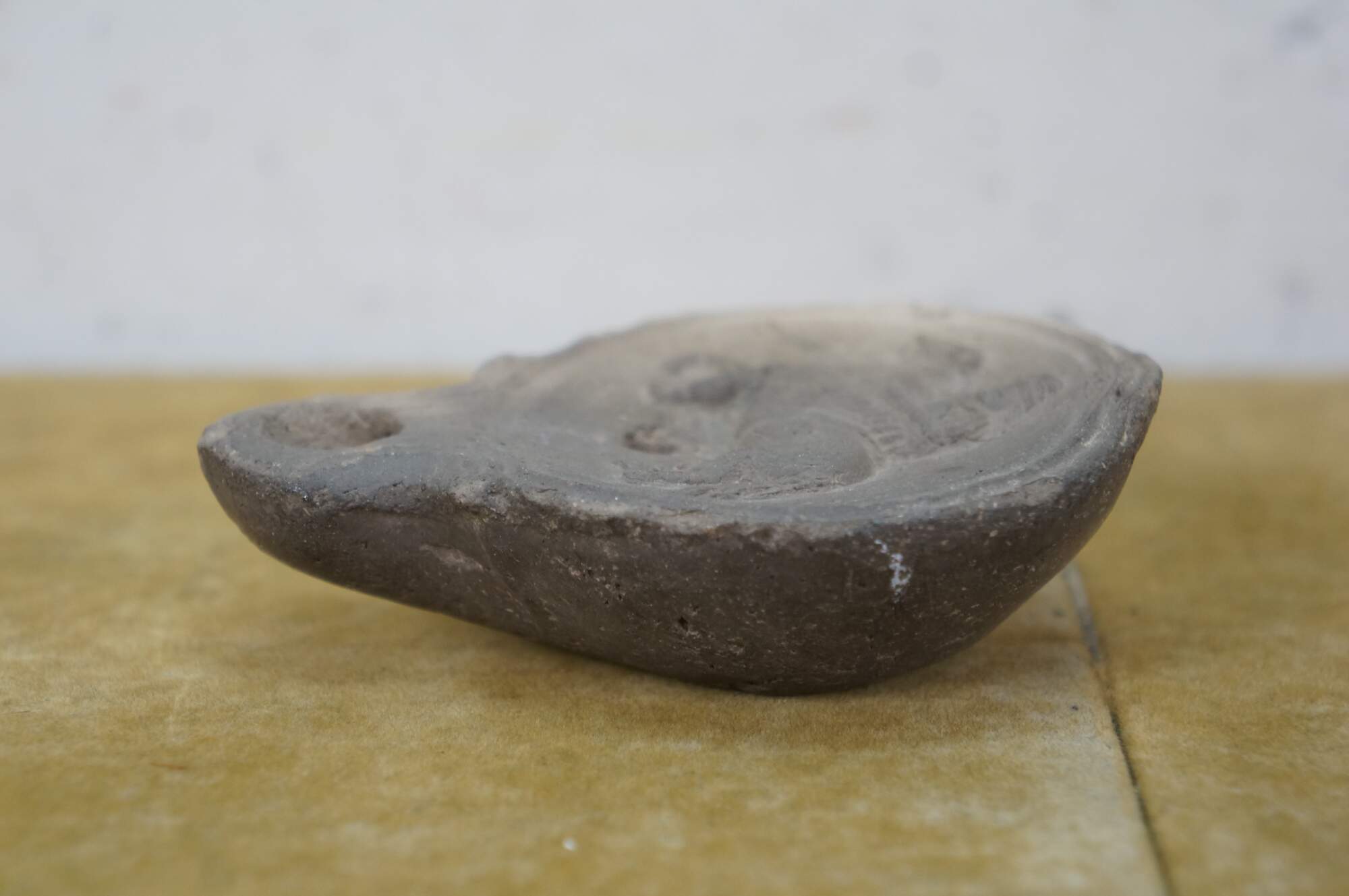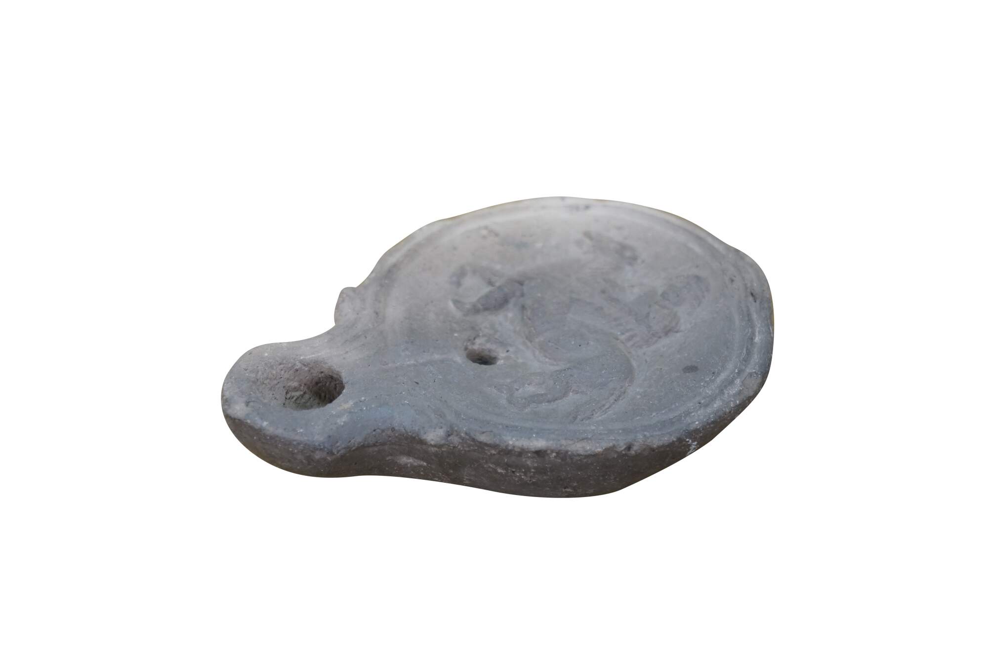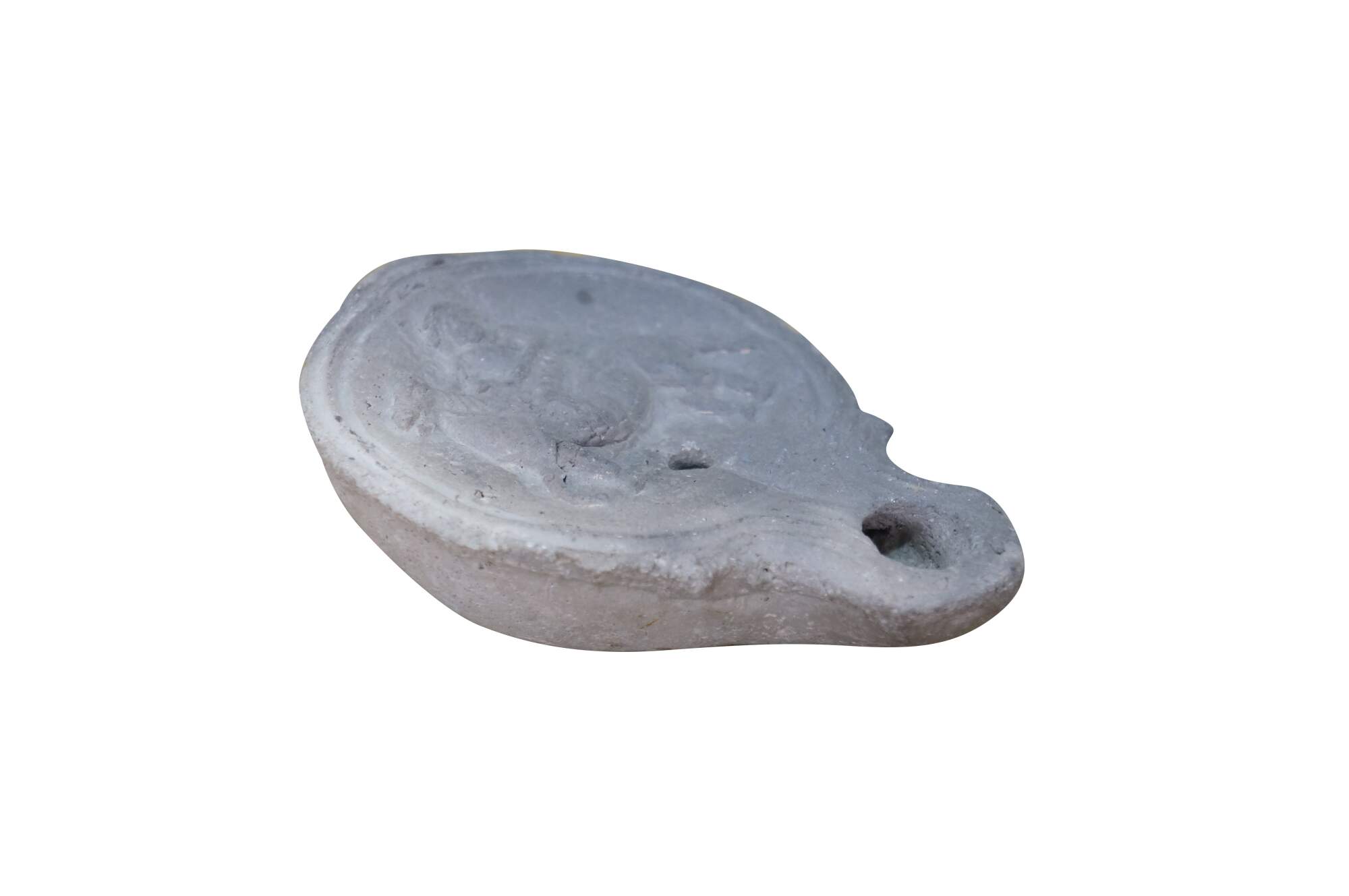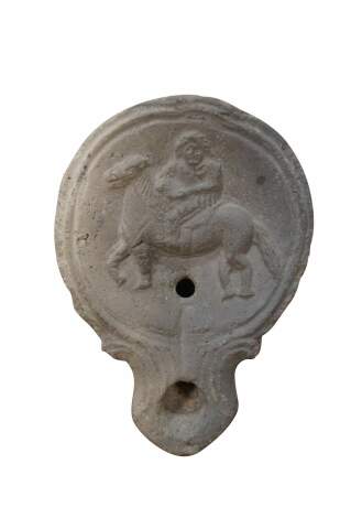 Antique Roman terracotta / clay pottery oil lamp - round main body pierced with an air hole and decorated with the image of an equestrian soldier figure on horseback, tapering to a lightly carved spout.
