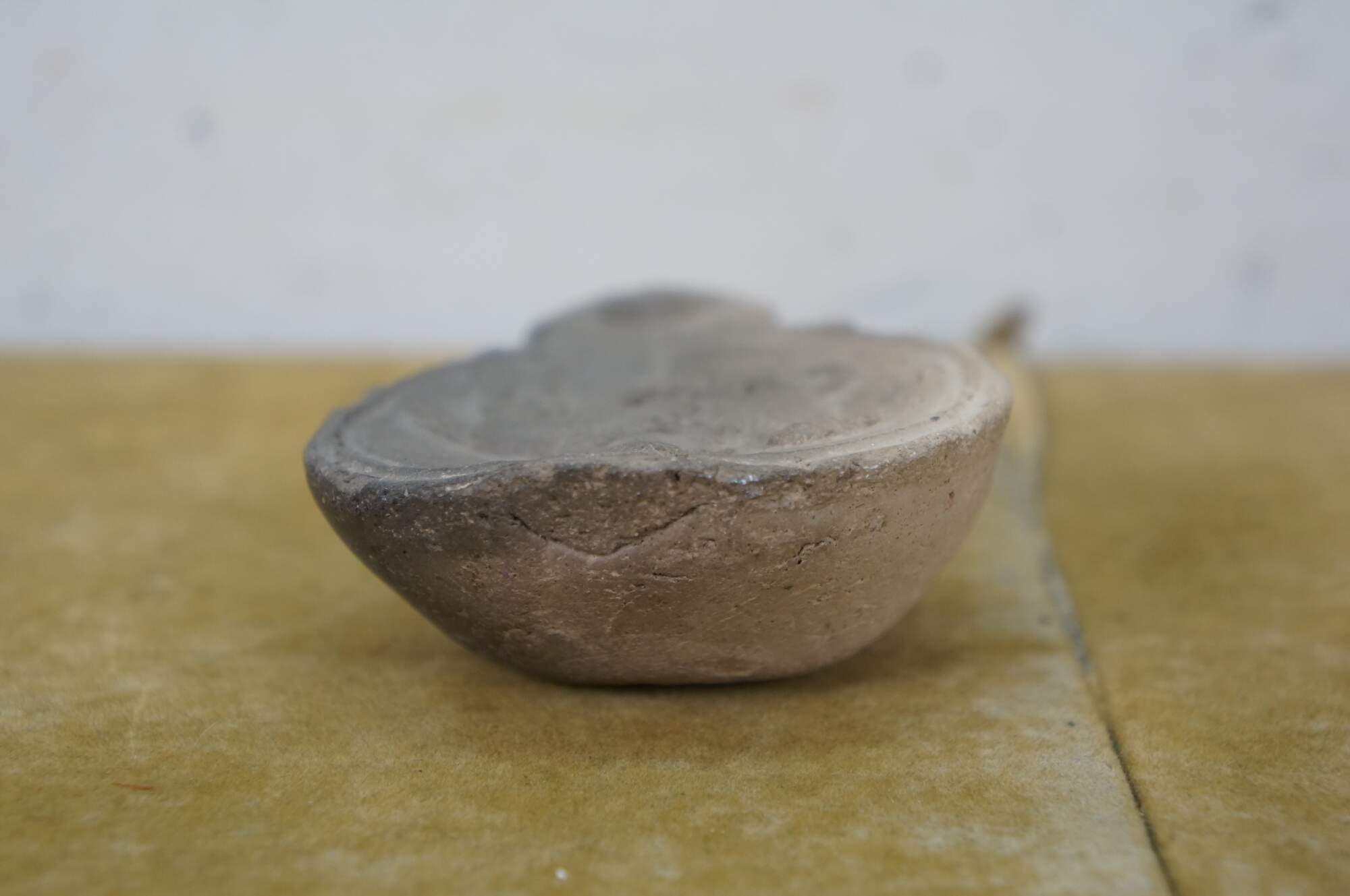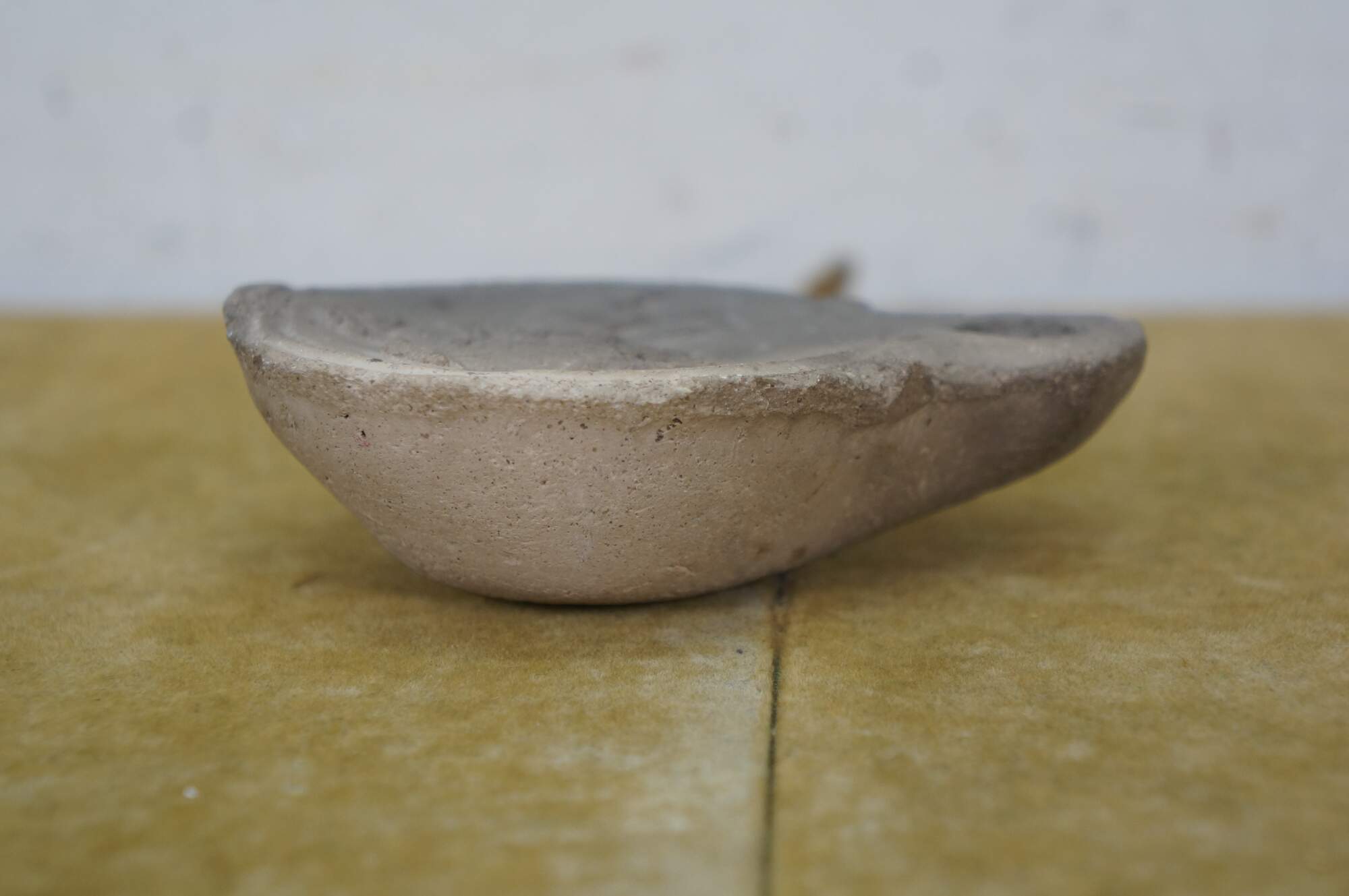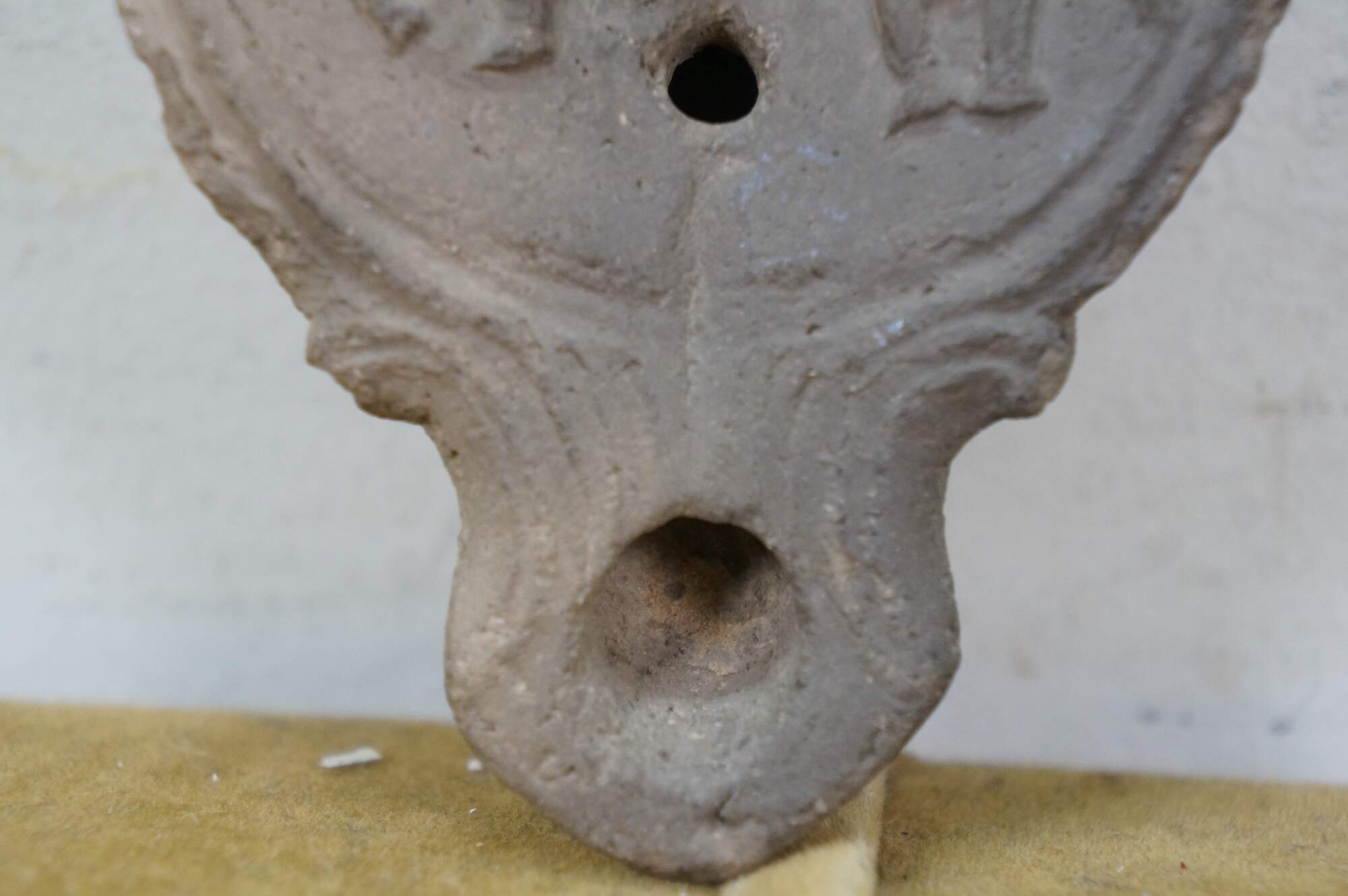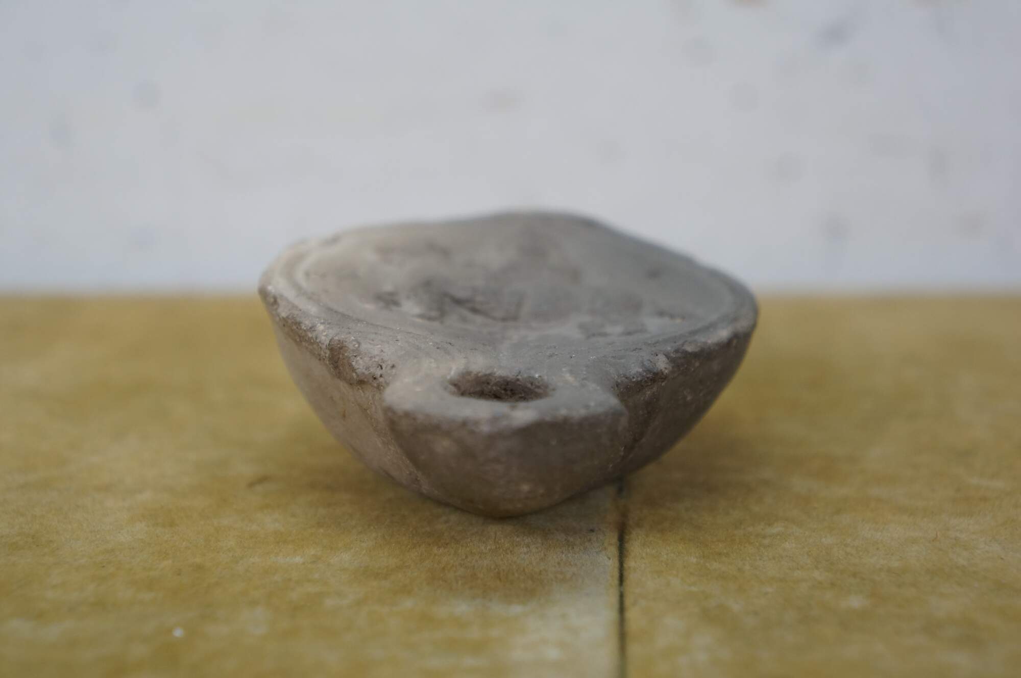 Antique Roman terracotta / clay pottery oil lamp - round main body pierced with an air hole and decorated with the image of an equestrian soldier figure on horseback, tapering to a lightly carved spout.