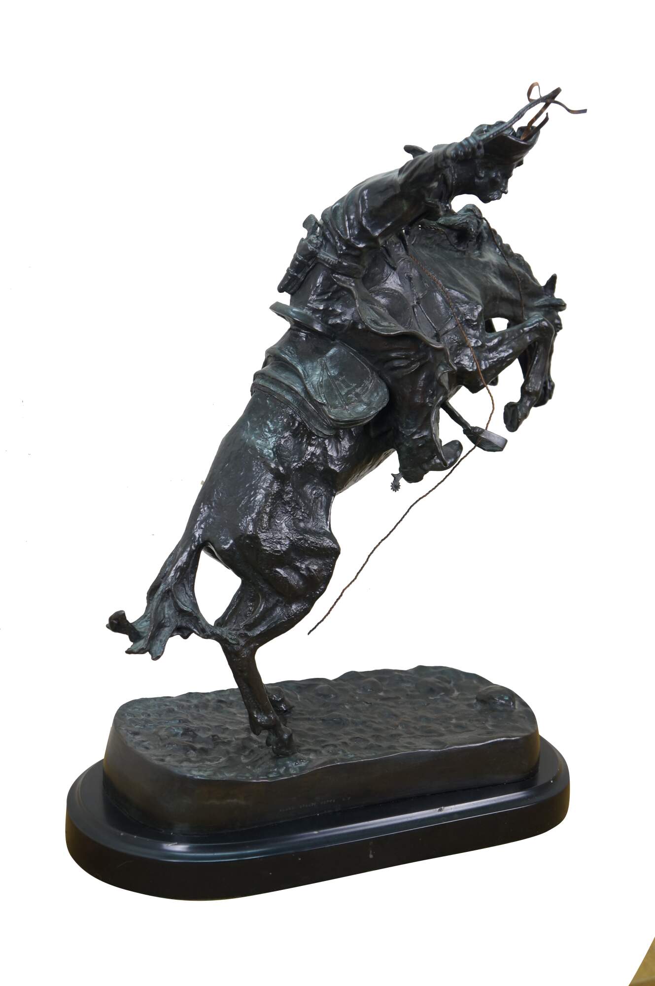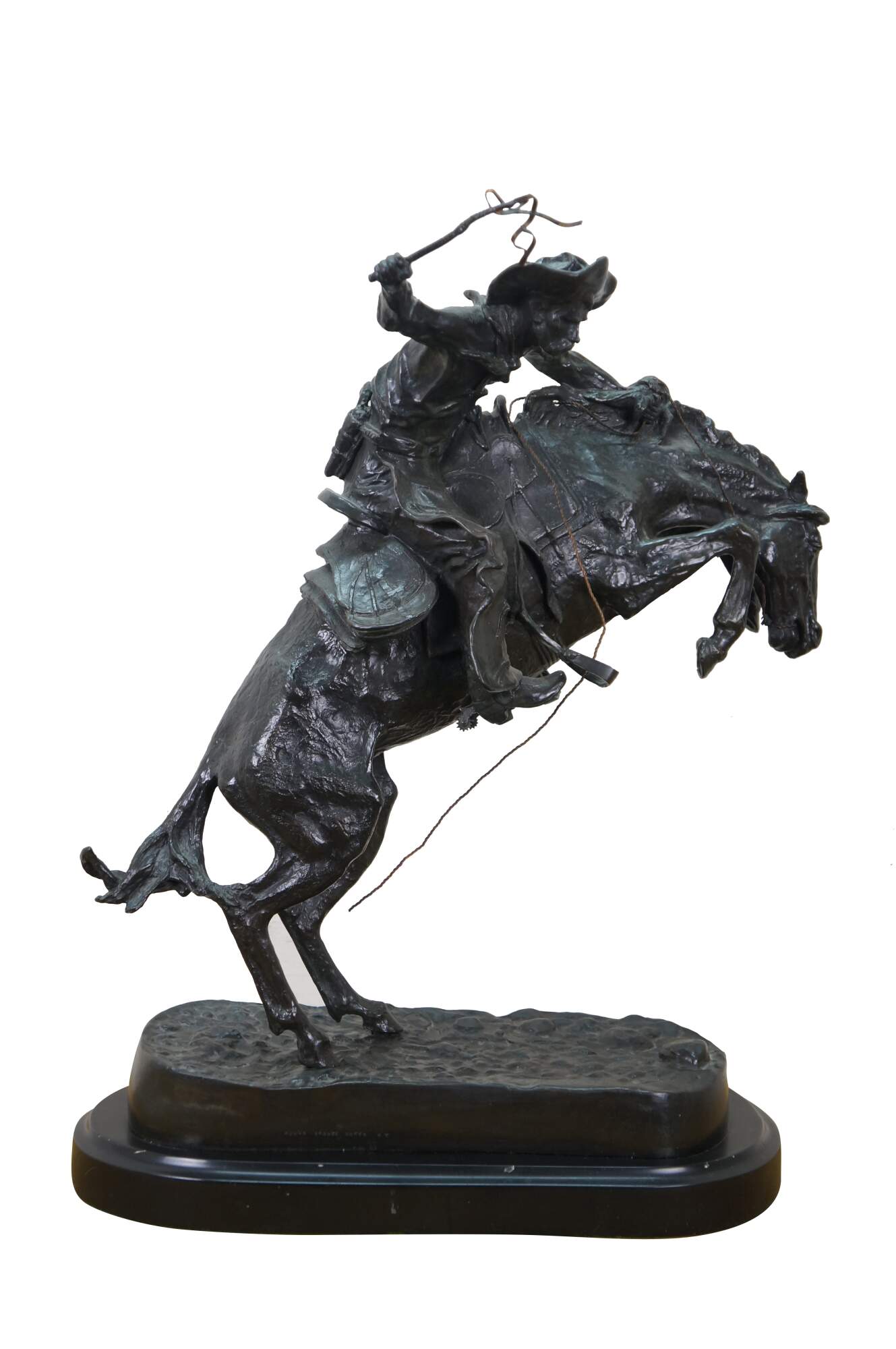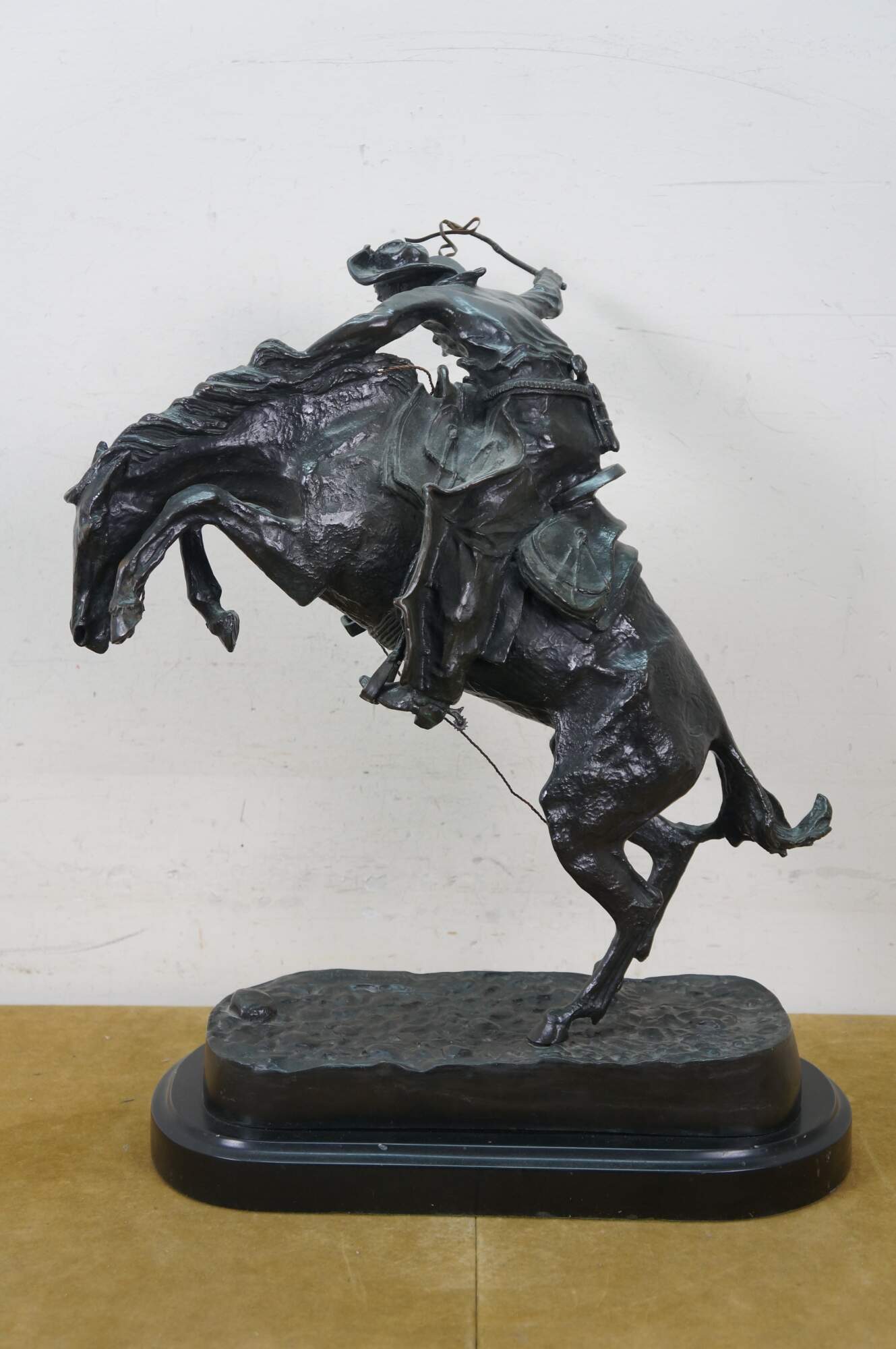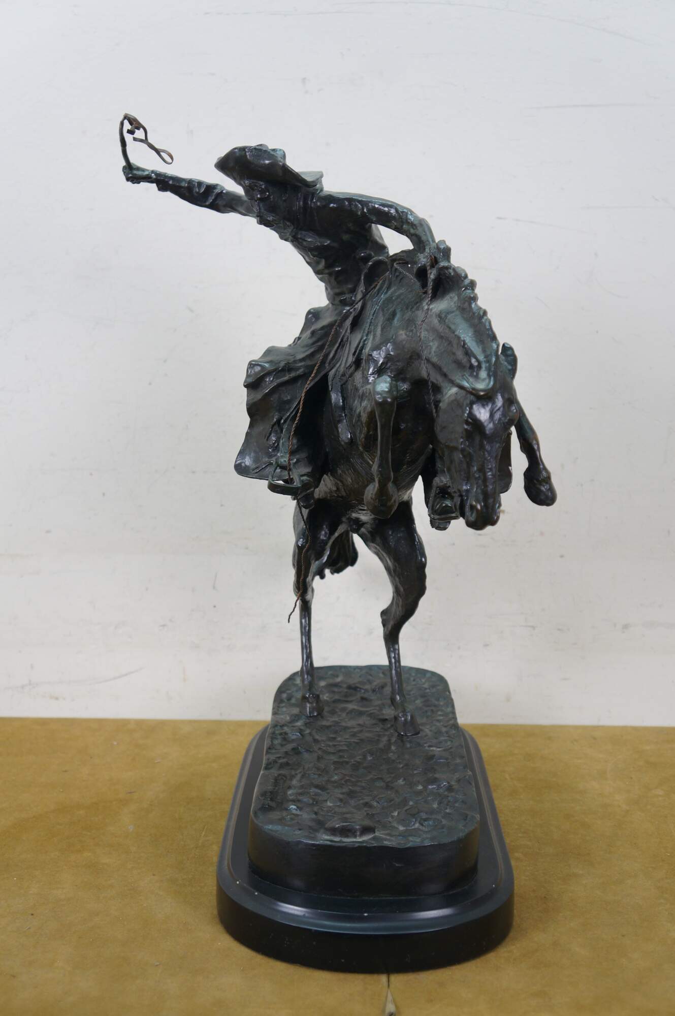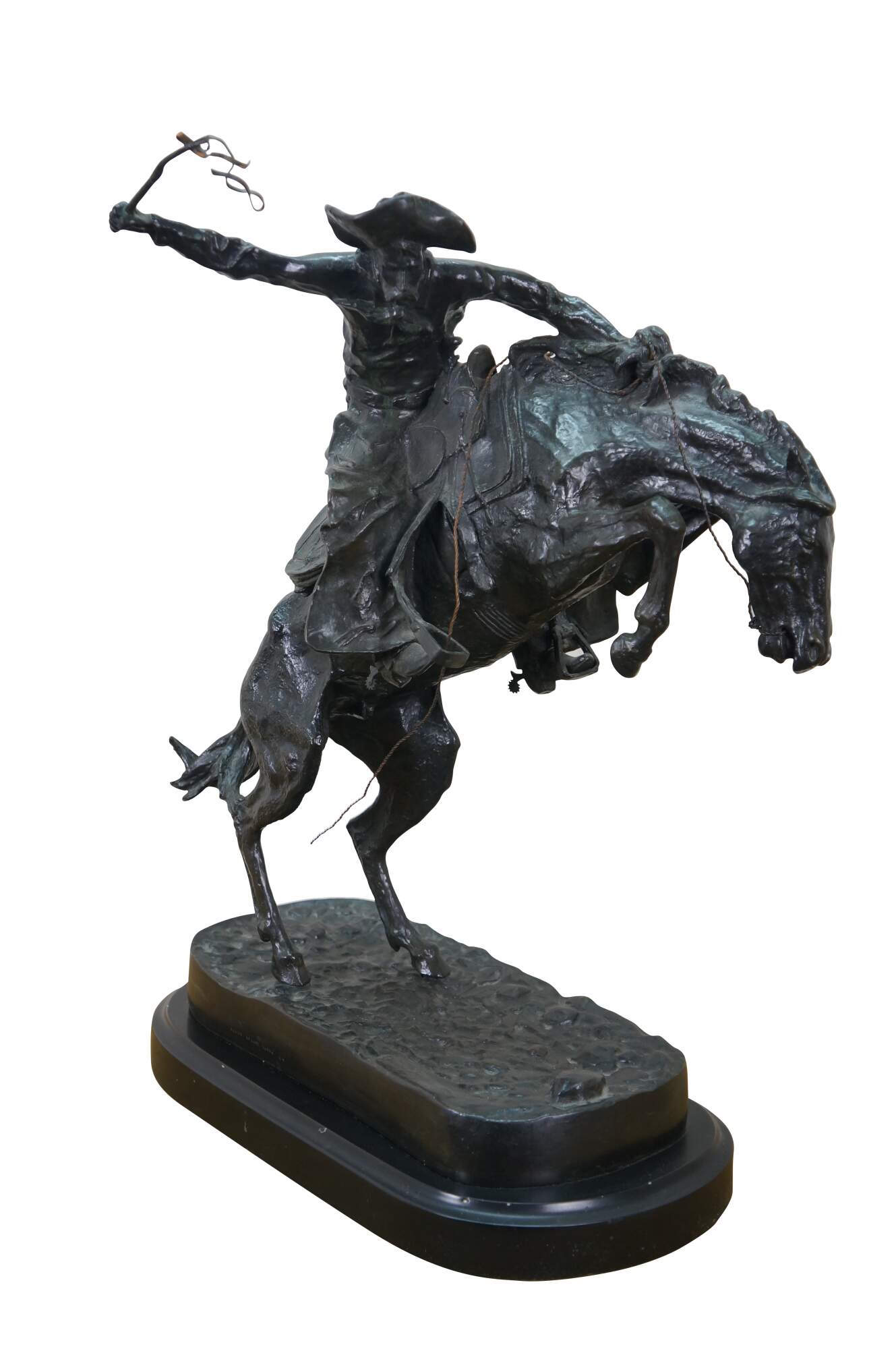 Mid century Frederic Remington bronze sculpture titled "The Bronco Buster," produced by Roman Bronze Works, New York. Depicts an American cowboy holding a twisting whip, seated on the back of a bucking bronco / horse. Mounted on an oval black marble base.