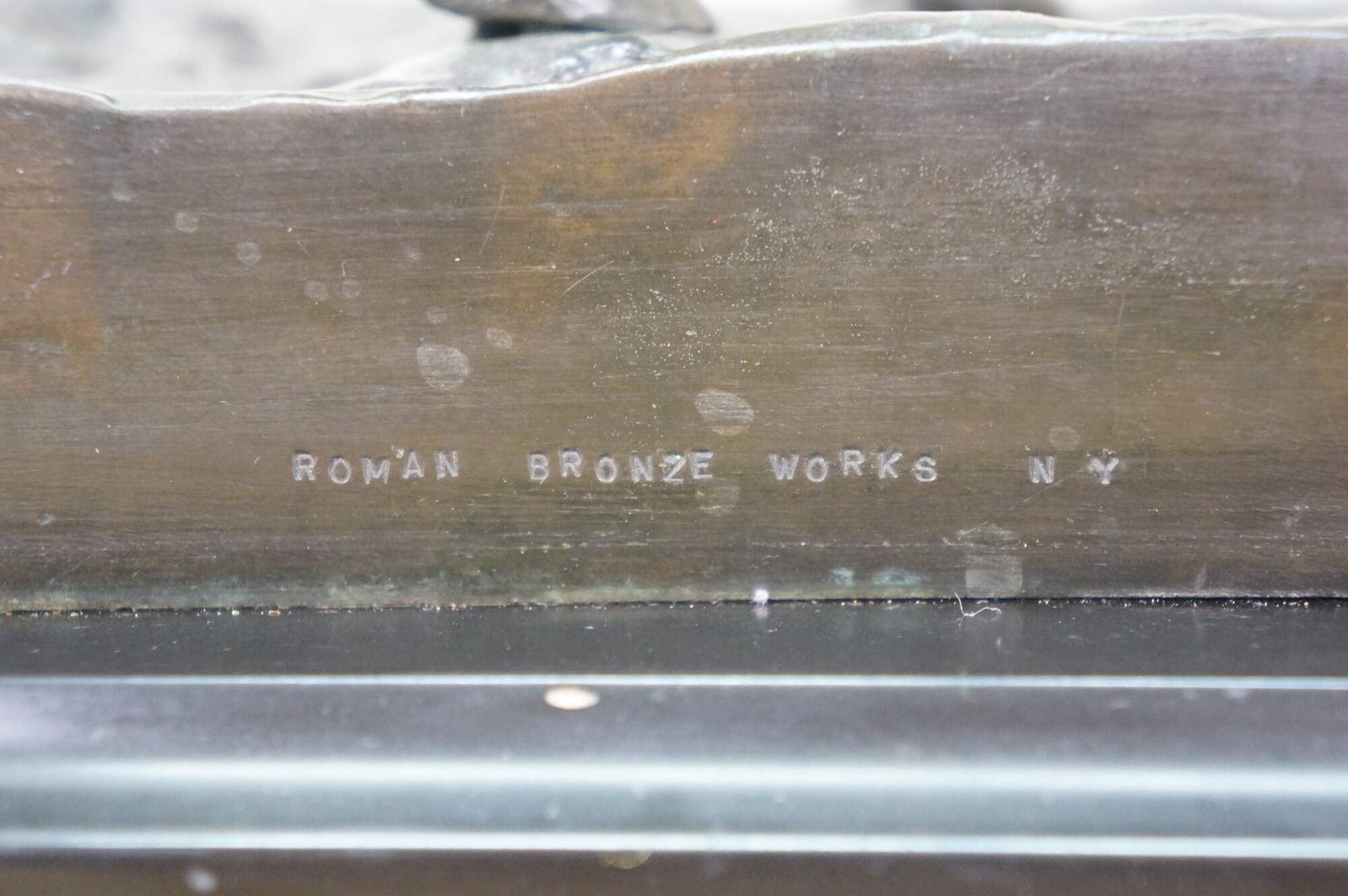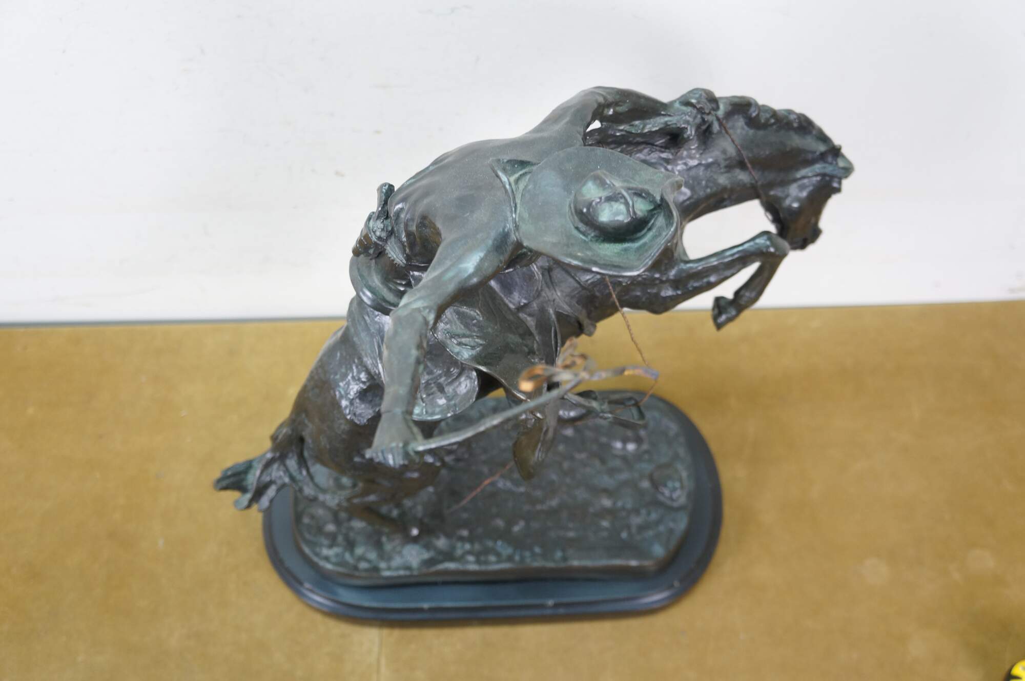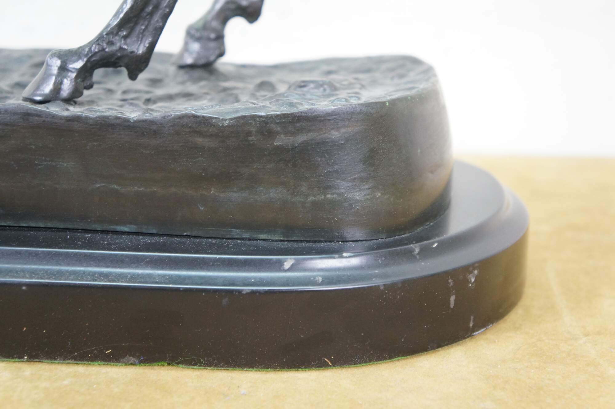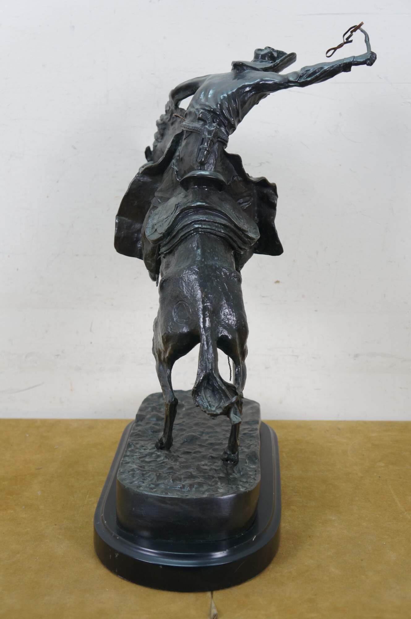 Mid century Frederic Remington bronze sculpture titled "The Bronco Buster," produced by Roman Bronze Works, New York. Depicts an American cowboy holding a twisting whip, seated on the back of a bucking bronco / horse. Mounted on an oval black marble base.