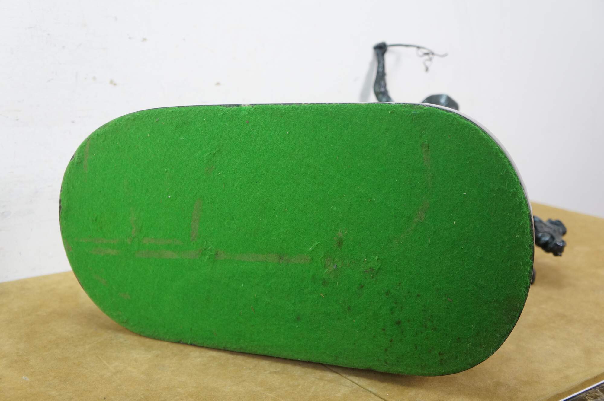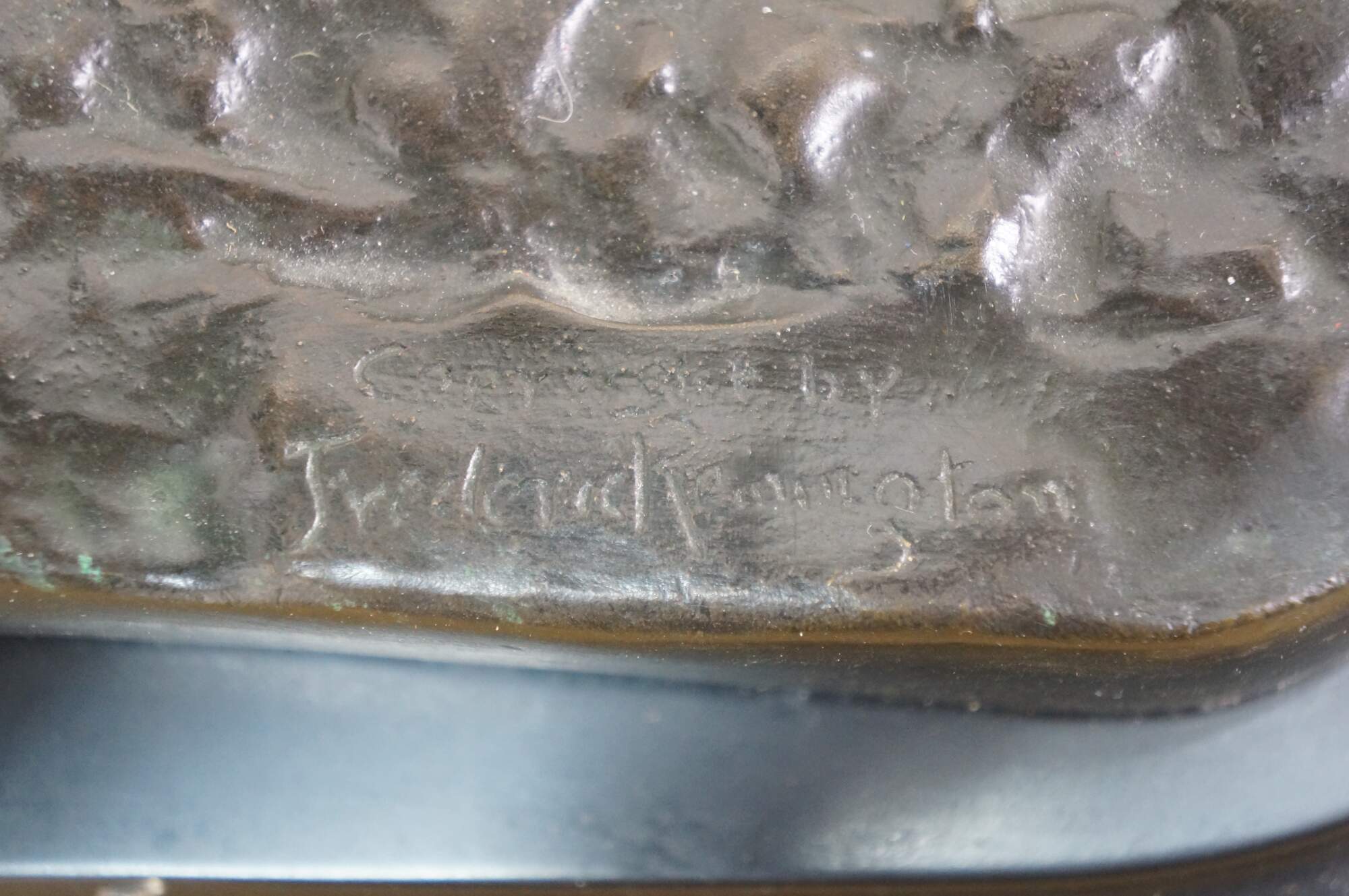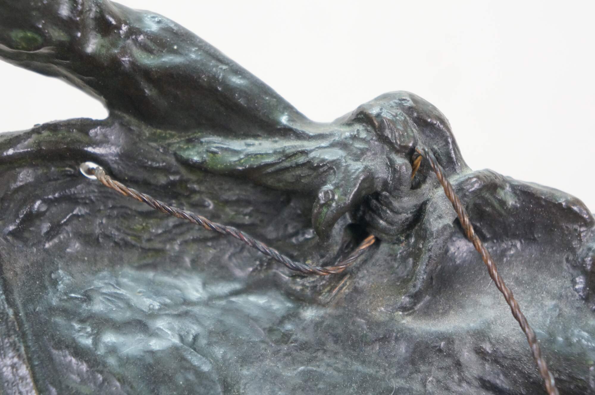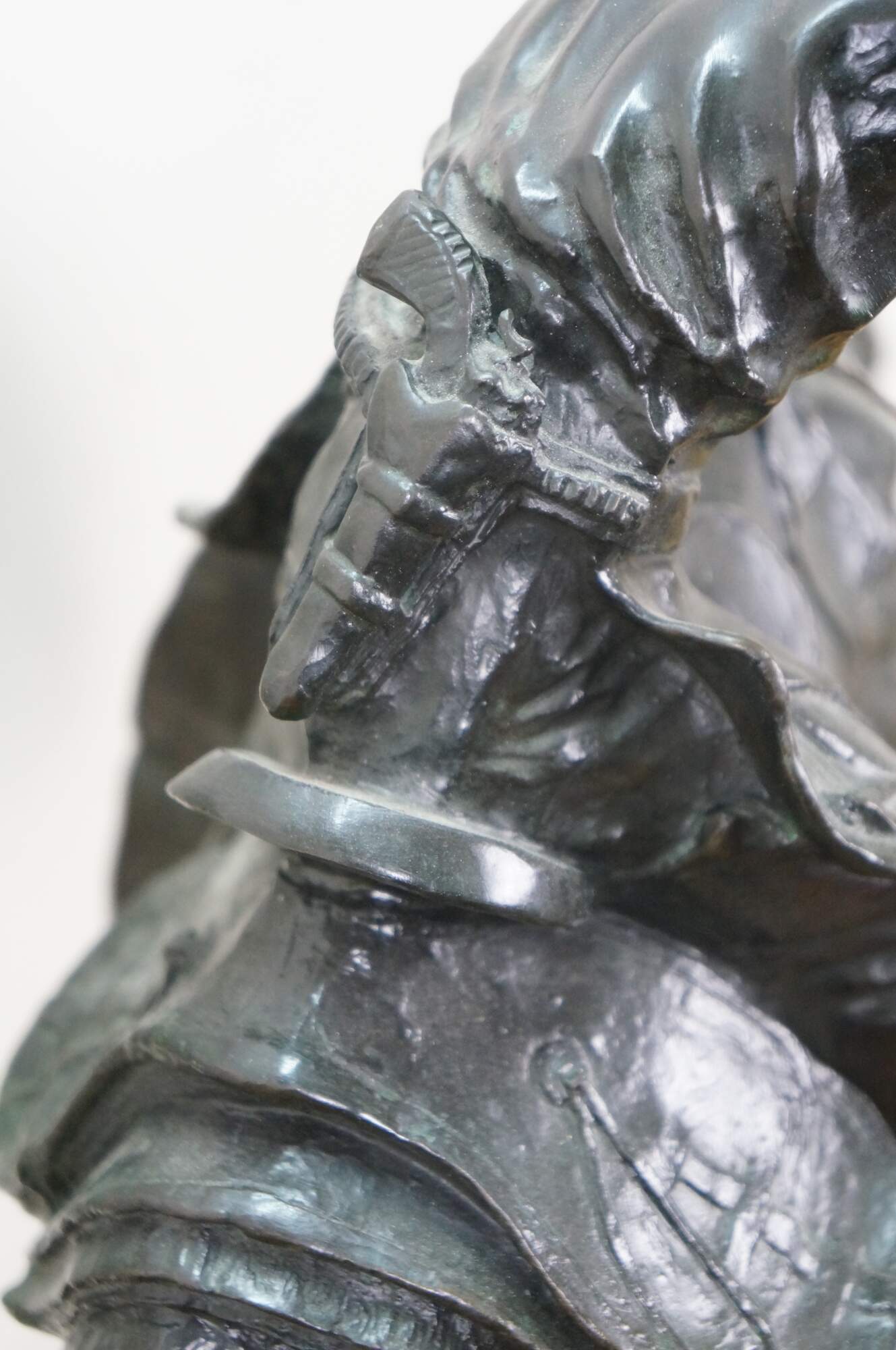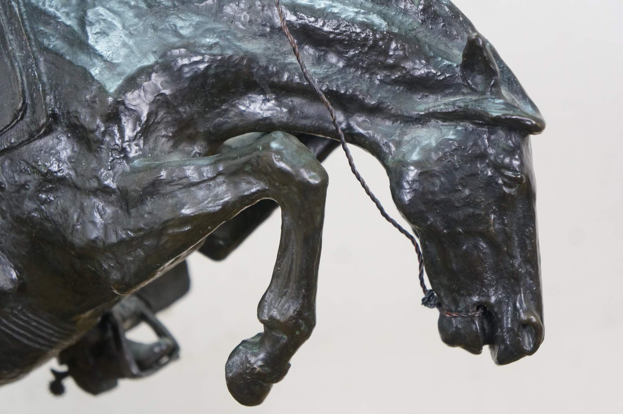 Mid century Frederic Remington bronze sculpture titled "The Bronco Buster," produced by Roman Bronze Works, New York. Depicts an American cowboy holding a twisting whip, seated on the back of a bucking bronco / horse. Mounted on an oval black marble base.