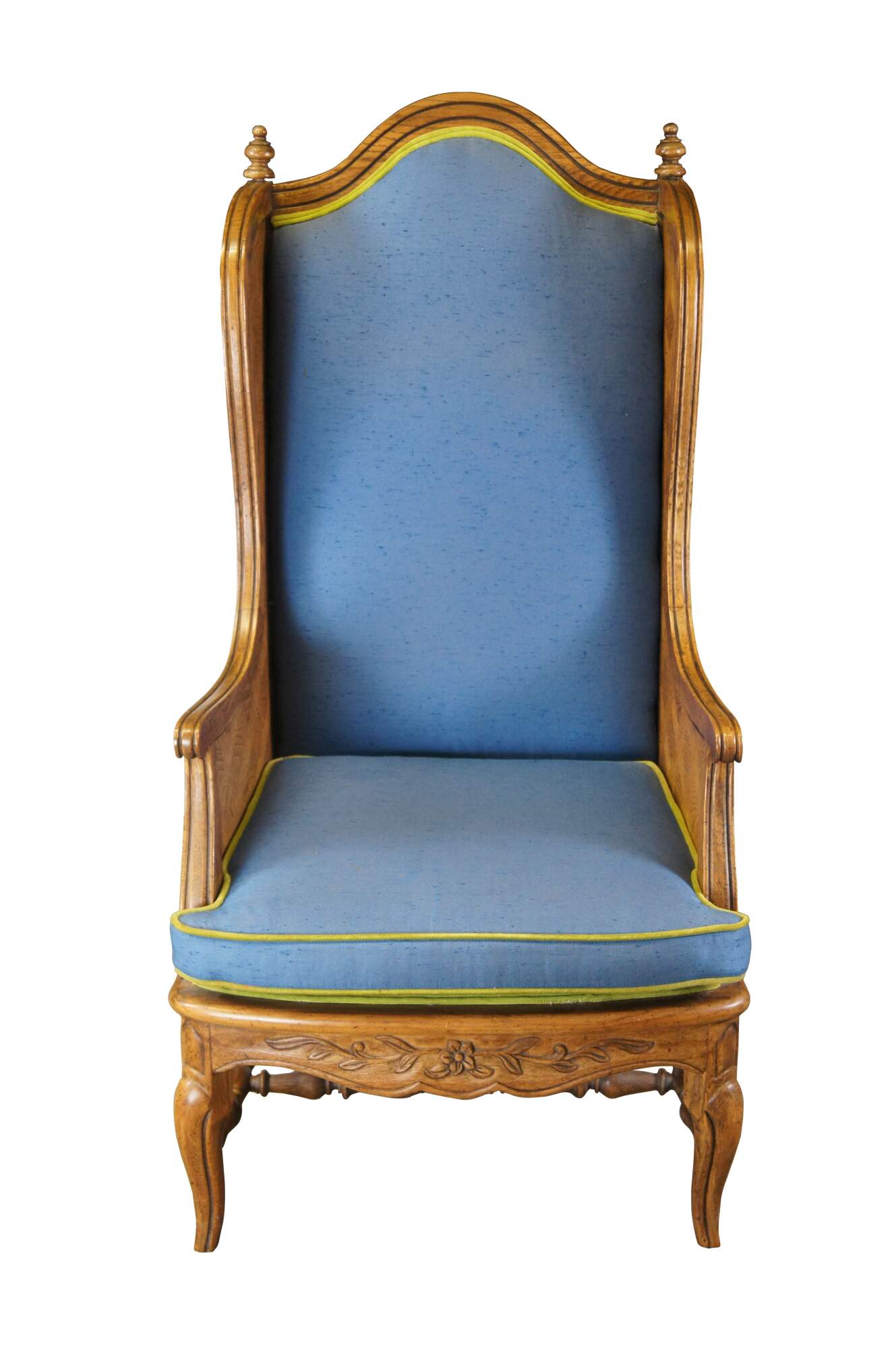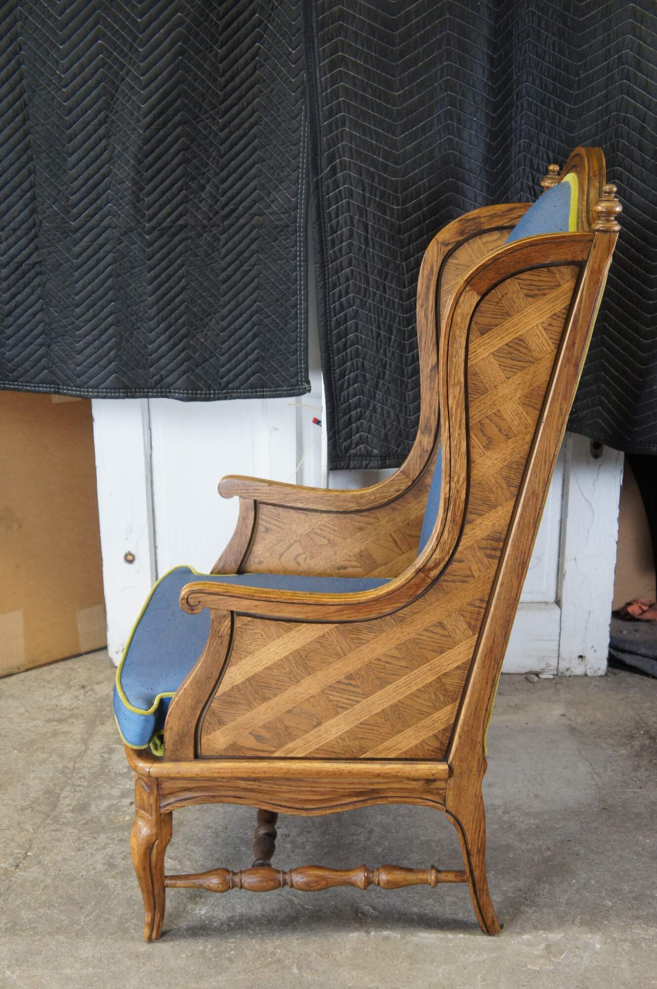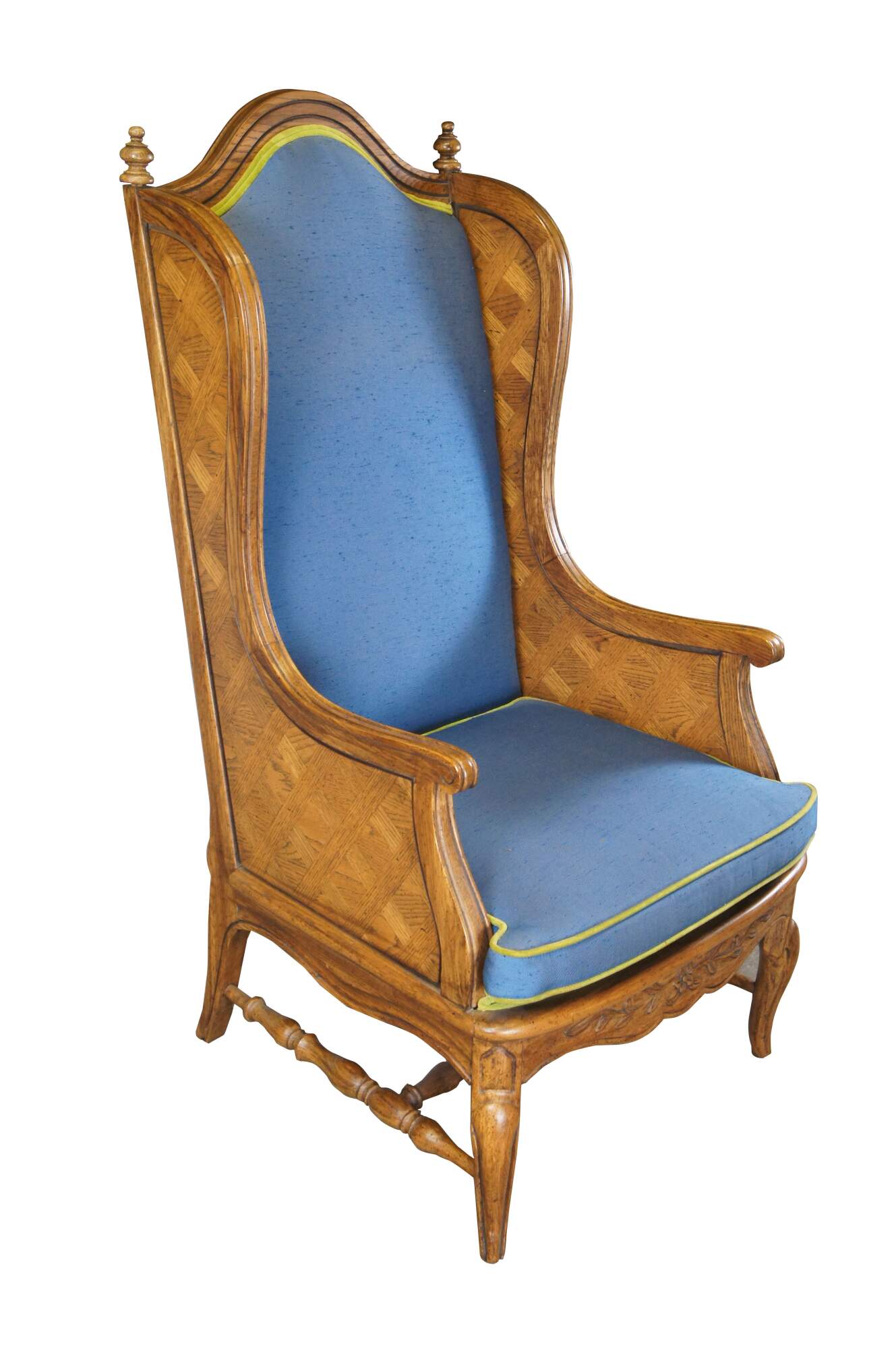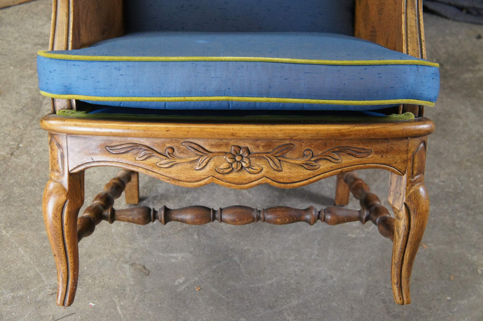 A stately wingback chair by Thomasville Furniture, Circa 1970s. Features an oak frame with a serpentine crest rail set between turned finials. The wingback portion of the chair is fashioned from a beautiful diamond parquetry that shows both inside and out. The chair is upholstered in blue with green cording. Lower frame showcases serpentine aprons with a floral carved front over cabriole legs connected by a turned H stretcher.