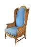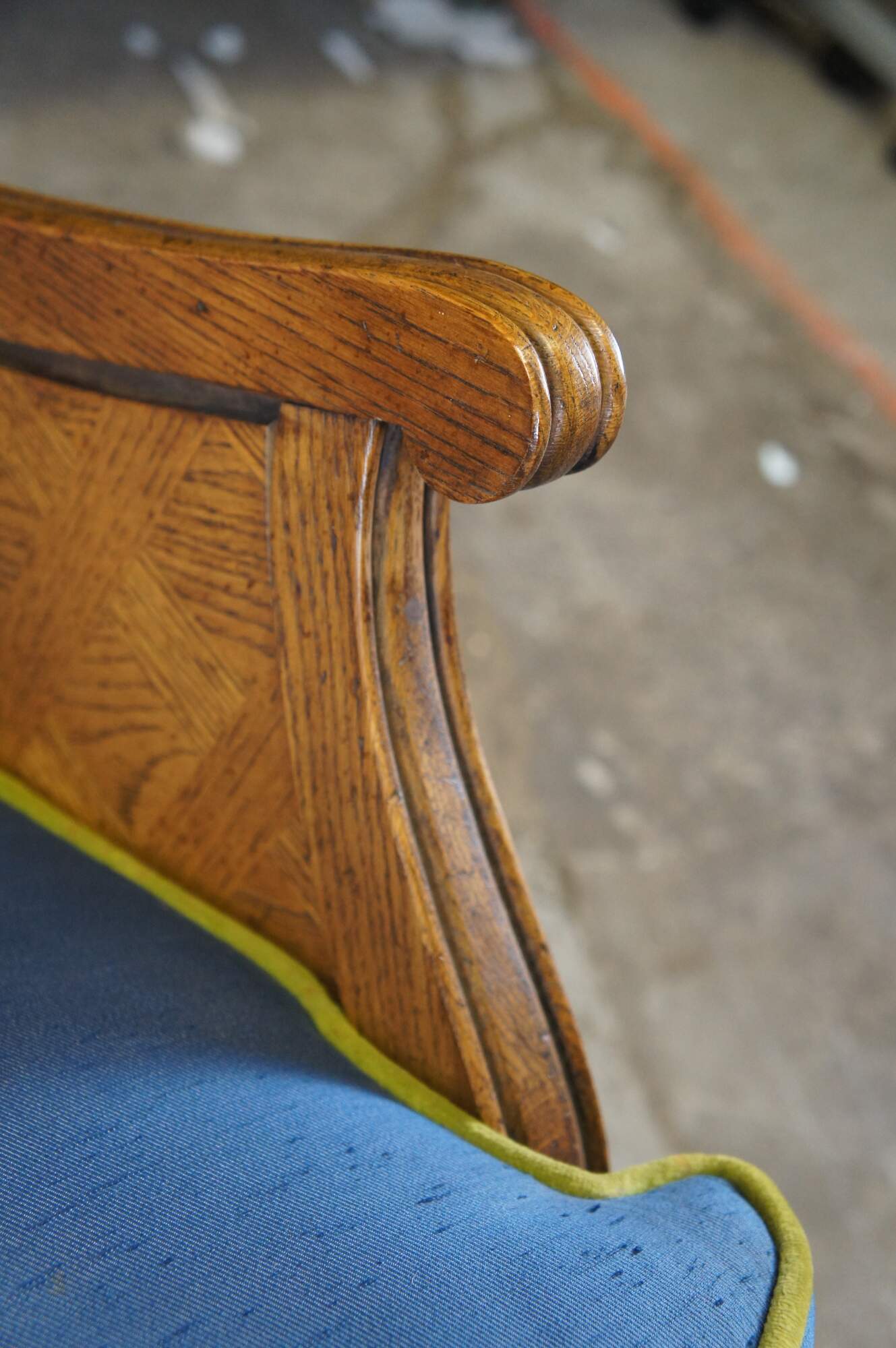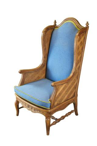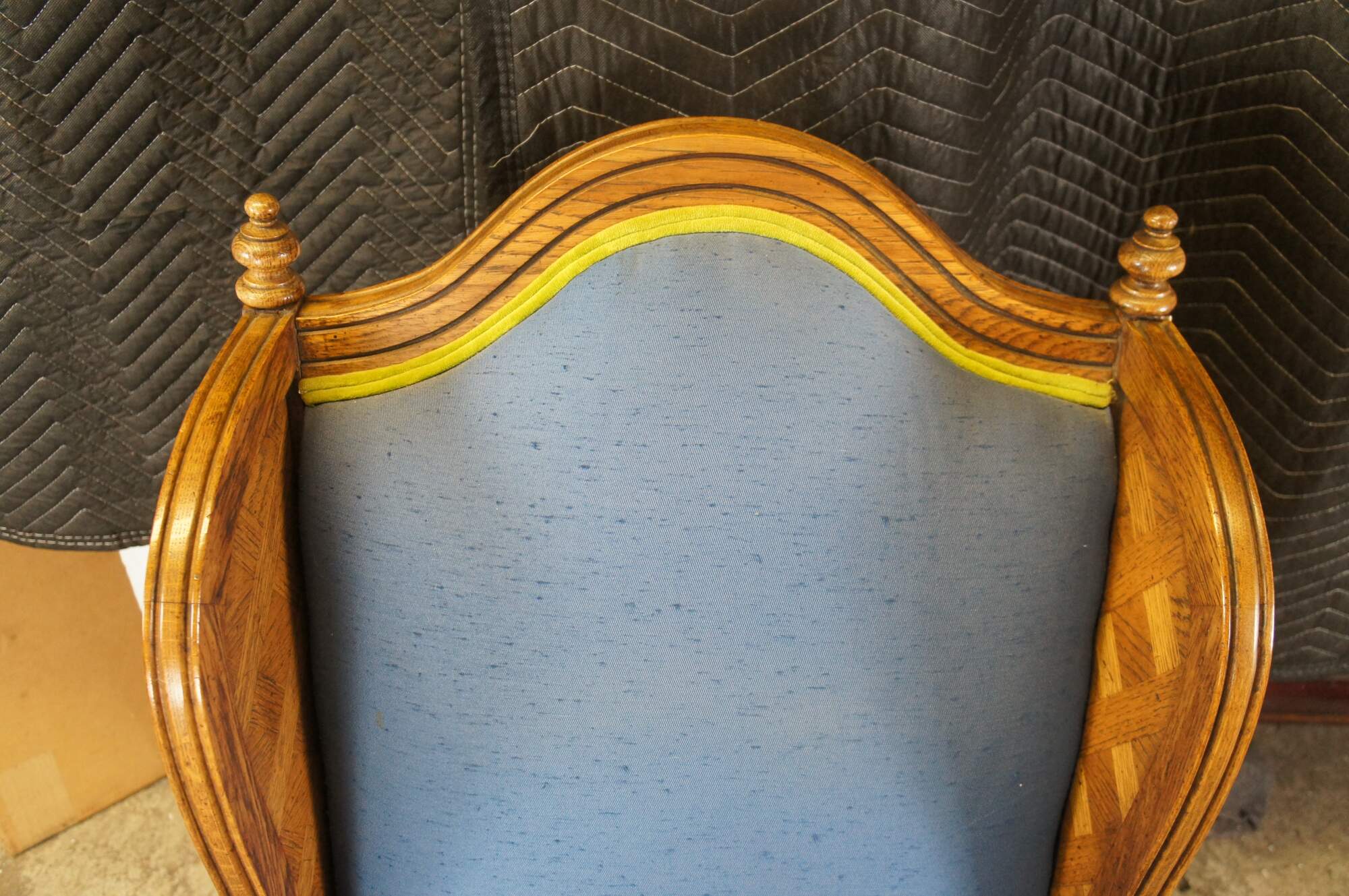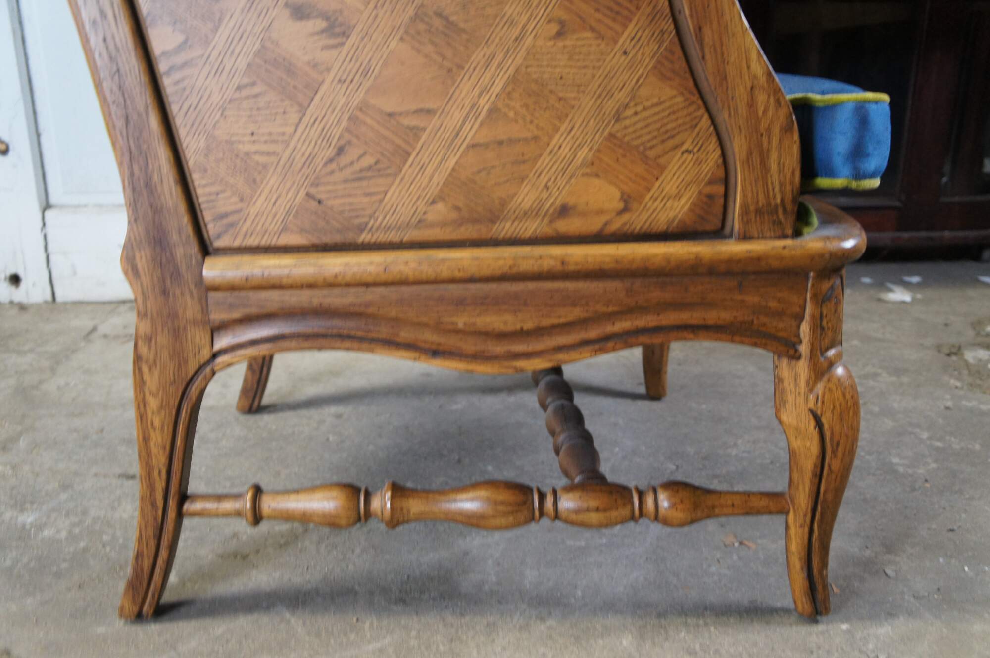 A stately wingback chair by Thomasville Furniture, Circa 1970s. Features an oak frame with a serpentine crest rail set between turned finials. The wingback portion of the chair is fashioned from a beautiful diamond parquetry that shows both inside and out. The chair is upholstered in blue with green cording. Lower frame showcases serpentine aprons with a floral carved front over cabriole legs connected by a turned H stretcher.