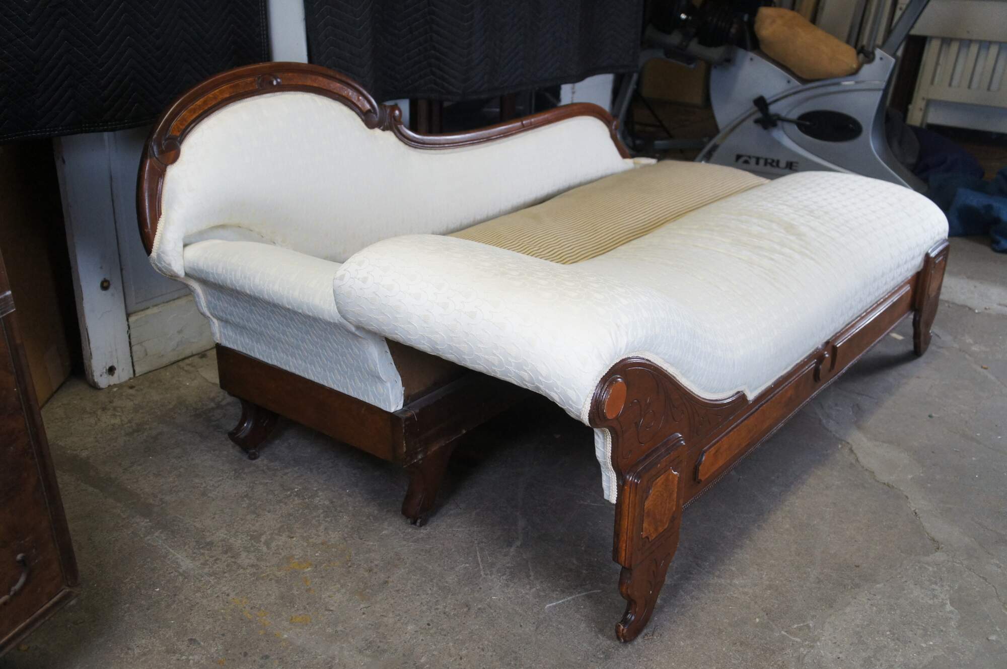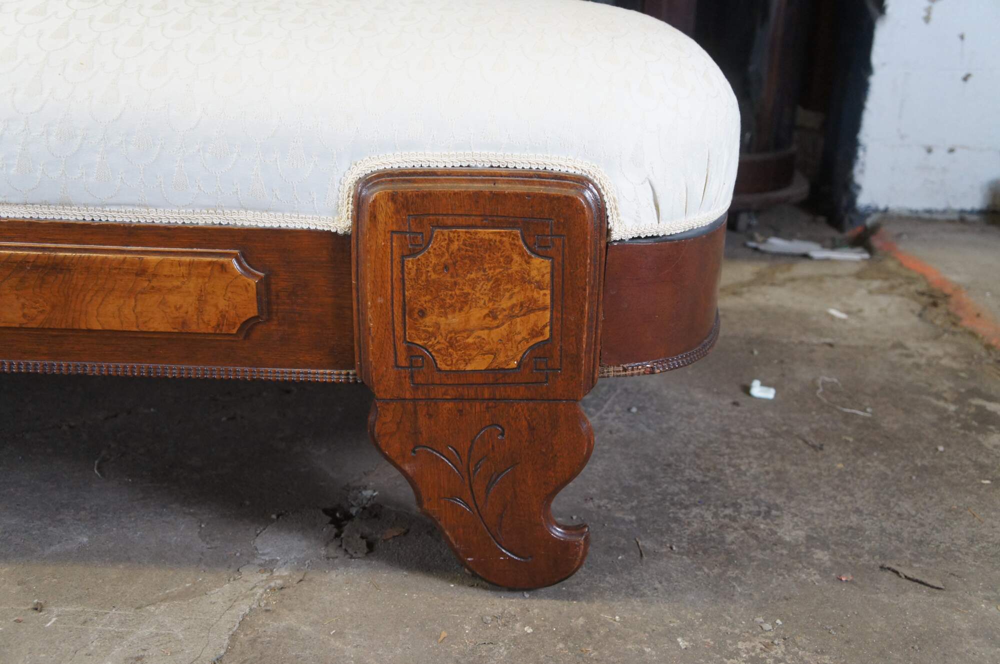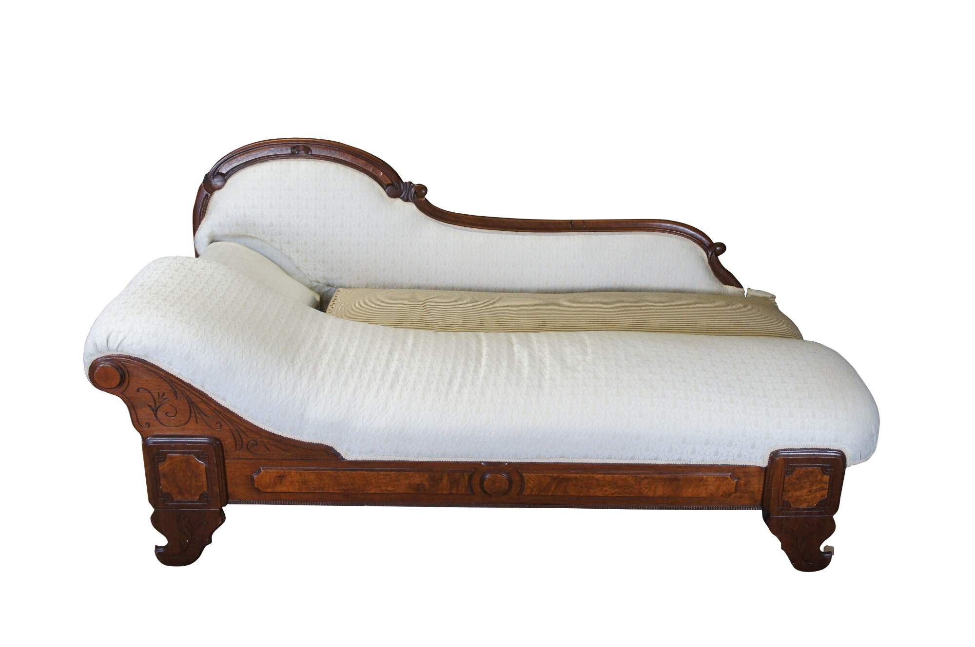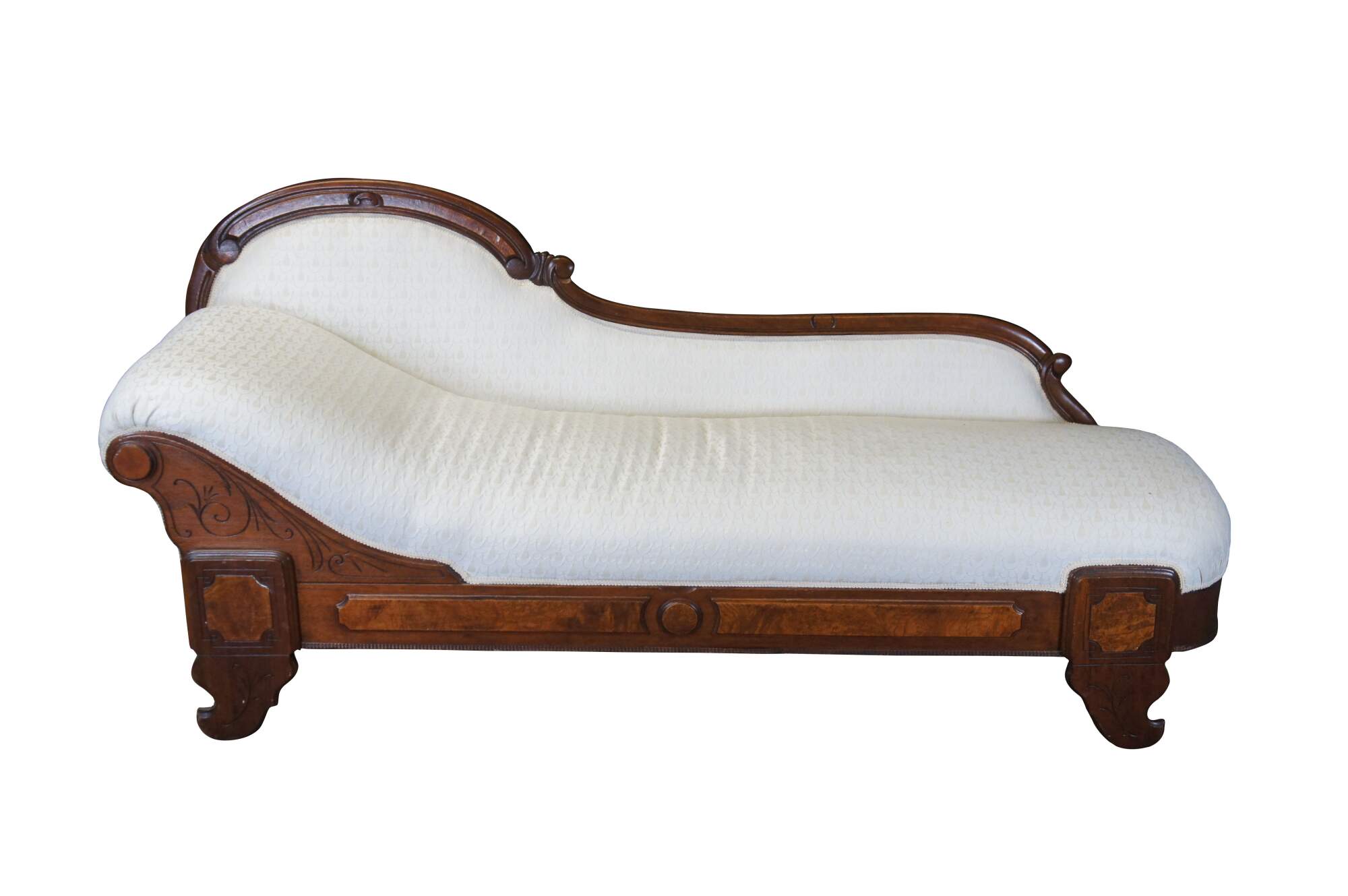 Antique Victorian Eastlake Fold Out Récamier / Chaise Lounge, circa 1870s. Features a walnut frame with burlwood panels, carved foliate and contoured back with 'C' and 'S' scrolled detail. Supported by carved and flared feet. The sofa has a unique mechanism that allows it to flip open for use as a sleeper or bed. A fun addition to any space.
