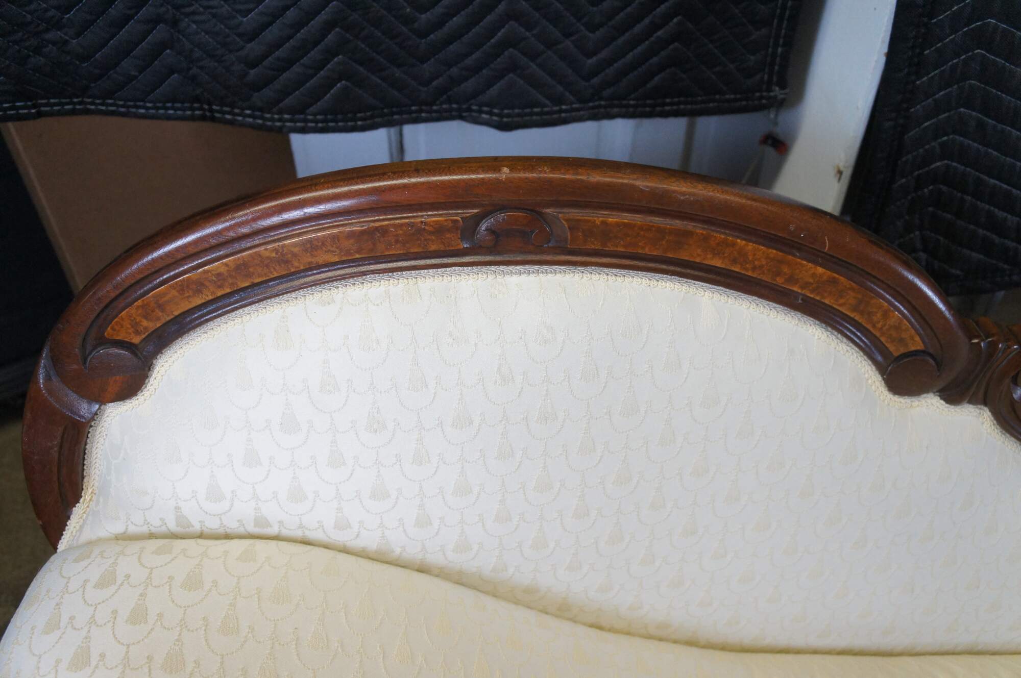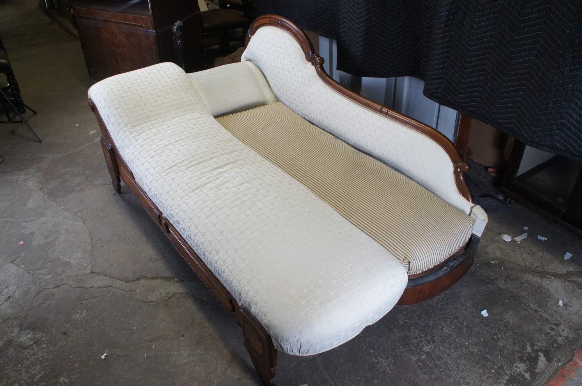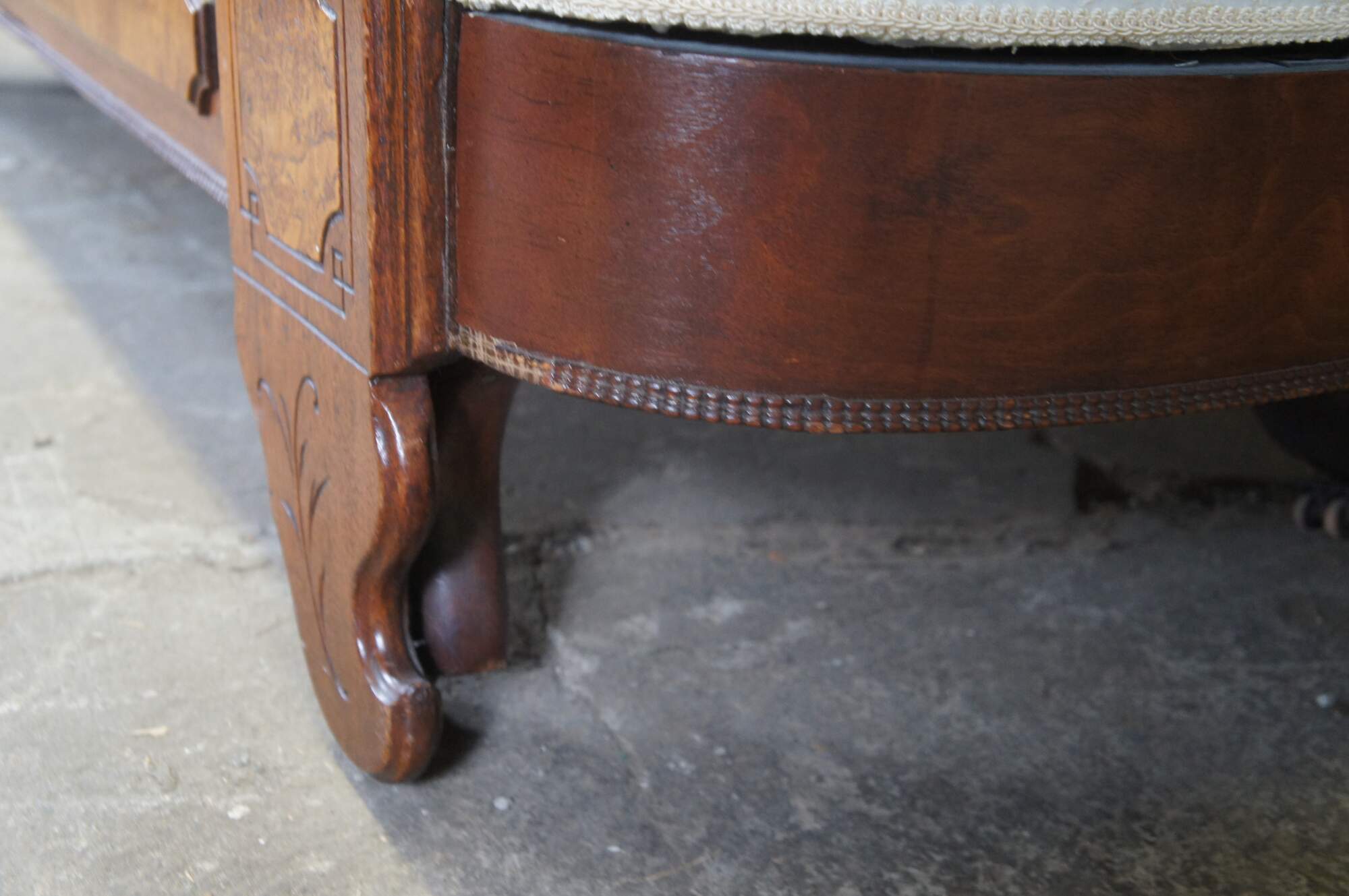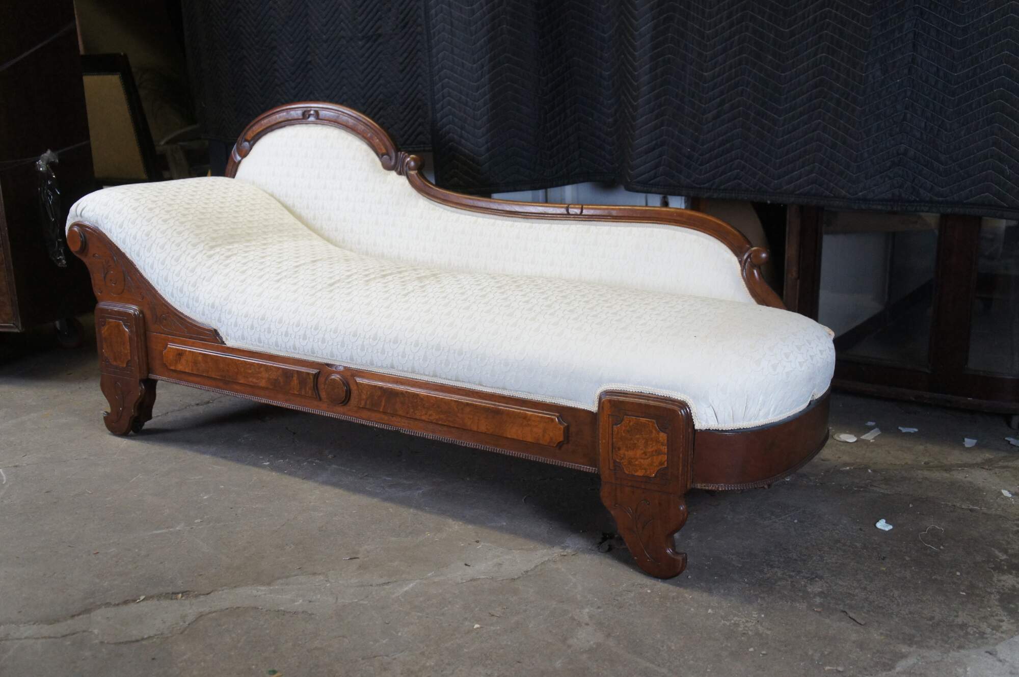 Antique Victorian Eastlake Fold Out Récamier / Chaise Lounge, circa 1870s. Features a walnut frame with burlwood panels, carved foliate and contoured back with 'C' and 'S' scrolled detail. Supported by carved and flared feet. The sofa has a unique mechanism that allows it to flip open for use as a sleeper or bed. A fun addition to any space.