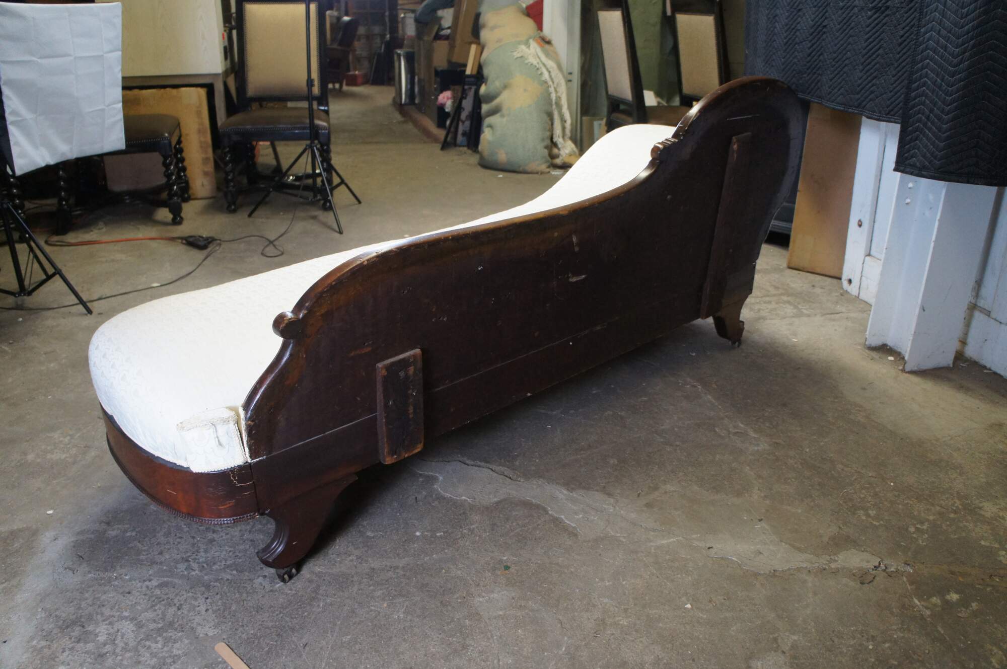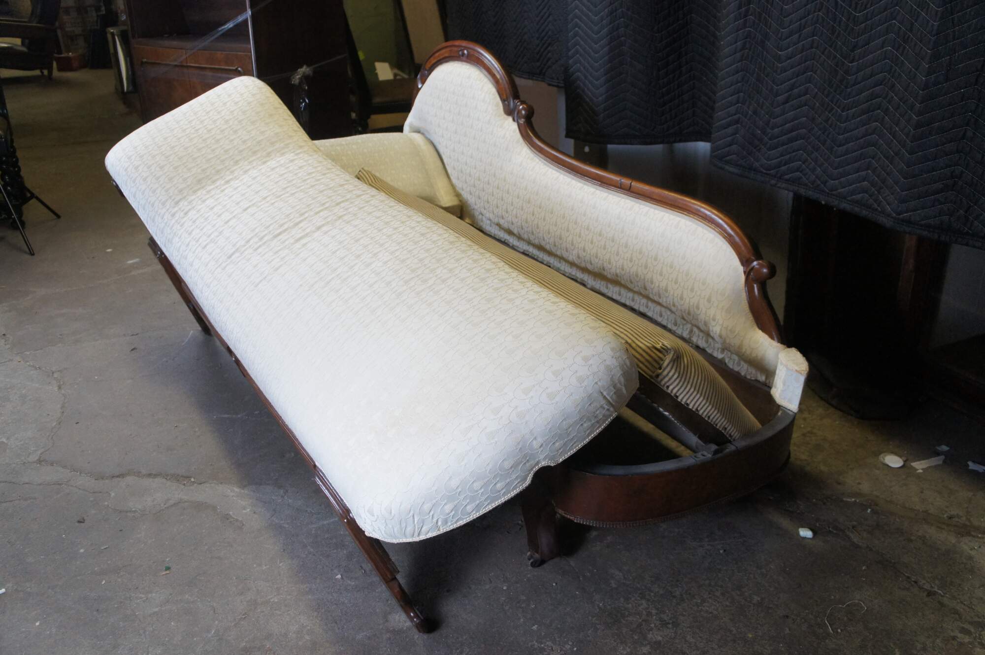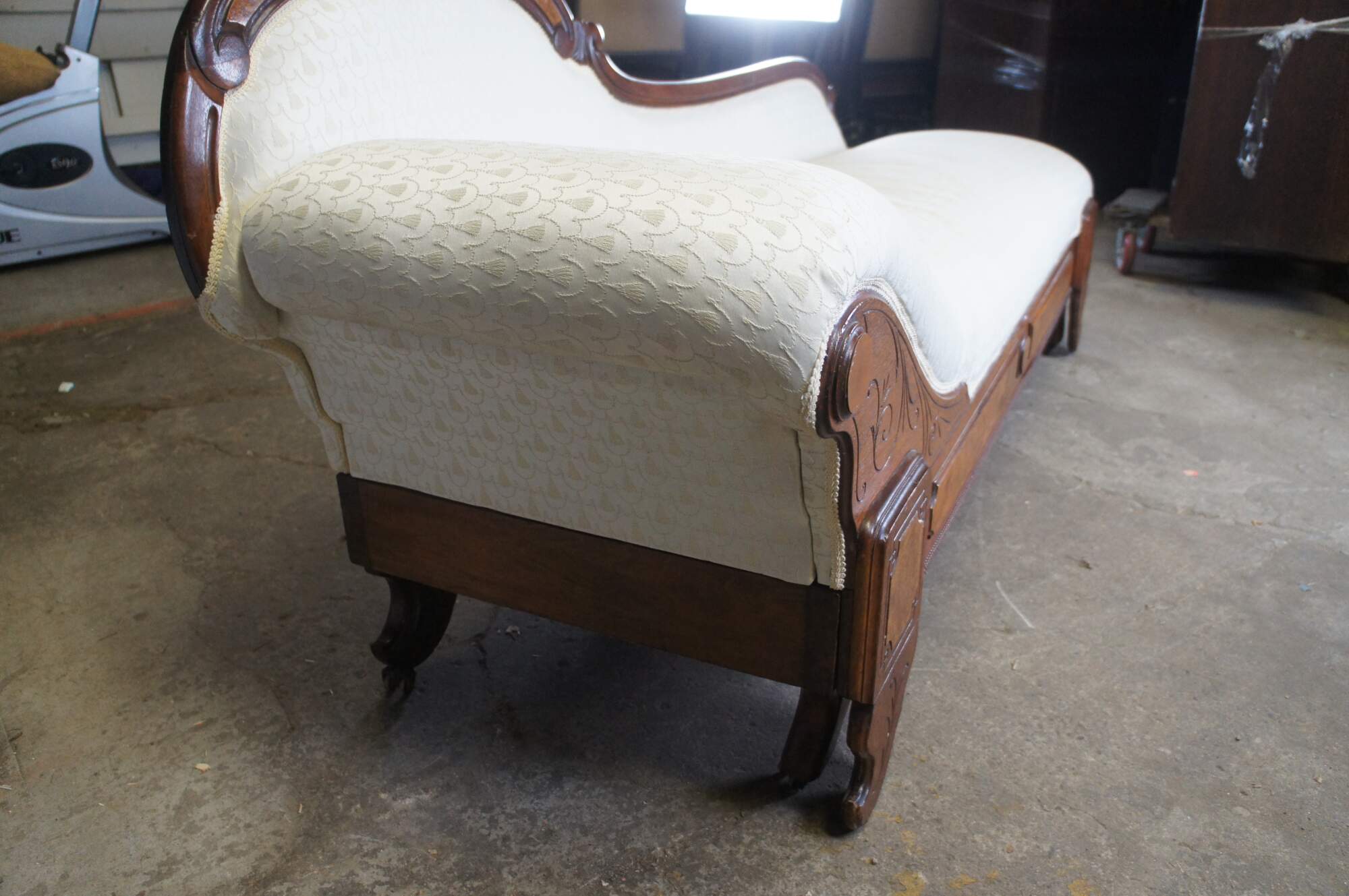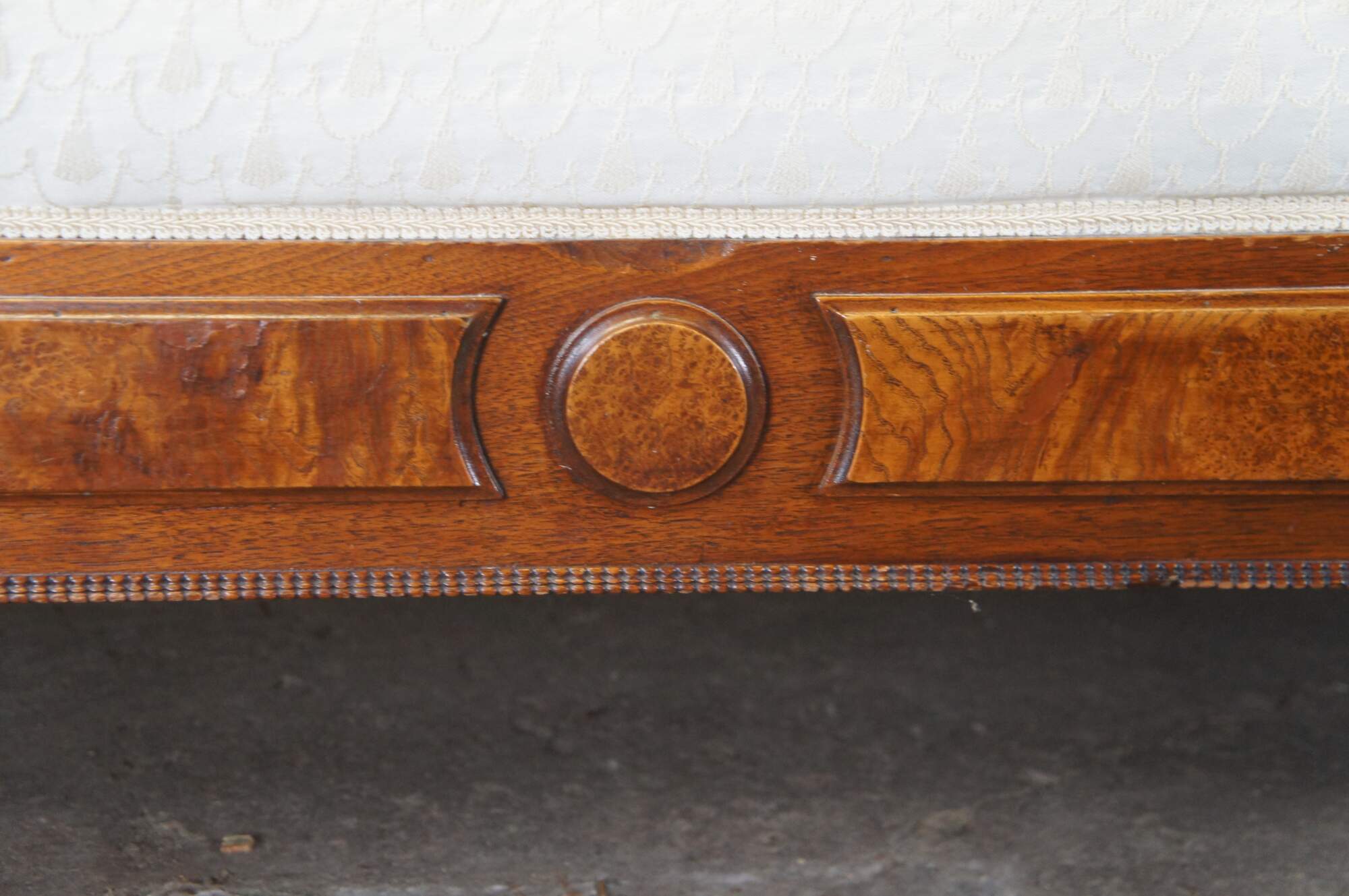 Antique Victorian Eastlake Fold Out Récamier / Chaise Lounge, circa 1870s. Features a walnut frame with burlwood panels, carved foliate and contoured back with 'C' and 'S' scrolled detail. Supported by carved and flared feet. The sofa has a unique mechanism that allows it to flip open for use as a sleeper or bed. A fun addition to any space.