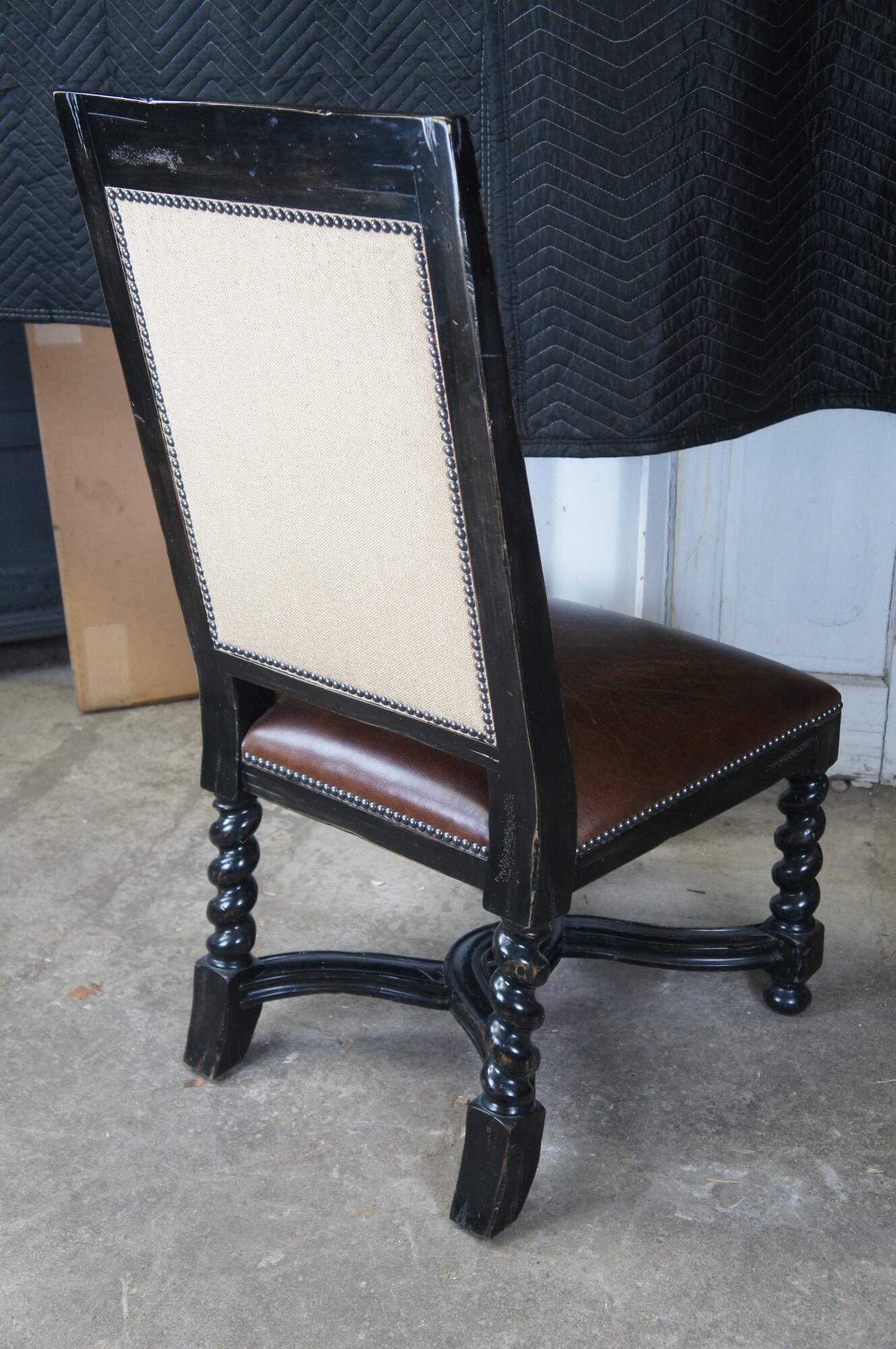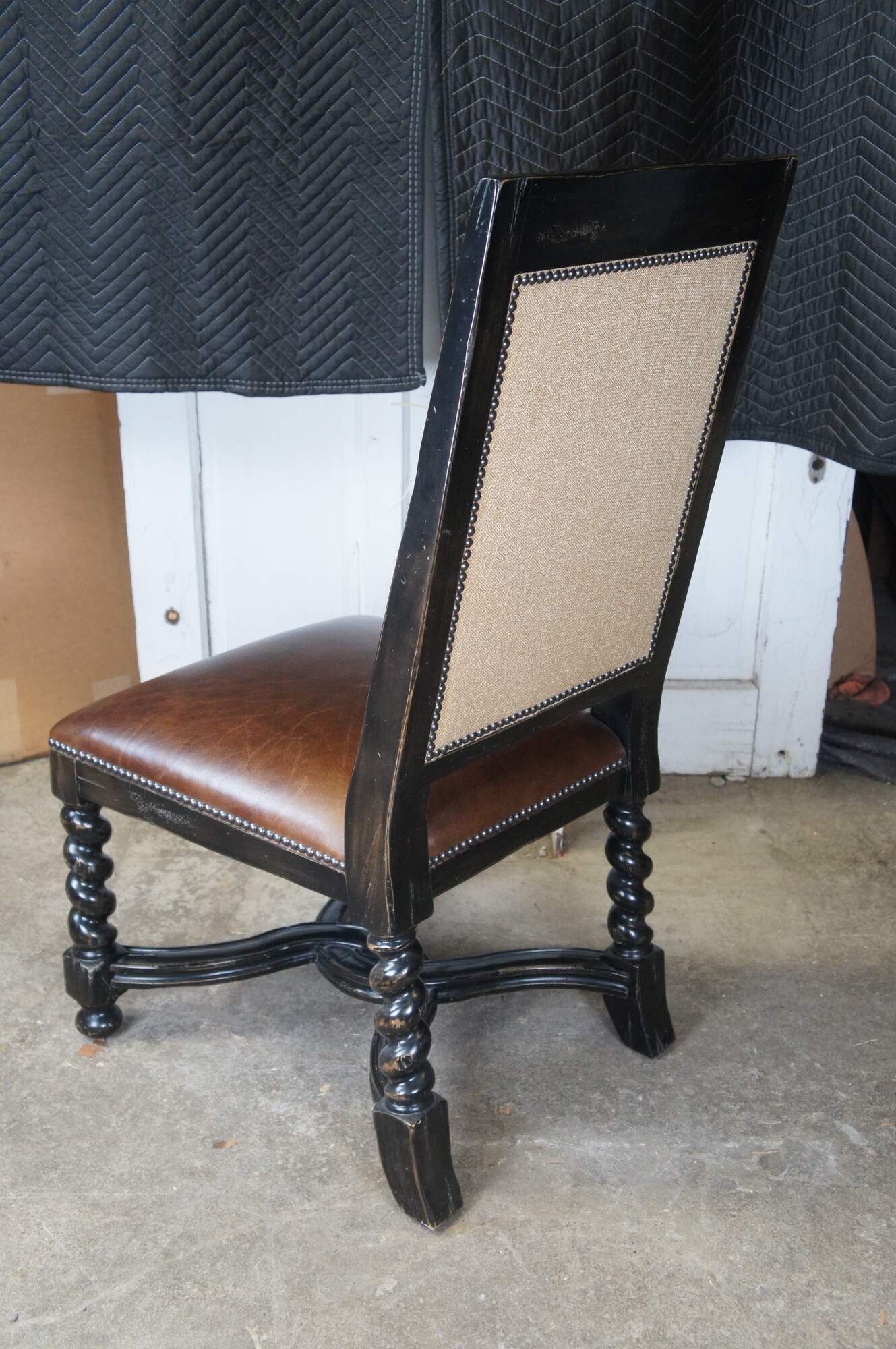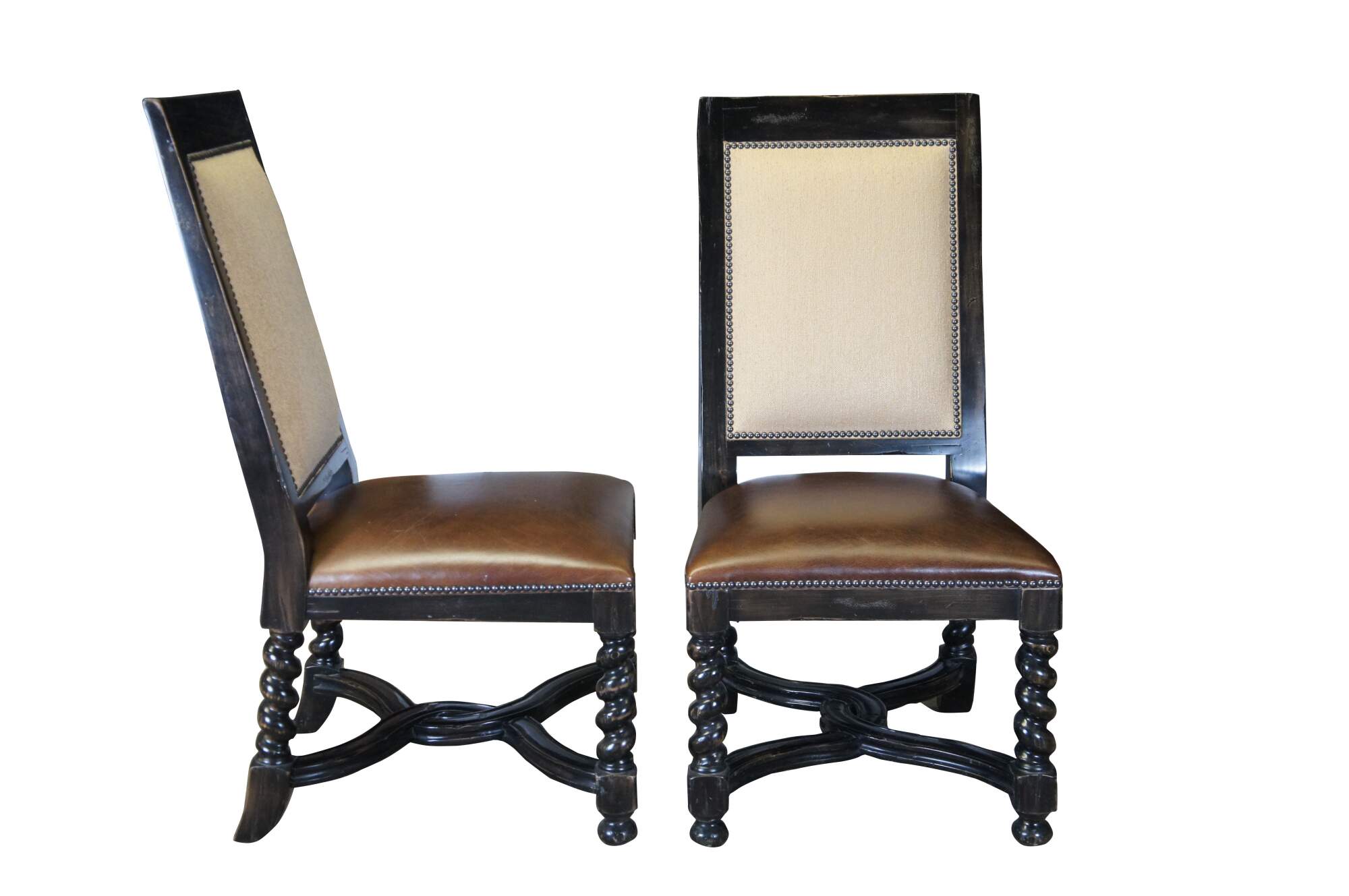 Late 20th century Lorts Manufacturing Renaissance Revival Dining Chairs. Features a naturally distressed dark brown hardwood frame with high rectangular back and barley twisted legs connected via an interlaced stretcher. The chairs are upholstered with a fabric back and leather seat. Both are trimmed in brass nailheads. Each is supported by bun feet along the front with square flared legs at the rear. Signed via tag along underside.