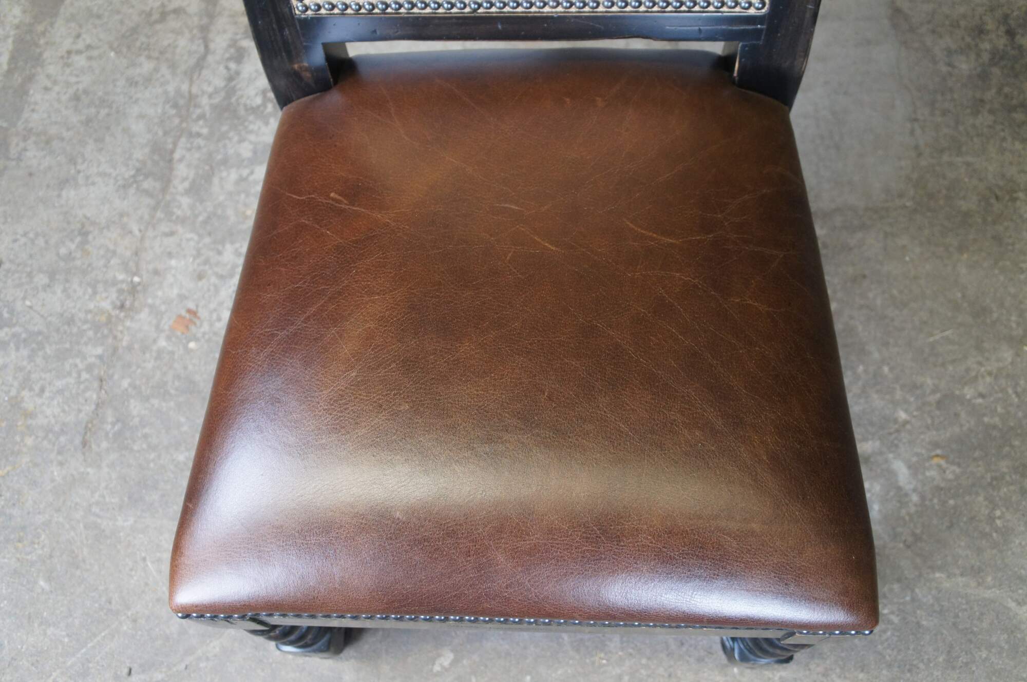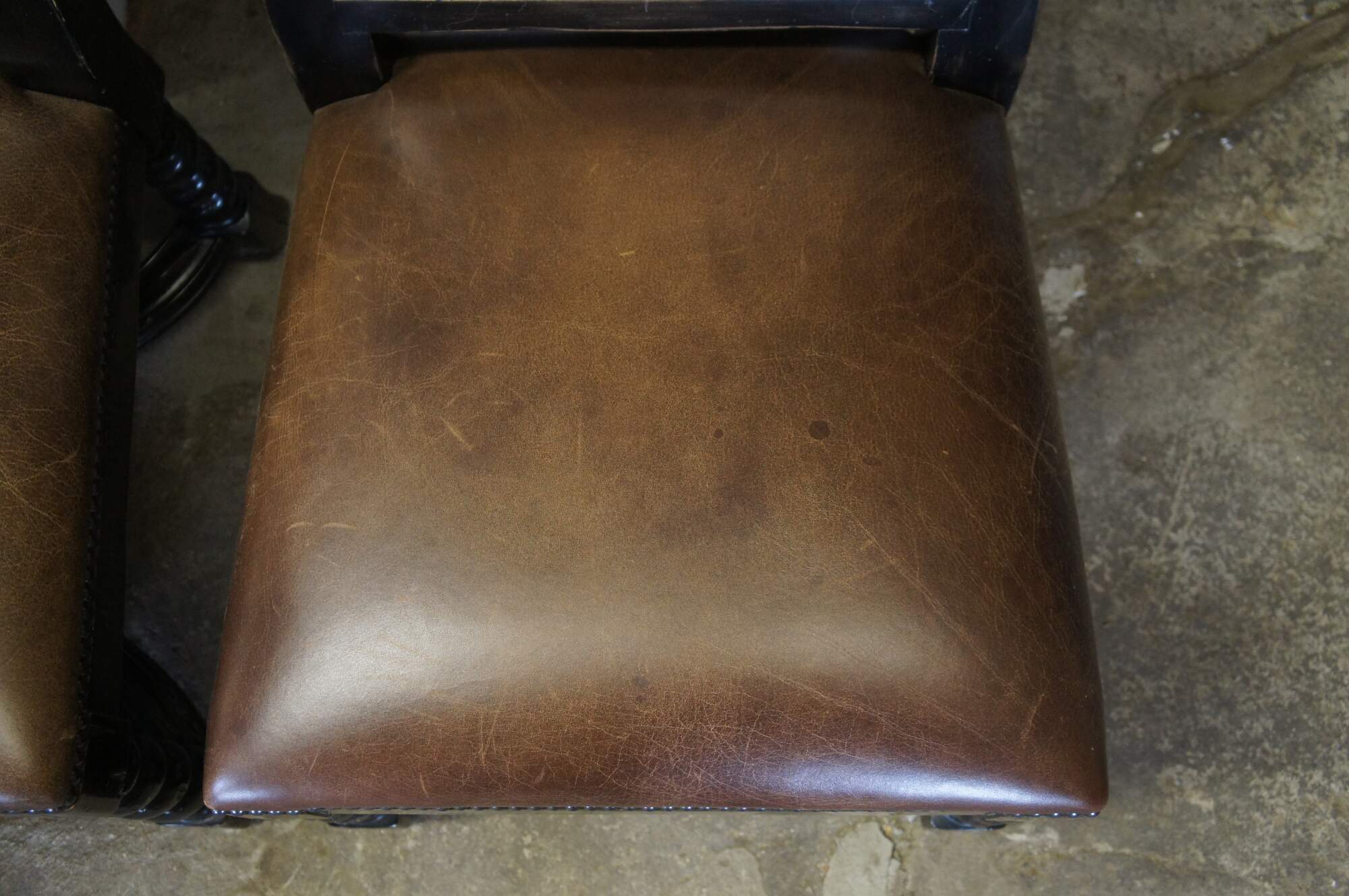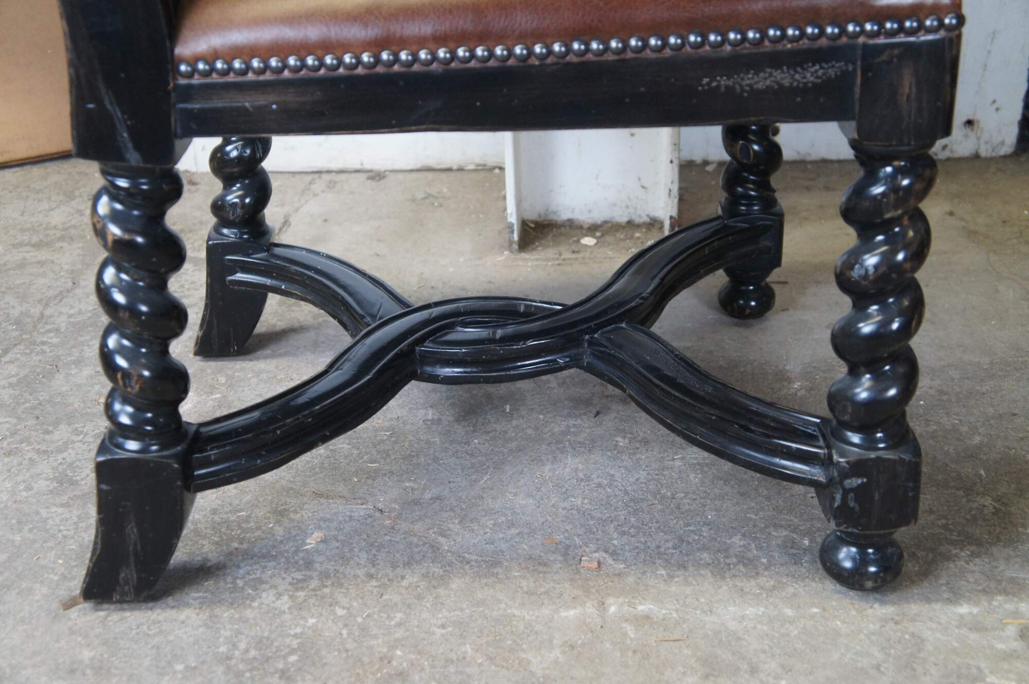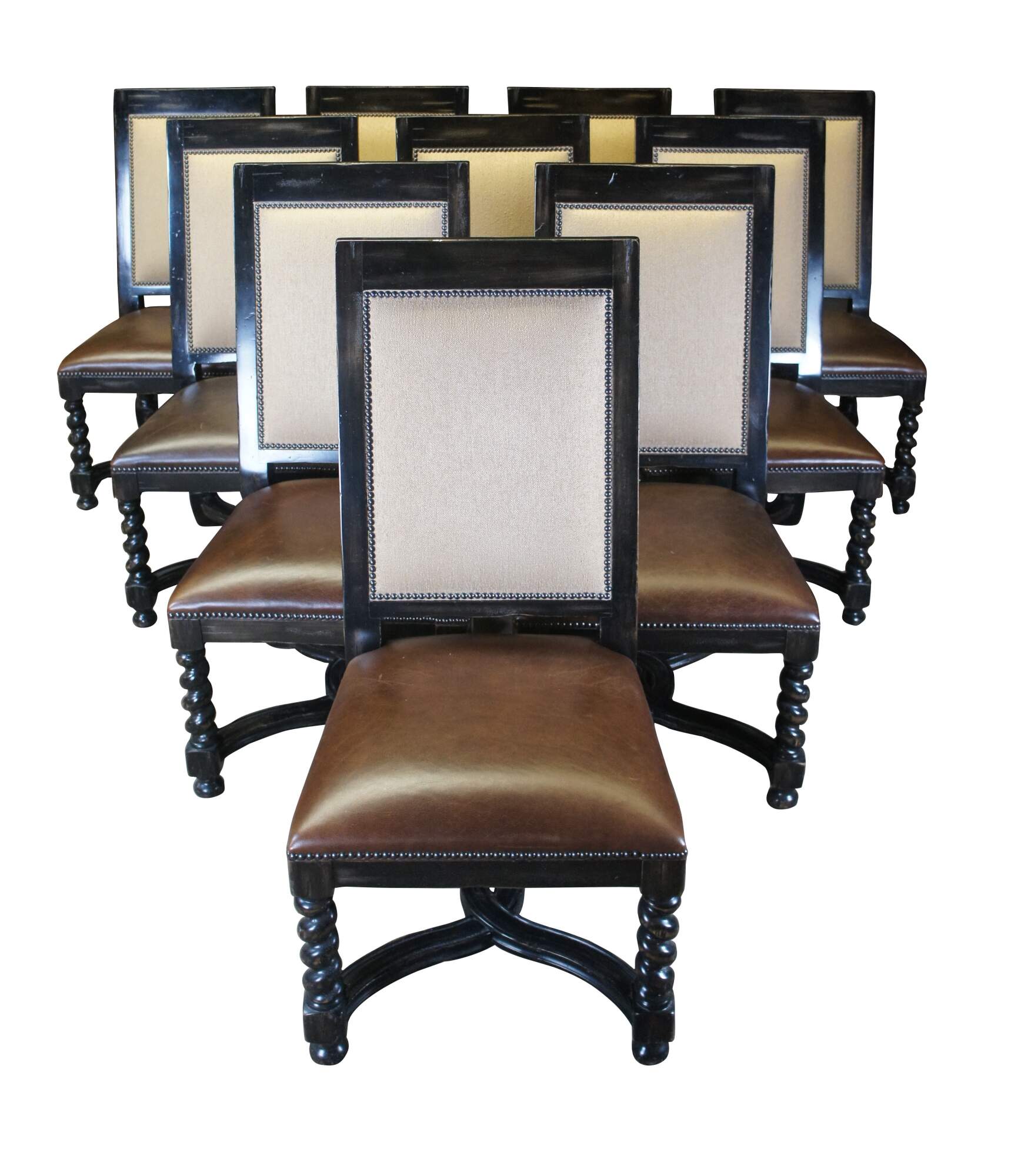 Late 20th century Lorts Manufacturing Renaissance Revival Dining Chairs. Features a naturally distressed dark brown hardwood frame with high rectangular back and barley twisted legs connected via an interlaced stretcher. The chairs are upholstered with a fabric back and leather seat. Both are trimmed in brass nailheads. Each is supported by bun feet along the front with square flared legs at the rear. Signed via tag along underside.