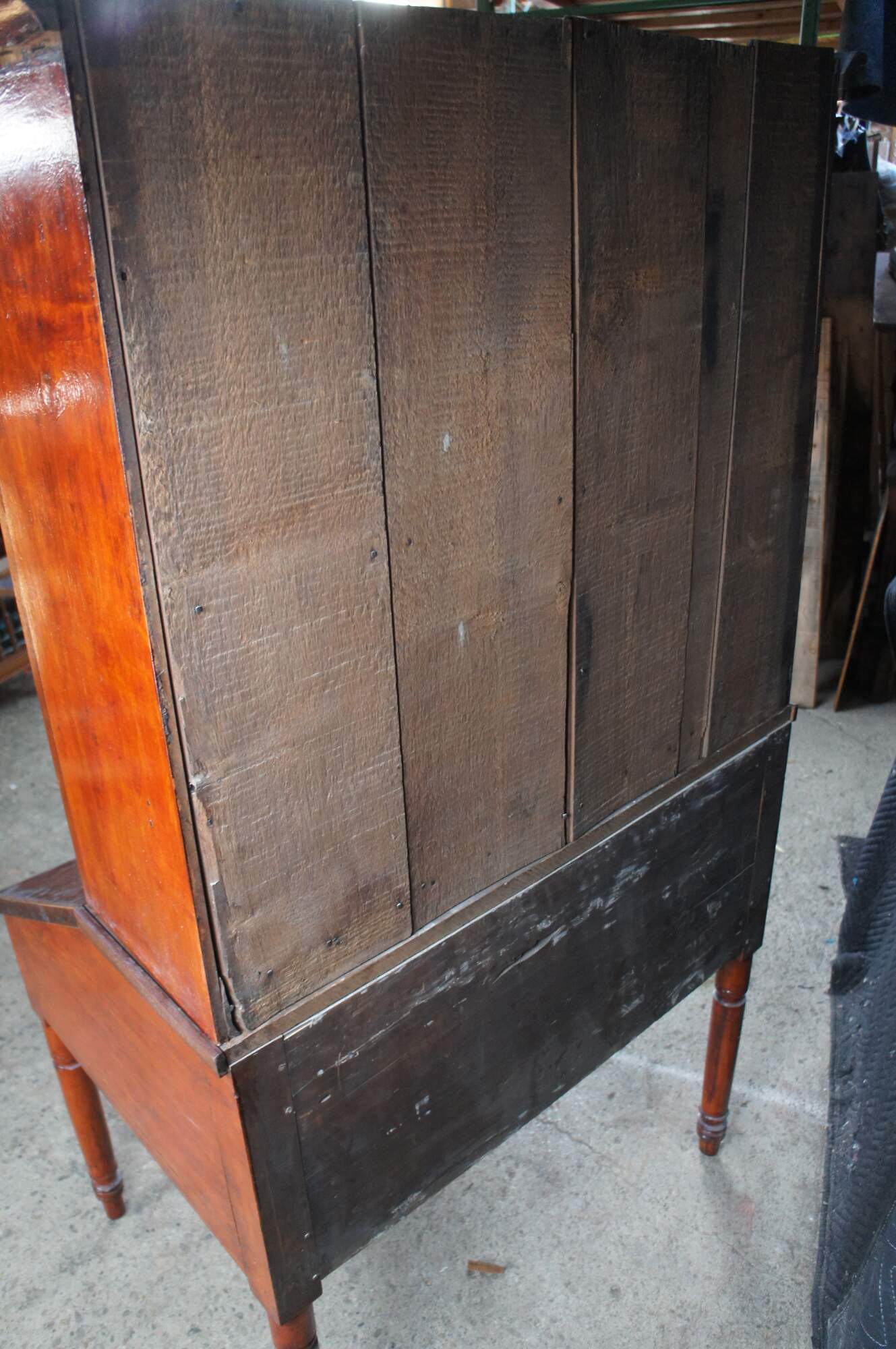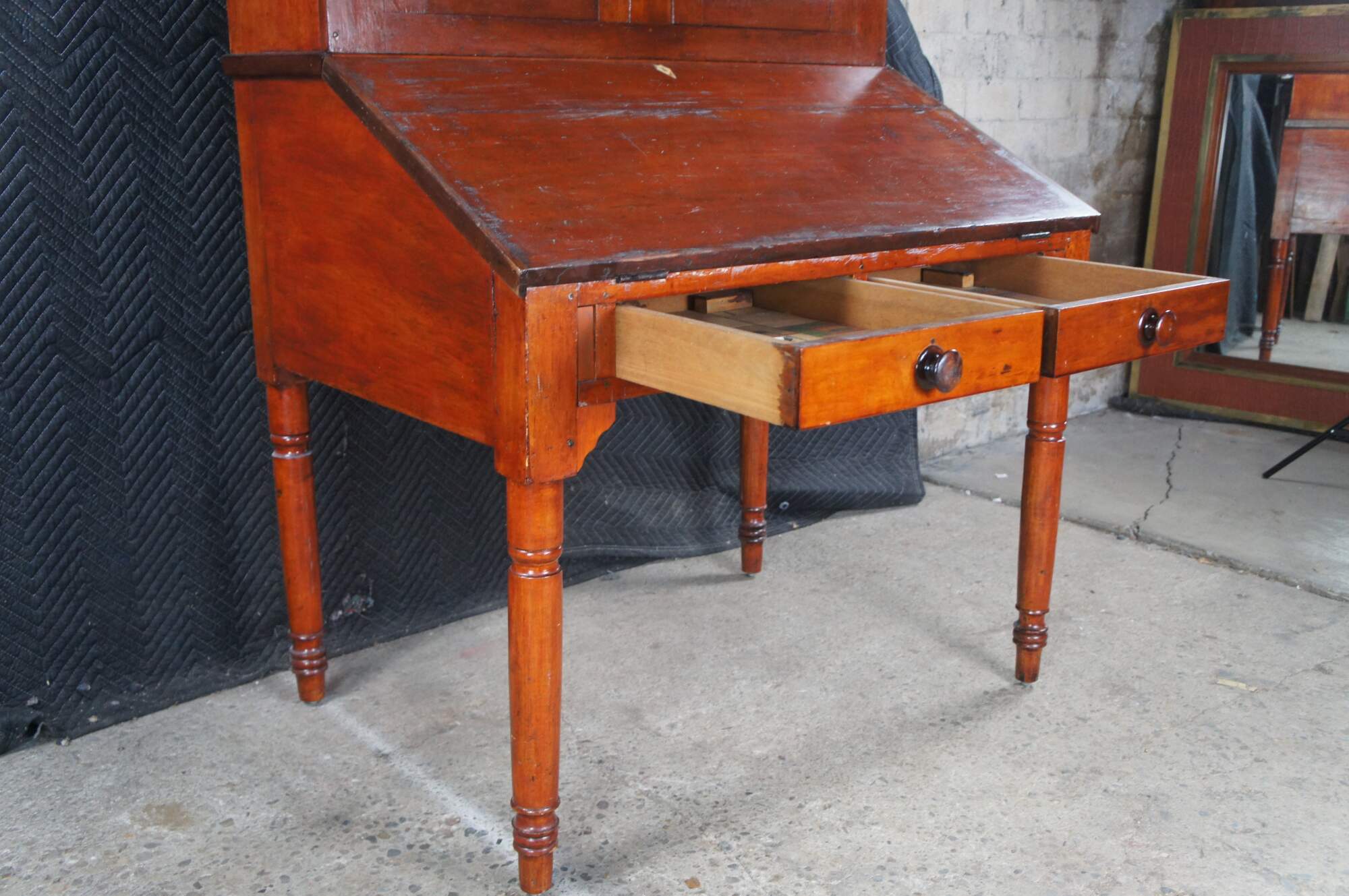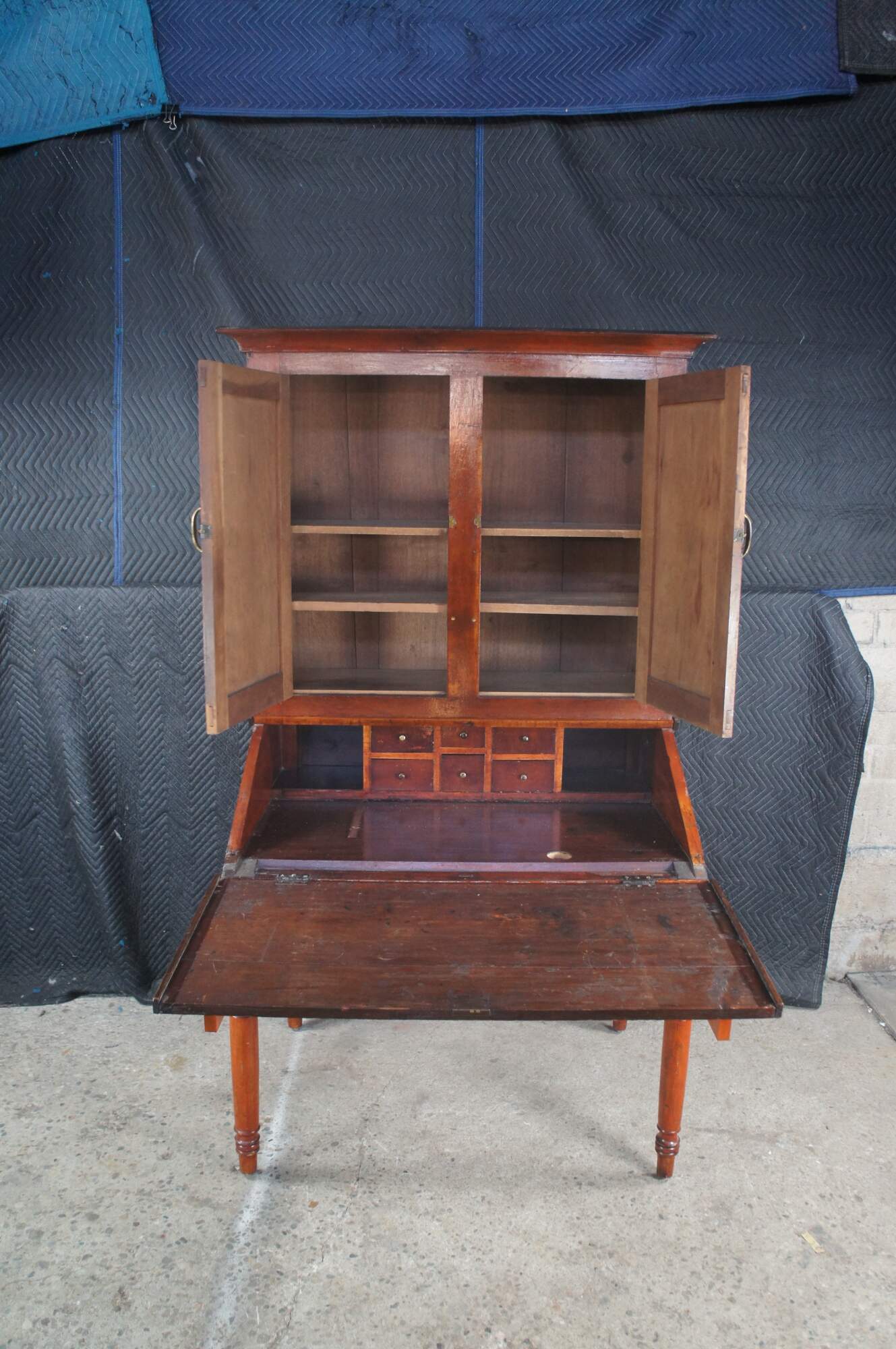 An exceptional mid to early 19th century primitive American Plantation writing desk / hutch / cupboard / cabinet. Made cherry finished Pine and Poplar featuring two piece construction with upper bookshelf cabinet supported by a lower drop front secretary with long turned legs and two drawers. The secretary opens to a large work area with multiple drawers and cubbies, a spot for your inkwell, and a very nicely concealed secret hidden compartment below the drawers.