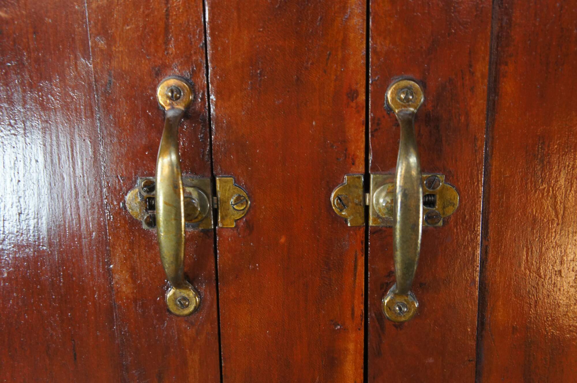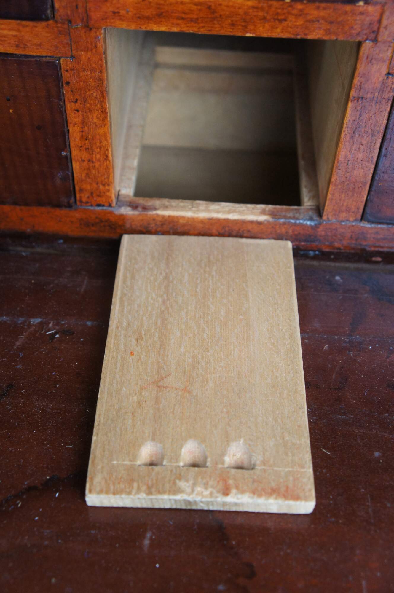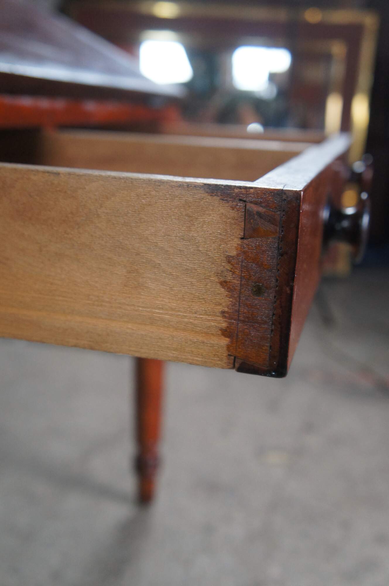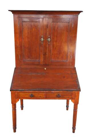 An exceptional mid to early 19th century primitive American Plantation writing desk / hutch / cupboard / cabinet. Made cherry finished Pine and Poplar featuring two piece construction with upper bookshelf cabinet supported by a lower drop front secretary with long turned legs and two drawers. The secretary opens to a large work area with multiple drawers and cubbies, a spot for your inkwell, and a very nicely concealed secret hidden compartment below the drawers.