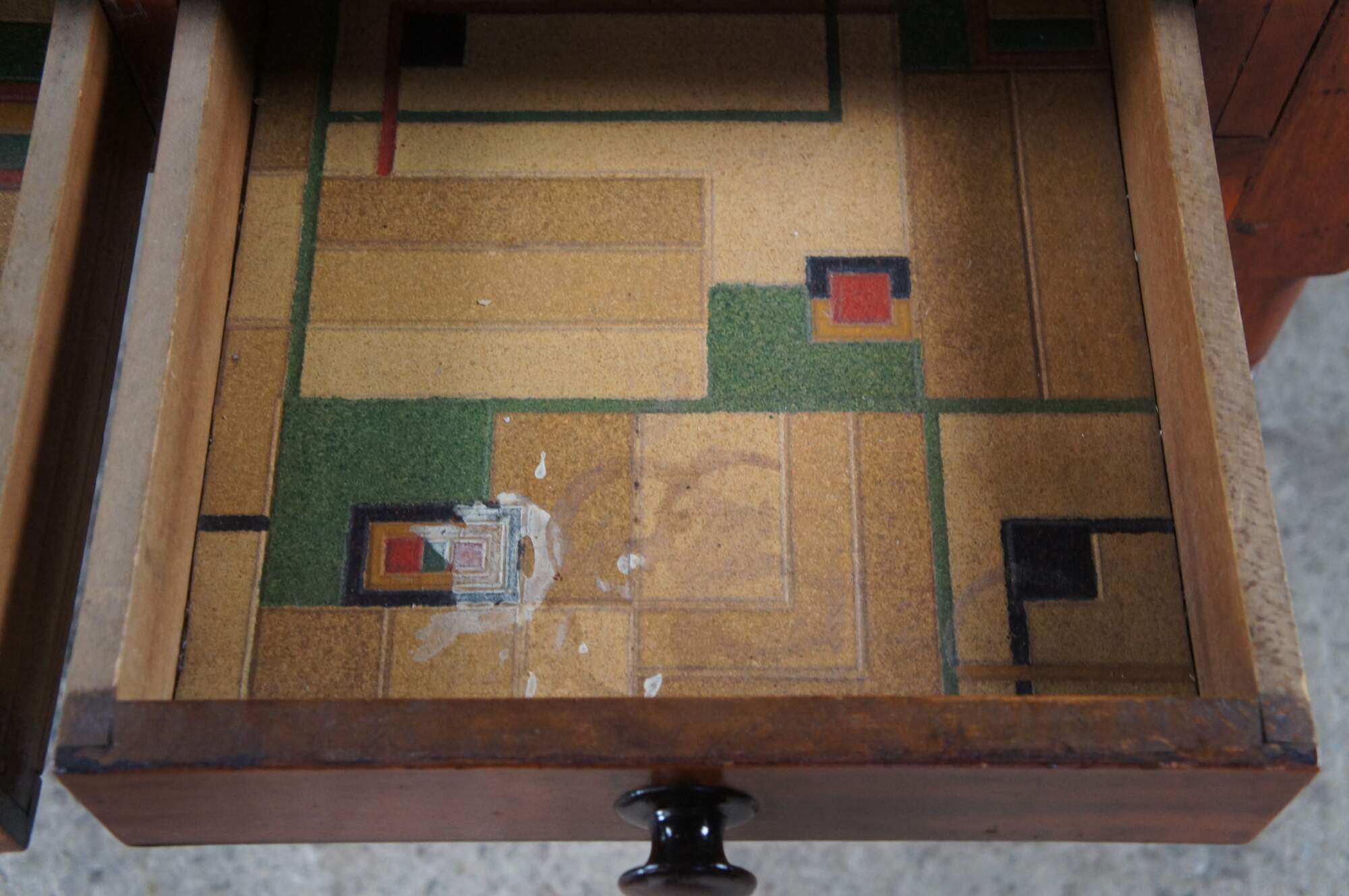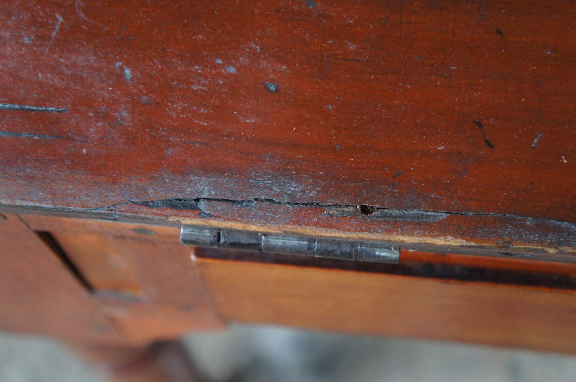 Structurally solid, wear and distressing from age and use, splitting, finish loss, staining, fading, hole bored for inkwell, secretary supports replaced at some point, missing trim upper right gallery, corner / edge wear, no key.
