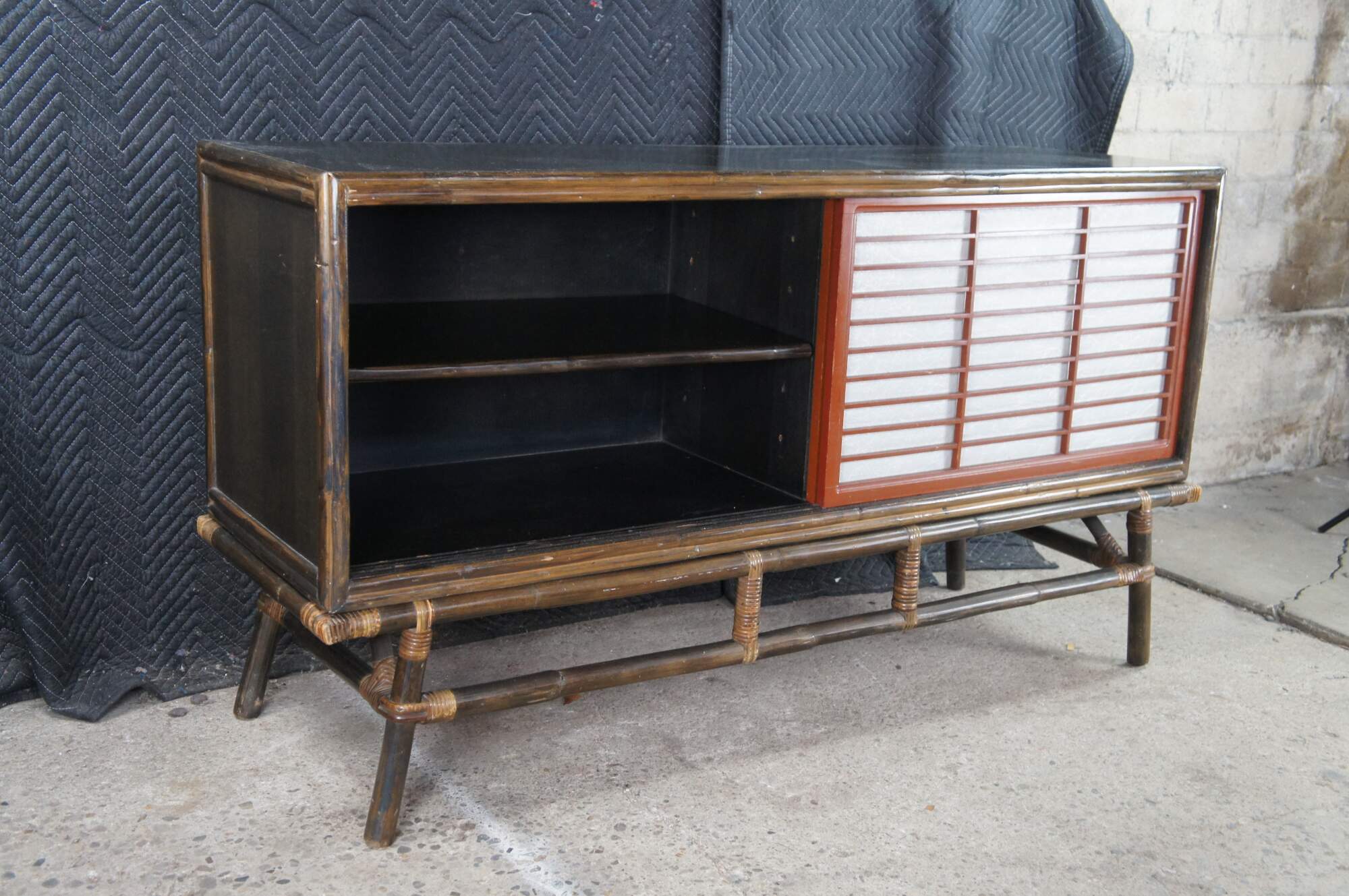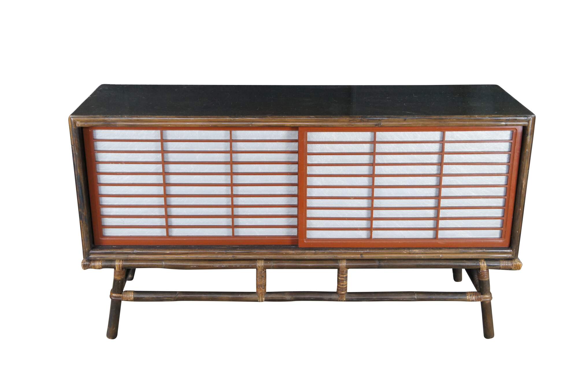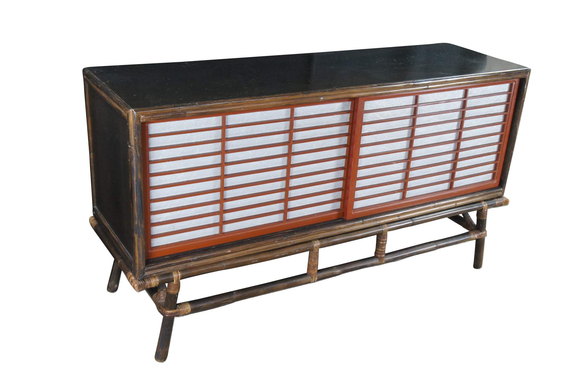 Mid Century Modern Ficks Reed Far Horizons Collection Hollywood Regency Chinoiserie Credenza, Circa 1958. The credenza features a gorgeous oak case with woven rattan base and Japanese-inspired sliding doors. Opens to a large interior for storage with a shelf on each side.