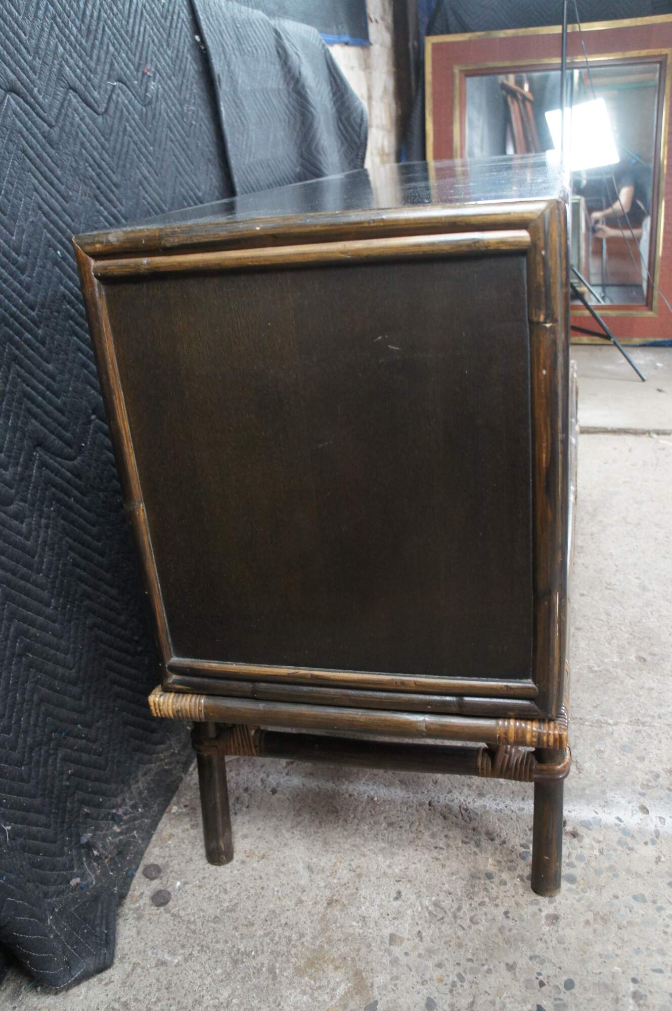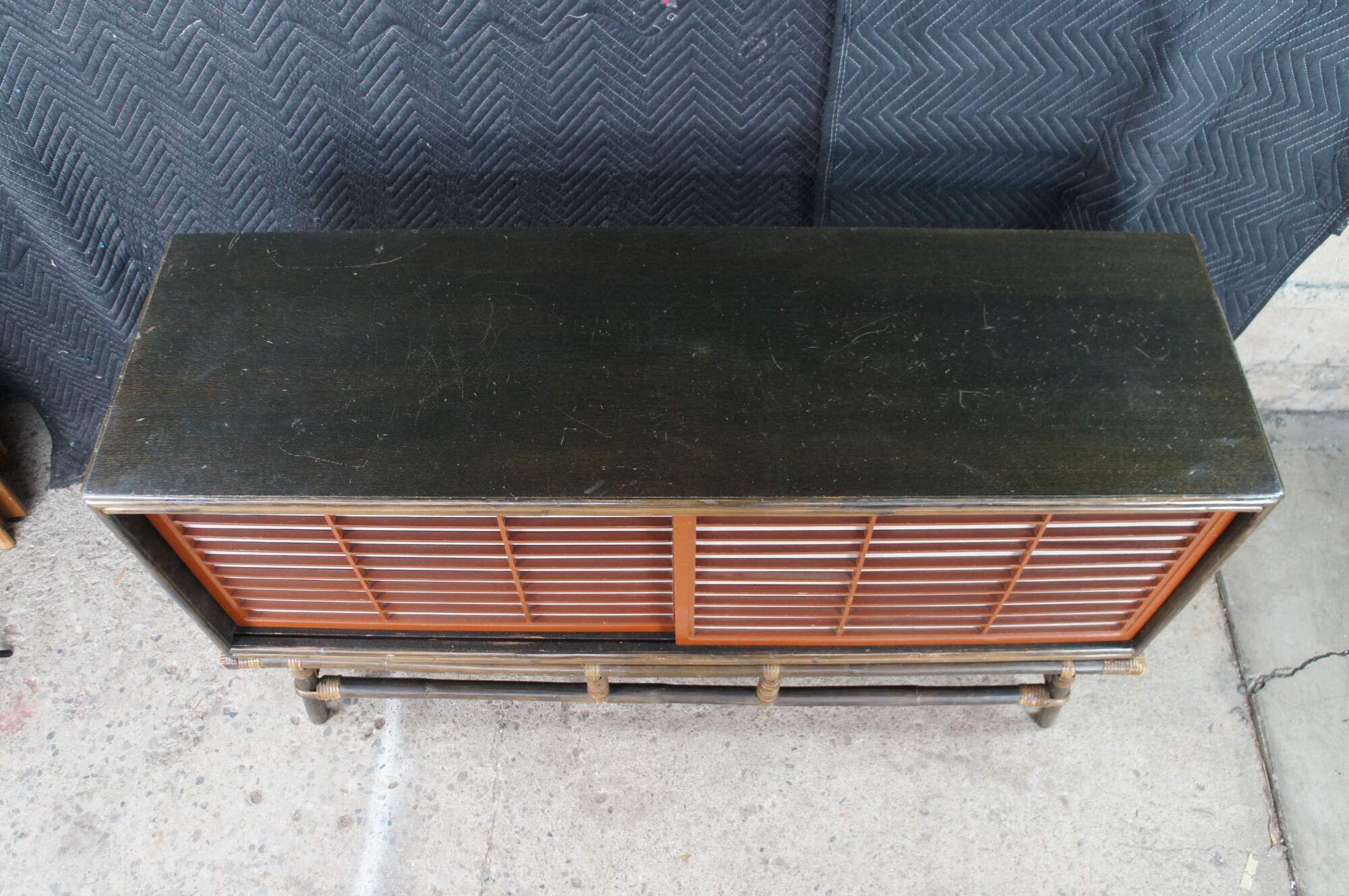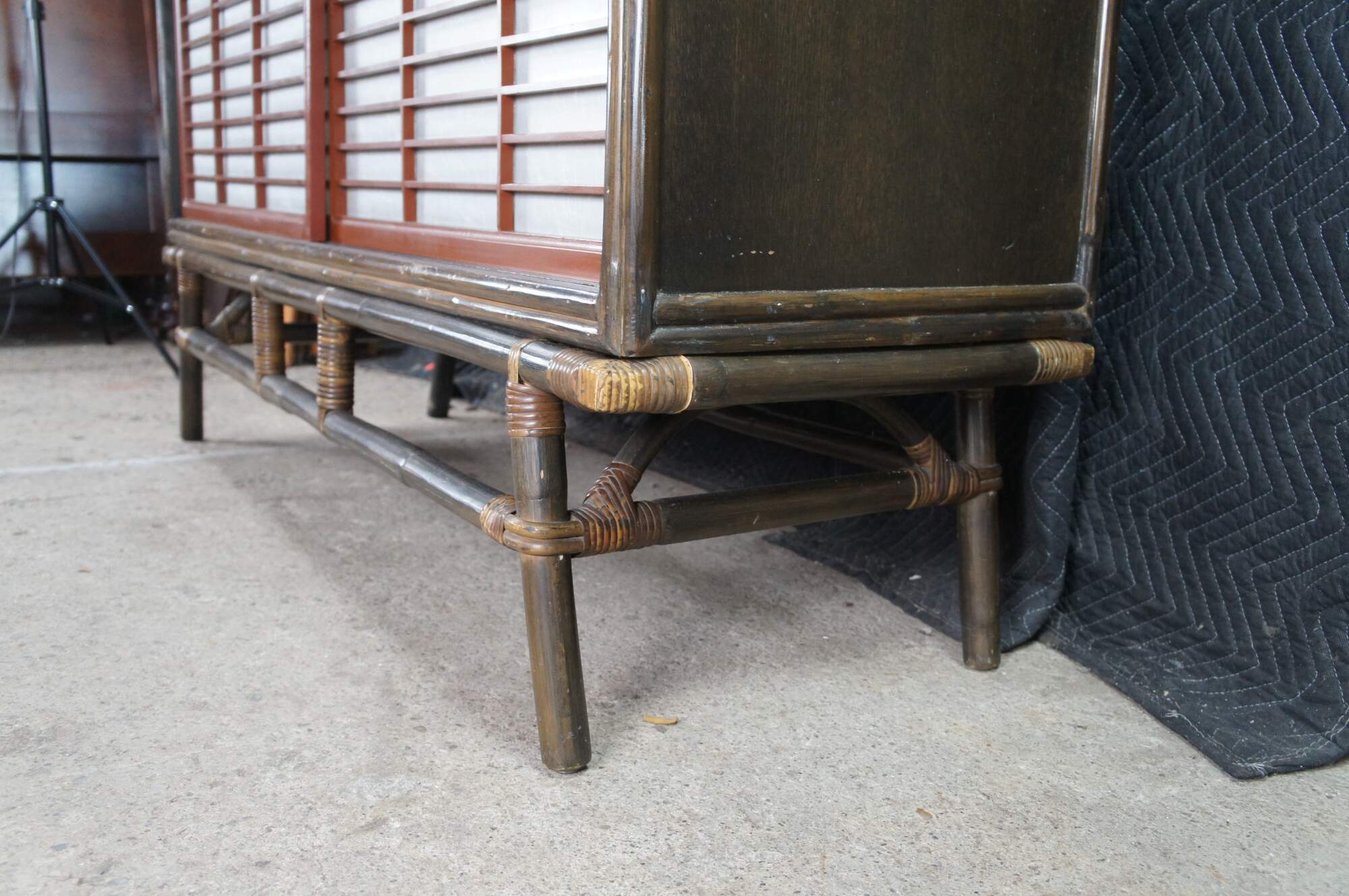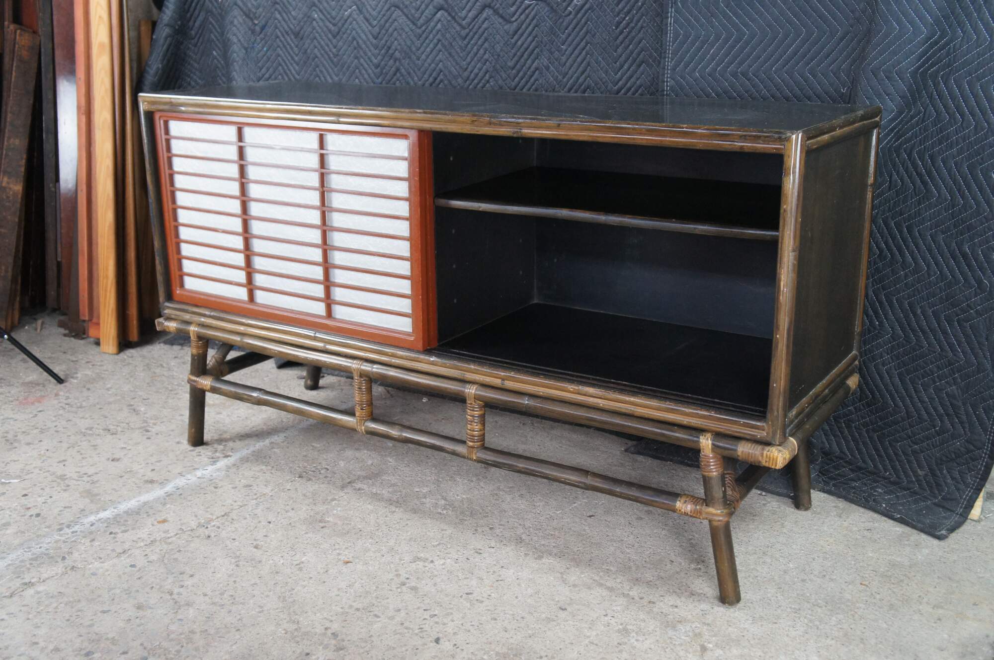 Mid Century Modern Ficks Reed Far Horizons Collection Hollywood Regency Chinoiserie Credenza, Circa 1958. The credenza features a gorgeous oak case with woven rattan base and Japanese-inspired sliding doors. Opens to a large interior for storage with a shelf on each side.