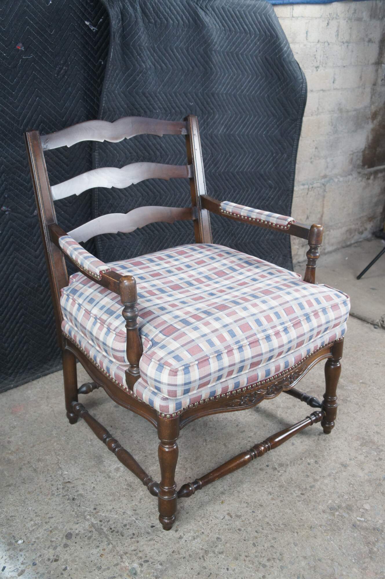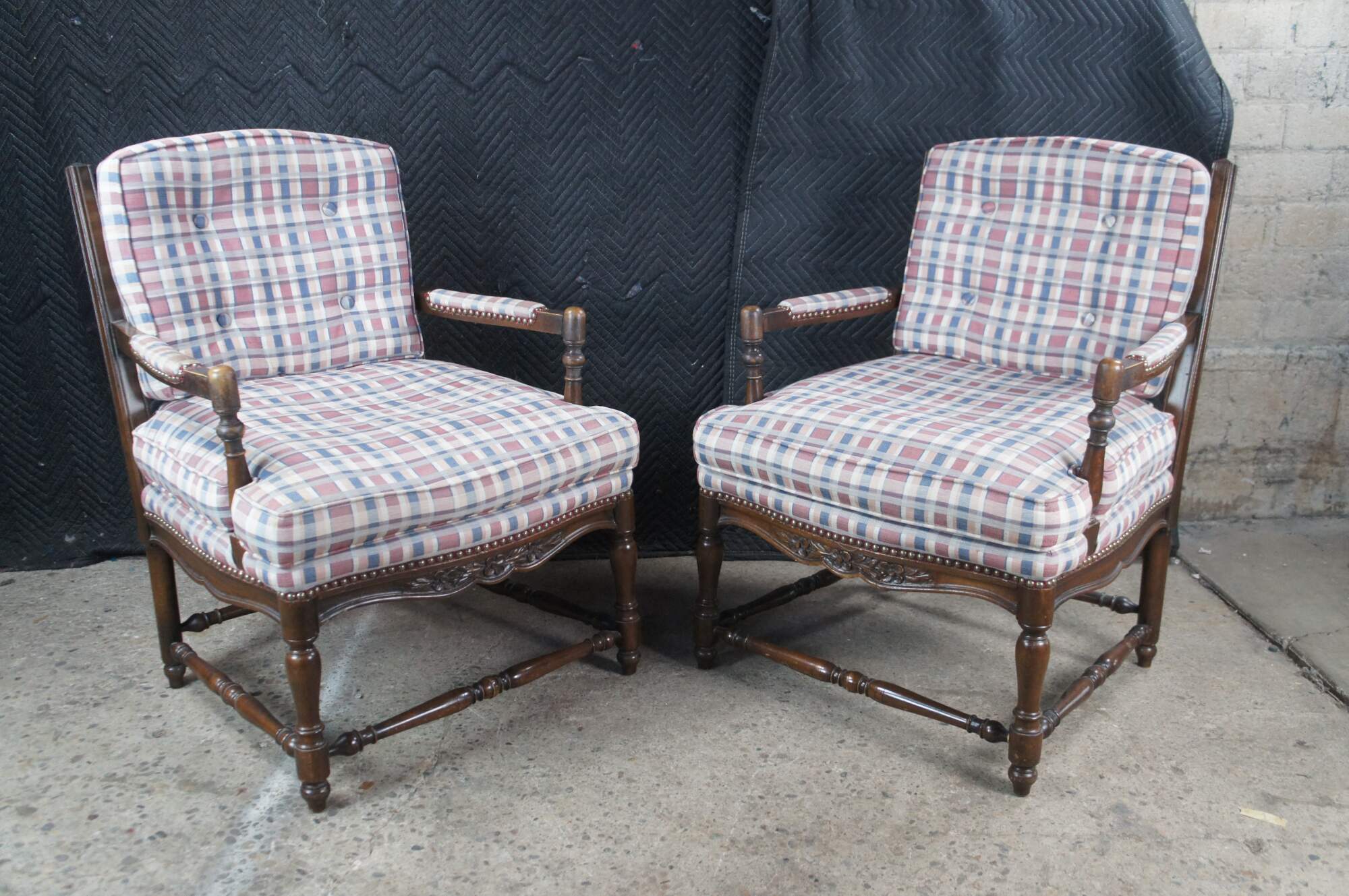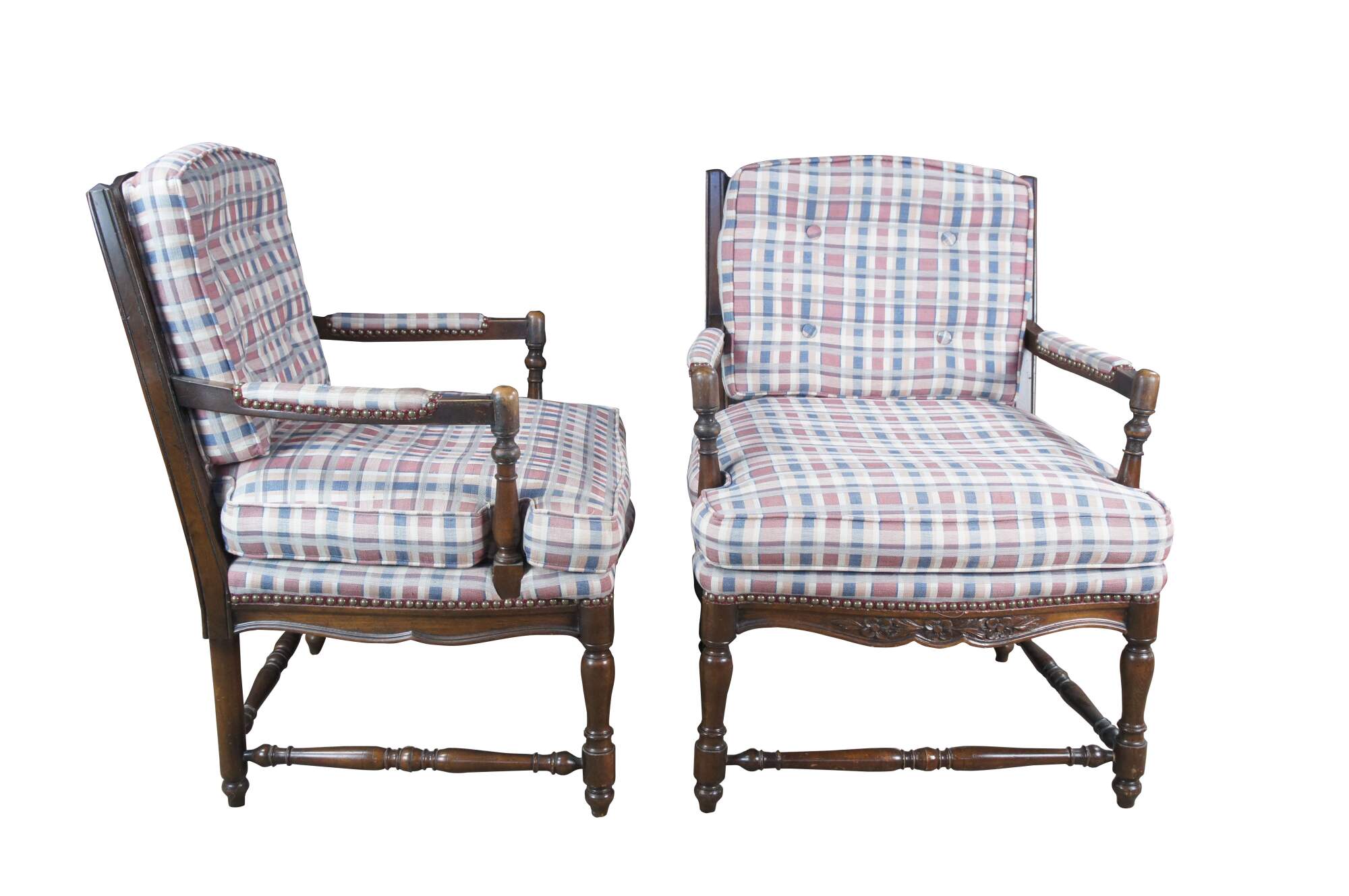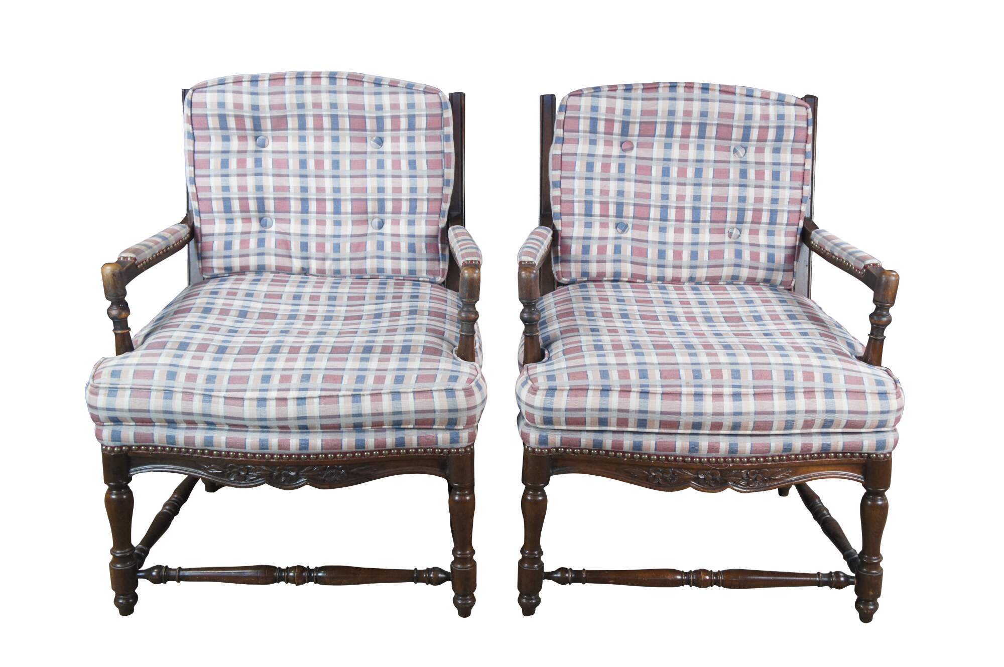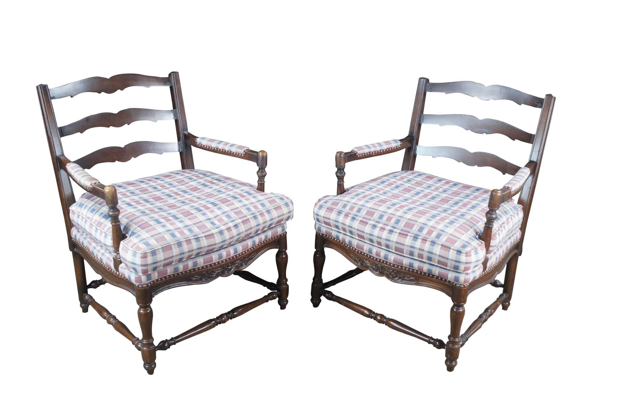 Two vintage French Country style arm chairs. Made of walnut featuring a ladderback design with carved floral and turned accents, plaid tufted upholstery and nailhead trim.