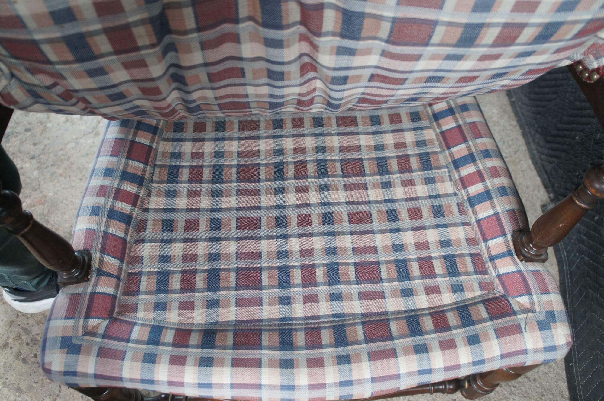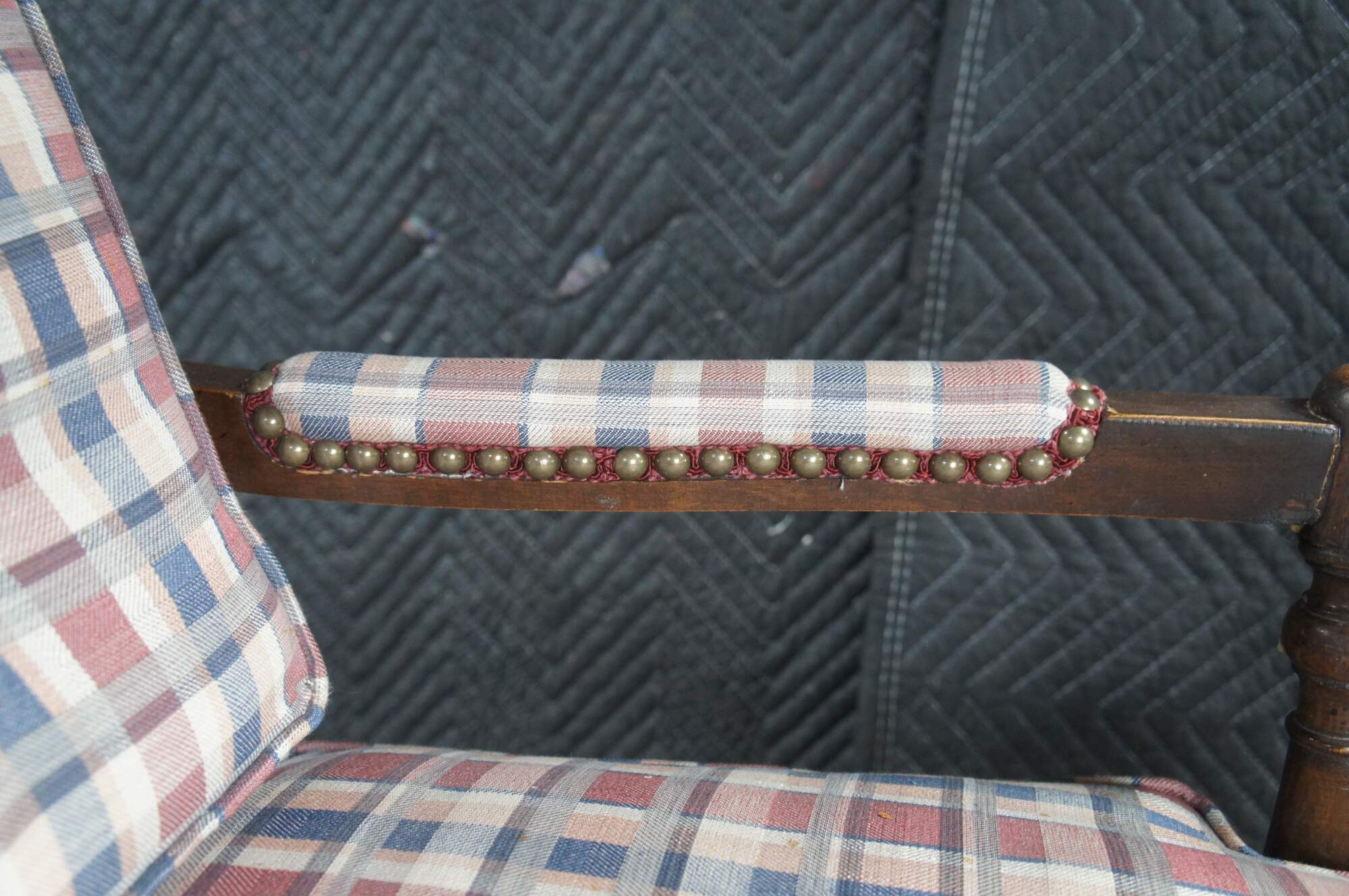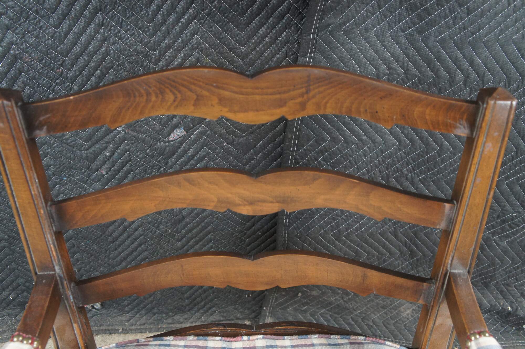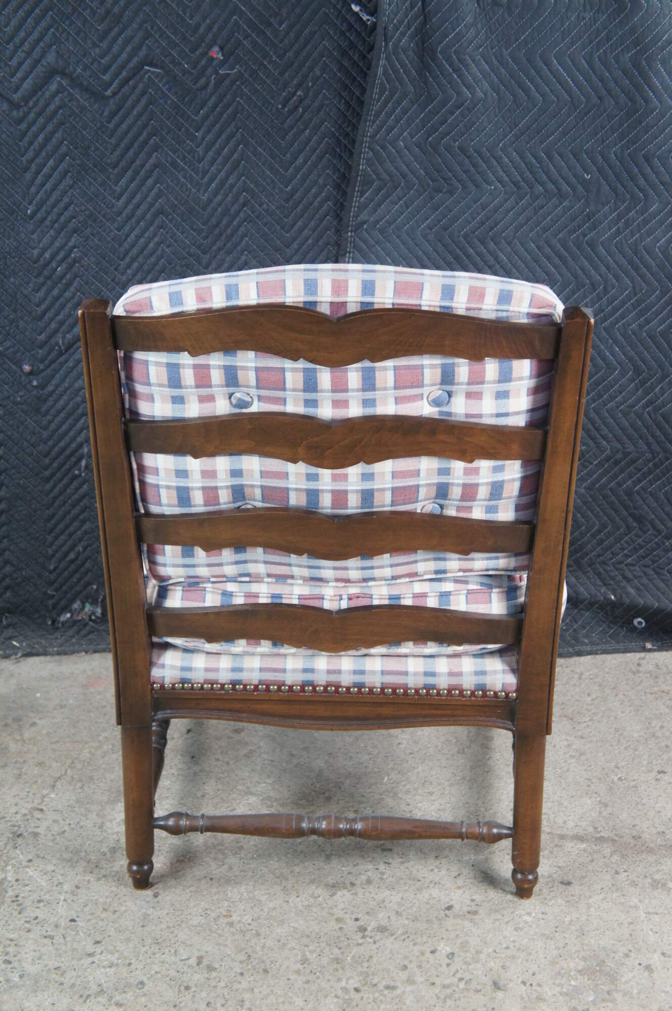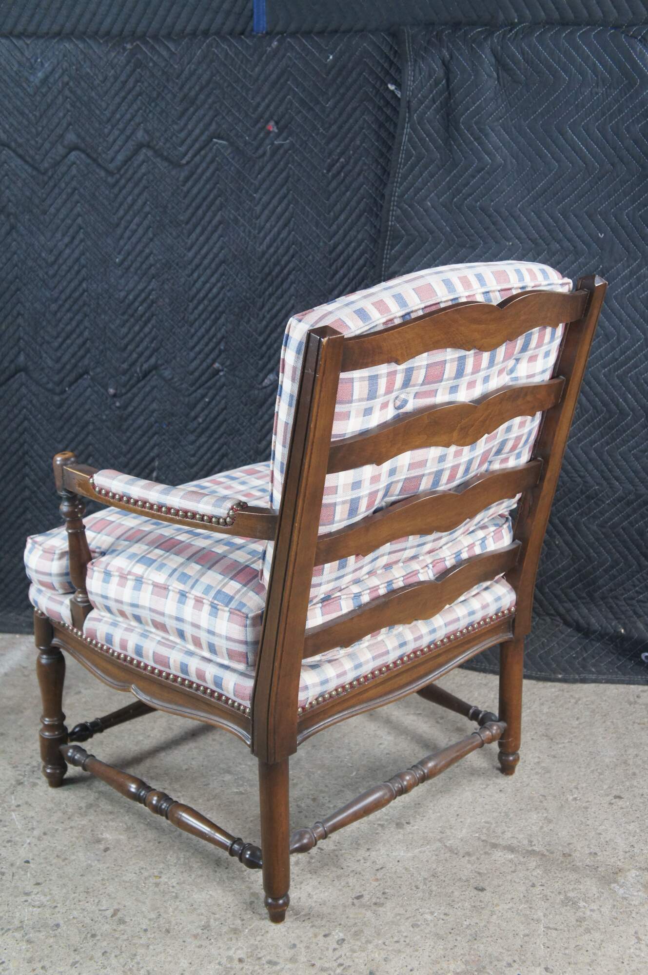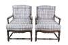 Two vintage French Country style arm chairs. Made of walnut featuring a ladderback design with carved floral and turned accents, plaid tufted upholstery and nailhead trim.