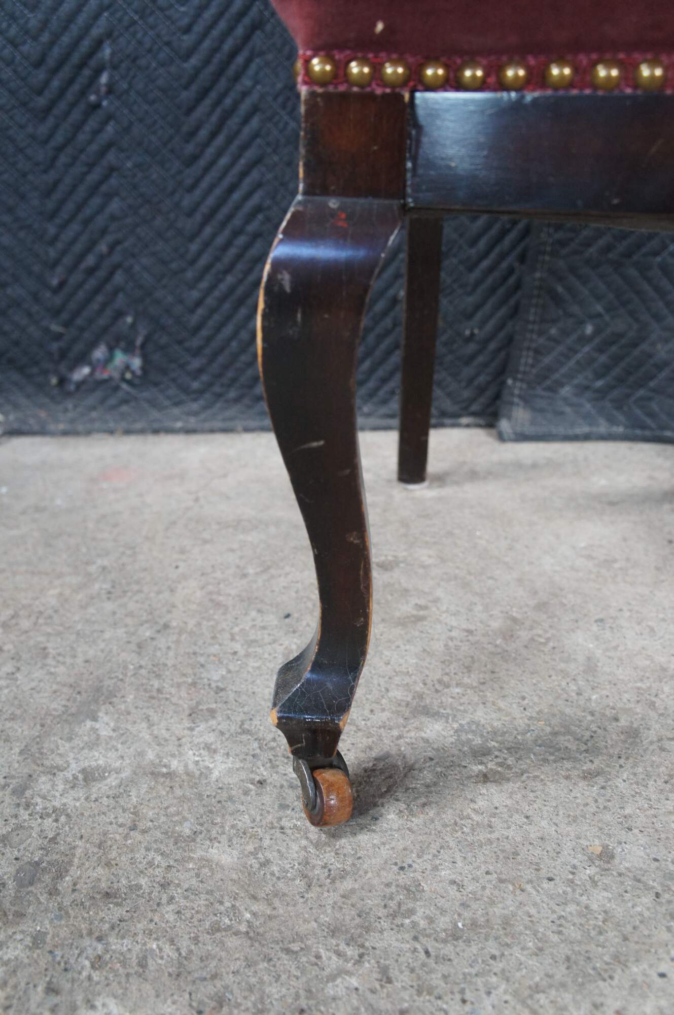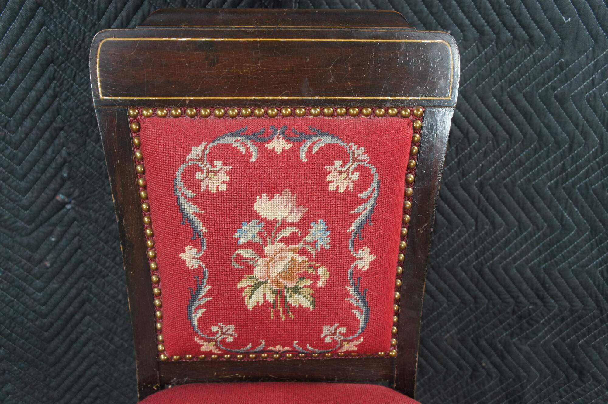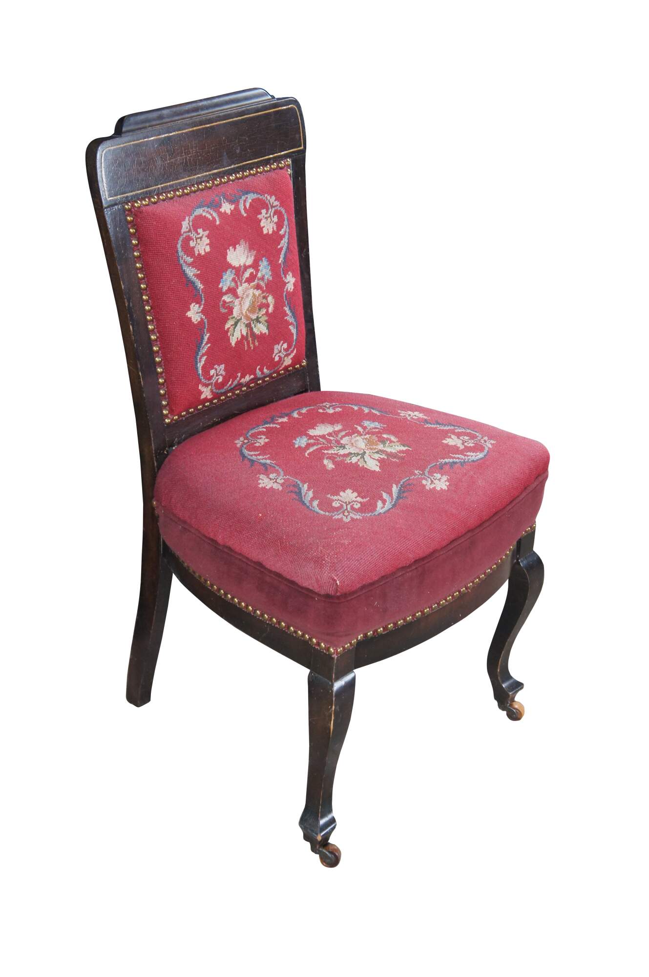 Antique English Edwardian vanity / desk / parlor side chair. Made of mahogany featuring a Neoclassical floral needlepoint design with nailhead trim and serpentine front legs with castors.