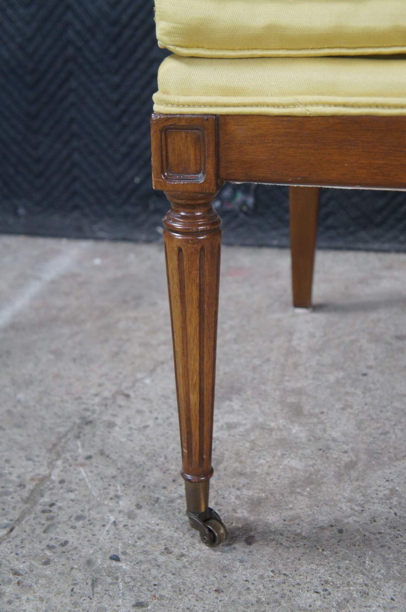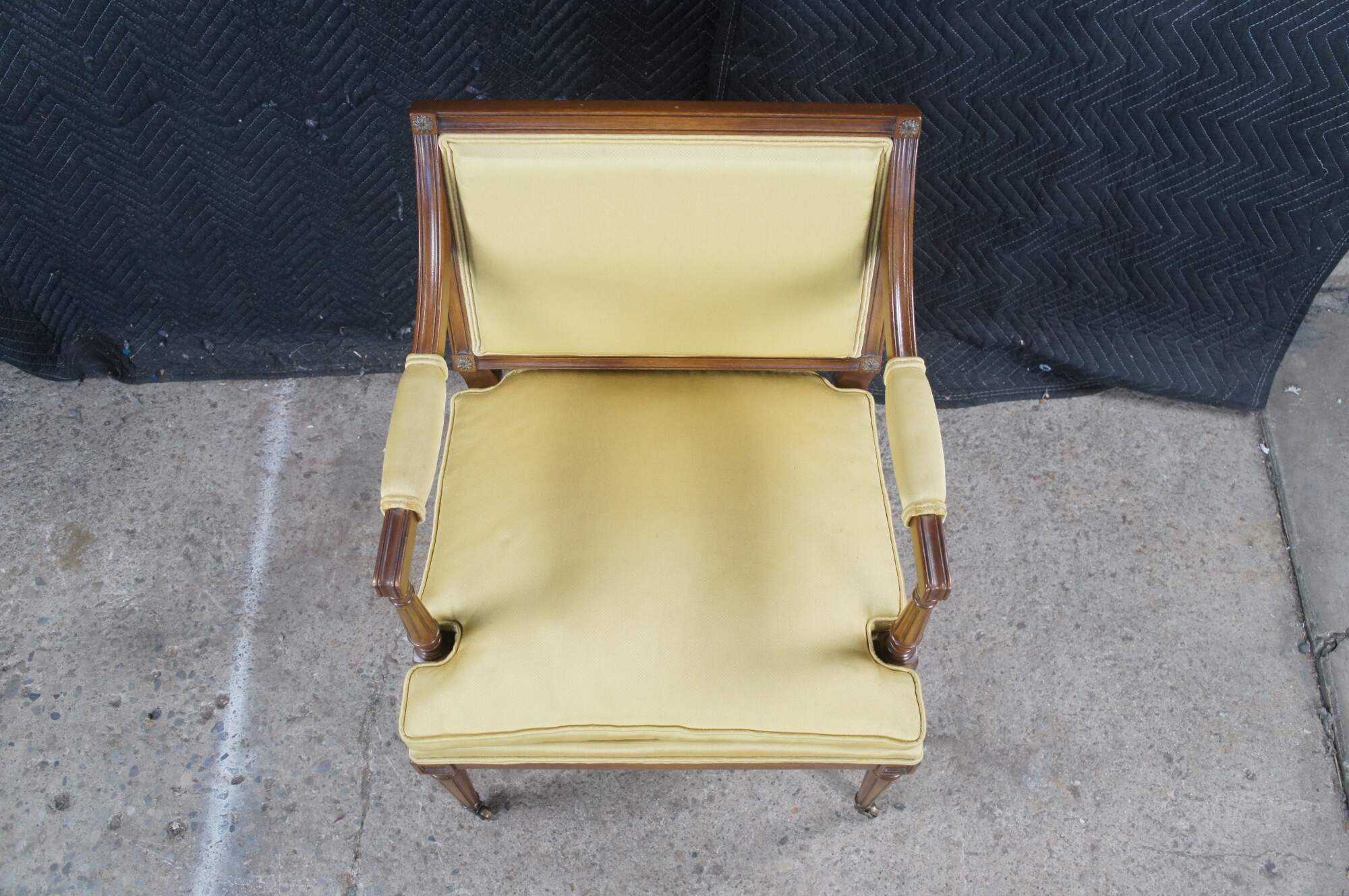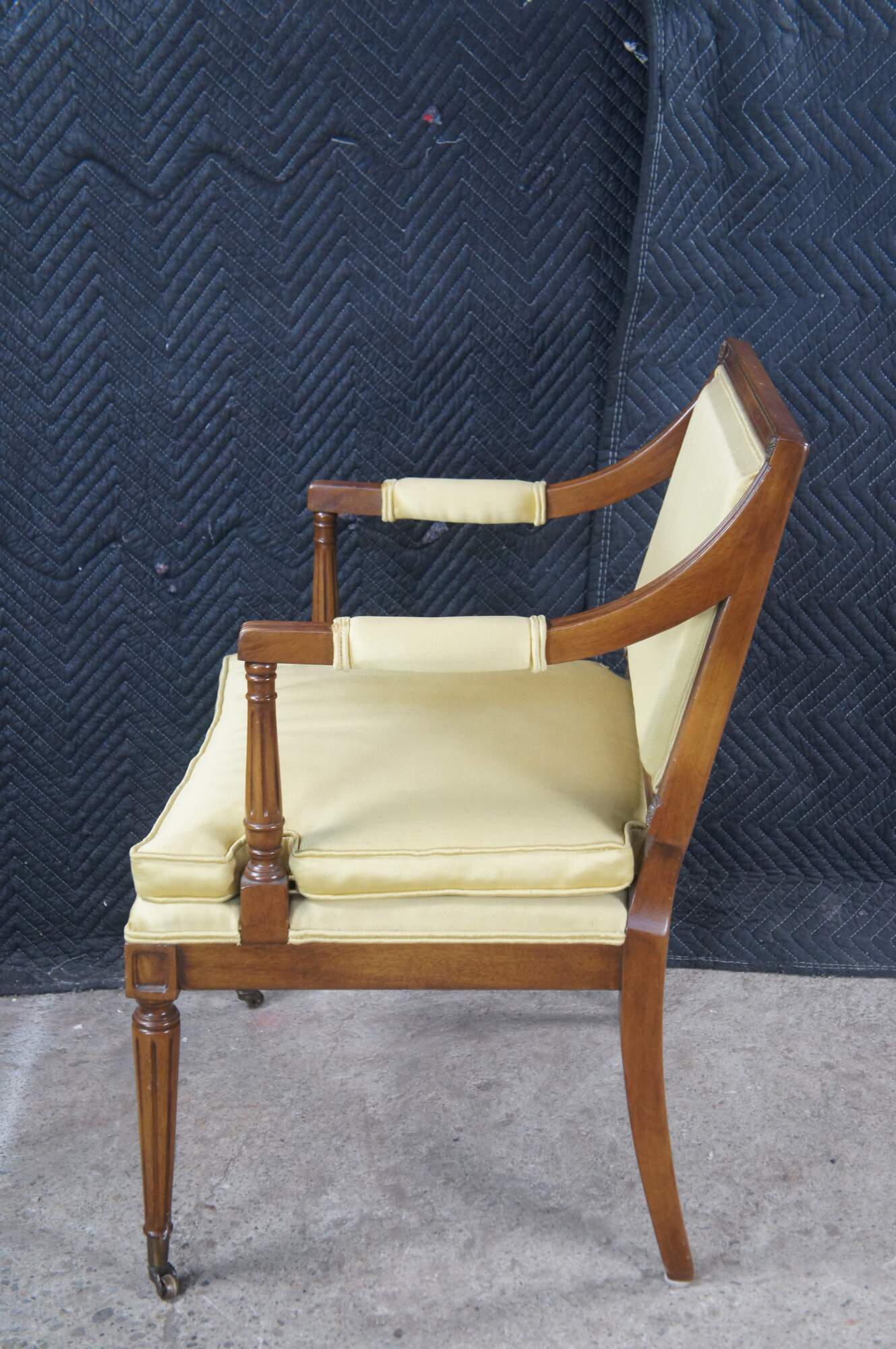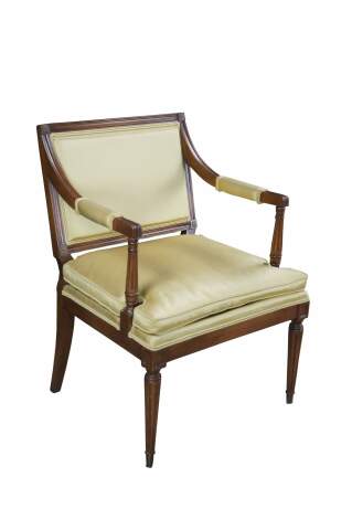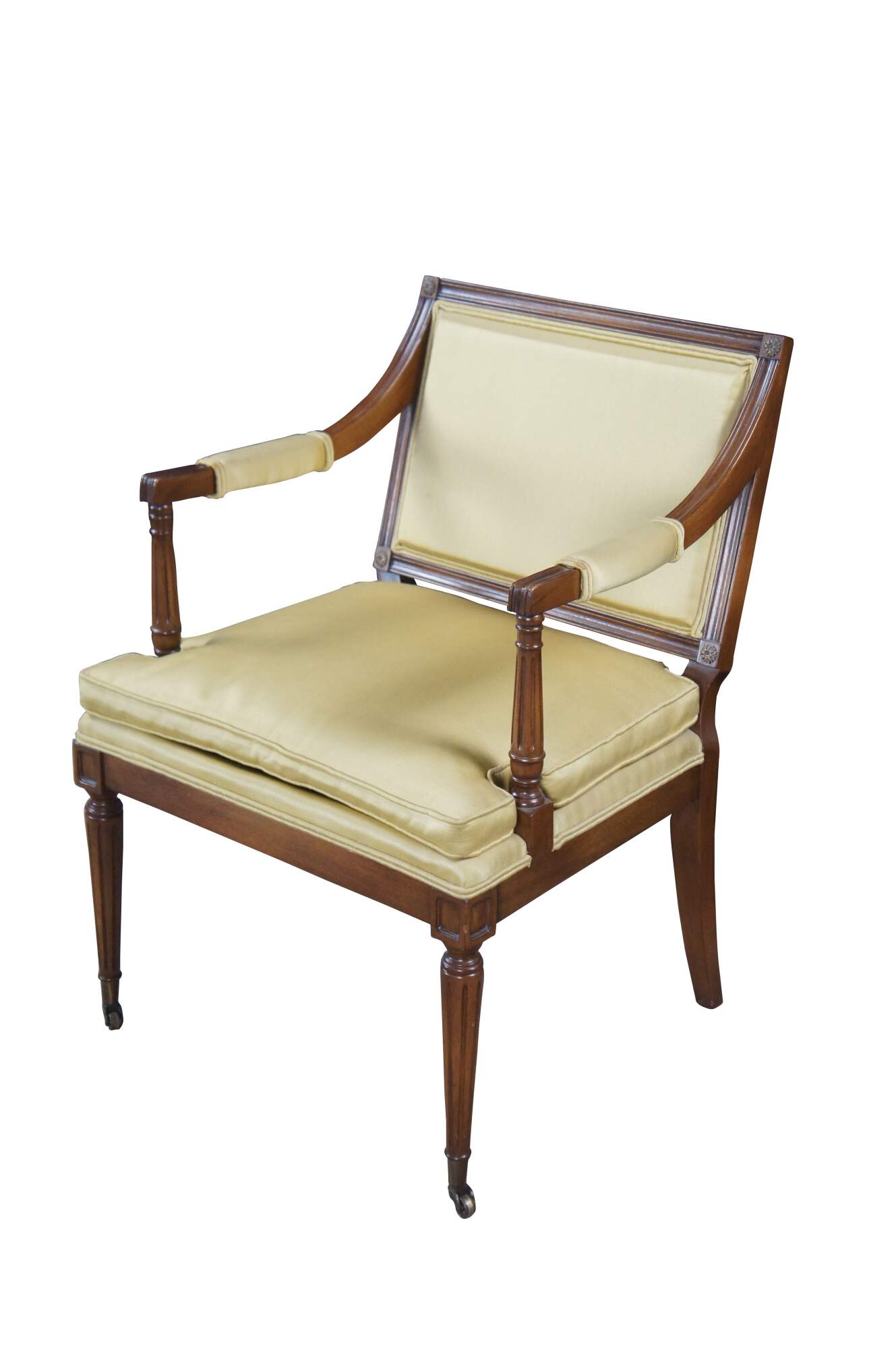 Vintage Hickory Chair Company Louis XVI French Directoire / Neoclassical style arm chair. Made of mahogany featuring fauteuil arms with corner rosettes and tapered fluted legs with castors.