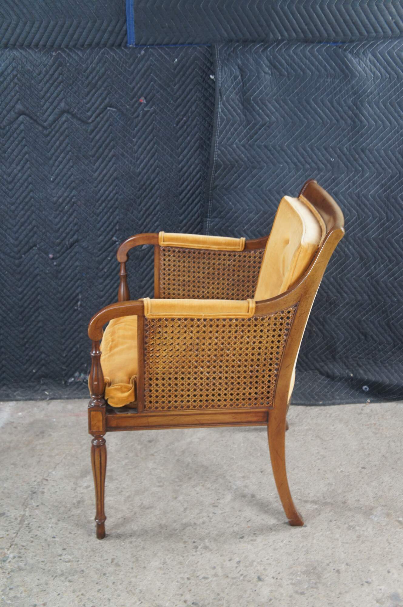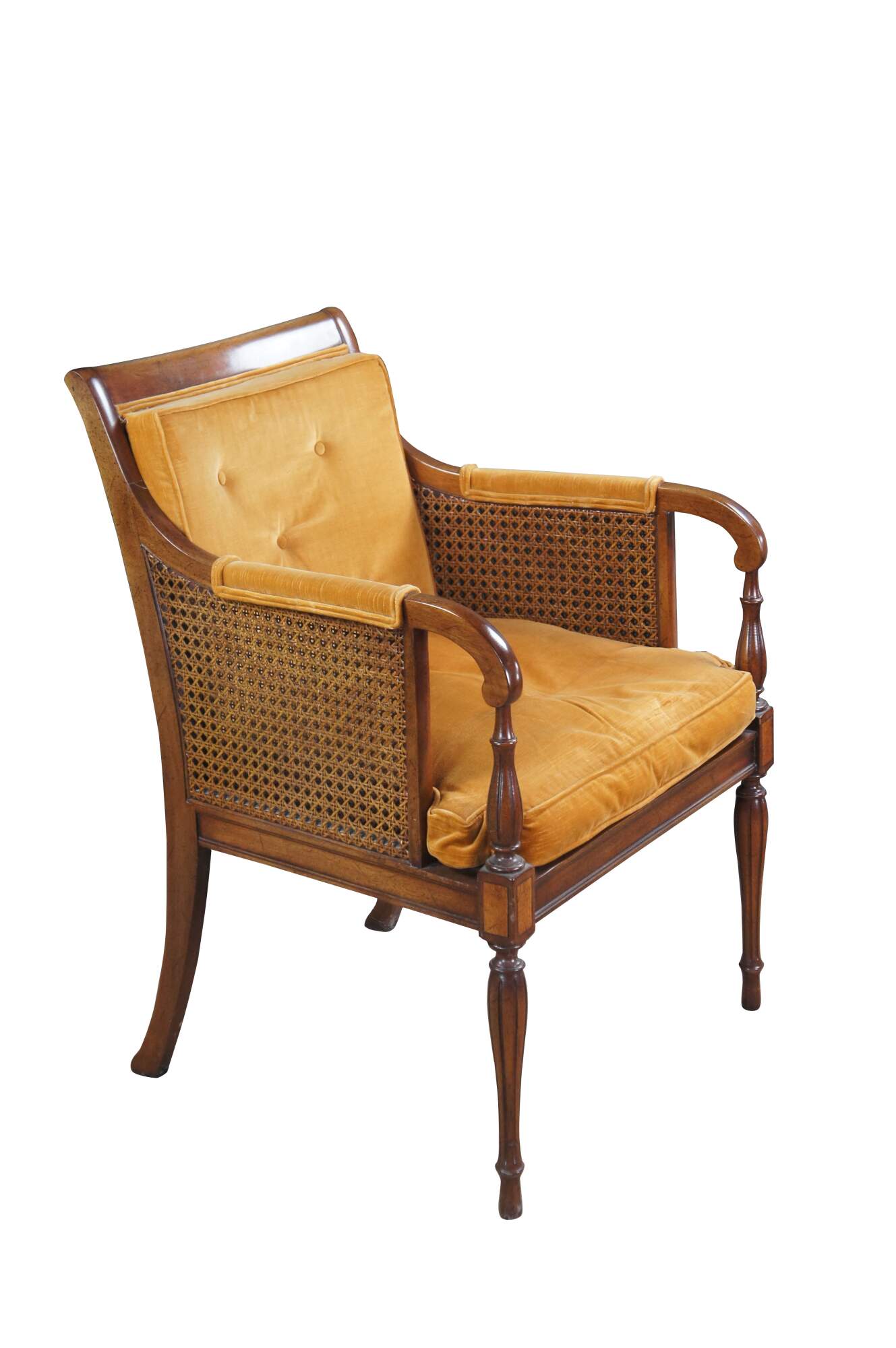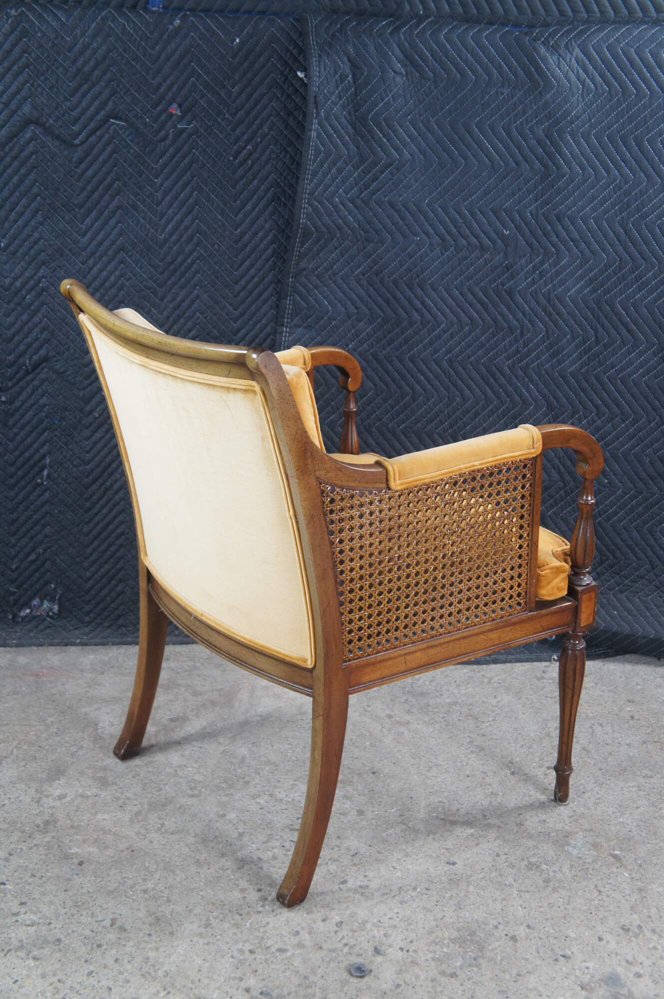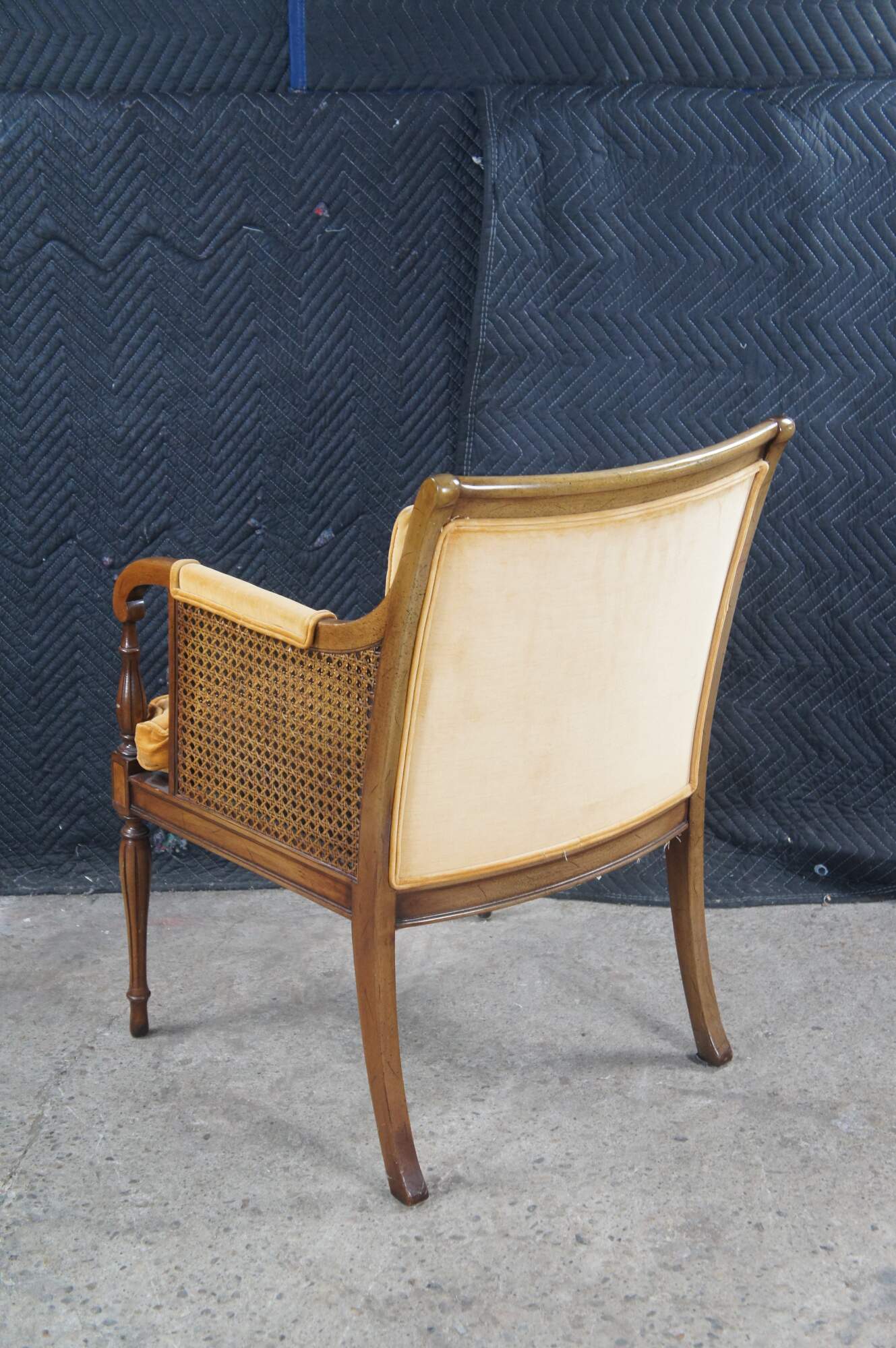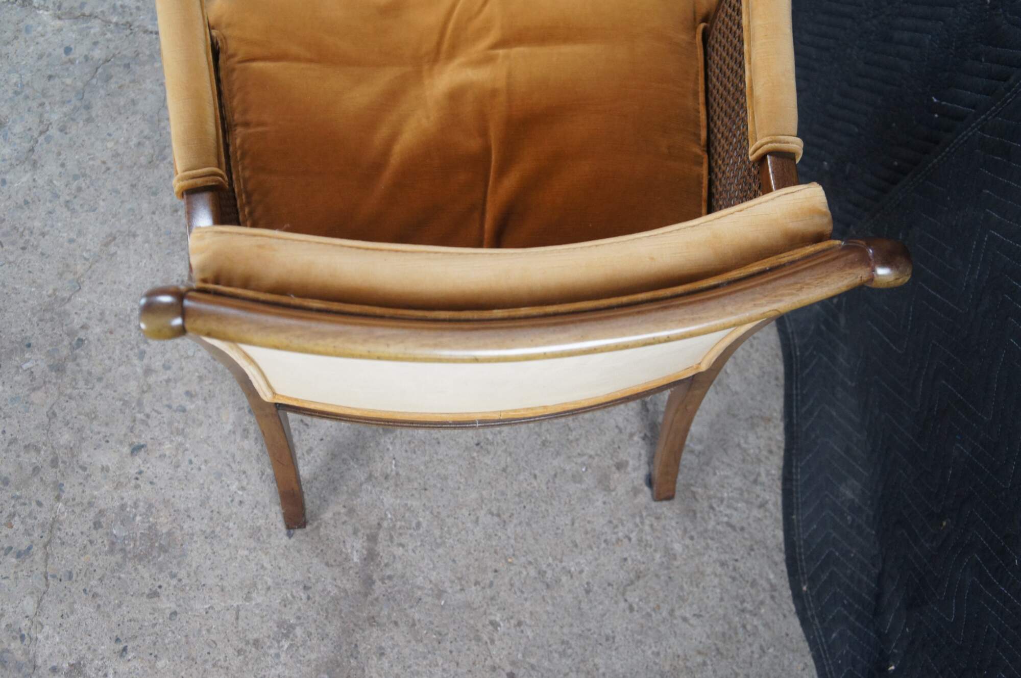 Two mid century French / Hollywood Regency style arm chairs. Made of walnut featuring a tufted back and fauteuil arms with double caned sides and fluted legs. Attributed to Hickory Chair Company.
