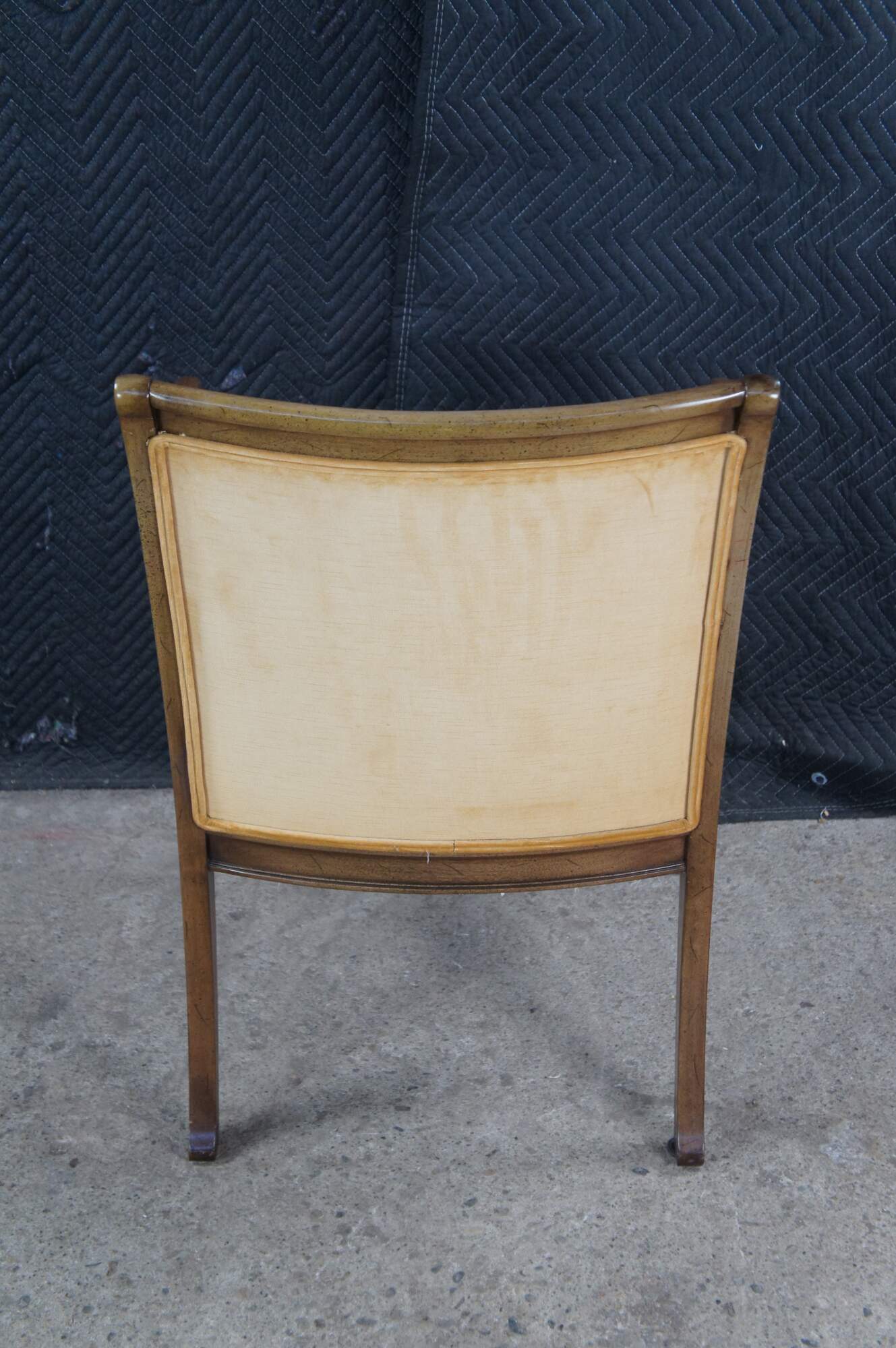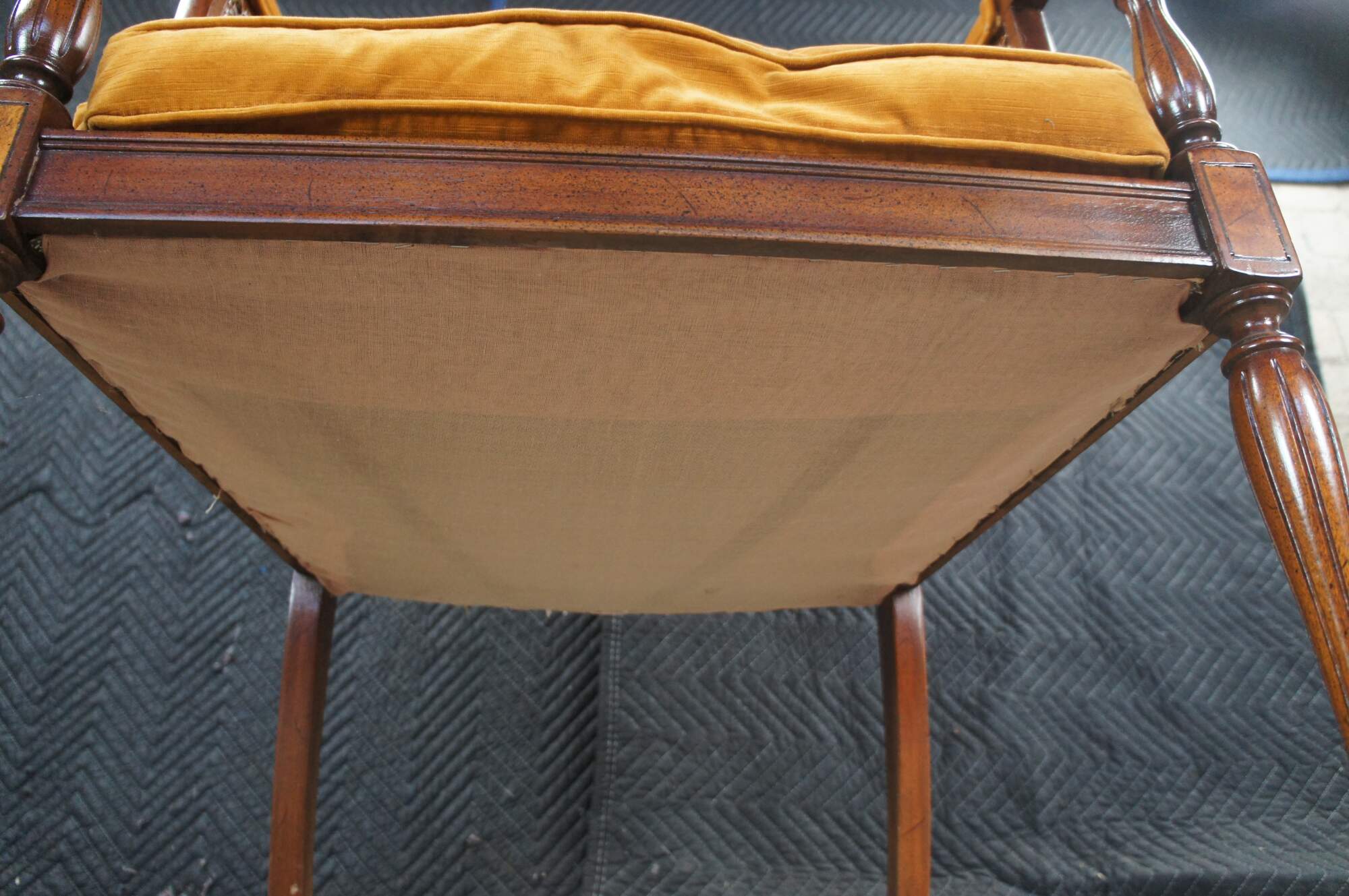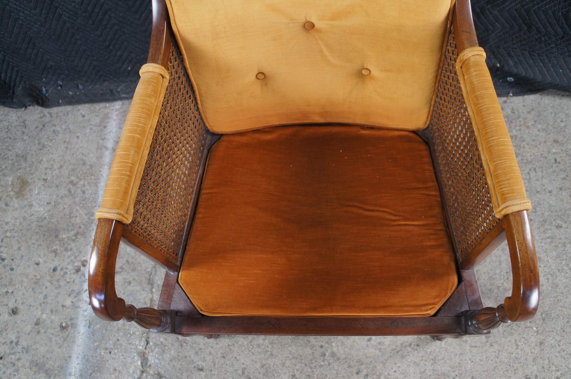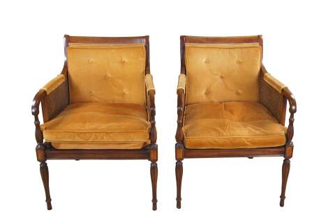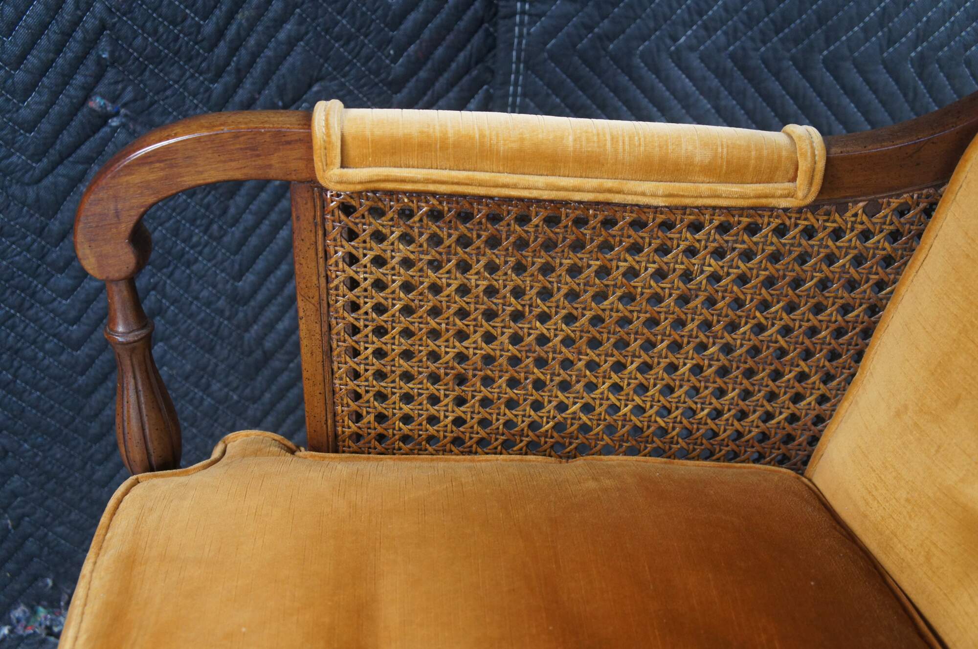 Two mid century French / Hollywood Regency style arm chairs. Made of walnut featuring a tufted back and fauteuil arms with double caned sides and fluted legs. Attributed to Hickory Chair Company.