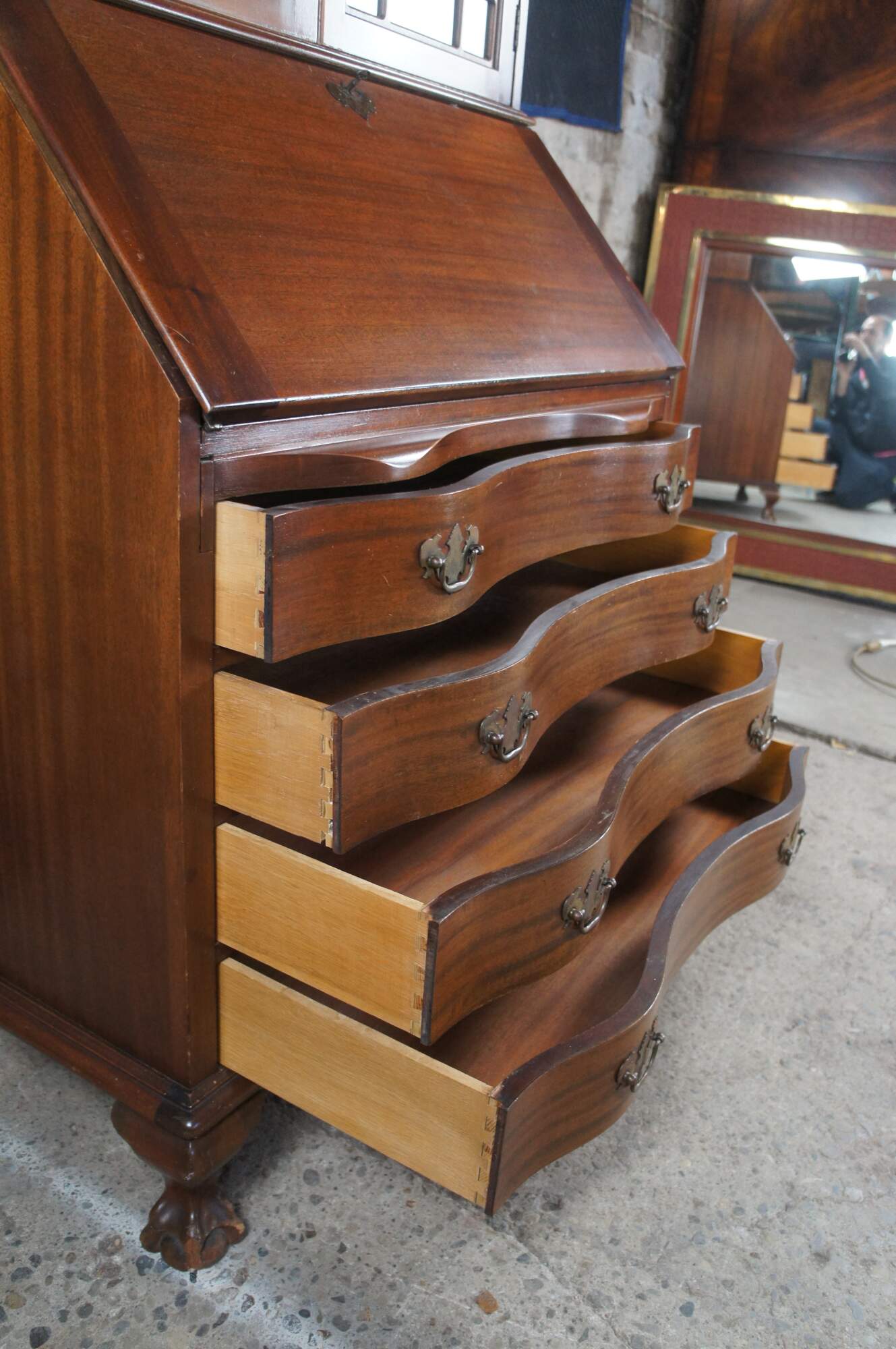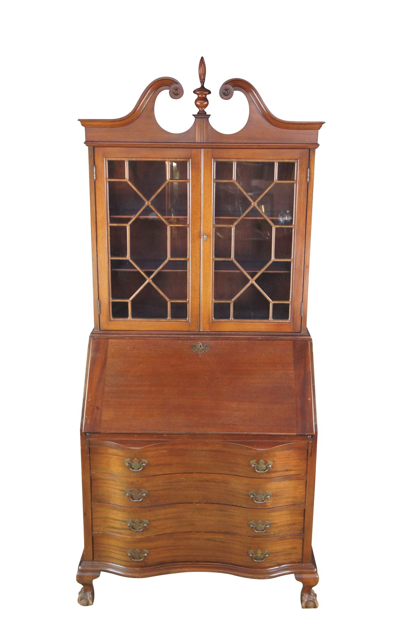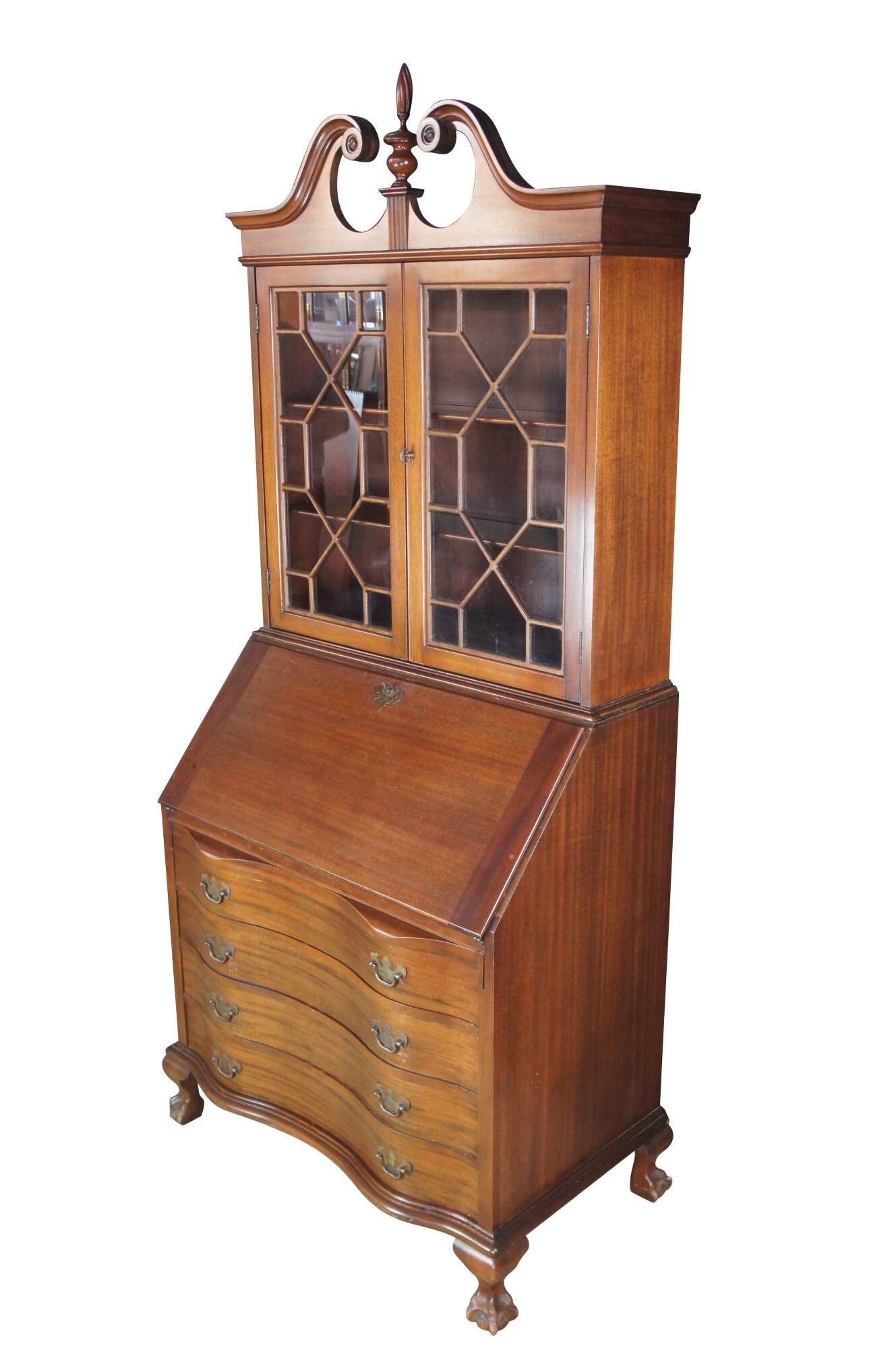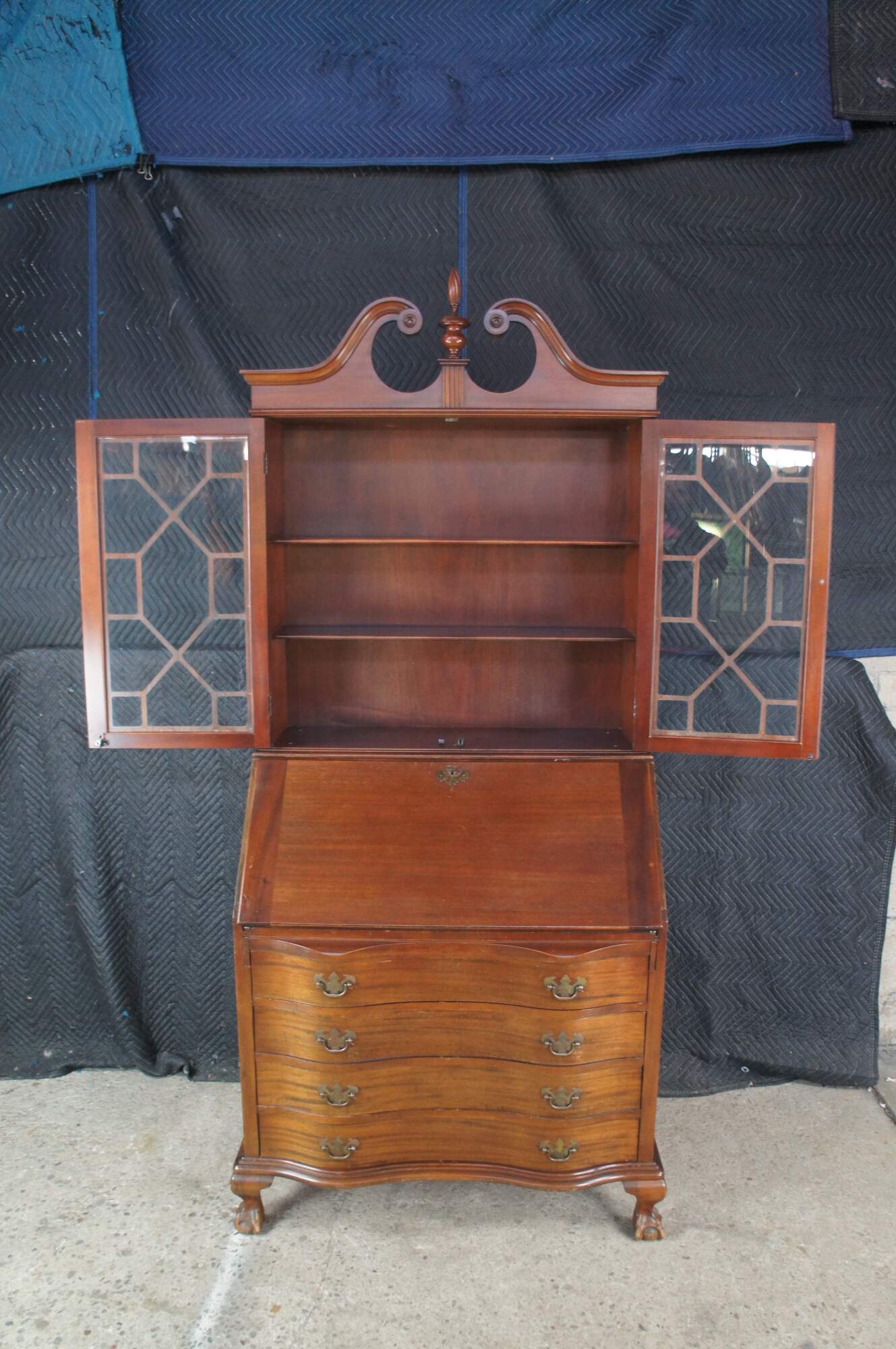 A gorgeous serpentine oxbow secretary desk by Maddox Tables of Jamestown NY. Made from American mahogany. Interior opens to five drawers and multiple divided and hidden compartments. Upper bookcase portion shows an open pediment with turned trophy finial. Doors are glass with fretwork. There are 2 interior bookcase shelves. Hardware is made of brass in classic Chippendale fashion, circa 1940s. Ball and Claw feet.