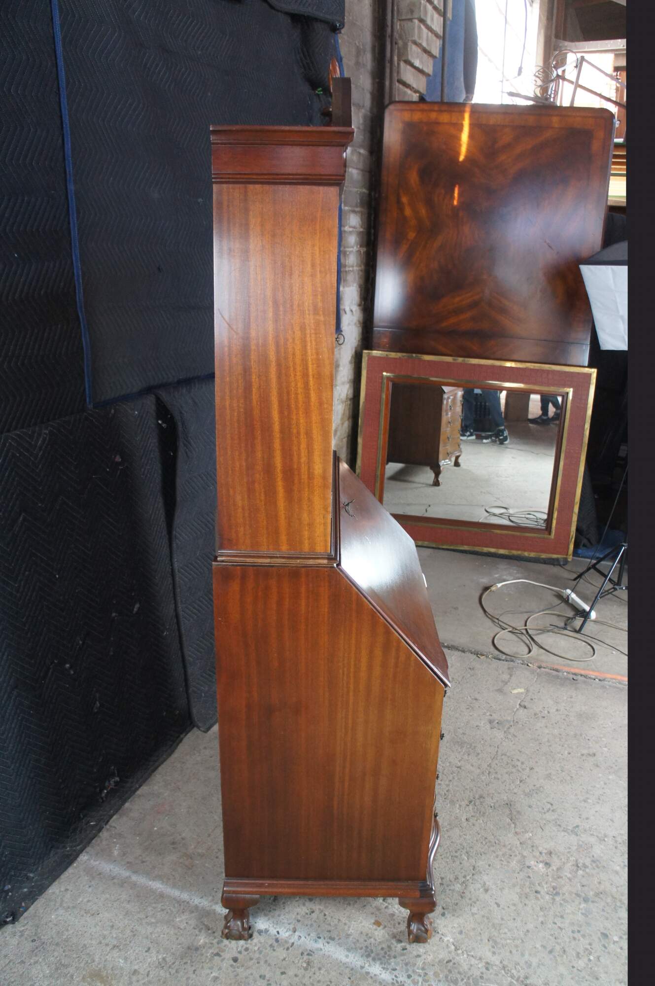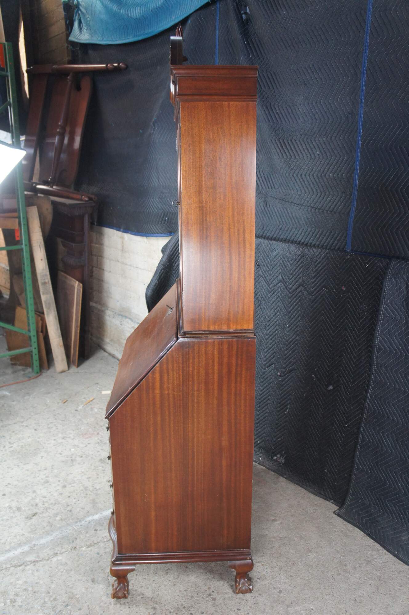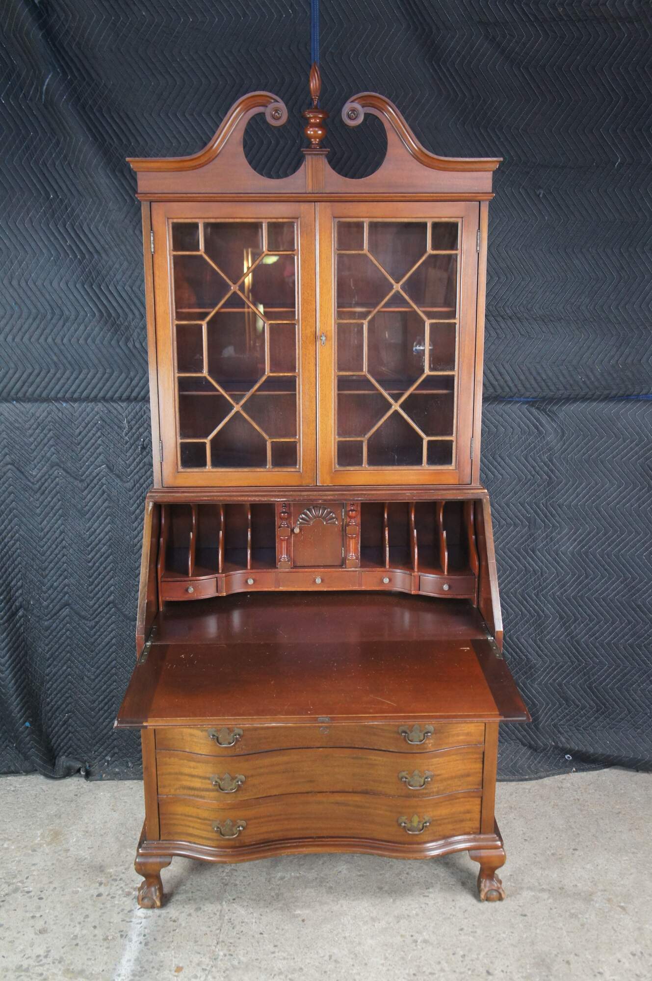 A gorgeous serpentine oxbow secretary desk by Maddox Tables of Jamestown NY. Made from American mahogany. Interior opens to five drawers and multiple divided and hidden compartments. Upper bookcase portion shows an open pediment with turned trophy finial. Doors are glass with fretwork. There are 2 interior bookcase shelves. Hardware is made of brass in classic Chippendale fashion, circa 1940s. Ball and Claw feet.